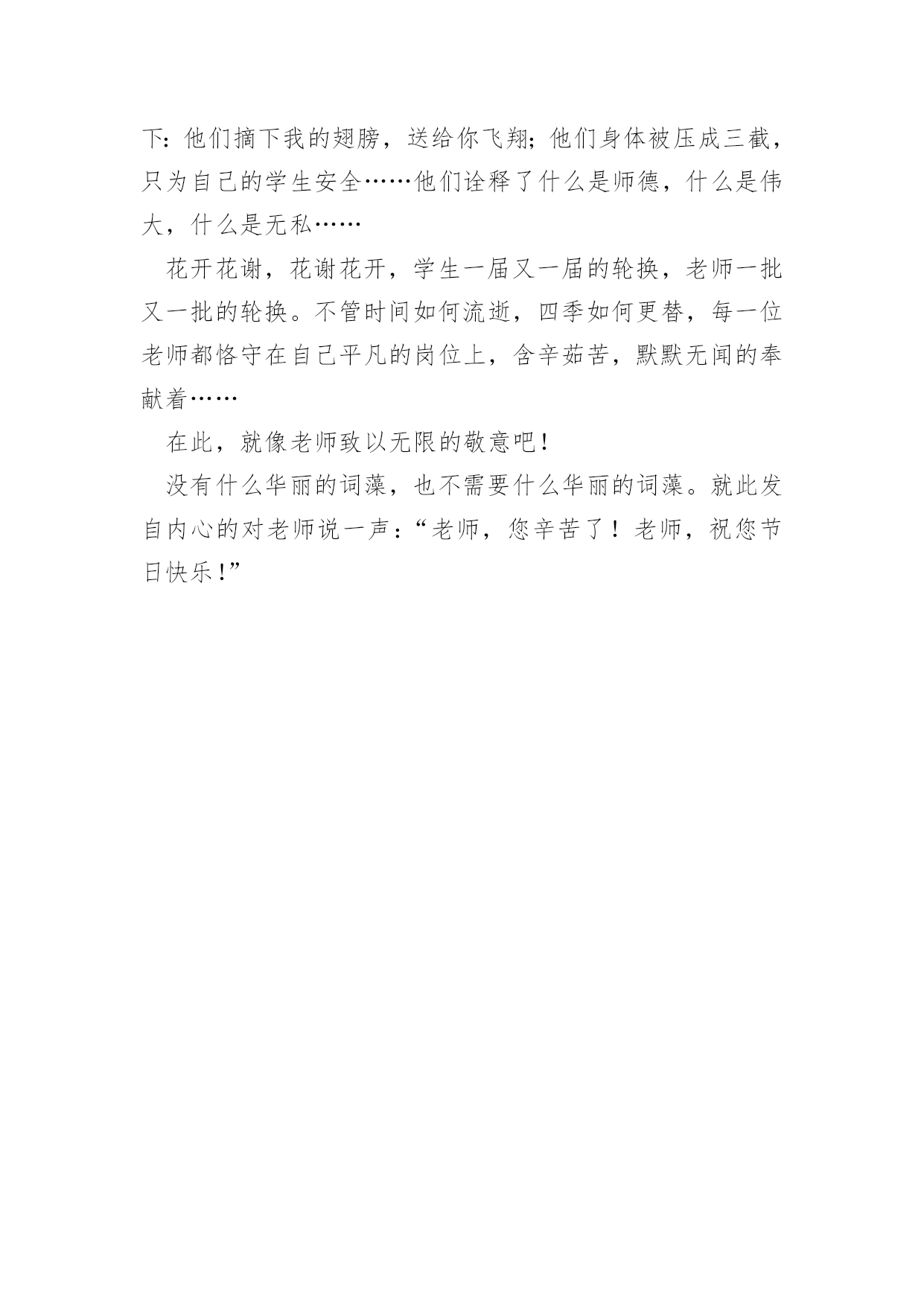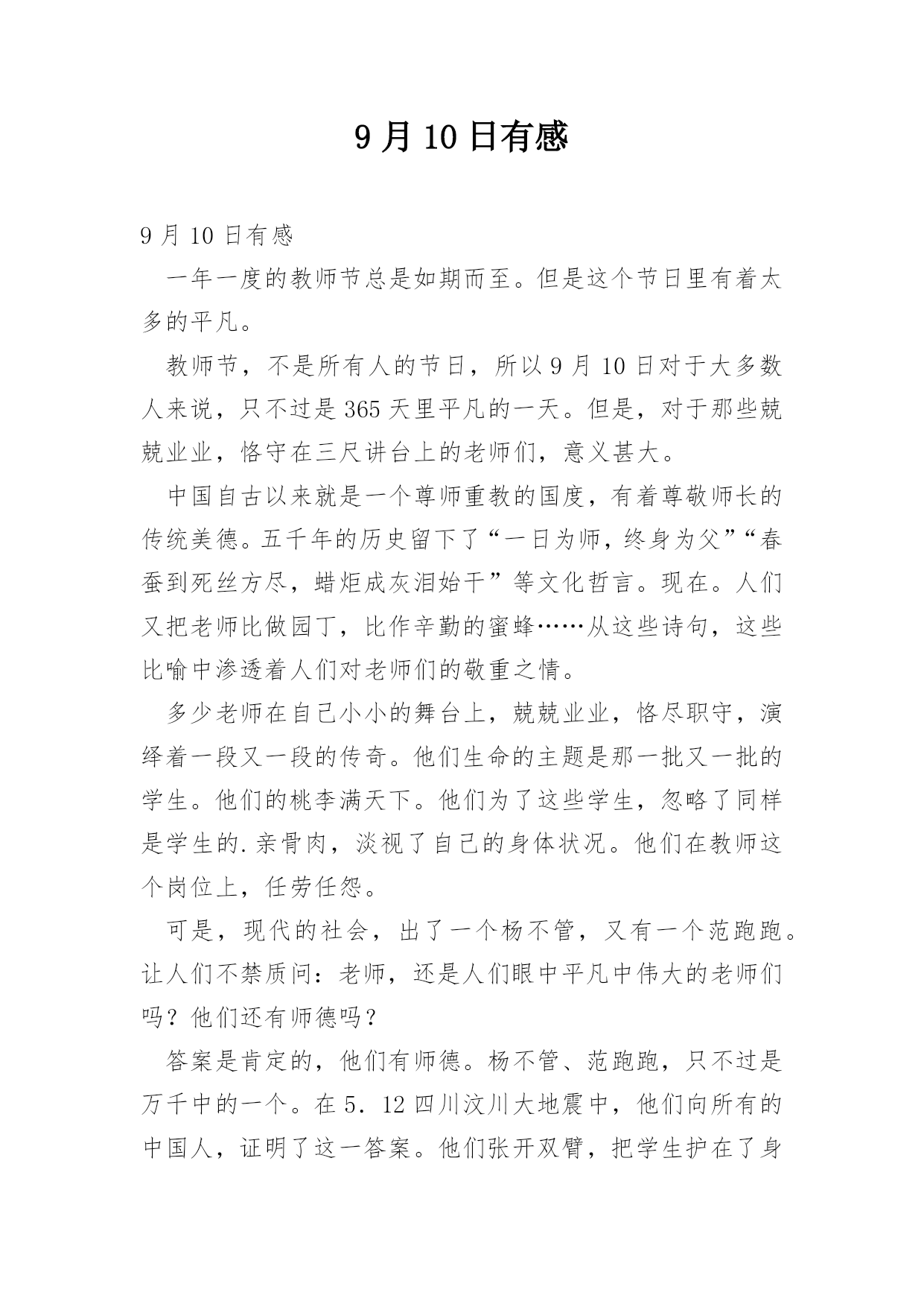 9月10日有感 9月10日有感一年一度的教师节总是如期而至。但是这个节日里有着太多的平凡。教师节,不是所有人的节日,所以9月10日对于大多数人来说,只不过是365天里平凡的一天。但是,对于那些兢兢业业,恪守在三尺讲台上的老师们,意义甚大。中国自古以来就是一个尊师重教的国度,有着尊敬师长的传统美德。五千年的历史留下了“一日为师,终身为父”“春蚕到死丝方尽,蜡炬成灰泪始干”等文化哲言。现在。人们又把老师比做园丁,比作辛勤的蜜蜂……从这些诗句,这些比喻中渗透着人们对老师们的敬重之情。多少老师在自己小小的舞台上,兢兢业业,恪尽职守,演绎着一段又一段的传奇。他们生命的主题是那一批又一批的学生。他们的桃李满天下。他们为了这些学生,忽略了同样是学生的.亲骨肉,淡视了自己的身体状况。他们在教师这个岗位上,任劳任怨。可是,现代的社会,出了一个杨不管,又有一个范跑跑。让人们不禁质问:老师,还是人们眼中平凡中伟大的老师们吗?他们还有师德吗?答案是肯定的,他们有师德。杨不管、范跑跑,只不过是万千中的一个。在5.12四川汶川大地震中,他们向所有的中国人,证明了这一答案。他们张开双臂,把学生护在了身下:他们摘下我的翅膀,送给你飞翔;他们身体被压成三截,只为自己的学生安全……他们诠释了什么是师德,什么是伟大,什么是无私……花开花谢,花谢花开,学生一届又一届的轮换,老师一批又一批的轮换。不管时间如何流逝,四季如何更替,每一位老师都恪守在自己平凡的岗位上,含辛茹苦,默默无闻的奉献着……在此,就像老师致以无限的敬意吧!没有什么华丽的词藻,也不需要什么华丽的词藻。就此发自内心的对老师说一声:“老师,您辛苦了!老师,祝您节日快乐!”