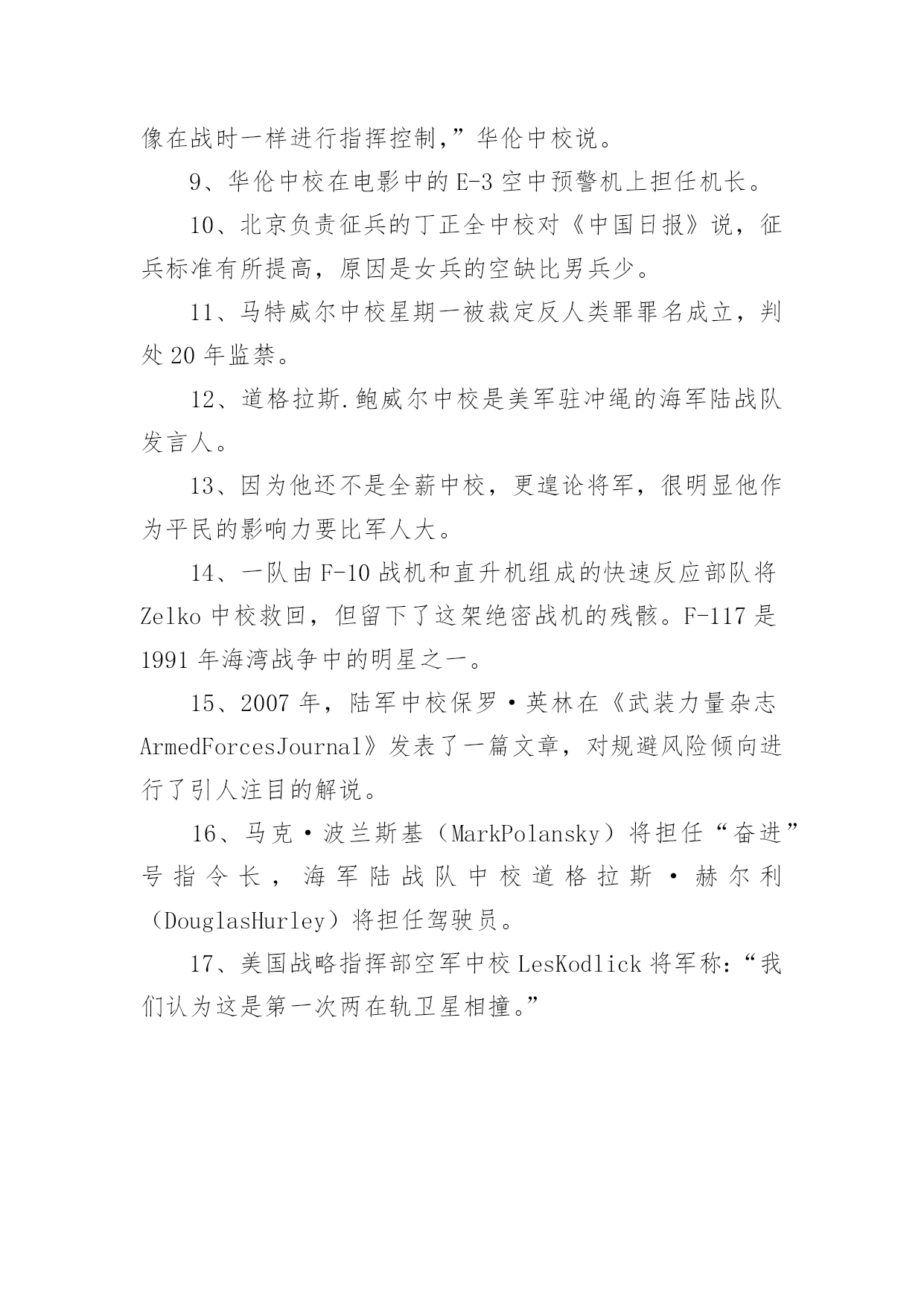 中校的造句 中校的造句中校拼音【注音】:zhongxiao中校解释【意思】:军衔,低于上校,高于少校。中校造句:1、1754年被任命为陆军中校,他参加了后来演变为法国与印第安之战之前的一些冲突事件。2、在拉乔利纳去年在军方支持的政变中夺取权力时,这位中校是拉乔利纳总统的主要支持者之一。3、“爆炸场面出奇的'好、非常真实,”华伦中校说。4、巴基斯坦军队发言人科洛尼尔?巴希尔?海迪中校说:“按照军中传统,即将离任的军队总司令在卸任之前要向军队道别,并向他们表示感谢。”5、他的副手克林特.琼斯中校则似乎比较保守,对我有些怀疑。不过在谈到他女儿时,我们展开了一次愉快的谈话。6、格里夫斯将要在弗吉尼亚的海军参谋学院学习,获得学分逐步成为一名中校.7、如果他仍然留在陆军,充其量不过是个专职中校,要么在陆军战争学院教书。8、“一旦E-3空中预警机内部的通讯开始,机组成员就像在战时一样进行指挥控制,”华伦中校说。9、华伦中校在电影中的E-3空中预警机上担任机长。10、北京负责征兵的丁正全中校对《中国日报》说,征兵标准有所提高,原因是女兵的空缺比男兵少。11、马特威尔中校星期一被裁定反人类罪罪名成立,判处20年监禁。12、道格拉斯.鲍威尔中校是美军驻冲绳的海军陆战队发言人。13、因为他还不是全薪中校,更遑论将军,很明显他作为平民的影响力要比军人大。14、一队由F-10战机和直升机组成的快速反应部队将Zelko中校救回,但留下了这架绝密战机的残骸。F-117是1991年海湾战争中的明星之一。15、2007年,陆军中校保罗·英林在《武装力量杂志ArmedForcesJournal》发表了一篇文章,对规避风险倾向进行了引人注目的解说。16、马克·波兰斯基(MarkPolansky)将担任“奋进”号指令长,海军陆战队中校道格拉斯·赫尔利(DouglasHurley)将担任驾驶员。17、美国战略指挥部空军中校LesKodlick将军称:“我们认为这是第一次两在轨卫星相撞。”