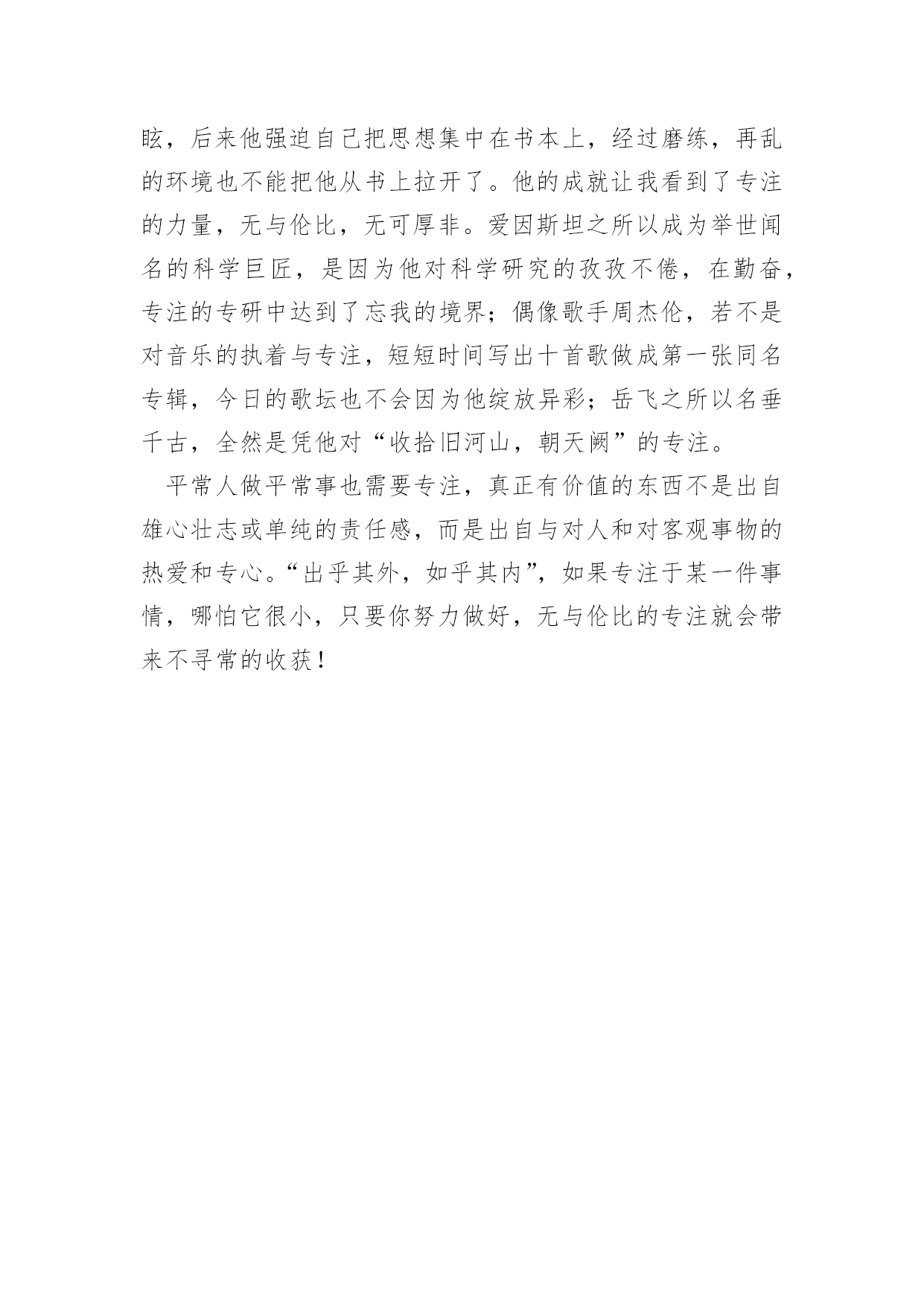 专注 专注微笑着前进,只留下雨过天晴的专注,一直到时间过去,路灯吹熄,也舍不得忘记。“彼以剑锋创其始者,我将与笔锋竞其业。”文学巨匠巴尔扎克如是说到。他用他对文学的痴迷与专注创造出一部部如<欧也妮。葛朗台>一般的着作。一个人只有专注于一个目标,才能在这个目标上取得成功。型心大家对麦当劳都不陌生吧,可谁又了解它背后的故事呢!麦当劳在创业之初只是小店,当时有一个叫克罗克的年轻人和一个荷兰人从麦当劳兄弟手下买下了这个小店。克罗克是一个有点愚蠢的人,他只开麦当劳店,加工牛肉,养牛钱都由别人赚,而荷兰人却十分聪明,他不让任何人有赚钱的机会,麦当劳,牛肉加工厂,养牛场全在他一个人旗下。好多年后,人们在一个荷兰农场里找到那个荷兰人,他除了200头牛以外一无所有,而此时克罗克早已将麦当劳店开遍世界了,他使麦当劳成为了世界快餐第一品牌,而他自己也成为了美国最有影响力的企业家之一。这也许就是专注的力量吧!也只有专注的事情才不会给自己留下遗憾。辛勤的'蜜蜂永远也没有时间的悲哀。朱熹说过,读书有三到,谓心到,眼到,口到。著名物理学家李政道博士年轻的时候,没有可以静心读书的环境。他在一个人声鼎沸的茶馆里的一个角落读书。刚开始他常常在嘈杂的人声中头昏目眩,后来他强迫自己把思想集中在书本上,经过磨练,再乱的环境也不能把他从书上拉开了。他的成就让我看到了专注的力量,无与伦比,无可厚非。爱因斯坦之所以成为举世闻名的科学巨匠,是因为他对科学研究的孜孜不倦,在勤奋,专注的专研中达到了忘我的境界;偶像歌手周杰伦,若不是对音乐的执着与专注,短短时间写出十首歌做成第一张同名专辑,今日的歌坛也不会因为他绽放异彩;岳飞之所以名垂千古,全然是凭他对“收拾旧河山,朝天阙”的专注。平常人做平常事也需要专注,真正有价值的东西不是出自雄心壮志或单纯的责任感,而是出自与对人和对客观事物的热爱和专心。“出乎其外,如乎其内”,如果专注于某一件事情,哪怕它很小,只要你努力做好,无与伦比的专注就会带来不寻常的收获!