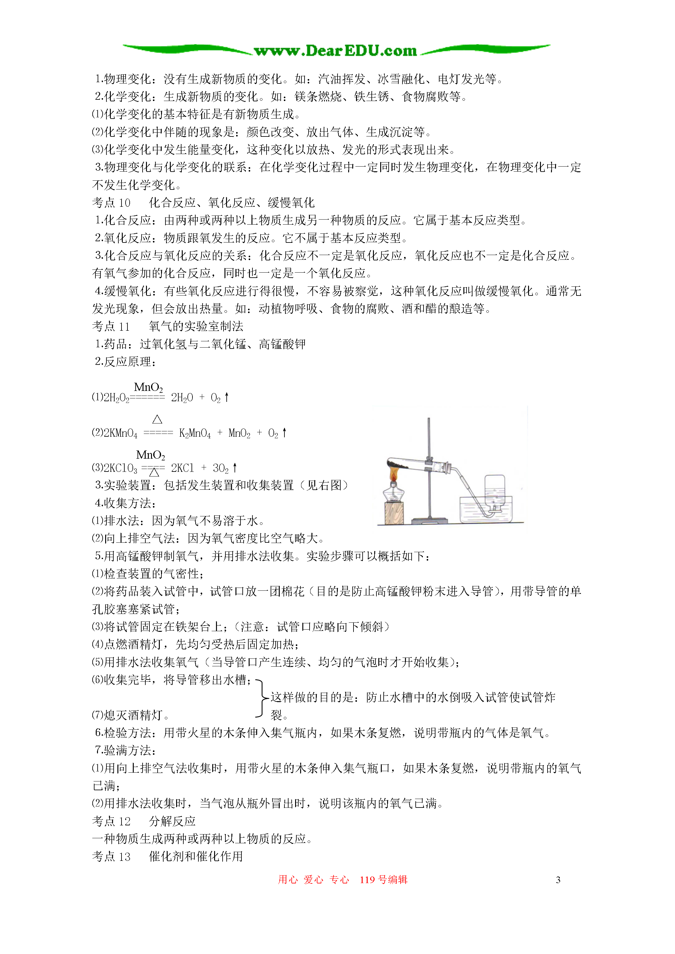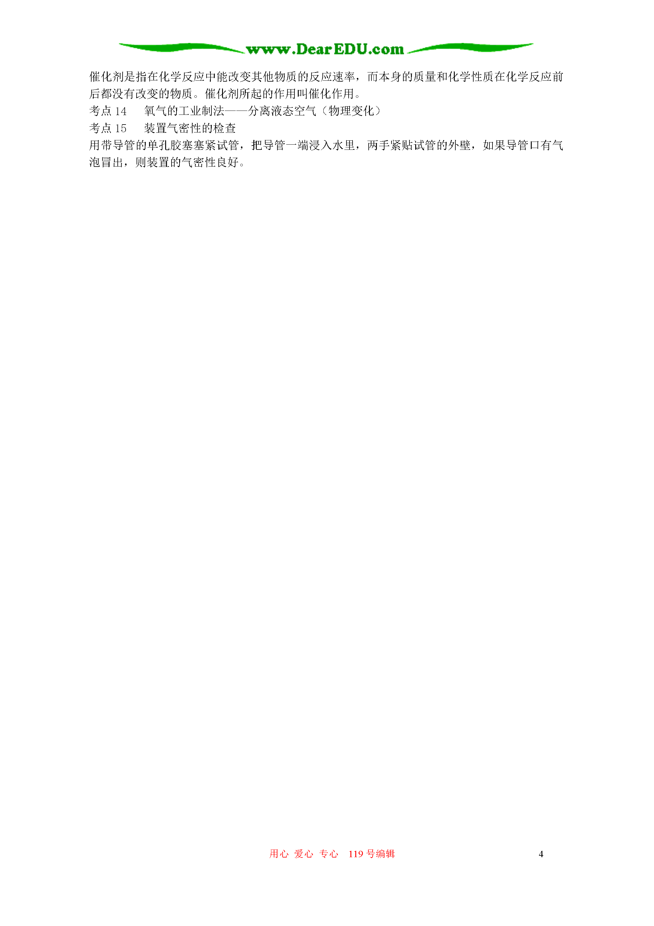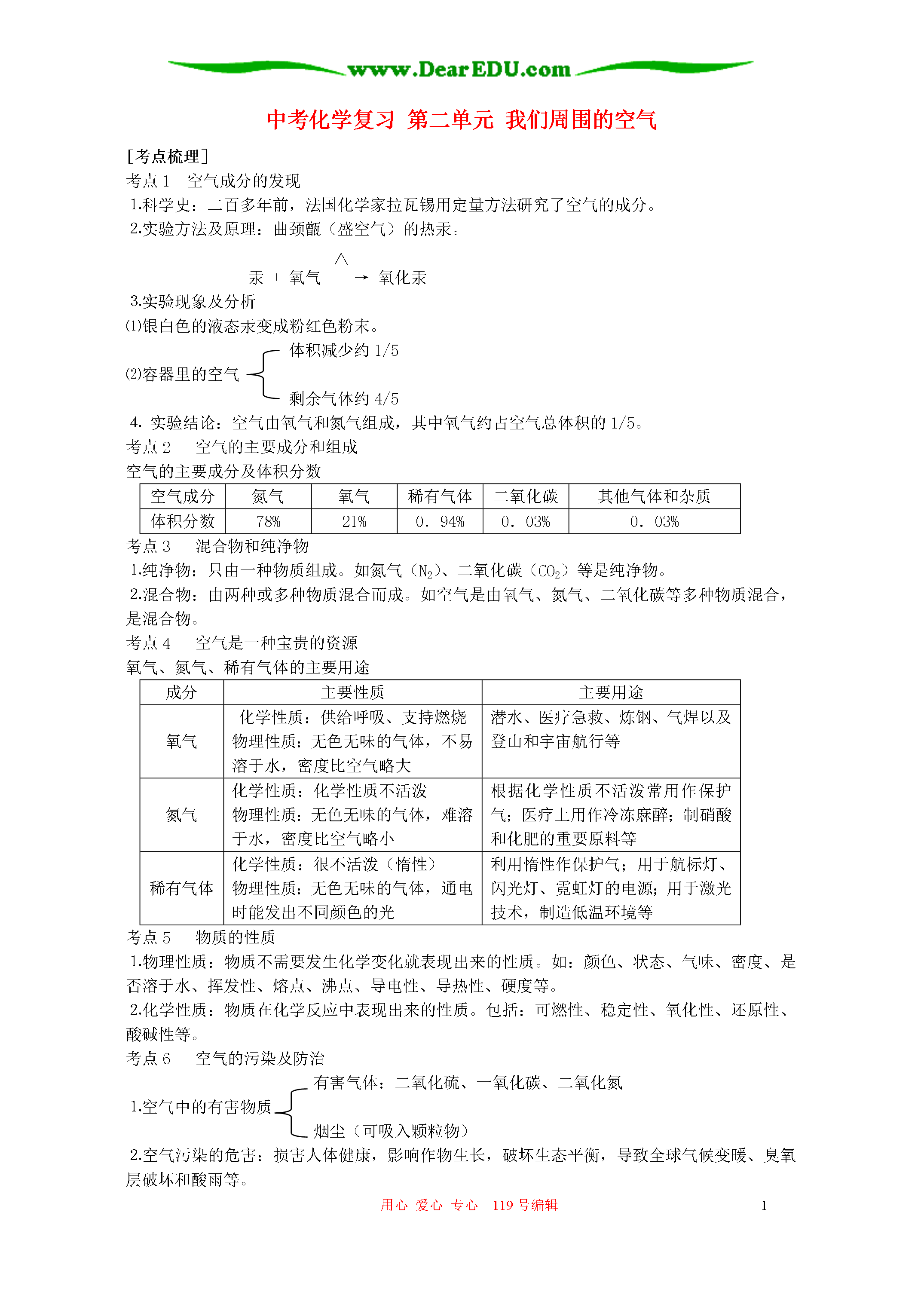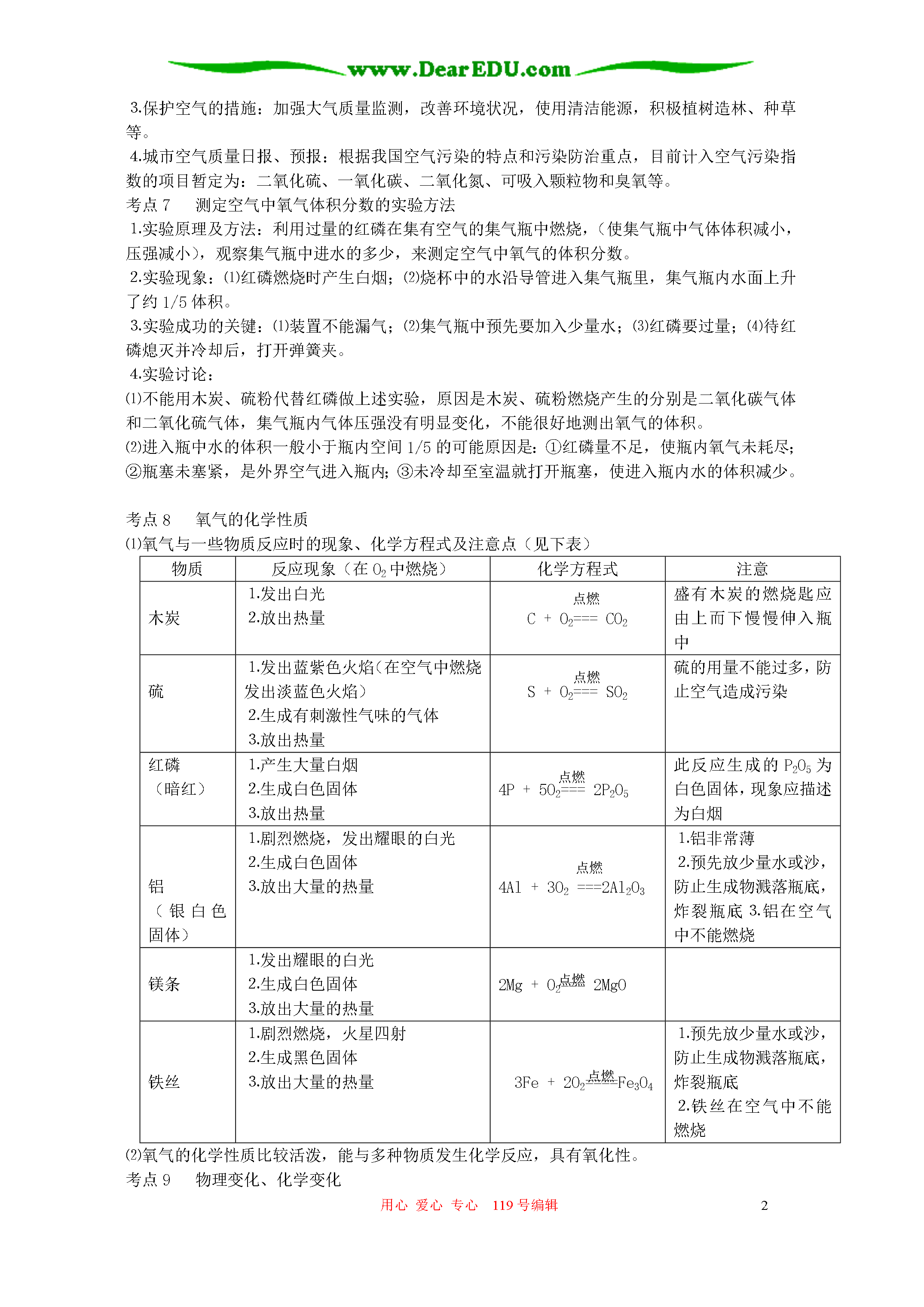 用心爱心专心119号编辑4中考化学复习第二单元我们周围的空气[考点梳理]考点1空气成分的发现⒈科学史:二百多年前,法国化学家拉瓦锡用定量方法研究了空气的成分。⒉实验方法及原理:曲颈甑(盛空气)的热汞。△汞+氧气——→氧化汞⒊实验现象及分析⑴银白色的液态汞变成粉红色粉末。体积减少约1/5⑵容器里的空气剩余气体约4/5⒋实验结论:空气由氧气和氮气组成,其中氧气约占空气总体积的1/5。考点2空气的主要成分和组成空气的主要成分及体积分数空气成分氮气氧气稀有气体二氧化碳其他气体和杂质体积分数78%21%0.94%0.03%0.03%考点3混合物和纯净物⒈纯净物:只由一种物质组成。如氮气(N2)、二氧化碳(CO2)等是纯净物。⒉混合物:由两种或多种物质混合而成。如空气是由氧气、氮气、二氧化碳等多种物质混合,是混合物。考点4空气是一种宝贵的资源氧气、氮气、稀有气体的主要用途成分主要性质主要用途氧气化学性质:供给呼吸、支持燃烧物理性质:无色无味的气体,不易溶于水,密度比空气略大潜水、医疗急救、炼钢、气焊以及登山和宇宙航行等氮气化学性质:化学性质不活泼物理性质:无色无味的气体,难溶于水,密度比空气略小根据化学性质不活泼常用作保护气;医疗上用作冷冻麻醉;制硝酸和化肥的重要原料等稀有气体化学性质:很不活泼(惰性)物理性质:无色无味的气体,通电时能发出不同颜色的光利用惰性作保护气;用于航标灯、闪光灯、霓虹灯的电源;用于激光技术,制造低温环境等考点5物质的性质⒈物理性质:物质不需要发生化学变化就表现出来的性质。如:颜色、状态、气味、密度、是否溶于水、挥发性、熔点、沸点、导电性、导热性、硬度等。⒉化学性质:物质在化学反应中表现出来的性质。包括:可燃性、稳定性、氧化性、还原性、酸碱性等。考点6空气的污染及防治有害气体:二氧化硫、一氧化碳、二氧化氮⒈空气中的有害物质烟尘(可吸入颗粒物)⒉空气污染的危害:损害人体健康,影响作物生长,破坏生态平衡,导致全球气候变暖、臭氧层破坏和酸雨等。⒊保护空气的措施:加强大气质量监测,改善环境状况,使用清洁能源,积极植树造林、种草等。⒋城市空气质量日报、预报:根据我国空气污染的特点和污染防治重点,目前计入空气污染指数的项目暂定为:二氧化硫、一氧化碳、二氧化氮、可吸入颗粒物和臭氧等。考点7测定空气中氧气体积分数的实验方法⒈实验原理及方法:利用过量的红磷在集有空气的集气瓶中燃烧,(使集气瓶中气体体积减小,压强减小),观察集气瓶中进水的多少,来测定空气中氧气的体积分数。⒉实验现象:⑴红磷燃烧时产生白烟;⑵烧杯中的水沿导管进入集气瓶里,集气瓶内水面上升了约1/5体积。⒊实验成功的关键:⑴装置不能漏气;⑵集气瓶中预先要加入少量水;⑶红磷要过量;⑷待红磷熄灭并冷却后,打开弹簧夹。⒋实验讨论:⑴不能用木炭、硫粉代替红磷做上述实验,原因是木炭、硫粉燃烧产生的分别是二氧化碳气体和二氧化硫气体,集气瓶内气体压强没有明显变化,不能很好地测出氧气的体积。⑵进入瓶中水的体积一般小于瓶内空间1/5的可能原因是:①红磷量不足,使瓶内氧气未耗尽;②瓶塞未塞紧,是外界空气进入瓶内;③未冷却至室温就打开瓶塞,使进入瓶内水的体积减少。考点8氧气的化学性质⑴氧气与一些物质反应时的现象、化学方程式及注意点(见下表)物质反应现象(在O2中燃烧)化学方程式注意木炭⒈发出白光⒉放出热量点燃点燃C+O2===CO2盛有木炭的燃烧匙应由上而下慢慢伸入瓶中硫⒈发出蓝紫色火焰(在空气中燃烧发出淡蓝色火焰)⒉生成有刺激性气味的气体⒊放出热量点燃S+O2===SO2硫的用量不能过多,防止空气造成污染红磷(暗红)⒈产生大量白烟⒉生成白色固体⒊放出热量4P+5O2===2P2O5此反应生成的P2O5为白色固体,现象应描述为白烟铝(银白色固体)⒈剧烈燃烧,发出耀眼的白光⒉生成白色固体⒊放出大量的热量点燃4Al+3O2===2Al2O3⒈铝非常薄⒉预先放少量水或沙,防止生成物溅落瓶底,炸裂瓶底⒊铝在空气中不能燃烧镁条⒈发出耀眼的白光⒉生成白色固体⒊放出大量的热量点燃2Mg+O2===2MgO铁丝⒈剧烈燃烧,火星四射⒉生成黑色固体⒊放出大量的热量点燃3Fe+2O2====Fe3O4⒈预先放少量水或沙,防止生成物溅落瓶底,炸裂瓶底⒉铁丝在空气中不能燃烧⑵氧气的化学性质比较活泼,能与多种物质发生化学反应,具有氧化性。考点9物理变化、化学变化⒈物理变化:没有生成新物质的变化。如:汽油挥发、冰雪融化、电灯发光等。⒉化学变化:生成新物质的变化。如:镁条燃烧、铁生锈、食物腐败等。⑴化学变化的基本特征是有新物质生成。⑵化学变化中伴随的现象是:颜色改变、放出气体、生成沉淀等。⑶化学变化中发生能量变化,这种变化以放热、发光的形式表现出来。⒊物理变化与化学变化的联系:在化学变化过程中一定同时发生物理变化,在物理变化
