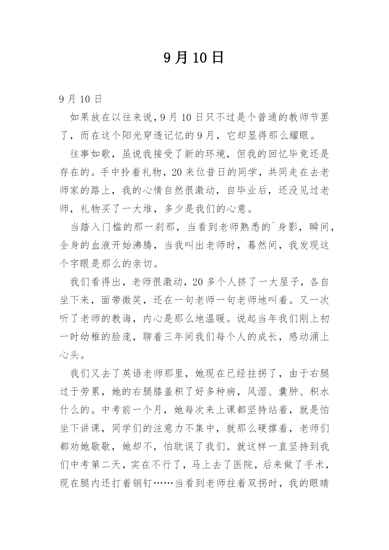 9月10日 9月10日如果放在以往来说,9月10日只不过是个普通的教师节罢了,而在这个阳光穿透记忆的9月,它却显得那么耀眼。往事如歌,虽说我接受了新的环境,但我的回忆毕竟还是存在的。手中拎着礼物,20来位昔日的同学,共同走在去老师家的路上,我的心情自然很激动,自毕业后,还没见过老师,礼物买了一大堆,多少是我们的心意。当踏入门槛的那一刹那,当看到老师熟悉的`身影,瞬间,全身的血液开始沸腾,当我叫出老师时,蓦然间,我发现这个字眼是那么的亲切。我们看得出,老师很激动,20多个人挤了一大屋子,各自坐下来,面带微笑,还在一句老师一句老师地叫着。又一次听了老师的教诲,内心是那么地温暖。说起当年我们刚上初一时幼稚的脸庞,聊着三年间我们每个人的成长,感动涌上心头。我们又去了英语老师那里,她现在已经拄拐了,由于右腿过于劳累,她的右腿膝盖积了好多种病,风湿、囊肿、积水什么的。中考前一个月,她每次来上课都坚持站着,就是怕坐下讲课,同学们的注意力不集中,就那么硬撑着,老师们都劝她歇歇,她却不,怕耽误了我们。就这样一直坚持到我们中考第二天,实在不行了,马上去了医院,后来做了手术,现在腿内还打着钢钉……当看到老师拄着双拐时,我的眼睛湿润了,不过幸运的是,再养半年,就可以丢掉拐走路了。本以为那些煽情的情节只会在电视中出现,可现在却清晰的出现在我眼前。我近呼哽咽了,我无言。往日时光已远去,但回忆仍然美丽。以前我们只会说老师真好,可现在,我的心已被触动,像一个小小的石子,在平静的湖面激起涟漪,我全身每一处都在被老师感动着。老师,您好!……