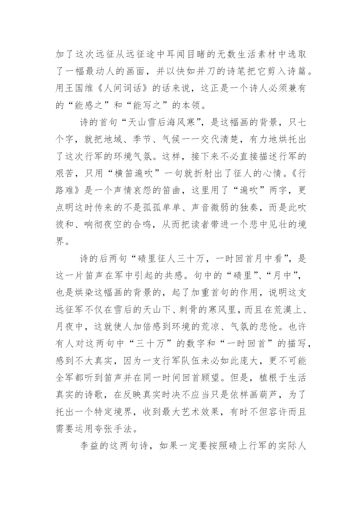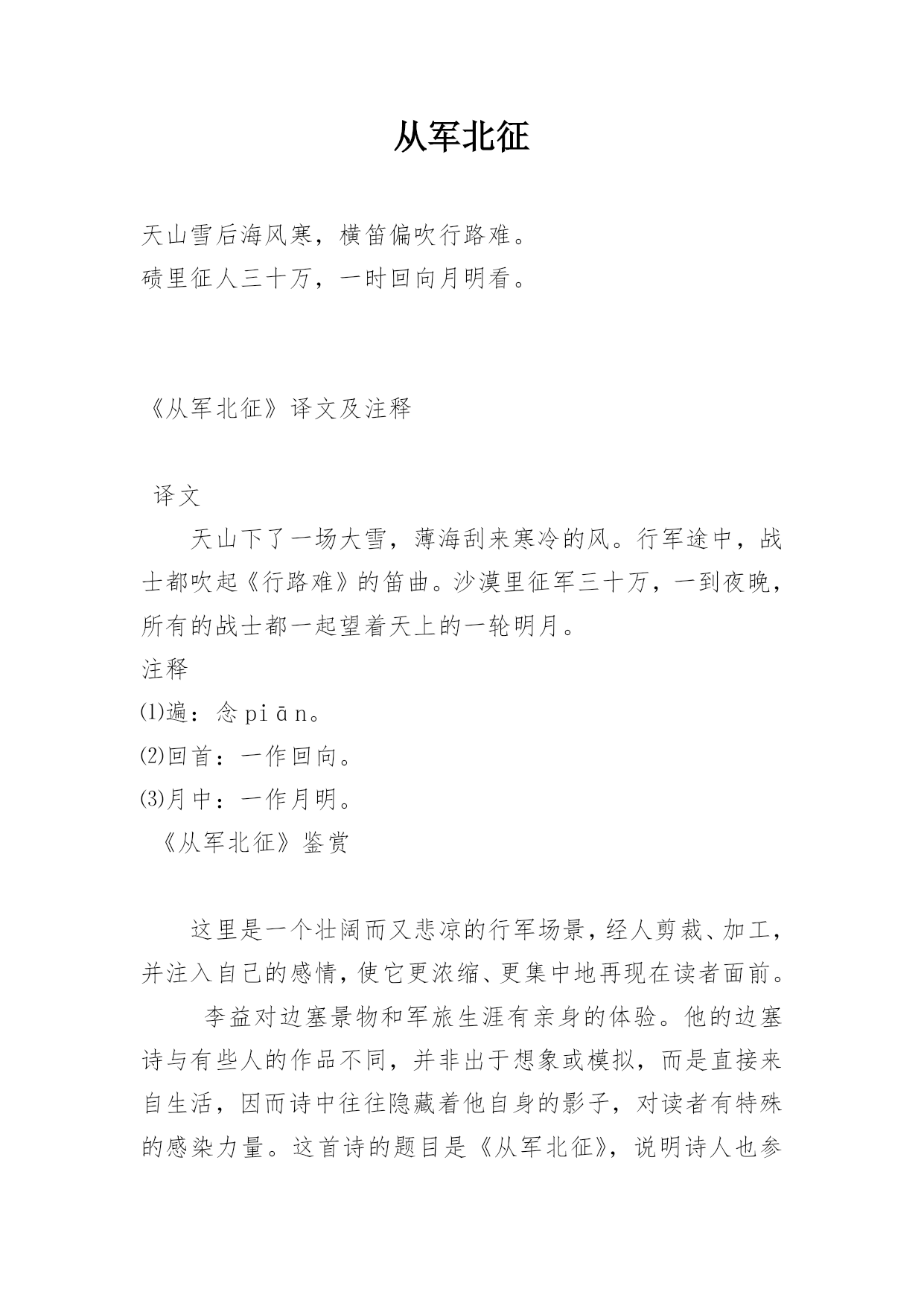 从军北征 天山雪后海风寒,横笛偏吹行路难。碛里征人三十万,一时回向月明看。《从军北征》译文及注释译文天山下了一场大雪,薄海刮来寒冷的风。行军途中,战士都吹起《行路难》的笛曲。沙漠里征军三十万,一到夜晚,所有的战士都一起望着天上的一轮明月。注释⑴遍:念piān。⑵回首:一作回向。⑶月中:一作月明。《从军北征》鉴赏这里是一个壮阔而又悲凉的行军场景,经人剪裁、加工,并注入自己的感情,使它更浓缩、更集中地再现在读者面前。李益对边塞景物和军旅生涯有亲身的体验。他的边塞诗与有些人的作品不同,并非出于想象或模拟,而是直接来自生活,因而诗中往往隐藏着他自身的影子,对读者有特殊的感染力量。这首诗的题目是《从军北征》,说明诗人也参加了这次远征从远征途中耳闻目睹的无数生活素材中选取了一幅最动人的画面,并以快如并刀的诗笔把它剪入诗篇。用王国维《人间词话》的话来说,这正是一个诗人必须兼有的“能感之”和“能写之”的本领。诗的首句“天山雪后海风寒”,是这幅画的背景,只七个字,就把地域、季节、气候一一交代清楚,有力地烘托出了这次行军的环境气氛。这样,接下来不必直接描述行军的艰苦,只用“横笛遍吹”一句就折射出了征人的心情。《行路难》是一个声情哀怨的笛曲,这里用了“遍吹”两字,更点明这时传来的不是孤孤单单、声音微弱的独奏,而是此吹彼和、响彻夜空的合鸣,从而把读者带进一个悲中见壮的境界。诗的后两句“碛里征人三十万,一时回首月中看”,是这一片笛声在军中引起的共感。句中的“碛里”、“月中”,也是烘染这幅画的背景的,起了加重首句的作用,说明这支远征军不仅在雪后的天山下、刺骨的寒风里,而且在荒漠上、月夜中,这就使人加倍感到环境的荒凉、气氛的悲怆。也许有人对这两句中“三十万”的数字和“一时回首”的描写,感到不大真实,因为一支行军队伍未必如此庞大,更不可能全军都听到笛声并在同一时间回首顾望。但是,植根于生活真实的诗歌,在反映真实时决不应当只是依样画葫芦,为了托出一个特定境界,收到最大艺术效果,有时不但容许而且需要运用夸张手法。李益的这两句诗,如果一定要按照碛上行军的实际人数、按照闻笛回顾的现场情况来写,其艺术效果必将大打折扣。只有像这样写,才能充分显示这片笛声的哀怨和广大征人的心情,使这支远征队伍在大漠上行军的壮观得到最好的艺术再现,从而获致王国维所说的“境界全出”的艺术效果。这不但不违背真实,而且把真实表现得更突出,更完满,也更动人。乐声对人有巨大的感染力。李益在一些写边情旅思的诗中善于从这一点着眼、下笔,让读者随同乐声进入诗境,通过乐声引声的反应窥见诗中人物的内心世界。如在《夜上受降城闻笛》“不知何处吹芦管,一夜征人尽望乡”两句中,诗人明点出征人因笛声而触发的是一夜望乡之情;而在这首诗中,他却只摄取了一个回首看的动作,没有说明他们为什么回首看以及回首看时抱什么心情,但寓情于景,情在景中。这一动作所包含的感情,是一言难尽,又想象得出。