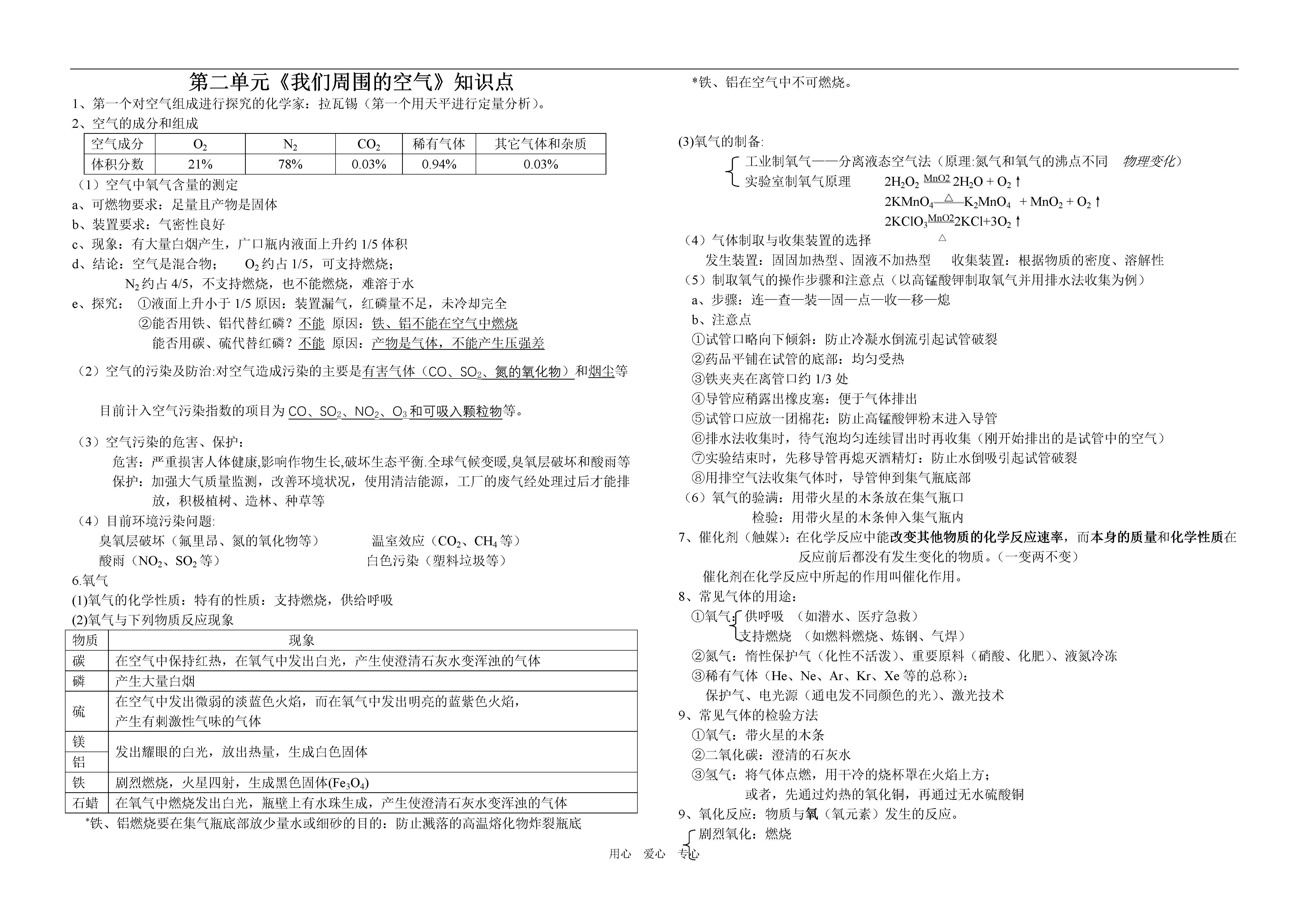 用心爱心专心第二单元《我们周围的空气》知识点1、第一个对空气组成进行探究的化学家:拉瓦锡(第一个用天平进行定量分析)。2、空气的成分和组成空气成分O2N2CO2稀有气体其它气体和杂质体积分数21%78%0.03%0.94%0.03%(1)空气中氧气含量的测定a、可燃物要求:足量且产物是固体b、装置要求:气密性良好c、现象:有大量白烟产生,广口瓶内液面上升约1/5体积d、结论:空气是混合物;O2约占1/5,可支持燃烧;N2约占4/5,不支持燃烧,也不能燃烧,难溶于水e、探究:①液面上升小于1/5原因:装置漏气,红磷量不足,未冷却完全②能否用铁、铝代替红磷?不能原因:铁、铝不能在空气中燃烧能否用碳、硫代替红磷?不能原因:产物是气体,不能产生压强差(2)空气的污染及防治:对空气造成污染的主要是有害气体(CO、SO2、氮的氧化物)和烟尘等目前计入空气污染指数的项目为CO、SO2、NO2、O3和可吸入颗粒物等。(3)空气污染的危害、保护:危害:严重损害人体健康,影响作物生长,破坏生态平衡.全球气候变暖,臭氧层破坏和酸雨等保护:加强大气质量监测,改善环境状况,使用清洁能源,工厂的废气经处理过后才能排放,积极植树、造林、种草等(4)目前环境污染问题:臭氧层破坏(氟里昂、氮的氧化物等)温室效应(CO2、CH4等)酸雨(NO2、SO2等)白色污染(塑料垃圾等)6.氧气(1)氧气的化学性质:特有的性质:支持燃烧,供给呼吸(2)氧气与下列物质反应现象物质现象碳在空气中保持红热,在氧气中发出白光,产生使澄清石灰水变浑浊的气体磷产生大量白烟硫在空气中发出微弱的淡蓝色火焰,而在氧气中发出明亮的蓝紫色火焰,产生有刺激性气味的气体镁发出耀眼的白光,放出热量,生成白色固体铝铁剧烈燃烧,火星四射,生成黑色固体(Fe3O4)石蜡在氧气中燃烧发出白光,瓶壁上有水珠生成,产生使澄清石灰水变浑浊的气体*铁、铝燃烧要在集气瓶底部放少量水或细砂的目的:防止溅落的高温熔化物炸裂瓶底*铁、铝在空气中不可燃烧。(3)氧气的制备:工业制氧气——分离液态空气法(原理:氮气和氧气的沸点不同物理变化)实验室制氧气原理2H2O2MnO22H2O+O2↑2KMnO4△K2MnO4+MnO2+O2↑2KClO3MnO22KCl+3O2↑(4)气体制取与收集装置的选择△发生装置:固固加热型、固液不加热型收集装置:根据物质的密度、溶解性(5)制取氧气的操作步骤和注意点(以高锰酸钾制取氧气并用排水法收集为例)a、步骤:连—查—装—固—点—收—移—熄b、注意点①试管口略向下倾斜:防止冷凝水倒流引起试管破裂②药品平铺在试管的底部:均匀受热③铁夹夹在离管口约1/3处④导管应稍露出橡皮塞:便于气体排出⑤试管口应放一团棉花:防止高锰酸钾粉末进入导管⑥排水法收集时,待气泡均匀连续冒出时再收集(刚开始排出的是试管中的空气)⑦实验结束时,先移导管再熄灭酒精灯:防止水倒吸引起试管破裂⑧用排空气法收集气体时,导管伸到集气瓶底部(6)氧气的验满:用带火星的木条放在集气瓶口检验:用带火星的木条伸入集气瓶内7、催化剂(触媒):在化学反应中能改变其他物质的化学反应速率,而本身的质量和化学性质在反应前后都没有发生变化的物质。(一变两不变)催化剂在化学反应中所起的作用叫催化作用。8、常见气体的用途:①氧气:供呼吸(如潜水、医疗急救)支持燃烧(如燃料燃烧、炼钢、气焊)②氮气:惰性保护气(化性不活泼)、重要原料(硝酸、化肥)、液氮冷冻③稀有气体(He、Ne、Ar、Kr、Xe等的总称):保护气、电光源(通电发不同颜色的光)、激光技术9、常见气体的检验方法①氧气:带火星的木条②二氧化碳:澄清的石灰水③氢气:将气体点燃,用干冷的烧杯罩在火焰上方;或者,先通过灼热的氧化铜,再通过无水硫酸铜9、氧化反应:物质与氧(氧元素)发生的反应。剧烈氧化:燃烧缓慢氧化:铁生锈、人的呼吸、事物腐烂、酒的酿造共同点:①都是氧化反应②都放热