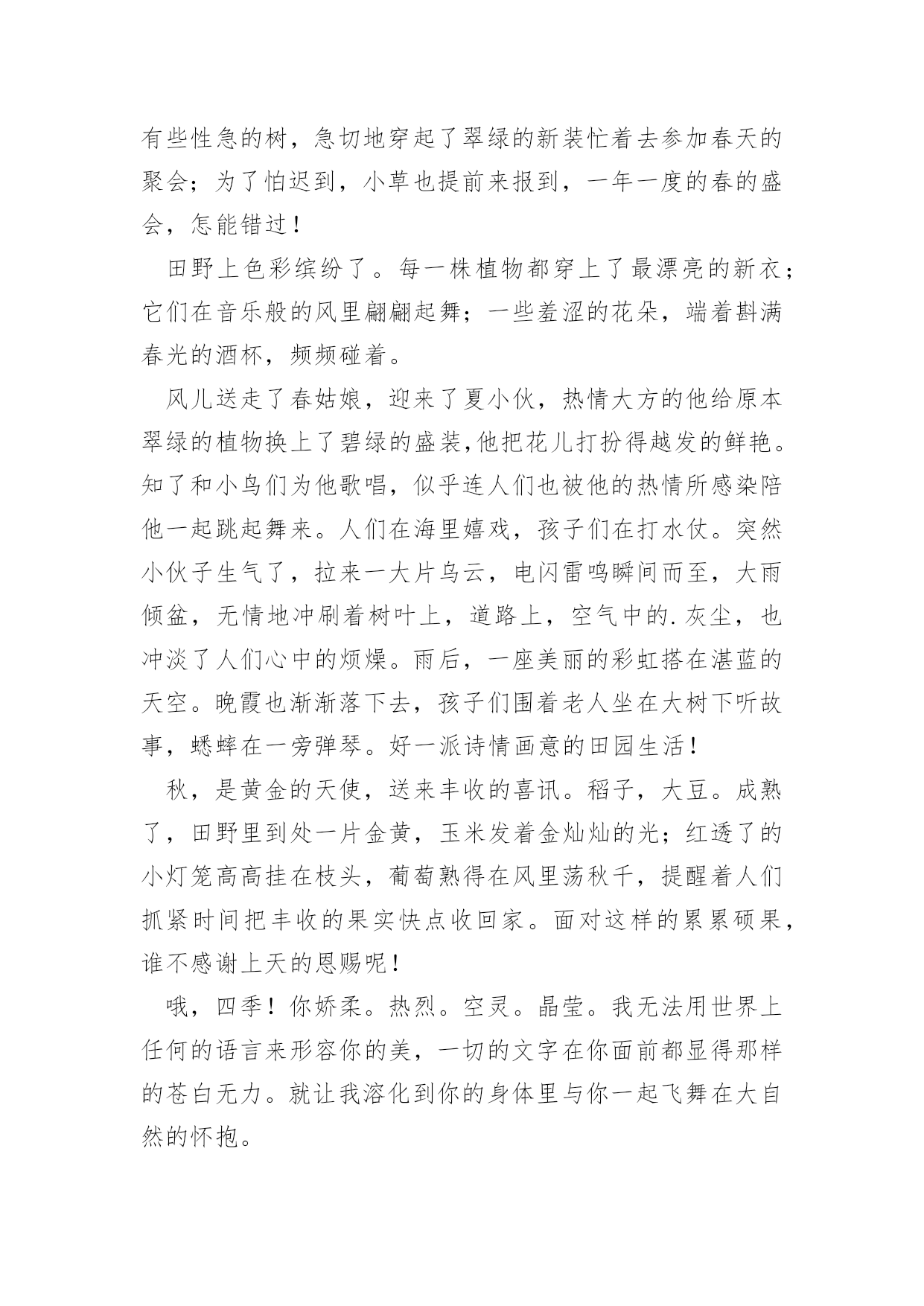 四季 四季大自然的力量是多么神奇,创造出多么美好的四季,它向我们微笑着:当秋天的最后一片“枯叶蝶”落下的时候,白雪公主乘着“专车”从西伯利亚赶回来,她不顾旅途劳累,这里走走,那里逛逛。房屋,田野忽然都变得空旷了。我却闷得慌,一个大冬天外面那么冷,只好在屋里守着电视发呆。忽然,我眼前一亮:哈尔滨下雪了!好一个粉妆玉砌的世界。看着电视里孩子们跑来跑去的堆雪人打雪仗,这让身处四川从来没见过雪的我羡慕极了。没想到过了几天,我也领略了雪的风采。大年初二,我和家人去了峨眉山。车驶入高山区后,俯身鸟瞰,白茫茫的一片。各种树木都披上了雪白的衣裙随风飞舞,衣袂飘飘。近处的松枝挂满了冰凌,在阳光的照耀下显得分外的光彩夺目。我和弟弟一下车就迫不及待的滚到厚厚的雪地上,抓起雪互相扔到对方的脸上身上,不一会儿全家人都被我俩弄得全身是雪,有些调皮的雪花还跑到脖子里,叫人冷得不禁尖叫起来。跺跺脚,嘎叭嘎叭的响,伸出舌头舔舔树梢上的雪花,凉冰冰甜丝丝的。哦,雪,可爱的精灵,我终于可以和你这样的亲近了。不久,春风来了,送来春姑娘迷人的笑容。她身着绿色长裙,在蓝天白云的护送下翩然而来,万物开始从沉睡中醒来。有些性急的树,急切地穿起了翠绿的新装忙着去参加春天的聚会;为了怕迟到,小草也提前来报到,一年一度的春的盛会,怎能错过!田野上色彩缤纷了。每一株植物都穿上了最漂亮的新衣;它们在音乐般的风里翩翩起舞;一些羞涩的花朵,端着斟满春光的酒杯,频频碰着。风儿送走了春姑娘,迎来了夏小伙,热情大方的他给原本翠绿的植物换上了碧绿的盛装,他把花儿打扮得越发的鲜艳。知了和小鸟们为他歌唱,似乎连人们也被他的热情所感染陪他一起跳起舞来。人们在海里嬉戏,孩子们在打水仗。突然小伙子生气了,拉来一大片乌云,电闪雷鸣瞬间而至,大雨倾盆,无情地冲刷着树叶上,道路上,空气中的.灰尘,也冲淡了人们心中的烦燥。雨后,一座美丽的彩虹搭在湛蓝的天空。晚霞也渐渐落下去,孩子们围着老人坐在大树下听故事,蟋蟀在一旁弹琴。好一派诗情画意的田园生活!秋,是黄金的天使,送来丰收的喜讯。稻子,大豆。成熟了,田野里到处一片金黄,玉米发着金灿灿的光;红透了的小灯笼高高挂在枝头,葡萄熟得在风里荡秋千,提醒着人们抓紧时间把丰收的果实快点收回家。面对这样的累累硕果,谁不感谢上天的恩赐呢!哦,四季!你娇柔。热烈。空灵。晶莹。我无法用世界上任何的语言来形容你的美,一切的文字在你面前都显得那样的苍白无力。就让我溶化到你的身体里与你一起飞舞在大自然的怀抱。