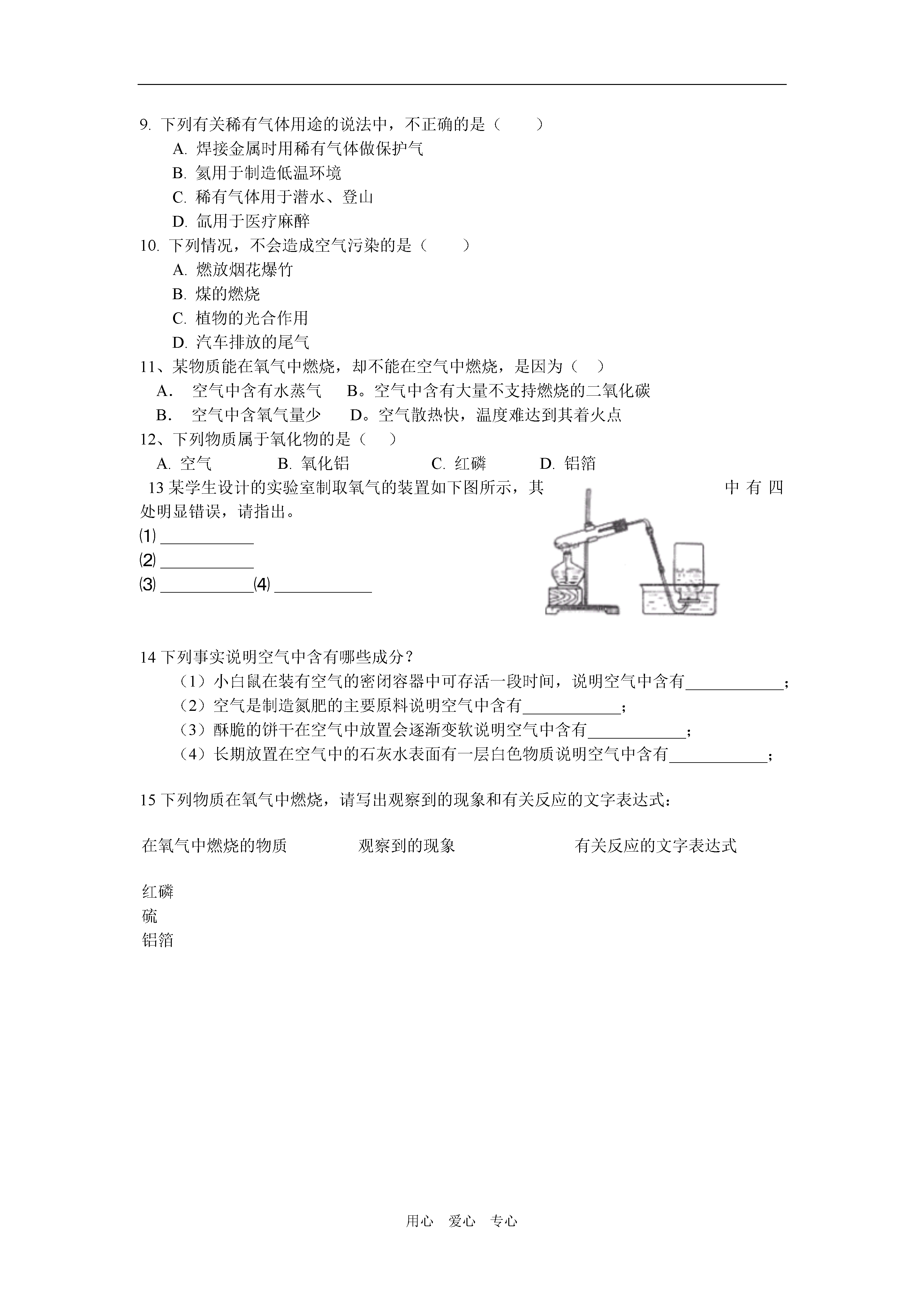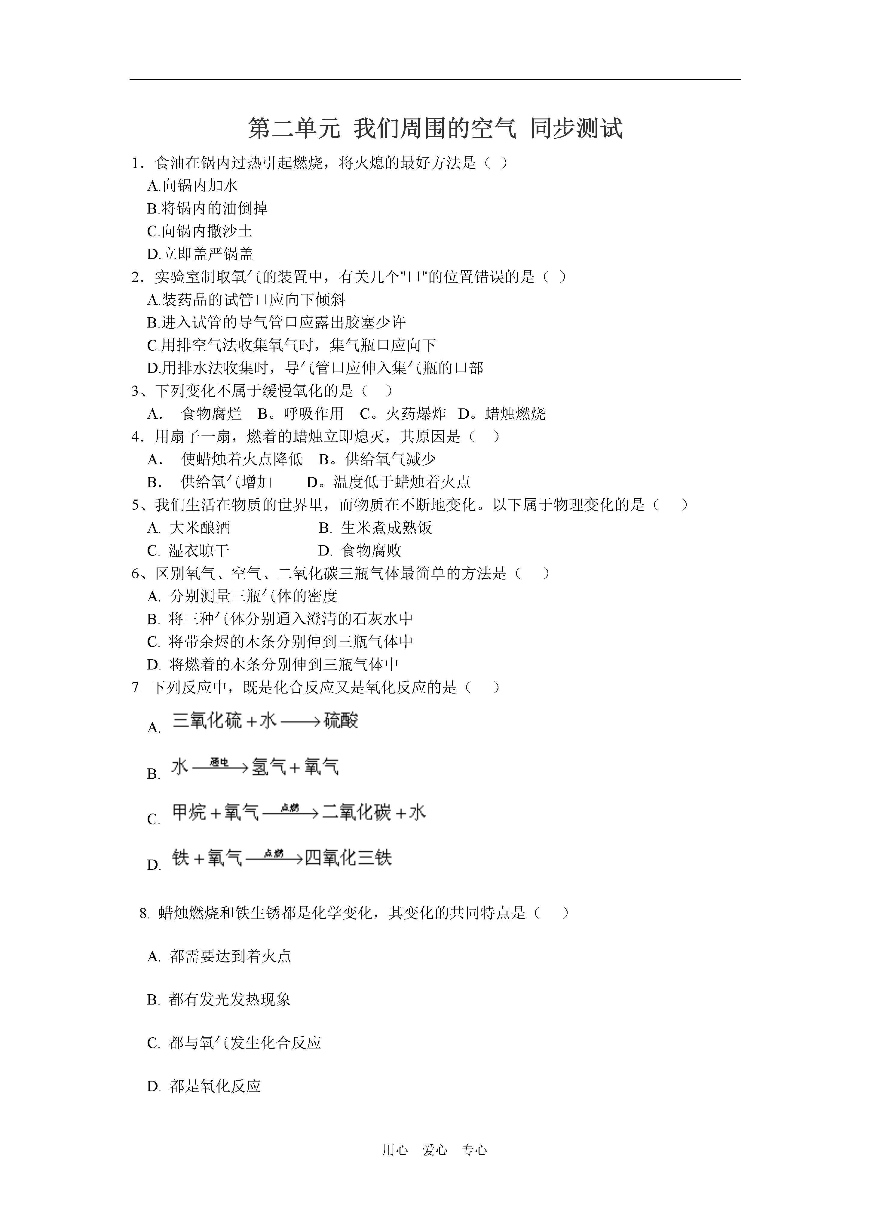 用心爱心专心第二单元我们周围的空气同步测试1.食油在锅内过热引起燃烧,将火熄的最好方法是()A.向锅内加水B.将锅内的油倒掉C.向锅内撒沙土D.立即盖严锅盖2.实验室制取氧气的装置中,有关几个"口"的位置错误的是()A.装药品的试管口应向下倾斜B.进入试管的导气管口应露出胶塞少许C.用排空气法收集氧气时,集气瓶口应向下D.用排水法收集时,导气管口应伸入集气瓶的口部3、下列变化不属于缓慢氧化的是()A.食物腐烂B。呼吸作用C。火药爆炸D。蜡烛燃烧4.用扇子一扇,燃着的蜡烛立即熄灭,其原因是()A.使蜡烛着火点降低B。供给氧气减少B.供给氧气增加D。温度低于蜡烛着火点5、我们生活在物质的世界里,而物质在不断地变化。以下属于物理变化的是()A.大米酿酒B.生米煮成熟饭C.湿衣晾干D.食物腐败6、区别氧气、空气、二氧化碳三瓶气体最简单的方法是()A.分别测量三瓶气体的密度B.将三种气体分别通入澄清的石灰水中C.将带余烬的木条分别伸到三瓶气体中D.将燃着的木条分别伸到三瓶气体中7.下列反应中,既是化合反应又是氧化反应的是()A.B.C.D.8.蜡烛燃烧和铁生锈都是化学变化,其变化的共同特点是()A.都需要达到着火点B.都有发光发热现象C.都与氧气发生化合反应D.都是氧化反应9.下列有关稀有气体用途的说法中,不正确的是()A.焊接金属时用稀有气体做保护气B.氦用于制造低温环境C.稀有气体用于潜水、登山D.氙用于医疗麻醉10.下列情况,不会造成空气污染的是()A.燃放烟花爆竹B.煤的燃烧C.植物的光合作用D.汽车排放的尾气11、某物质能在氧气中燃烧,却不能在空气中燃烧,是因为()A.空气中含有水蒸气B。空气中含有大量不支持燃烧的二氧化碳B.空气中含氧气量少D。空气散热快,温度难达到其着火点12、下列物质属于氧化物的是()A.空气B.氧化铝C.红磷D.铝箔13某学生设计的实验室制取氧气的装置如下图所示,其中有四处明显错误,请指出。⑴⑵⑶⑷14下列事实说明空气中含有哪些成分?(1)小白鼠在装有空气的密闭容器中可存活一段时间,说明空气中含有____________;(2)空气是制造氮肥的主要原料说明空气中含有____________;(3)酥脆的饼干在空气中放置会逐渐变软说明空气中含有____________;(4)长期放置在空气中的石灰水表面有一层白色物质说明空气中含有____________;15下列物质在氧气中燃烧,请写出观察到的现象和有关反应的文字表达式:在氧气中燃烧的物质观察到的现象有关反应的文字表达式红磷硫铝箔【试题答案】1D2C3D4D5C6D7D8D9C10C11C12B13、⑴试管口向上倾斜⑵试管夹夹在试管中部⑶导气管进入试管太长⑷用焰心加热。14(1)氧气;(2)氮气;(3)水蒸气;(4)二氧化碳15略。