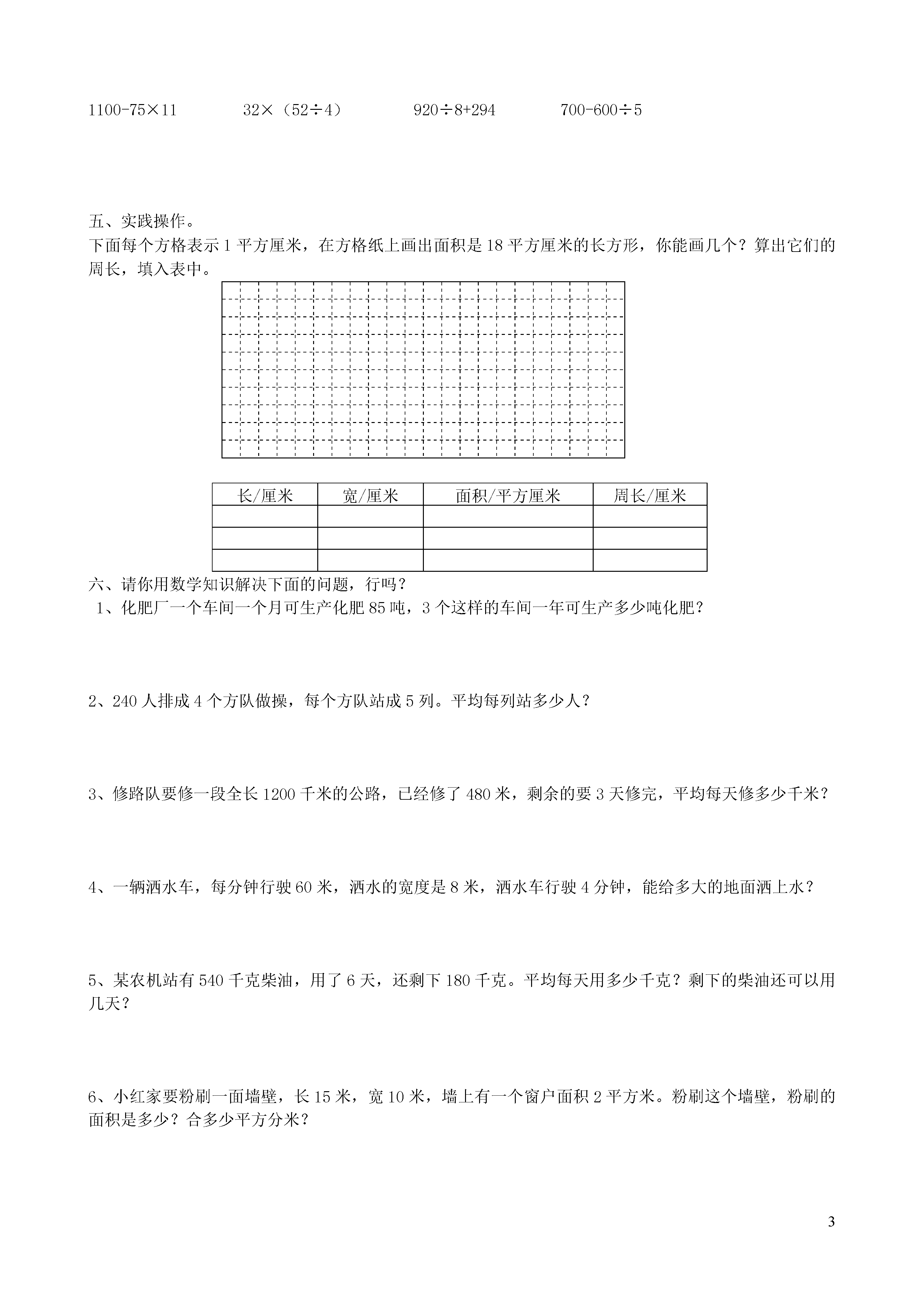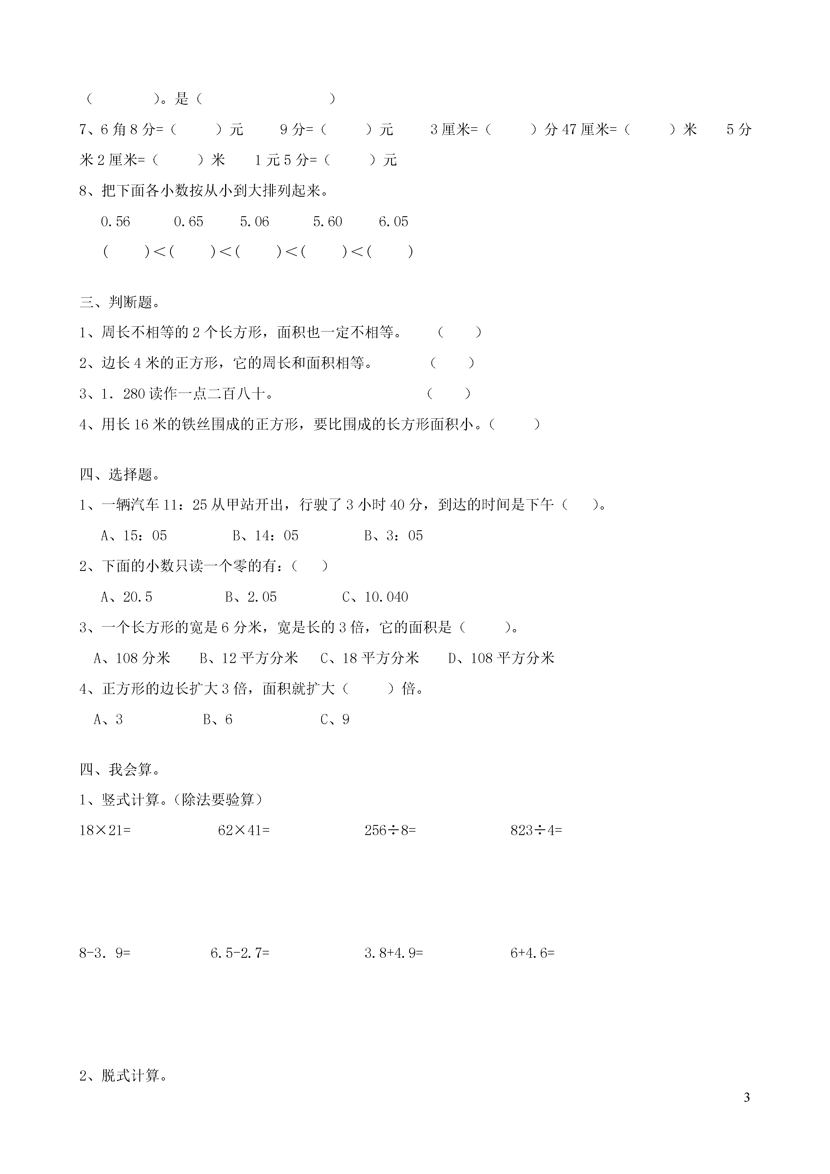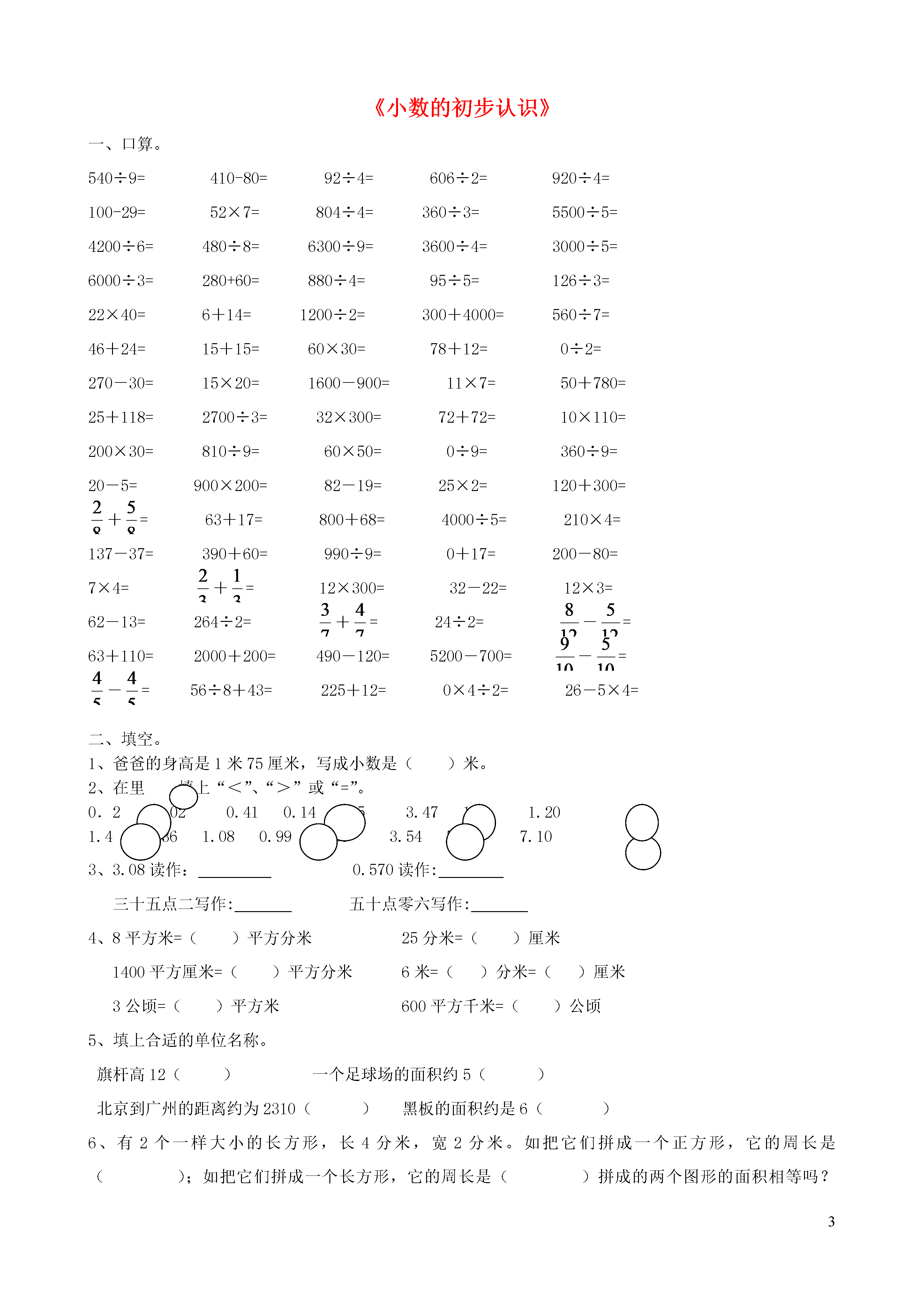 3《小数的初步认识》一、口算。540÷9=410-80=92÷4=606÷2=920÷4=100-29=52×7=804÷4=360÷3=5500÷5=4200÷6=480÷8=6300÷9=3600÷4=3000÷5=6000÷3=280+60=880÷4=95÷5=126÷3=22×40=6+14=1200÷2=300+4000=560÷7=46+24=15+15=60×30=78+12=0÷2=270-30=15×20=1600-900=11×7=50+780=25+118=2700÷3=32×300=72+72=10×110=200×30=810÷9=60×50=0÷9=360÷9=20-5=900×200=82-19=25×2=120+300=+=63+17=800+68=4000÷5=210×4=137-37=390+60=990÷9=0+17=200-80=7×4=+=12×300=32-22=12×3=62-13=264÷2=+=24÷2=-=63+110=2000+200=490-120=5200-700=-=-=56÷8+43=225+12=0×4÷2=26-5×4=二、填空。1、爸爸的身高是1米75厘米,写成小数是()米。2、在里填上“<”、“>”或“=”。0.20.020.410.143.53.471.21.201.41.361.080.993.583.547.017.103、3.08读作:0.570读作:三十五点二写作:五十点零六写作:4、8平方米=()平方分米25分米=()厘米1400平方厘米=()平方分米6米=()分米=()厘米3公顷=()平方米600平方千米=()公顷5、填上合适的单位名称。旗杆高12()一个足球场的面积约5()北京到广州的距离约为2310()黑板的面积约是6()6、有2个一样大小的长方形,长4分米,宽2分米。如把它们拼成一个正方形,它的周长是();如把它们拼成一个长方形,它的周长是()拼成的两个图形的面积相等吗?()。是()7、6角8分=()元9分=()元3厘米=()分47厘米=()米5分米2厘米=()米1元5分=()元8、把下面各小数按从小到大排列起来。0.560.655.065.606.05()<()<()<()<()三、判断题。1、周长不相等的2个长方形,面积也一定不相等。()2、边长4米的正方形,它的周长和面积相等。()3、1.280读作一点二百八十。()4、用长16米的铁丝围成的正方形,要比围成的长方形面积小。()四、选择题。1、一辆汽车11:25从甲站开出,行驶了3小时40分,到达的时间是下午()。A、15:05B、14:05B、3:052、下面的小数只读一个零的有:()A、20.5B、2.05C、10.0403、一个长方形的宽是6分米,宽是长的3倍,它的面积是()。A、108分米B、12平方分米C、18平方分米D、108平方分米4、正方形的边长扩大3倍,面积就扩大()倍。A、3B、6C、9四、我会算。1、竖式计算。(除法要验算)18×21=62×41=256÷8=823÷4=8-3.9=6.5-2.7=3.8+4.9=6+4.6=2、脱式计算。1100-75×1132×(52÷4)920÷8+294700-600÷5五、实践操作。下面每个方格表示1平方厘米,在方格纸上画出面积是18平方厘米的长方形,你能画几个?算出它们的周长,填入表中。长/厘米宽/厘米面积/平方厘米周长/厘米六、请你用数学知识解决下面的问题,行吗?1、化肥厂一个车间一个月可生产化肥85吨,3个这样的车间一年可生产多少吨化肥?2、240人排成4个方队做操,每个方队站成5列。平均每列站多少人?3、修路队要修一段全长1200千米的公路,已经修了480米,剩余的要3天修完,平均每天修多少千米?4、一辆洒水车,每分钟行驶60米,洒水的宽度是8米,洒水车行驶4分钟,能给多大的地面洒上水?5、某农机站有540千克柴油,用了6天,还剩下180千克。平均每天用多少千克?剩下的柴油还可以用几天?6、小红家要粉刷一面墙壁,长15米,宽10米,墙上有一个窗户面积2平方米。粉刷这个墙壁,粉刷的面积是多少?合多少平方分米?7、牛奶9.8元/盒鸡蛋5.5元/千克西瓜2.8元/千克西红柿3.4元/千克妈妈有15元钱,买一盒牛奶和1千克鸡蛋够吗?(2)西红柿比西瓜贵多少元?(3)你还能提出什么数学问题?该怎么解答?