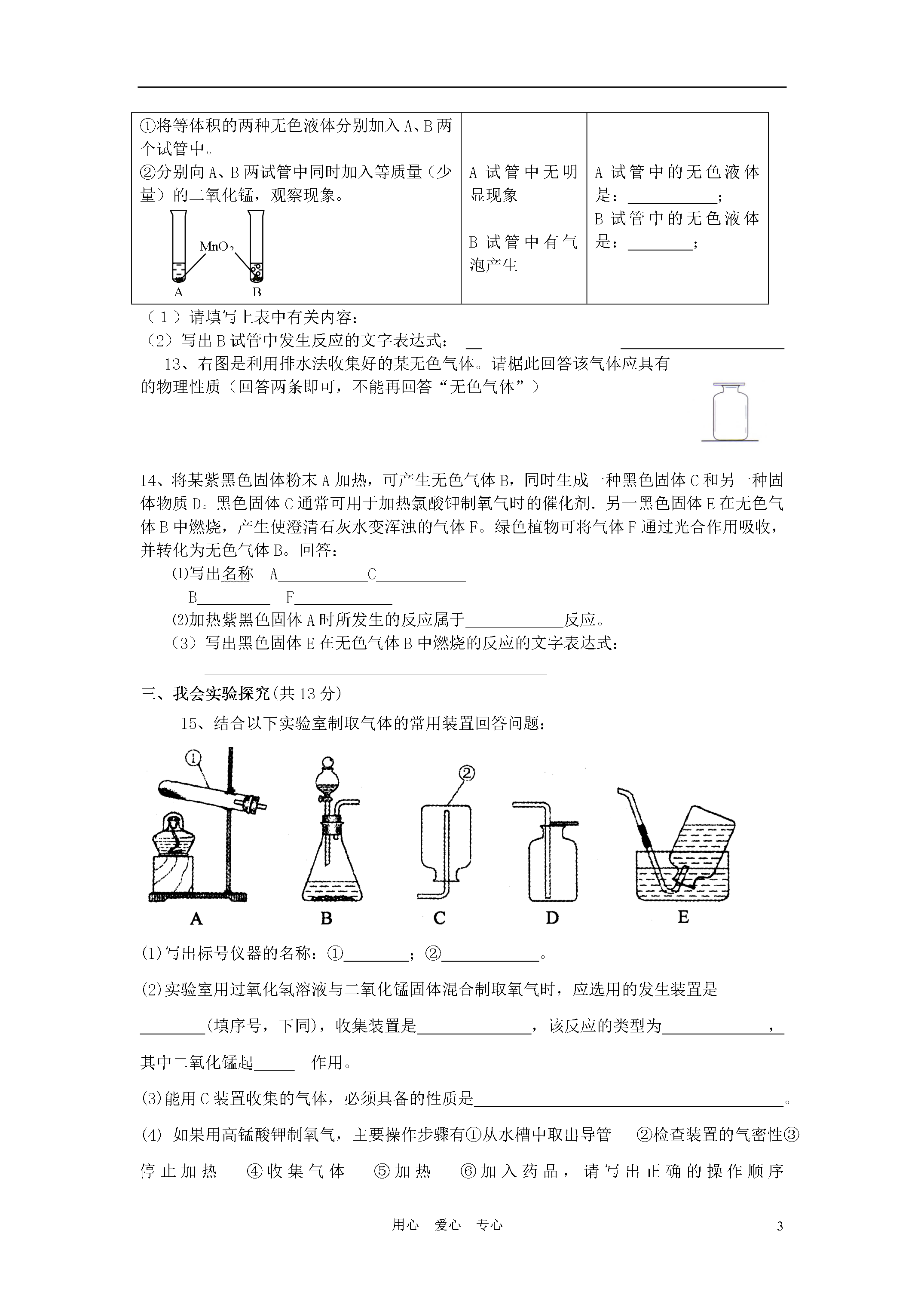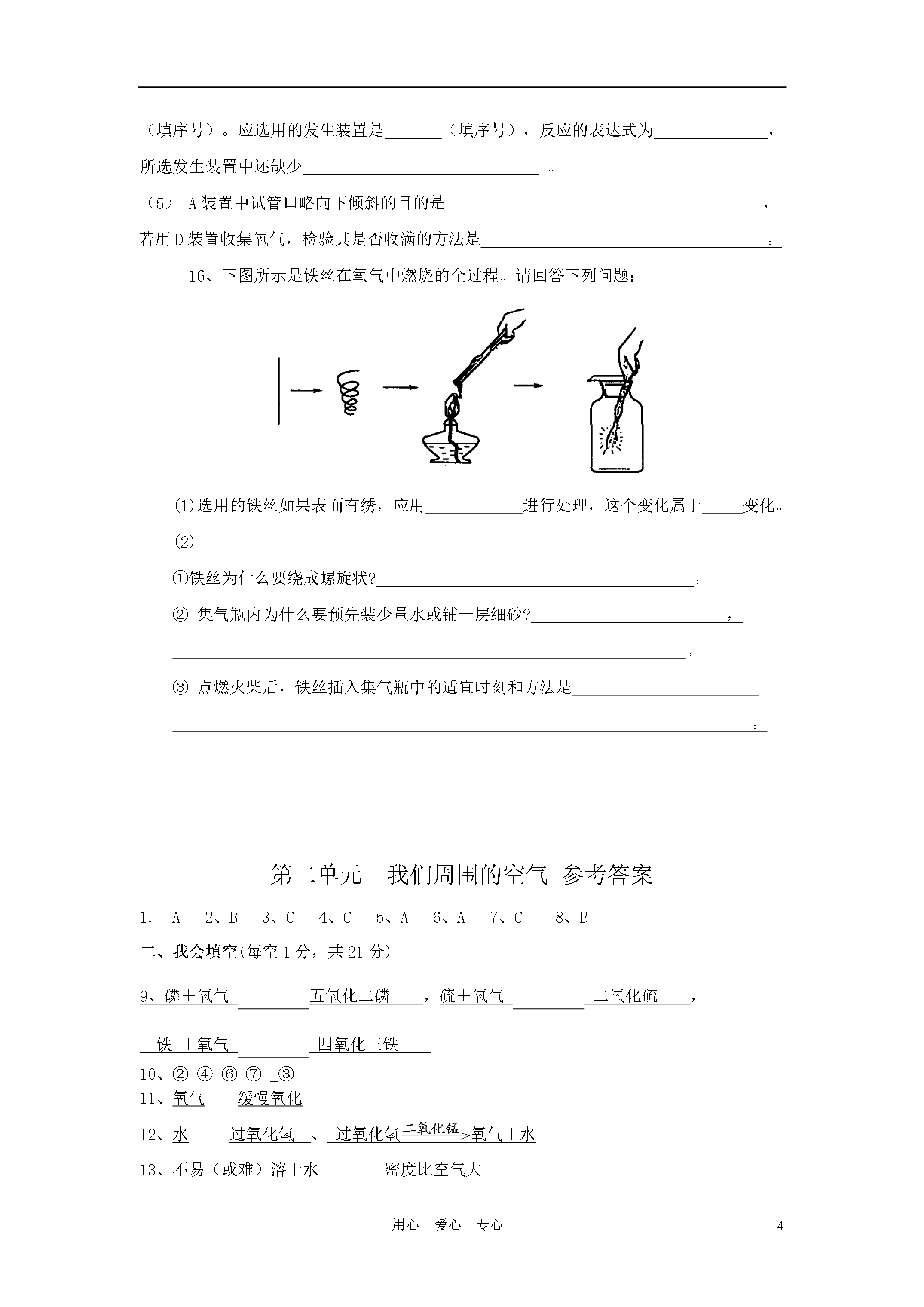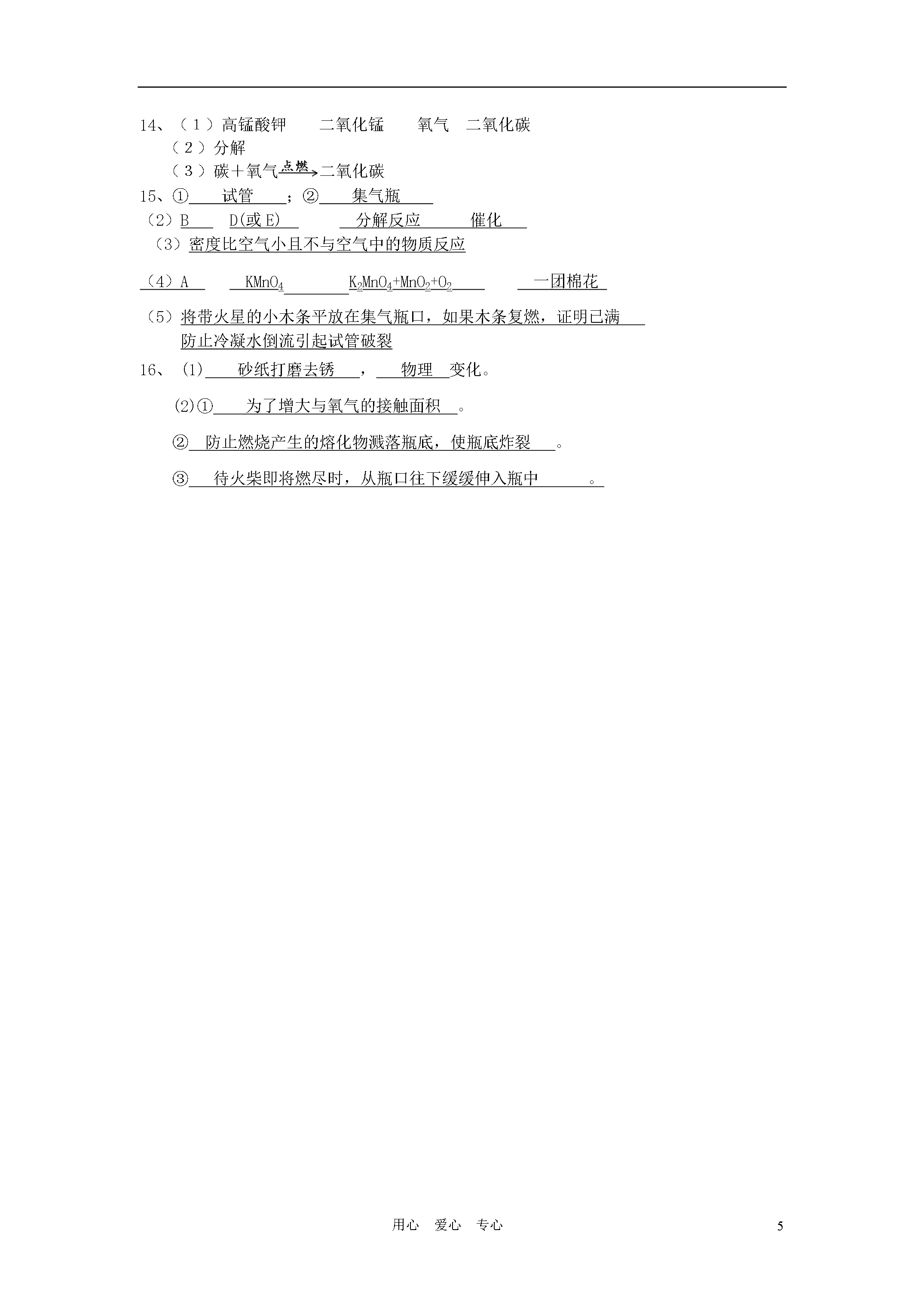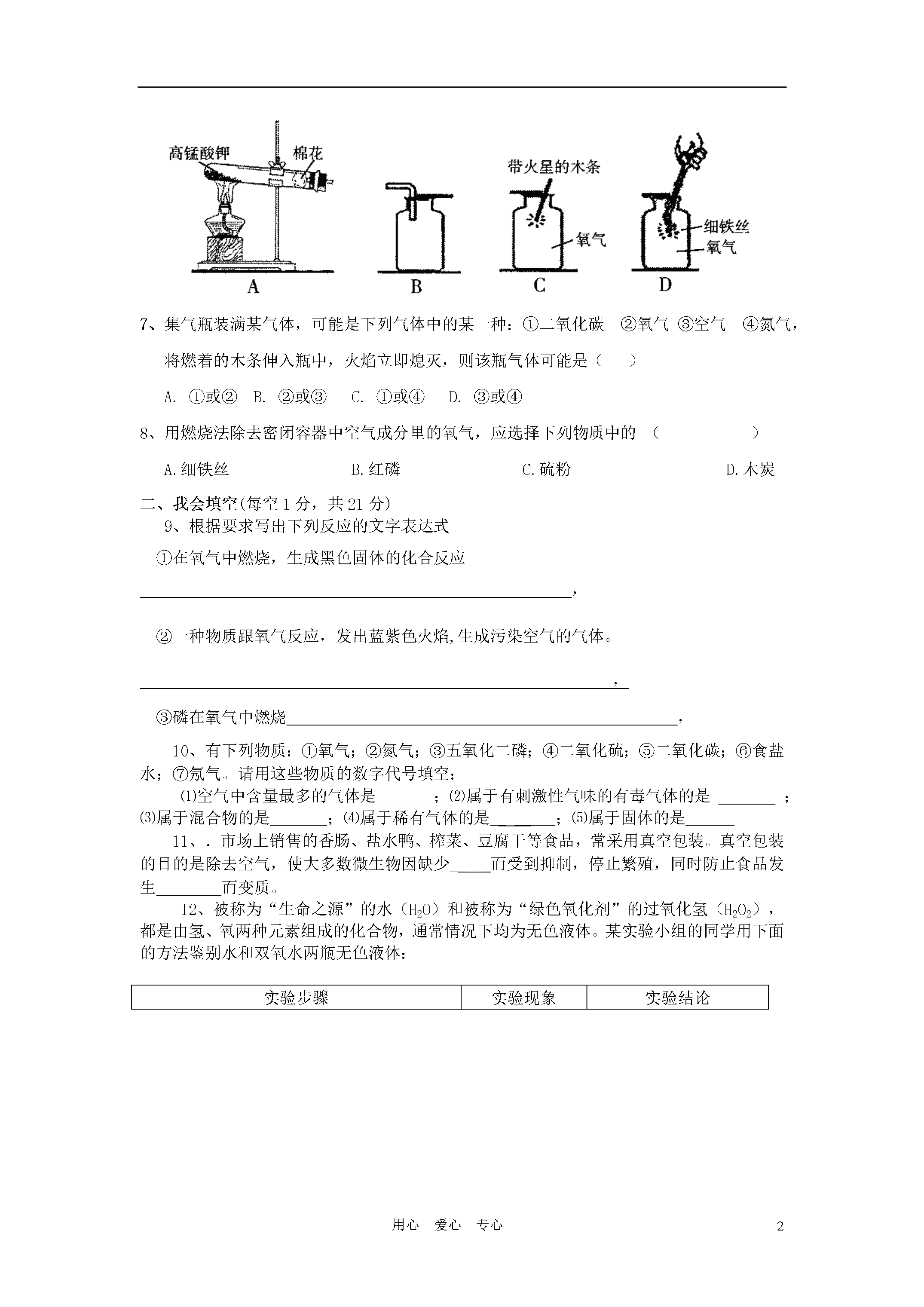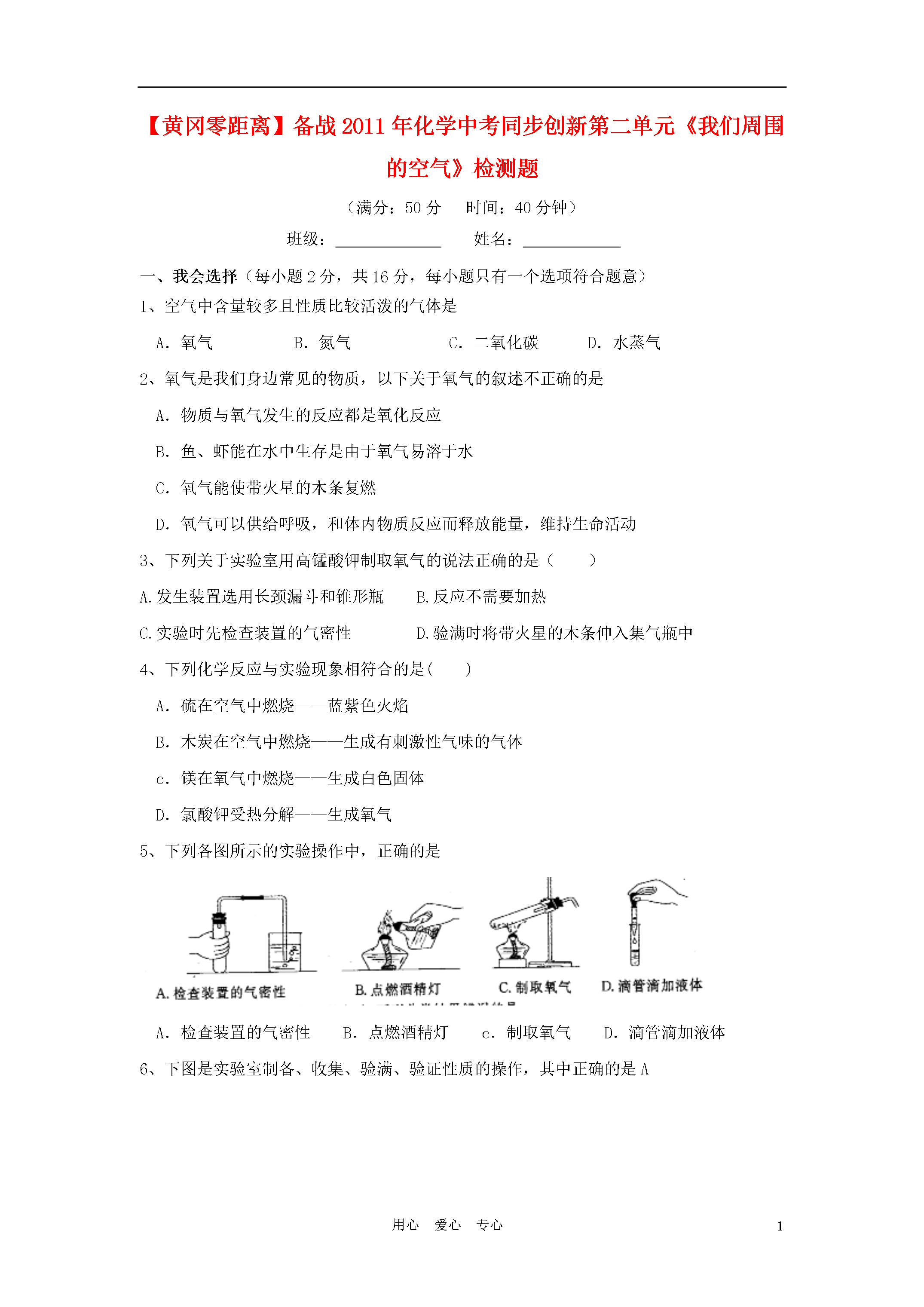 5用心爱心专心【黄冈零距离】备战2011年化学中考同步创新第二单元《我们周围的空气》检测题(满分:50分时间:40分钟)班级:姓名:一、我会选择(每小题2分,共16分,每小题只有一个选项符合题意)1、空气中含量较多且性质比较活泼的气体是A.氧气B.氮气C.二氧化碳D.水蒸气2、氧气是我们身边常见的物质,以下关于氧气的叙述不正确的是A.物质与氧气发生的反应都是氧化反应B.鱼、虾能在水中生存是由于氧气易溶于水C.氧气能使带火星的木条复燃D.氧气可以供给呼吸,和体内物质反应而释放能量,维持生命活动3、下列关于实验室用高锰酸钾制取氧气的说法正确的是()A.发生装置选用长颈漏斗和锥形瓶B.反应不需要加热C.实验时先检查装置的气密性D.验满时将带火星的木条伸入集气瓶中4、下列化学反应与实验现象相符合的是()A.硫在空气中燃烧——蓝紫色火焰B.木炭在空气中燃烧——生成有刺激性气味的气体c.镁在氧气中燃烧——生成白色固体D.氯酸钾受热分解——生成氧气5、下列各图所示的实验操作中,正确的是A.检查装置的气密性B.点燃酒精灯c.制取氧气D.滴管滴加液体6、下图是实验室制备、收集、验满、验证性质的操作,其中正确的是A7、集气瓶装满某气体,可能是下列气体中的某一种:①二氧化碳②氧气③空气④氮气,将燃着的木条伸入瓶中,火焰立即熄灭,则该瓶气体可能是()A.①或②B.②或③C.①或④D.③或④8、用燃烧法除去密闭容器中空气成分里的氧气,应选择下列物质中的()A.细铁丝B.红磷C.硫粉D.木炭二、我会填空(每空1分,共21分)9、根据要求写出下列反应的文字表达式①在氧气中燃烧,生成黑色固体的化合反应,②一种物质跟氧气反应,发出蓝紫色火焰,生成污染空气的气体。,③磷在氧气中燃烧,10、有下列物质:①氧气;②氮气;③五氧化二磷;④二氧化硫;⑤二氧化碳;⑥食盐水;⑦氖气。请用这些物质的数字代号填空:⑴空气中含量最多的气体是_______;⑵属于有刺激性气味的有毒气体的是_______;⑶属于混合物的是_______;⑷属于稀有气体的是_______;⑸属于固体的是______11、.市场上销售的香肠、盐水鸭、榨菜、豆腐干等食品,常采用真空包装。真空包装的目的是除去空气,使大多数微生物因缺少___而受到抑制,停止繁殖,同时防止食品发生而变质。12、被称为“生命之源”的水(H2O)和被称为“绿色氧化剂”的过氧化氢(H2O2),都是由氢、氧两种元素组成的化合物,通常情况下均为无色液体。某实验小组的同学用下面的方法鉴别水和双氧水两瓶无色液体:实验步骤实验现象实验结论①将等体积的两种无色液体分别加入A、B两个试管中。②分别向A、B两试管中同时加入等质量(少量)的二氧化锰,观察现象。MnO2ABA试管中无明显现象B试管中有气泡产生A试管中的无色液体是:;B试管中的无色液体是:;(1)请填写上表中有关内容:(2)写出B试管中发生反应的文字表达式:13、右图是利用排水法收集好的某无色气体。请椐此回答该气体应具有的物理性质(回答两条即可,不能再回答“无色气体”)14、将某紫黑色固体粉末A加热,可产生无色气体B,同时生成一种黑色固体C和另一种固体物质D。黑色固体C通常可用于加热氯酸钾制氧气时的催化剂.另一黑色固体E在无色气体B中燃烧,产生使澄清石灰水变浑浊的气体F。绿色植物可将气体F通过光合作用吸收,并转化为无色气体B。回答:⑴写出名称A___________C___________B_________F____________⑵加热紫黑色固体A时所发生的反应属于____________反应。(3)写出黑色固体E在无色气体B中燃烧的反应的文字表达式:__________________________________________三、我会实验探究(共13分)15、结合以下实验室制取气体的常用装置回答问题:(1)写出标号仪器的名称:①;②。(2)实验室用过氧化氢溶液与二氧化锰固体混合制取氧气时,应选用的发生装置是(填序号,下同),收集装置是,该反应的类型为,其中二氧化锰起______作用。(3)能用C装置收集的气体,必须具备的性质是。(4)如果用高锰酸钾制氧气,主要操作步骤有①从水槽中取出导管②检查装置的气密性③停止加热④收集气体⑤加热⑥加入药品,请写出正确的操作顺序(填序号)。应选用的发生装置是(填序号),反应的表达式为,所选发生装置中还缺少。(5)A装置中试管口略向下倾斜的目的是,若用D装置收集氧气,检验其是否收满的方法是。16、下图所示是铁丝在氧气中燃烧的全过程。请回答下列问题:(1)选用的铁丝如果表面有绣,应用进行处理,这个变化属于变化。(2)①铁丝为什么要绕成螺旋状?。②集气瓶内为什么要预先装少量水或铺一层细砂?,。③点燃火柴后,铁丝插入集气瓶中的适宜时刻和方法是。第二单