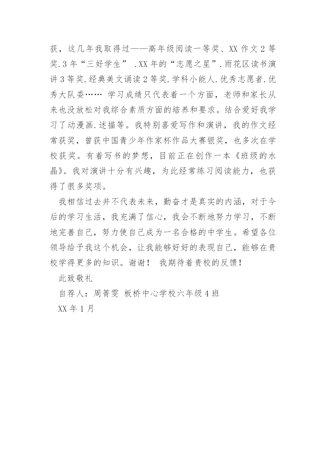 沈琪的填写 沈琪的填写自荐信尊敬的学校领导:您好!首先衷心感谢您能在百忙之中浏览我的自荐信,为一位满腔热情的小学生开启一扇希望之门。我叫周箐雯,就读于雨花区板桥中心小学,是一名即将迈出小学校门跨入中学旅途的小学生。我对贵校神往已久,渴望成为贵校的一名学生,开始我的初中生活之旅,我怀着一颗赤诚的心和对贵校的憧憬,真诚地向您推荐自己。我热爱学习,思维活跃,待人诚恳,助人为乐,见解独特,是一名在德智体三方面都有优异表现的学生。我从三年级起通过竞选连续至今当选了学校的大队委干部,六年级晋职副大队长,佩戴着“三条杠”的我平时严于律己,课内是同学的小榜样,课余则是老师的好帮手。由于我出色的组织和表达能力,从四年级至今一直担任学校各项活动的主持人,比如校奥运主题活动、心连心活动、读书节活动、开学典礼、升旗仪式等等;我与其他同学共同编导的“家庭安全警示剧”在校园汇演中演出获得老师和同学们的一致好评;自1年级起我连续获校三好学生及优秀小干部称号,并于XX年的5月荣获雨花区区级“十佳志愿者”称号。在小学期间我各门功课成绩优异,学校中的课本早已满足不了我对知识的渴望,在老师和家长的支持下,从四年级起我就坚持参加博亚培训小学三门学科培训。一分耕耘一分收获,这几年我取得过——高年级阅读一等奖、XX作文2等奖.3年“三好学生”.XX年的“志愿之星”.雨花区读书演讲3等奖.经典美文诵读2等奖.学科小能人.优秀志愿者.优秀大队委……学习成绩只代表着一个方面,老师和家长从来也没放松对我综合素质方面的培养和要求。结合爱好我学习了动漫画.述描等。我特别喜爱写作和演讲,我的作文经常获奖,曾获中国青少年作家杯作品大赛银奖,也多次在学校获奖。有着写书的梦想,目前正在创作一本《班级的水晶》。我对演讲十分有兴趣,为此经常练习阅读能力,也获得了很多奖项。我相信过去并不代表未来,勤奋才是真实的内涵,对于今后的学习生活,我充满了信心,我会不断地努力学习,不断地完善自己,努力使自己成为一名合格的中学生。希望各位领导给予我这个机会,让我能够好好的表现自己,能够在贵校学得更多的知识。谢谢!我期待着贵校的反馈!此致敬礼自荐人:周箐雯板桥中心学校六年级4班XX年1月