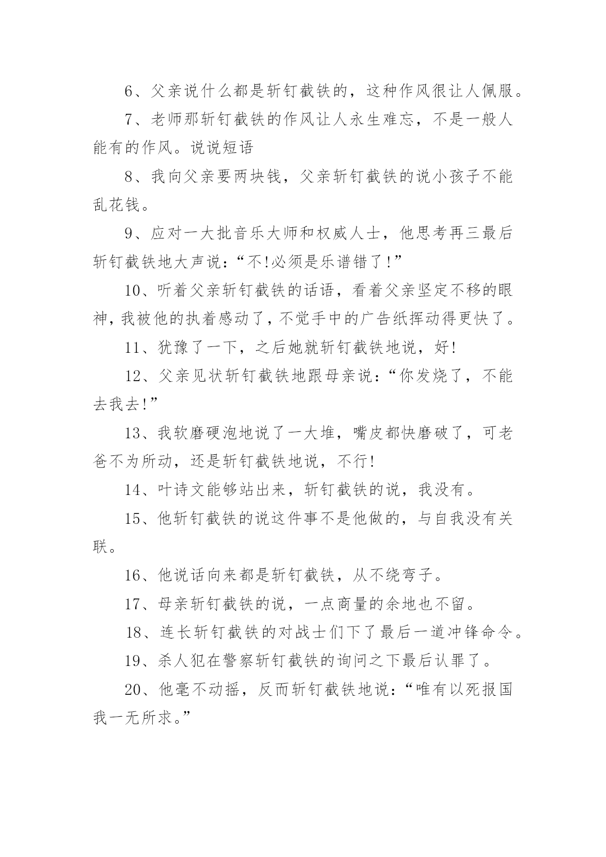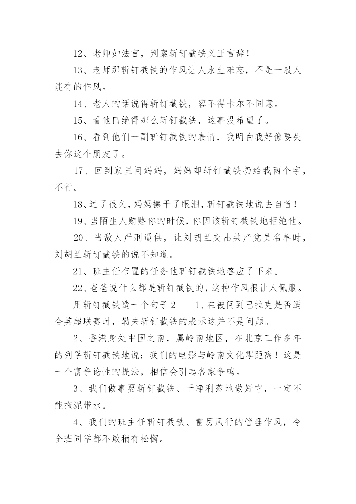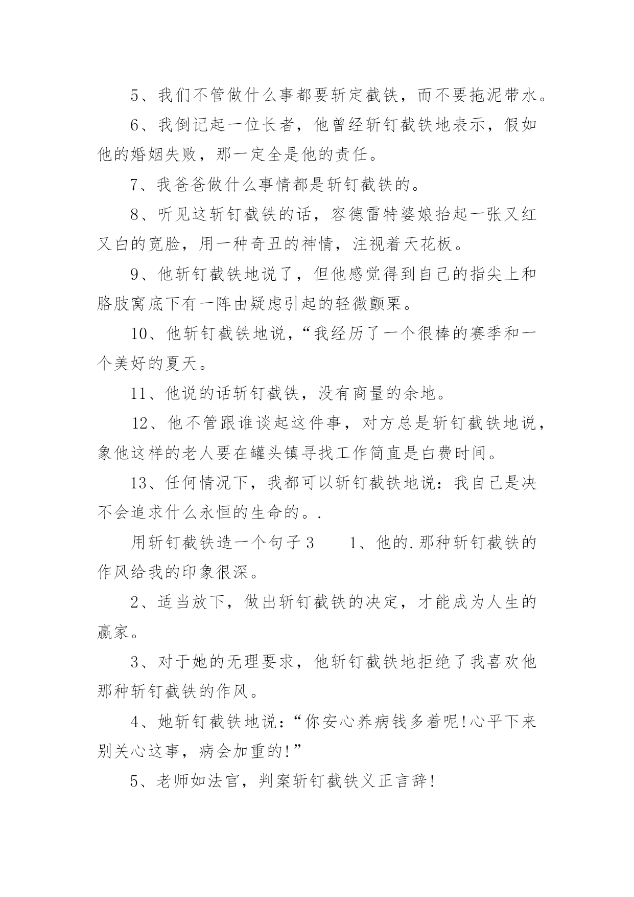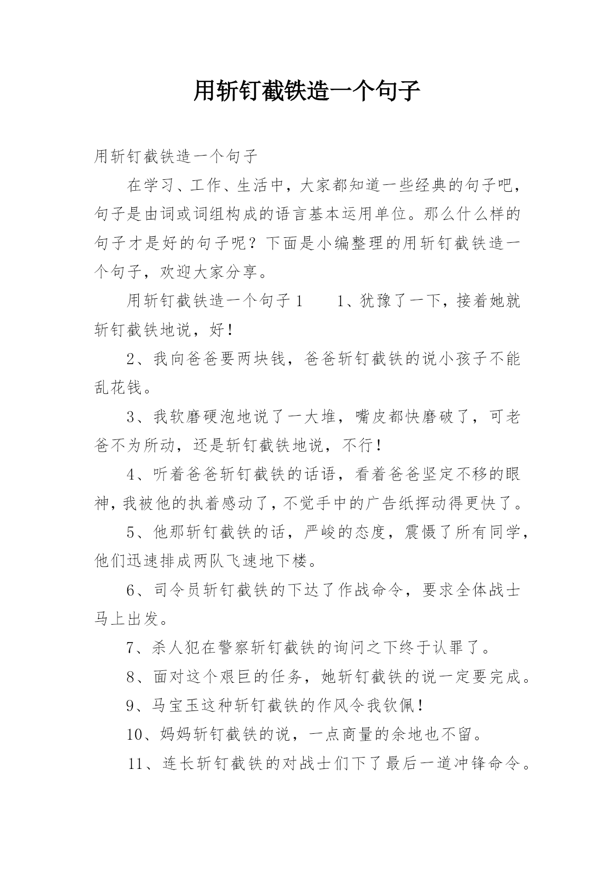 用斩钉截铁造一个句子 用斩钉截铁造一个句子在学习、工作、生活中,大家都知道一些经典的句子吧,句子是由词或词组构成的语言基本运用单位。那么什么样的句子才是好的句子呢?下面是小编整理的用斩钉截铁造一个句子,欢迎大家分享。用斩钉截铁造一个句子11、犹豫了一下,接着她就斩钉截铁地说,好!2、我向爸爸要两块钱,爸爸斩钉截铁的说小孩子不能乱花钱。3、我软磨硬泡地说了一大堆,嘴皮都快磨破了,可老爸不为所动,还是斩钉截铁地说,不行!4、听着爸爸斩钉截铁的话语,看着爸爸坚定不移的眼神,我被他的执着感动了,不觉手中的广告纸挥动得更快了。5、他那斩钉截铁的话,严峻的态度,震慑了所有同学,他们迅速排成两队飞速地下楼。6、司令员斩钉截铁的下达了作战命令,要求全体战士马上出发。7、杀人犯在警察斩钉截铁的询问之下终于认罪了。8、面对这个艰巨的任务,她斩钉截铁的说一定要完成。9、马宝玉这种斩钉截铁的作风令我钦佩!10、妈妈斩钉截铁的说,一点商量的余地也不留。11、连长斩钉截铁的对战士们下了最后一道冲锋命令。12、老师如法官,判案斩钉截铁义正言辞!13、老师那斩钉截铁的作风让人永生难忘,不是一般人能有的作风。14、老人的话说得斩钉截铁,容不得卡尔不同意。15、看他回绝得那么斩钉截铁,这事没希望了。16、看到他们一副斩钉截铁的表情,我明白我好像要失去你这个朋友了。17、回到家里问妈妈,妈妈却斩钉截铁扔给我两个字,不行。18、过了很久,妈妈擦干了眼泪,斩钉截铁地说去自首!19、当陌生人贿赂你的时候,你因该斩钉截铁地拒绝他。20、当敌人严刑逼供,让刘胡兰交出共产党员名单时,刘胡兰斩钉截铁的说不知道。21、班主任布置的任务他斩钉截铁地答应了下来。22、爸爸说什么都是斩钉截铁的,这种作风很让人佩服。用斩钉截铁造一个句子21、在被问到巴拉克是否适合英超联赛时,勒夫斩钉截铁的表示这并不是问题。2、香港身处中国之南,属岭南地区,在北京工作多年的列孚斩钉截铁地说:我们的电影与岭南文化零距离!这是一个富争论性的提法,相信会引起各家争鸣。3、我们做事要斩钉截铁、干净利落地做好它,一定不能拖泥带水。4、我们的班主任斩钉截铁、雷厉风行的管理作风,令全班同学都不敢稍有松懈。5、我们不管做什么事都要斩定截铁,而不要拖泥带水。6、我倒记起一位长者,他曾经斩钉截铁地表示,假如他的婚姻失败,那一定全是他的责任。7、我爸爸做什么事情都是斩钉截铁的。8、听见这斩钉截铁的话,容德雷特婆娘抬起一张又红又白的宽脸,用一种奇丑的神情,注视着天花板。9、他斩钉截铁地说了,但他感觉得到自己的指尖上和胳肢窝底下有一阵由疑虑引起的轻微颤栗。10、他斩钉截铁地说,“我经历了一个很棒的赛季和一个美好的夏天。11、他说的话斩钉截铁,没有商量的余地。12、他不管跟谁谈起这件事,对方总是斩钉截铁地说,象他这样的老人要在罐头镇寻找工作简直是白费时间。13、任何情况下,我都可以斩钉截铁地说:我自己是决不会追求什么永恒的生命的。.用斩钉截铁造一个句子31、他的.那种斩钉截铁的作风给我的印象很深。2、适当放下,做出斩钉截铁的决定,才能成为人生的赢家。3、对于她的无理要求,他斩钉截铁地拒绝了我喜欢他那种斩钉截铁的作风。4、她斩钉截铁地说:“你安心养病钱多着呢!心平下来别关心这事,病会加重的!”5、老师如法官,判案斩钉截铁义正言辞!6、父亲说什么都是斩钉截铁的,这种作风很让人佩服。7、老师那斩钉截铁的作风让人永生难忘,不是一般人能有的作风。说说短语8、我向父亲要两块钱,父亲斩钉截铁的说小孩子不能乱花钱。9、应对一大批音乐大师和权威人士,他思考再三最后斩钉截铁地大声说:“不!必须是乐谱错了!”10、听着父亲斩钉截铁的话语,看着父亲坚定不移的眼神,我被他的执着感动了,不觉手中的广告纸挥动得更快了。11、犹豫了一下,之后她就斩钉截铁地说,好!12、父亲见状斩钉截铁地跟母亲说:“你发烧了,不能去我去!”13、我软磨硬泡地说了一大堆,嘴皮都快磨破了,可老爸不为所动,还是斩钉截铁地说,不行!14、叶诗文能够站出来,斩钉截铁的说,我没有。15、他斩钉截铁的说这件事不是他做的,与自我没有关联。16、他说话向来都是斩钉截铁,从不绕弯子。17、母亲斩钉截铁的说,一点商量的余地也不留。18、连长斩钉截铁的对战士们下了最后一道冲锋命令。19、杀人犯在警察斩钉截铁的询问之下最后认罪了。20、他毫不动摇,反而斩钉截铁地说:“唯有以死报国我一无所求。”