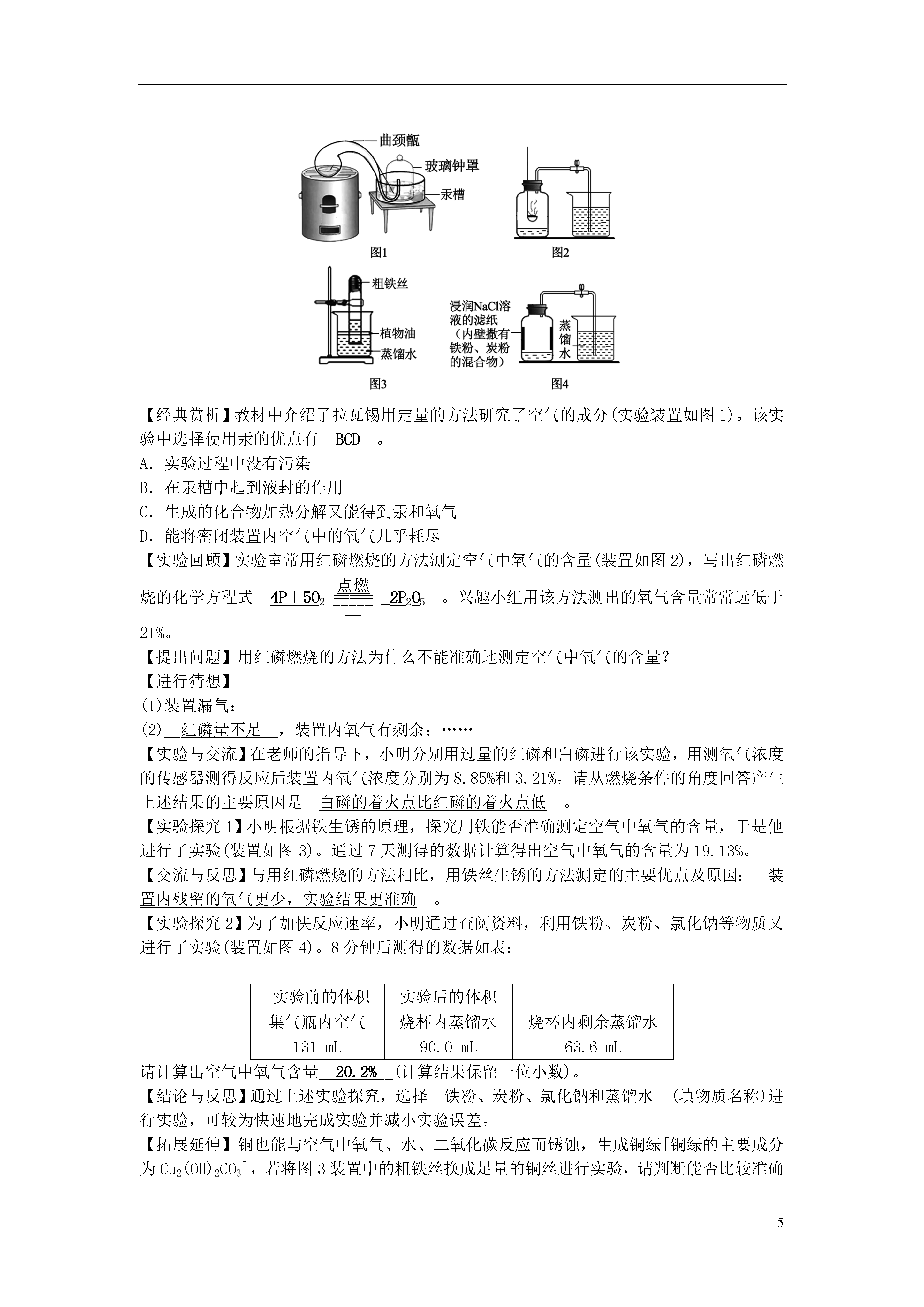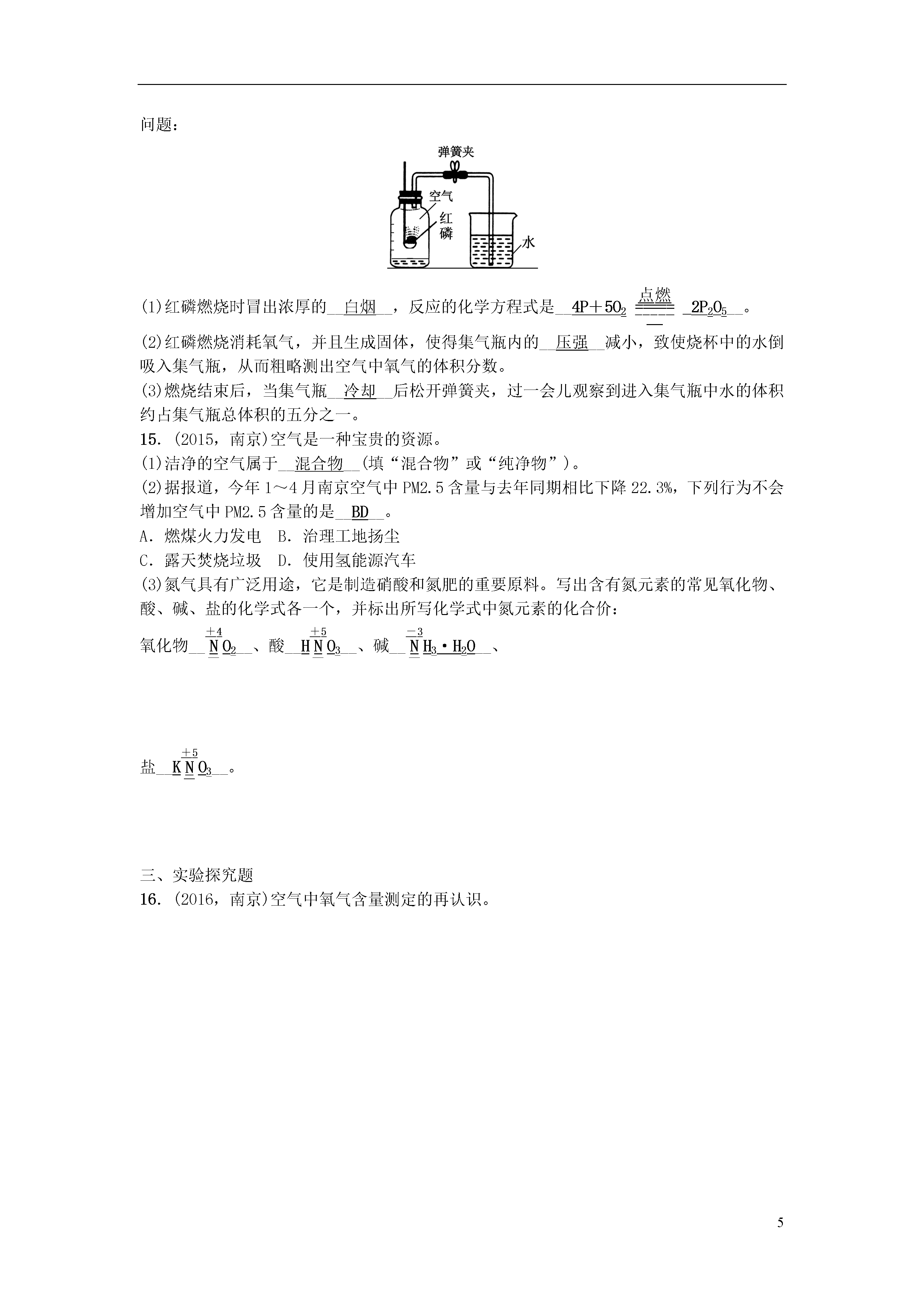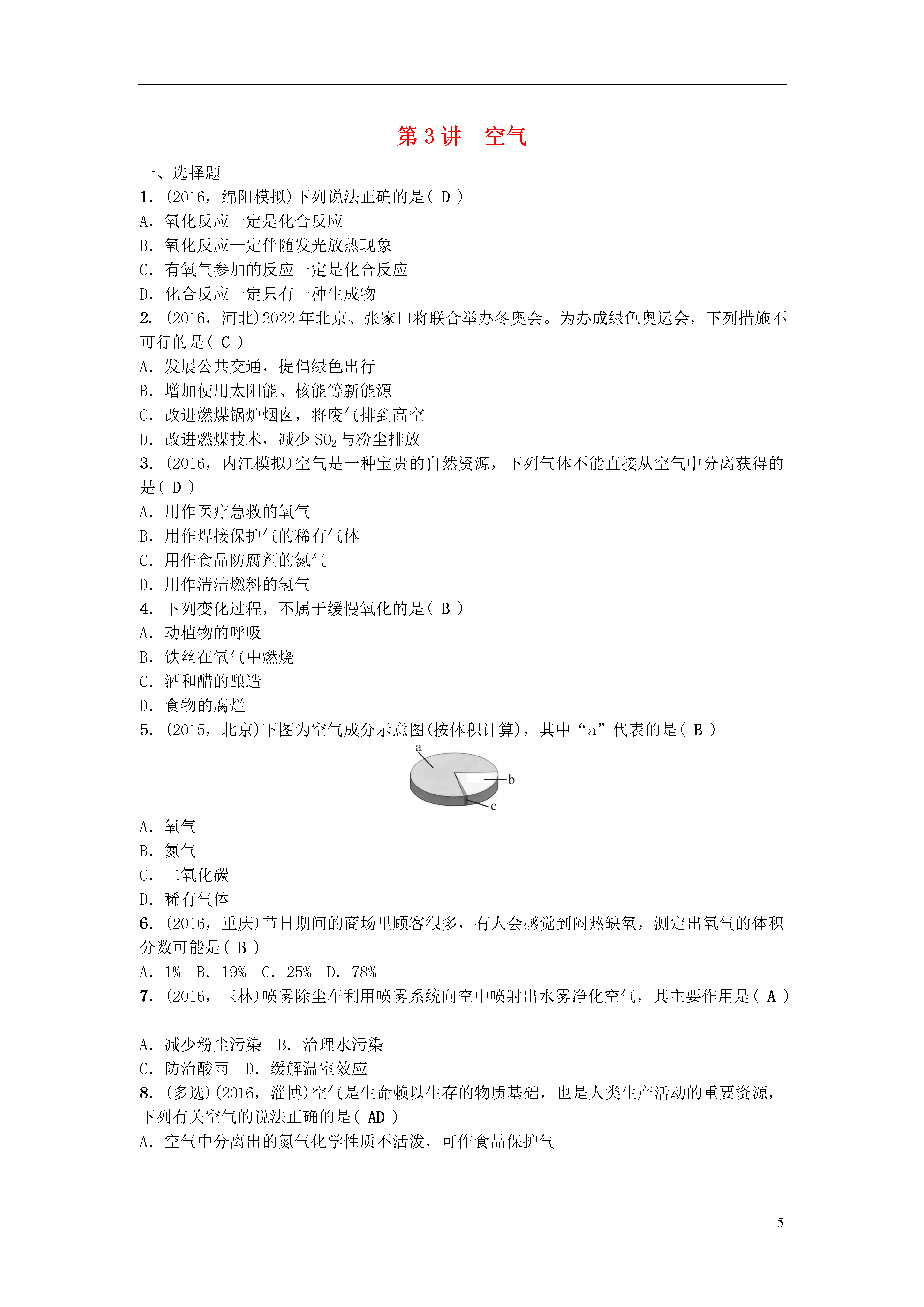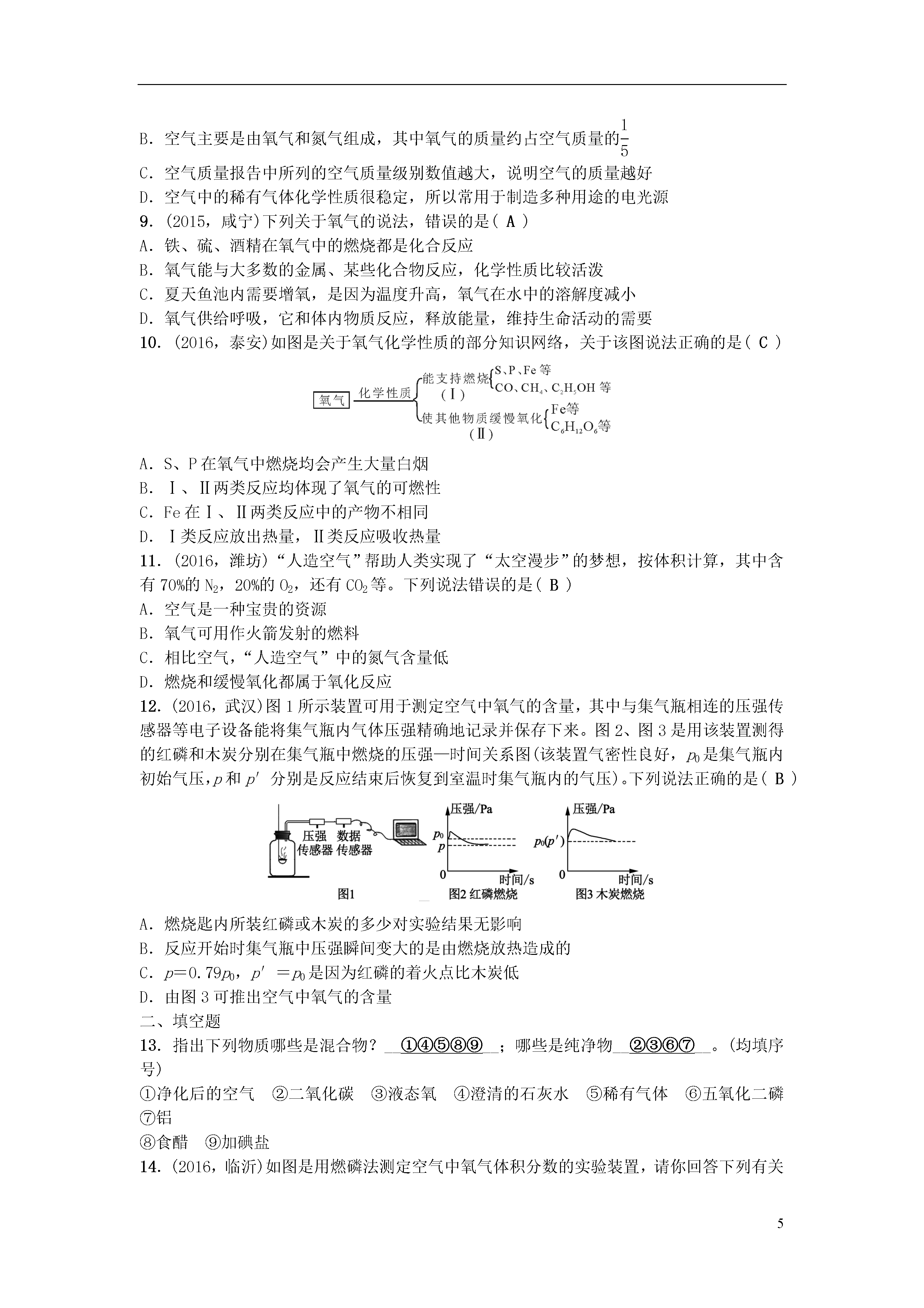 5第3讲空气一、选择题1.(2016,绵阳模拟)下列说法正确的是(D)A.氧化反应一定是化合反应B.氧化反应一定伴随发光放热现象C.有氧气参加的反应一定是化合反应D.化合反应一定只有一种生成物2.(2016,河北)2022年北京、张家口将联合举办冬奥会。为办成绿色奥运会,下列措施不可行的是(C)A.发展公共交通,提倡绿色出行B.增加使用太阳能、核能等新能源C.改进燃煤锅炉烟囱,将废气排到高空D.改进燃煤技术,减少SO2与粉尘排放3.(2016,内江模拟)空气是一种宝贵的自然资源,下列气体不能直接从空气中分离获得的是(D)A.用作医疗急救的氧气B.用作焊接保护气的稀有气体C.用作食品防腐剂的氮气D.用作清洁燃料的氢气4.下列变化过程,不属于缓慢氧化的是(B)A.动植物的呼吸B.铁丝在氧气中燃烧C.酒和醋的酿造D.食物的腐烂5.(2015,北京)下图为空气成分示意图(按体积计算),其中“a”代表的是(B)A.氧气B.氮气C.二氧化碳D.稀有气体6.(2016,重庆)节日期间的商场里顾客很多,有人会感觉到闷热缺氧,测定出氧气的体积分数可能是(B)A.1%B.19%C.25%D.78%7.(2016,玉林)喷雾除尘车利用喷雾系统向空中喷射出水雾净化空气,其主要作用是(A)A.减少粉尘污染B.治理水污染C.防治酸雨D.缓解温室效应8.(多选)(2016,淄博)空气是生命赖以生存的物质基础,也是人类生产活动的重要资源,下列有关空气的说法正确的是(AD)A.空气中分离出的氮气化学性质不活泼,可作食品保护气B.空气主要是由氧气和氮气组成,其中氧气的质量约占空气质量的eq\f(1,5)C.空气质量报告中所列的空气质量级别数值越大,说明空气的质量越好D.空气中的稀有气体化学性质很稳定,所以常用于制造多种用途的电光源9.(2015,咸宁)下列关于氧气的说法,错误的是(A)A.铁、硫、酒精在氧气中的燃烧都是化合反应B.氧气能与大多数的金属、某些化合物反应,化学性质比较活泼C.夏天鱼池内需要增氧,是因为温度升高,氧气在水中的溶解度减小D.氧气供给呼吸,它和体内物质反应,释放能量,维持生命活动的需要10.(2016,泰安)如图是关于氧气化学性质的部分知识网络,关于该图说法正确的是(C)A.S、P在氧气中燃烧均会产生大量白烟B.Ⅰ、Ⅱ两类反应均体现了氧气的可燃性C.Fe在Ⅰ、Ⅱ两类反应中的产物不相同D.Ⅰ类反应放出热量,Ⅱ类反应吸收热量11.(2016,潍坊)“人造空气”帮助人类实现了“太空漫步”的梦想,按体积计算,其中含有70%的N2,20%的O2,还有CO2等。下列说法错误的是(B)A.空气是一种宝贵的资源B.氧气可用作火箭发射的燃料C.相比空气,“人造空气”中的氮气含量低D.燃烧和缓慢氧化都属于氧化反应12.(2016,武汉)图1所示装置可用于测定空气中氧气的含量,其中与集气瓶相连的压强传感器等电子设备能将集气瓶内气体压强精确地记录并保存下来。图2、图3是用该装置测得的红磷和木炭分别在集气瓶中燃烧的压强—时间关系图(该装置气密性良好,p0是集气瓶内初始气压,p和p′分别是反应结束后恢复到室温时集气瓶内的气压)。下列说法正确的是(B)A.燃烧匙内所装红磷或木炭的多少对实验结果无影响B.反应开始时集气瓶中压强瞬间变大的是由燃烧放热造成的C.p=0.79p0,p′=p0是因为红磷的着火点比木炭低D.由图3可推出空气中氧气的含量二、填空题13.指出下列物质哪些是混合物?__①④⑤⑧⑨__;哪些是纯净物__②③⑥⑦__。(均填序号)①净化后的空气②二氧化碳③液态氧④澄清的石灰水⑤稀有气体⑥五氧化二磷⑦铝⑧食醋⑨加碘盐14.(2016,临沂)如图是用燃磷法测定空气中氧气体积分数的实验装置,请你回答下列有关问题:(1)红磷燃烧时冒出浓厚的__白烟__,反应的化学方程式是__4P+5O2eq\o(=====,\s\up7(点燃))_2P2O5__。(2)红磷燃烧消耗氧气,并且生成固体,使得集气瓶内的__压强__减小,致使烧杯中的水倒吸入集气瓶,从而粗略测出空气中氧气的体积分数。(3)燃烧结束后,当集气瓶__冷却__后松开弹簧夹,过一会儿观察到进入集气瓶中水的体积约占集气瓶总体积的五分之一。15.(2015,南京)空气是一种宝贵的资源。(1)洁净的空气属于__混合物__(填“混合物”或“纯净物”)。(2)据报道,今年1~4月南京空气中PM2.5含量与去年同期相比下降22.3%,下列行为不会增加空气中PM2.5含量的是__BD__。A.燃煤火力发电B.治理工地扬尘C.露天焚烧垃圾D.使用氢能源汽车