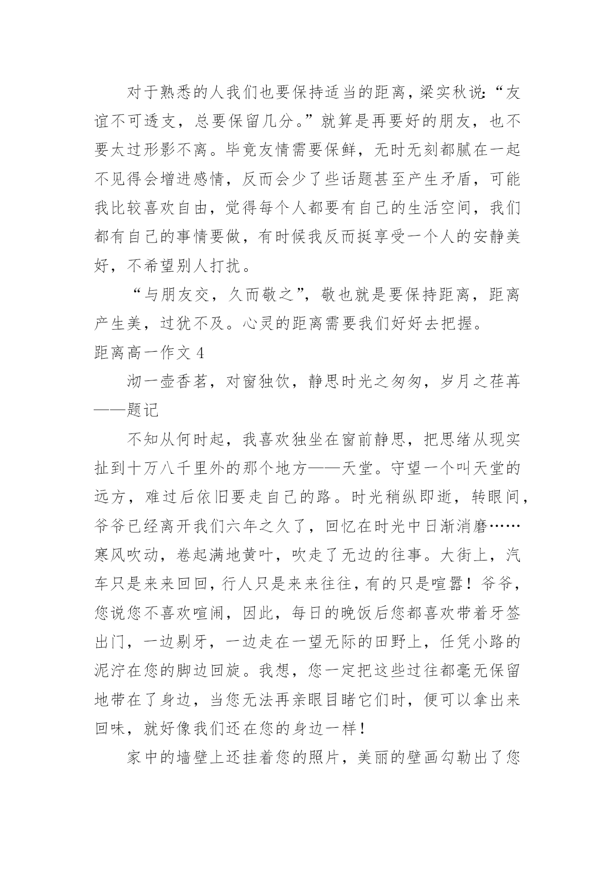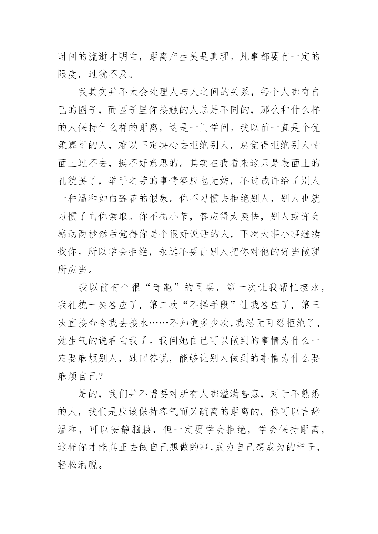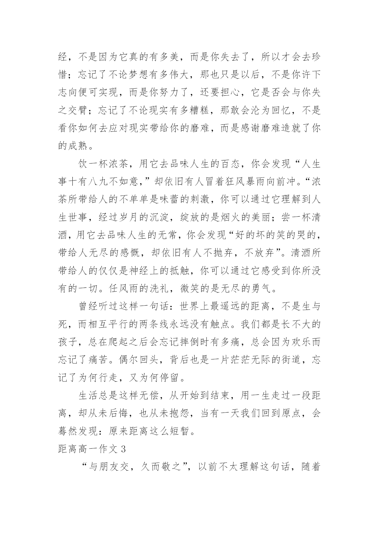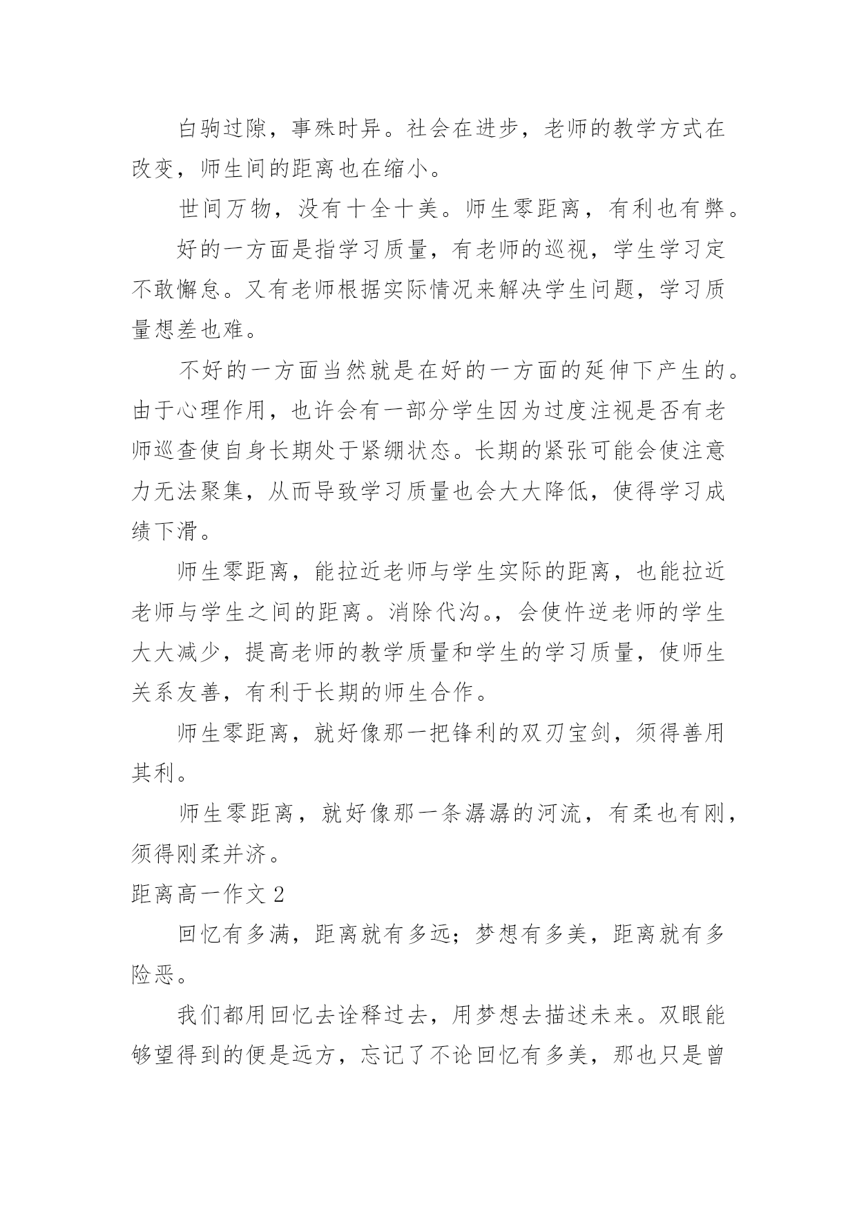 距离高一作文 距离高一作文15篇在日常学习、工作或生活中,大家都尝试过写作文吧,作文是由文字组成,经过人的思想考虑,通过语言组织来表达一个主题意义的文体。为了让您在写作文时更加简单方便,下面是小编为大家整理的距离高一作文,欢迎大家借鉴与参考,希望对大家有所帮助。距离高一作文1老师是骄阳下的那一缕清风,驱走了盛夏的那一抹燥热;老师是黑暗里的那一片繁星,照亮了夜空也照亮了大地;老师是街道上的一块路牌,指点了在现实中迷惘的我。古时,学生在私塾上课,对老师要毕恭毕敬。遇到疑难,学生要弯腰、侧身、俯耳,认真听讲,被老师责备也须虚心接受,不可逾越师长。曾经,老师和学生只有一墙之隔。老师奋力批改作业之时,学生就在大声地朗读课文,上课时,老师一般不会来教室外查探“军情”。不论发生什么事,老师就在隔壁,几步之遥。现在,老师和学生零距离。老师会在上课时,在教室外观察情况,看看有没有违规违纪,看看每位学生的表现如何。然后,再根据眼见为实的情况制定相应的措施。力求改变现状做到最好。白驹过隙,事殊时异。社会在进步,老师的教学方式在改变,师生间的距离也在缩小。世间万物,没有十全十美。师生零距离,有利也有弊。好的一方面是指学习质量,有老师的巡视,学生学习定不敢懈怠。又有老师根据实际情况来解决学生问题,学习质量想差也难。不好的一方面当然就是在好的一方面的延伸下产生的。由于心理作用,也许会有一部分学生因为过度注视是否有老师巡查使自身长期处于紧绷状态。长期的紧张可能会使注意力无法聚集,从而导致学习质量也会大大降低,使得学习成绩下滑。师生零距离,能拉近老师与学生实际的距离,也能拉近老师与学生之间的距离。消除代沟。,会使忤逆老师的学生大大减少,提高老师的教学质量和学生的学习质量,使师生关系友善,有利于长期的师生合作。师生零距离,就好像那一把锋利的双刃宝剑,须得善用其利。师生零距离,就好像那一条潺潺的河流,有柔也有刚,须得刚柔并济。距离高一作文2回忆有多满,距离就有多远;梦想有多美,距离就有多险恶。我们都用回忆去诠释过去,用梦想去描述未来。双眼能够望得到的便是远方,忘记了不论回忆有多美,那也只是曾经,不是因为它真的有多美,而是你失去了,所以才会去珍惜;忘记了不论梦想有多伟大,那也只是以后,不是你许下志向便可实现,而是你努力了,还要担心,它是否会与你失之交臂;忘记了不论现实有多糟糕,那敢会沦为回忆,不是看你如何去应对现实带给你的磨难,而是感谢磨难造就了你的成熟。饮一杯浓茶,用它去品味人生的百态,你会发现“人生事十有八九不如意,”却依旧有人冒着狂风暴雨向前冲。“浓茶所带给人的不单单是味蕾的刺激,你可以通过它理解到人生世事,经过岁月的沉淀,绽放的是烟火的美丽;尝一杯清酒,用它去品味人生的无常,你会发现“好的坏的笑的哭的,带给人无尽的感慨,却依旧有人不抛弃,不放弃”。清酒所带给人的仅仅是神经上的抵触,你可以通过它感受到你所没有的一切。任风雨的洗礼,微笑的是无尽的勇气。曾经听过这样一句话:世界上最遥远的距离,不是生与死,而相互平行的两条线永远没有触点。我们都是长不大的孩子,总在爬起之后会忘记摔倒时有多痛,总会因为欢乐而忘记了痛苦。偶尔回头,背后也是一片茫茫无际的街道,忘记了为何行走,又为何停留。生活总是这样无偿,从开始到结束,用一生走过一段距离,却从未后悔,也从未抱怨,当有一天我们回到原点,会蓦然发现:原来距离这么短暂。距离高一作文3“与朋友交,久而敬之”,以前不太理解这句话,随着时间的流逝才明白,距离产生美是真理。凡事都要有一定的限度,过犹不及。我其实并不太会处理人与人之间的关系,每个人都有自己的圈子,而圈子里你接触的人总是不同的,那么和什么样的人保持什么样的距离,这是一门学问。我以前一直是个优柔寡断的人,难以下定决心去拒绝别人,总觉得拒绝别人情面上过不去,挺不好意思的。其实在我看来这只是表面上的礼貌罢了,举手之劳的事情答应也无妨,不过或许给了别人一种温和如白莲花的假象。你不习惯去拒绝别人,别人也就习惯了向你索取。你不拘小节,答应得太爽快,别人或许会感动两秒然后觉得你是个很好说话的人,下次大事小事继续找你。所以学会拒绝,永远不要让别人把你对他的好当做理所应当。我以前有个很“奇葩”的同桌,第一次让我帮忙接水,我礼貌一笑答应了,第二次“不择手段”让我答应了,第三次直接命令我去接水……不知道多少次,我忍无可忍拒绝了,她生气的说看白我了。我问她自己可以做到的事情为什么一定要麻烦别人,她回答说,能够让别人做到的事情为什么要麻烦自己?是的,我们并不需要对所有人都溢满善意,对于不熟悉的人,我们是应该保持客气而又疏离的距离的。你可以言辞温和,可以安静腼腆,但一定要学会拒绝,学会保持距离,这样你才能真正去做自己想做的事,成为自己想成为的样子,轻松洒脱。对于熟悉的人我们也要保持适当的距离,梁实