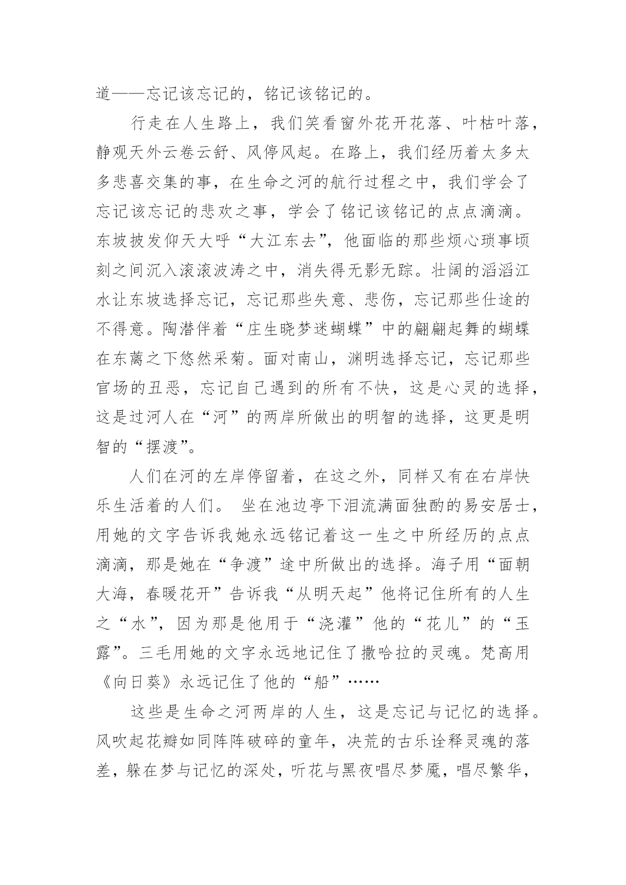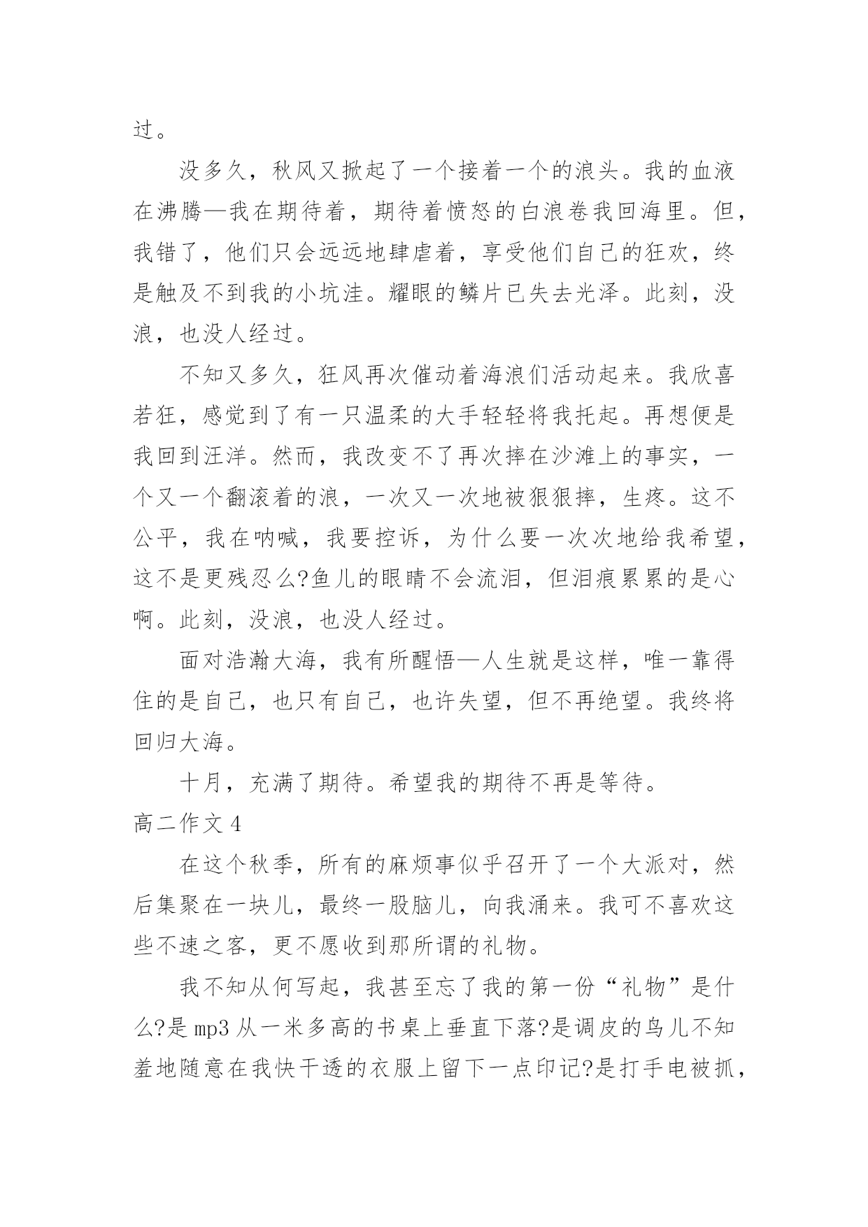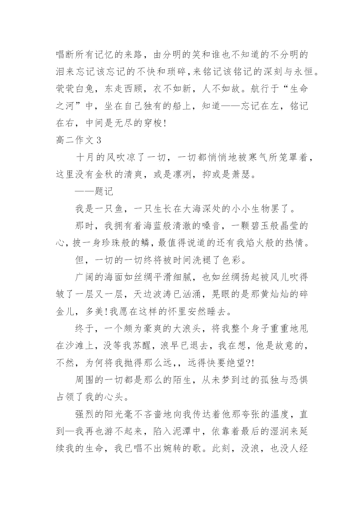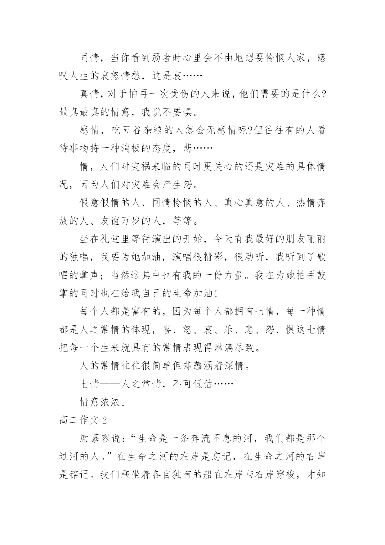 高二作文 高二作文高二作文1人有七情,哪七情可以表达出来?常情。爱情,人最需要的一种情,在它的世界里可以感受到温暖,还有被爱的美好。喜!友情,每个生存在这个地球上的人、事、物都需要它,水、树、草、鸟等都离不开它。乐!亲情,谁离得开它呢?不可能,亲情是最伟大最真挚的情感抒发,所以它是乐!热情,人需要感情来完成某种目的到达最终彼岸,它给人温暖和力量,它是喜!“下课了,中午吃什么?”小悦说。疲倦的小文勉强说了一句:“我好累哦,不吃了,你吃吧!”小悦走了。但当小文刚进入梦乡时,她又回来给小文盖上一件衣服并关上窗户然后走了。小文感受到了这一幕所以由衷地在心里说了一句:“谢谢你,小悦,你是我最好的朋友。”友情,人之常情,为了友谊可以放弃很多。为了朋友两肋插刀也在所不惜,为了兄弟或姐妹上刀山下火海也绝不低头说“NO”,这就是常情,人最深刻最明白的表达七情的常情——友情。假情,如果别人对你假情假意,虚有虚无地使你的心情混乱,这是什么情——怒……同情,当你看到弱者时心里会不由地想要怜悯人家,感叹人生的哀怒情愁,这是哀……真情,对于怕再一次受伤的人来说,他们需要的是什么?最真最真的情意,我说不要惧。感情,吃五谷杂粮的人怎会无感情呢?但往往有的人看待事物持一种消极的态度,悲……情,人们对灾祸来临的同时更关心的还是灾难的具体情况,因为人们对灾难会产生怨。假意假情的人、同情怜悯的人、真心真意的人、热情奔放的人、友谊万岁的人,等等。坐在礼堂里等待演出的开始,今天有我最好的朋友丽丽的独唱,我要为她加油,演唱很精彩,很动听,我听到了歌唱的掌声;当然这其中也有我的一份力量。我在为她拍手鼓掌的同时也在给我自己的生命加油!每个人都是富有的,因为每个人都拥有七情,每一种情都是人之常情的体现,喜、怒、哀、乐、悲、怨、惧这七情把每一个生来就具有的常情表现得淋漓尽致。人的常情往往很简单但却蕴涵着深情。七情——人之常情,不可低估……情意浓浓。高二作文2席慕容说:“生命是一条奔流不息的河,我们都是那个过河的人。”在生命之河的左岸是忘记,在生命之河的右岸是铭记。我们乘坐着各自独有的船在左岸与右岸穿梭,才知道——忘记该忘记的,铭记该铭记的。行走在人生路上,我们笑看窗外花开花落、叶枯叶落,静观天外云卷云舒、风停风起。在路上,我们经历着太多太多悲喜交集的事,在生命之河的航行过程之中,我们学会了忘记该忘记的悲欢之事,学会了铭记该铭记的点点滴滴。东坡披发仰天大呼“大江东去”,他面临的那些烦心琐事顷刻之间沉入滚滚波涛之中,消失得无影无踪。壮阔的滔滔江水让东坡选择忘记,忘记那些失意、悲伤,忘记那些仕途的不得意。陶潜伴着“庄生晓梦迷蝴蝶”中的翩翩起舞的蝴蝶在东蓠之下悠然采菊。面对南山,渊明选择忘记,忘记那些官场的丑恶,忘记自己遇到的所有不快,这是心灵的选择,这是过河人在“河”的两岸所做出的明智的选择,这更是明智的“摆渡”。人们在河的左岸停留着,在这之外,同样又有在右岸快乐生活着的人们。坐在池边亭下泪流满面独酌的易安居士,用她的文字告诉我她永远铭记着这一生之中所经历的点点滴滴,那是她在“争渡”途中所做出的选择。海子用“面朝大海,春暖花开”告诉我“从明天起”他将记住所有的人生之“水”,因为那是他用于“浇灌”他的“花儿”的“玉露”。三毛用她的文字永远地记住了撒哈拉的灵魂。梵高用《向日葵》永远记住了他的“船”……这些是生命之河两岸的人生,这是忘记与记忆的选择。风吹起花瓣如同阵阵破碎的童年,决荒的古乐诠释灵魂的落差,躲在梦与记忆的深处,听花与黑夜唱尽梦魇,唱尽繁华,唱断所有记忆的来路,由分明的笑和谁也不知道的不分明的泪来忘记该忘记的不快和琐碎,来铭记该铭记的深刻与永恒。茕茕白兔,东走西顾,衣不如新,人不如故。航行于“生命之河”中,坐在自己独有的船上,知道——忘记在左,铭记在右,中间是无尽的穿梭!高二作文3十月的风吹凉了一切,一切都悄悄地被寒气所笼罩着,这里没有金秋的清爽,或是凛冽,抑或是萧瑟。——题记我是一只鱼,一只生长在大海深处的小小生物罢了。那时,我拥有着海蓝般清澈的嗓音,一颗碧玉般晶莹的心,披一身珍珠般的鳞,最值得说道的还有我焰火般的热情。但,一切的一切终将被时间洗褪了色彩。广阔的海面如丝绸平滑细腻,也如丝绸扬起被风儿吹得皱了一层又一层,天边波涛已汹涌,晃眼的是那黄灿灿的碎金儿,多美!我愿在这样的怀里安然睡去。终于,一个颇为豪爽的大浪头,将我整个身子重重地甩在沙滩上,没等我苏醒,浪早已退去,我在想,他是故意的,不然,为何将我抛得那么远,,远得快要绝望?!周围的一切都是那么的陌生,从未梦到过的孤独与恐惧占领了我的心头。强烈的阳光毫不吝啬地向我传达着他那夸张的温度,直到—我再也游不起来,陷入泥潭中,依靠着最后的湿润来延续我的生命,我已唱不出婉转的歌。此刻,没浪,也没人经过。没多久,秋风又掀起了一个接