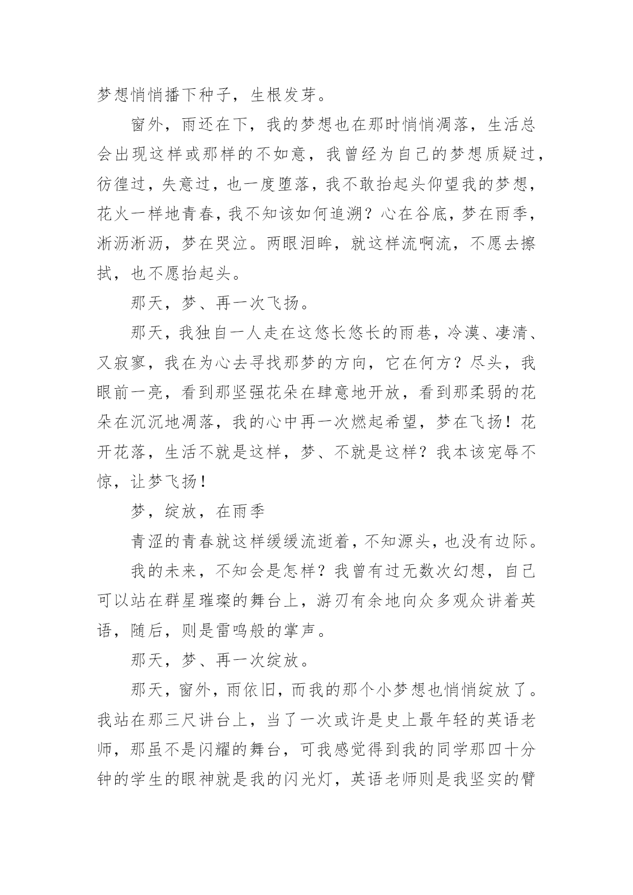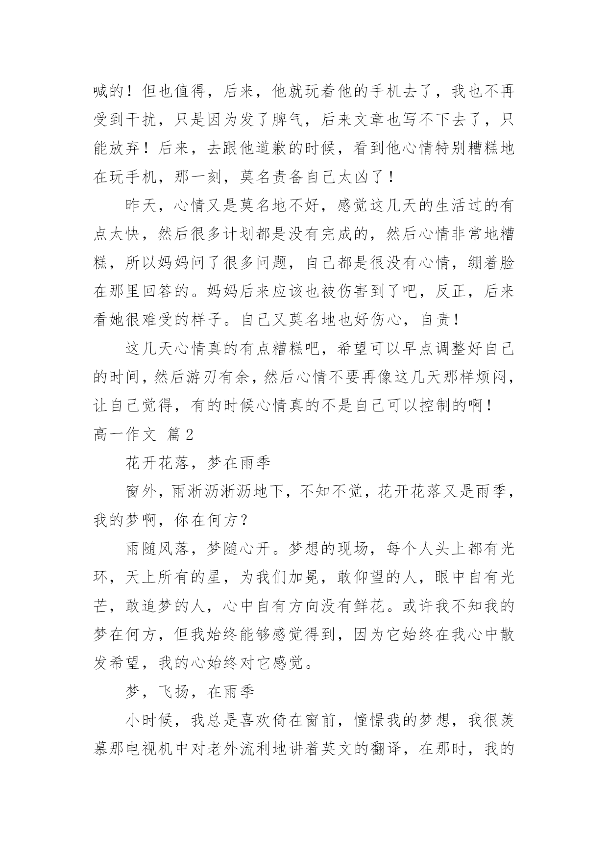 高一作文 高一作文十篇在平平淡淡的日常中,大家对作文都再熟悉不过了吧,作文根据写作时限的不同可以分为限时作文和非限时作文。你写作文时总是无从下笔?下面是小编整理的高一作文10篇,仅供参考,希望能够帮助到大家。高一作文篇1实话说,最近过的有点小糟糕。第一次感觉到,时间是不够的,之前只是单纯的觉得,时间过得有点快,但最近,觉得时间是不够的,竟然觉得心情有点小暴躁!~前天对着弟弟发了火。弟弟好不容易写了十块钱,于是提了现,后来他总是问我很多很多关于淘宝的问题,关于他要买的玩具的问题,问了快递的问题。然后我都耐心地跟他说。后来我还跟他说,我要写文章了,那天要写素材文,然后很好声好气地跟他说,我要写文章了,是不可以打扰的哦!他好像是没用听进去,于是又总是来问我很多很多的问题,我也一一解答了,后来有一个问题他问了好几遍,我不再说话,只是轻轻地嘘了一声,但他还是一直在旁边叽叽喳喳,那个时候,他的问题对于我来说就是干扰,他的声音就是噪音,终于,没有安耐住脾气,大声冲他喊:“不要吵!”他被吓到了,在那里一愣!其实我冲他喊的时候,他是退了好几步的,然后再满脸惊愕地盯着我。马上意识到是我错了,不该这么大声地冲他喊的!但也值得,后来,他就玩着他的手机去了,我也不再受到干扰,只是因为发了脾气,后来文章也写不下去了,只能放弃!后来,去跟他道歉的时候,看到他心情特别糟糕地在玩手机,那一刻,莫名责备自己太凶了!昨天,心情又是莫名地不好,感觉这几天的生活过的有点太快,然后很多计划都是没有完成的,然后心情非常地糟糕,所以妈妈问了很多问题,自己都是很没有心情,绷着脸在那里回答的。妈妈后来应该也被伤害到了吧,反正,后来看她很难受的样子。自己又莫名地也好伤心,自责!这几天心情真的有点糟糕吧,希望可以早点调整好自己的时间,然后游刃有余,然后心情不要再像这几天那样烦闷,让自己觉得,有的时候心情真的不是自己可以控制的啊!高一作文篇2花开花落,梦在雨季窗外,雨淅沥淅沥地下,不知不觉,花开花落又是雨季,我的梦啊,你在何方?雨随风落,梦随心开。梦想的现场,每个人头上都有光环,天上所有的星,为我们加冕,敢仰望的人,眼中自有光芒,敢追梦的人,心中自有方向没有鲜花。或许我不知我的梦在何方,但我始终能够感觉得到,因为它始终在我心中散发希望,我的心始终对它感觉。梦,飞扬,在雨季小时候,我总是喜欢倚在窗前,憧憬我的梦想,我很羡慕那电视机中对老外流利地讲着英文的翻译,在那时,我的梦想悄悄播下种子,生根发芽。窗外,雨还在下,我的梦想也在那时悄悄凋落,生活总会出现这样或那样的不如意,我曾经为自己的梦想质疑过,彷徨过,失意过,也一度堕落,我不敢抬起头仰望我的梦想,花火一样地青春,我不知该如何追溯?心在谷底,梦在雨季,淅沥淅沥,梦在哭泣。两眼泪眸,就这样流啊流,不愿去擦拭,也不愿抬起头。那天,梦、再一次飞扬。那天,我独自一人走在这悠长悠长的雨巷,冷漠、凄清、又寂寥,我在为心去寻找那梦的方向,它在何方?尽头,我眼前一亮,看到那坚强花朵在肆意地开放,看到那柔弱的花朵在沉沉地凋落,我的心中再一次燃起希望,梦在飞扬!花开花落,生活不就是这样,梦、不就是这样?我本该宠辱不惊,让梦飞扬!梦,绽放,在雨季青涩的青春就这样缓缓流逝着,不知源头,也没有边际。我的未来,不知会是怎样?我曾有过无数次幻想,自己可以站在群星璀璨的舞台上,游刃有余地向众多观众讲着英语,随后,则是雷鸣般的掌声。那天,梦、再一次绽放。那天,窗外,雨依旧,而我的那个小梦想也悄悄绽放了。我站在那三尺讲台上,当了一次或许是史上最年轻的英语老师,那虽不是闪耀的舞台,可我感觉得到我的同学那四十分钟的学生的眼神就是我的闪光灯,英语老师则是我坚实的臂膀,让我把梦绽放!没有鲜花,我的也依旧璀璨;拥有掌声,我的梦如花绽放!初夏,雨在下,花开,花也落,梦在心中,梦在雨季。每一天,每一秒,我都走在梦的路上,或喜悦,或茫然,或失意,或堕落,或感动,但无论如何,我从未放弃我的梦想,也从未终止梦的脚步,我可以流泪,但我不能颓废!20xx年的六月会是我圆梦的季节,那年的高考,我在追随你的路上,你可曾感知?我有些胆怯,你能否带给我勇气?那是雨季,花也曾开,花也曾落,我的梦,我在坚守,也在奋斗,雨季过后的彩虹,可否与我邂逅?花开花落,我的梦,你在雨季!高一作文篇3生命地降生,旅程的开始,自由的飞翔,勇敢的面对,睁开双眼,眼前感动的一幕幕不断的浮现,需有理由,还是等待结果。林间的一刹那,让我看懂了一切,树木的生长,花儿的凋谢,把它们看做我的化身,那就是需要生长,需要顶风冒雨,需要严寒酷暑的考验。心灵触动的一刻,貌似的看懂了.........生命在于奋斗,就像林间的树木一样,需要自身不断的从土壤中吸取营养来维持自身的生命,生命在降生的那一刻起,上天就赋予你的一生要为自己的生活为之而奋
