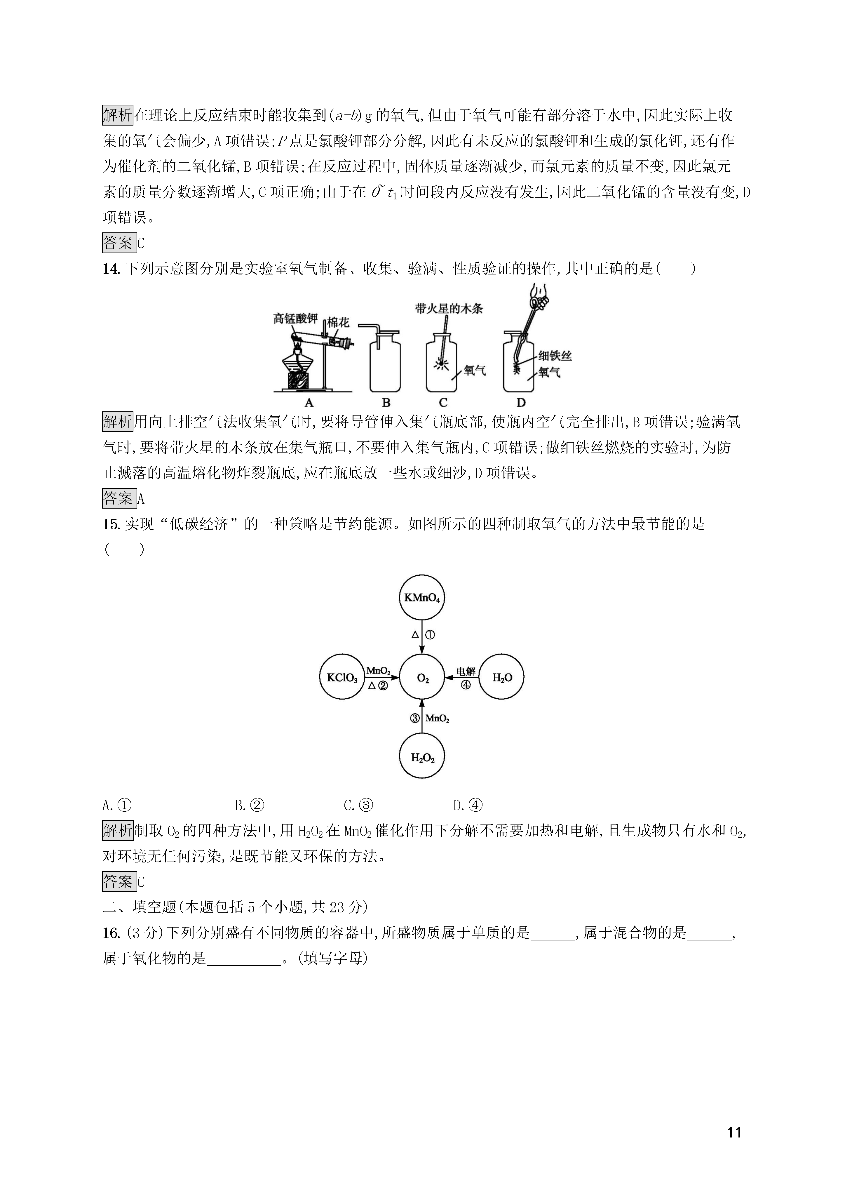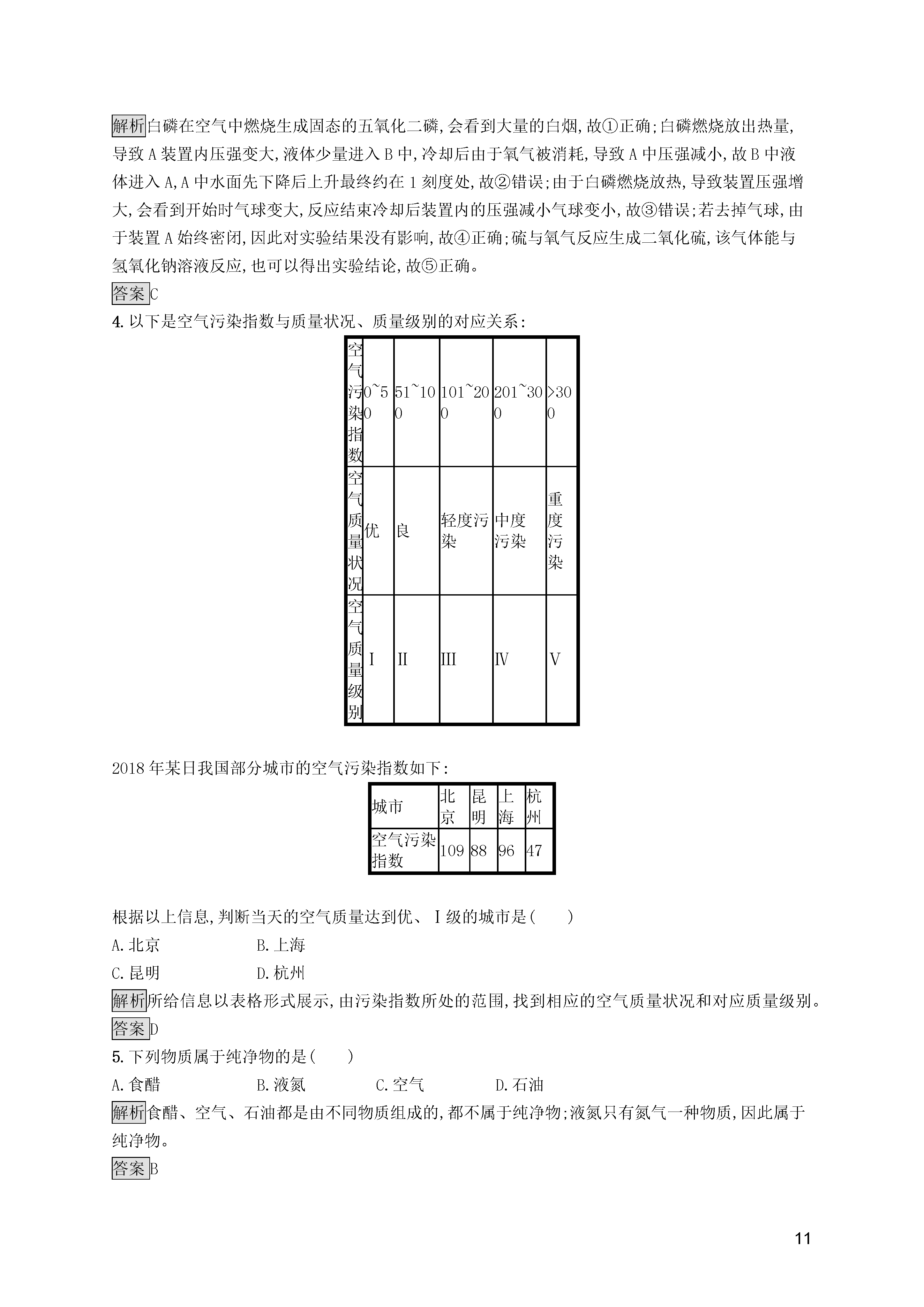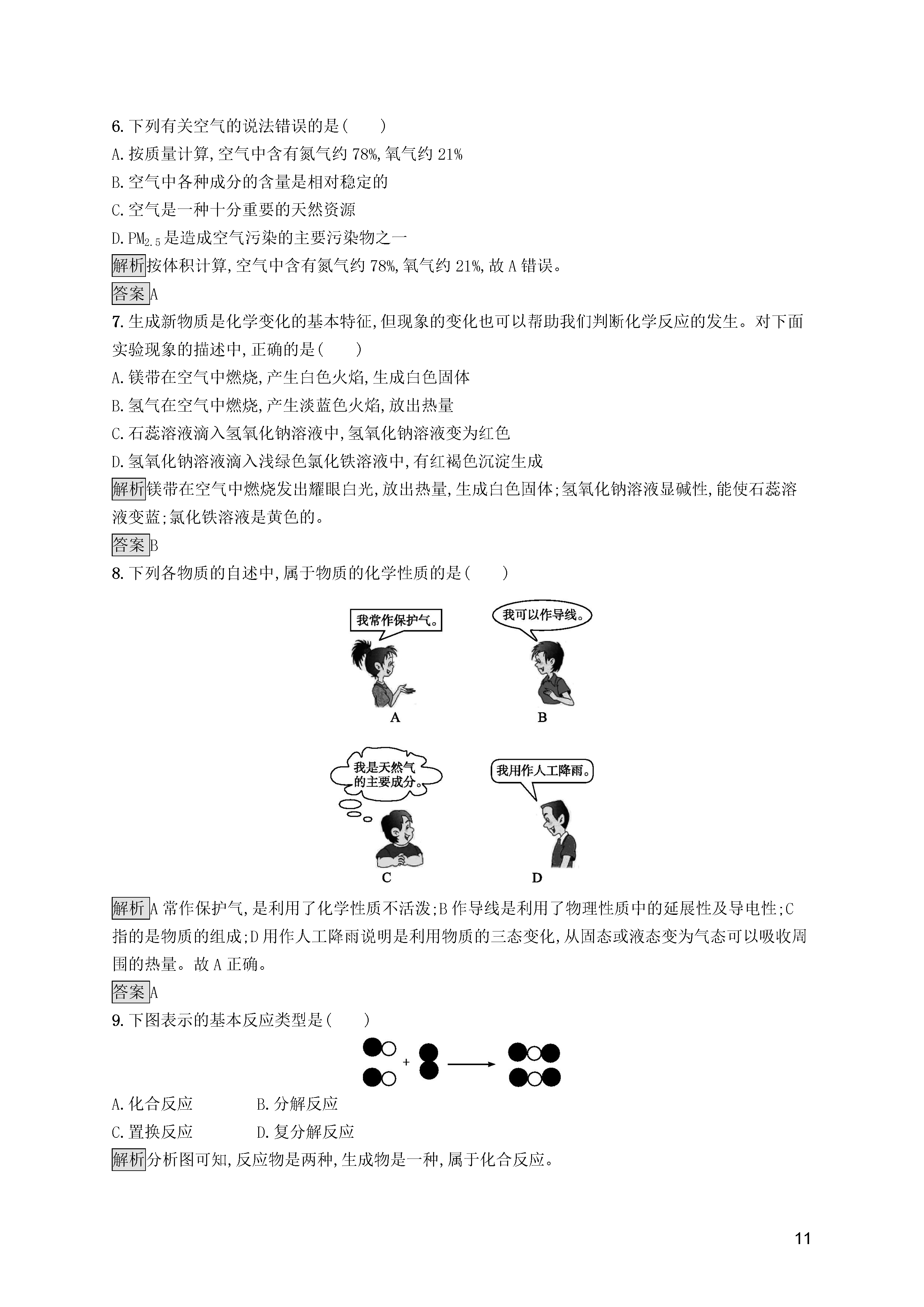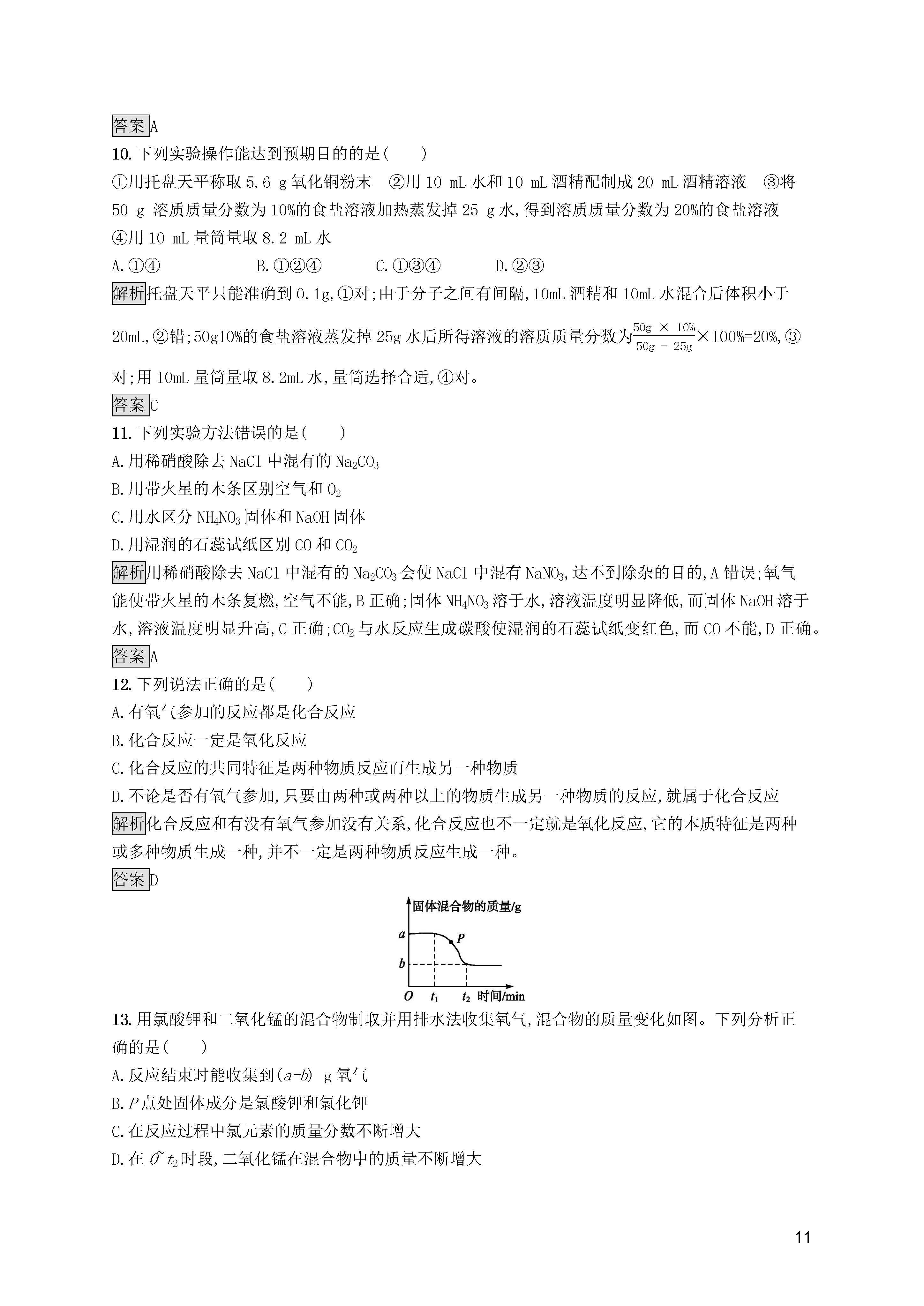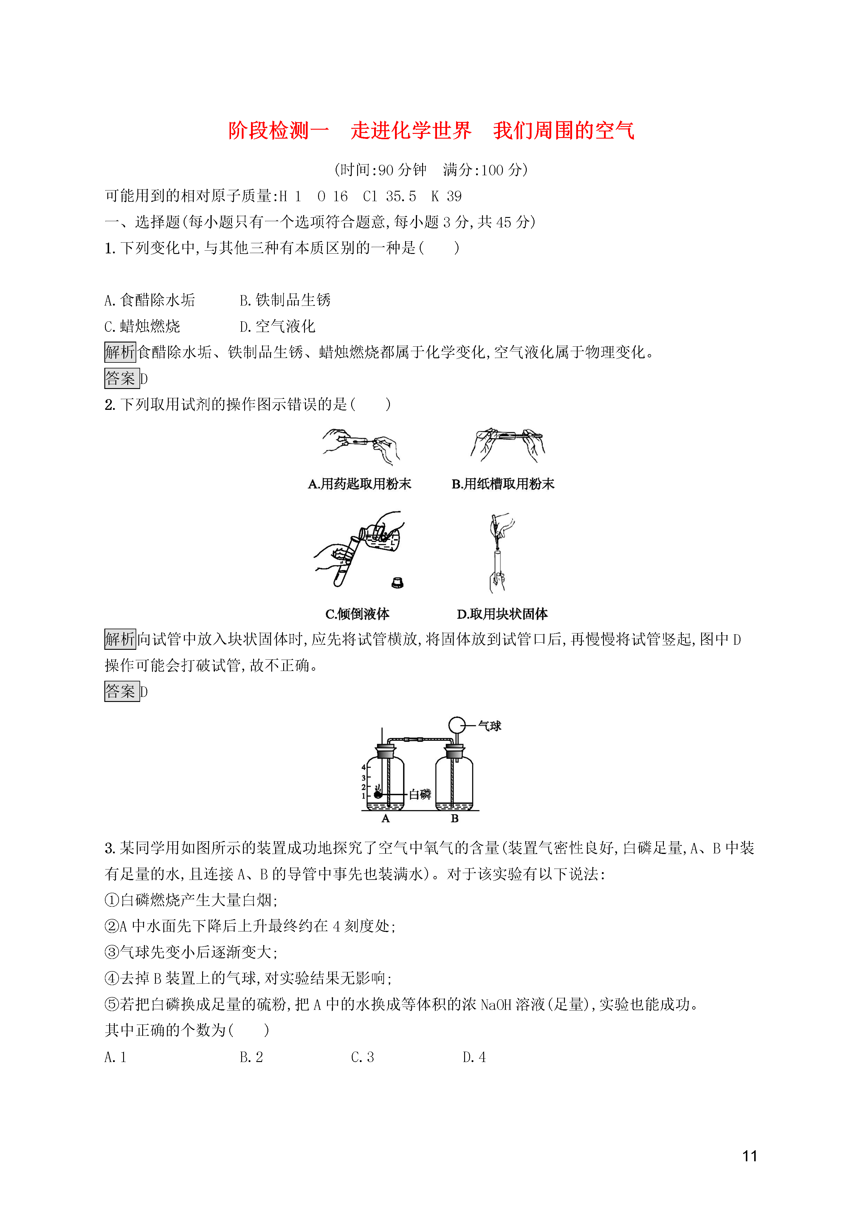 11阶段检测一走进化学世界我们周围的空气(时间:90分钟满分:100分)可能用到的相对原子质量:H1O16Cl35.5K39一、选择题(每小题只有一个选项符合题意,每小题3分,共45分)1.下列变化中,与其他三种有本质区别的一种是()A.食醋除水垢B.铁制品生锈C.蜡烛燃烧D.空气液化解析食醋除水垢、铁制品生锈、蜡烛燃烧都属于化学变化,空气液化属于物理变化。答案D2.下列取用试剂的操作图示错误的是()解析向试管中放入块状固体时,应先将试管横放,将固体放到试管口后,再慢慢将试管竖起,图中D操作可能会打破试管,故不正确。答案D3.某同学用如图所示的装置成功地探究了空气中氧气的含量(装置气密性良好,白磷足量,A、B中装有足量的水,且连接A、B的导管中事先也装满水)。对于该实验有以下说法:①白磷燃烧产生大量白烟;②A中水面先下降后上升最终约在4刻度处;③气球先变小后逐渐变大;④去掉B装置上的气球,对实验结果无影响;⑤若把白磷换成足量的硫粉,把A中的水换成等体积的浓NaOH溶液(足量),实验也能成功。其中正确的个数为()A.1B.2C.3D.4解析白磷在空气中燃烧生成固态的五氧化二磷,会看到大量的白烟,故①正确;白磷燃烧放出热量,导致A装置内压强变大,液体少量进入B中,冷却后由于氧气被消耗,导致A中压强减小,故B中液体进入A,A中水面先下降后上升最终约在1刻度处,故②错误;由于白磷燃烧放热,导致装置压强增大,会看到开始时气球变大,反应结束冷却后装置内的压强减小气球变小,故③错误;若去掉气球,由于装置A始终密闭,因此对实验结果没有影响,故④正确;硫与氧气反应生成二氧化硫,该气体能与氢氧化钠溶液反应,也可以得出实验结论,故⑤正确。答案C4.以下是空气污染指数与质量状况、质量级别的对应关系:空气污染指数0~5051~100101~200201~300>300空气质量状况优良轻度污染中度污染重度污染空气质量级别ⅠⅡⅢⅣⅤ2018年某日我国部分城市的空气污染指数如下:城市北京昆明上海杭州空气污染指数109889647根据以上信息,判断当天的空气质量达到优、Ⅰ级的城市是()A.北京B.上海C.昆明D.杭州解析所给信息以表格形式展示,由污染指数所处的范围,找到相应的空气质量状况和对应质量级别。答案D5.下列物质属于纯净物的是()A.食醋B.液氮C.空气D.石油解析食醋、空气、石油都是由不同物质组成的,都不属于纯净物;液氮只有氮气一种物质,因此属于纯净物。答案B6.下列有关空气的说法错误的是()A.按质量计算,空气中含有氮气约78%,氧气约21%B.空气中各种成分的含量是相对稳定的C.空气是一种十分重要的天然资源D.PM2.5是造成空气污染的主要污染物之一解析按体积计算,空气中含有氮气约78%,氧气约21%,故A错误。答案A7.生成新物质是化学变化的基本特征,但现象的变化也可以帮助我们判断化学反应的发生。对下面实验现象的描述中,正确的是()A.镁带在空气中燃烧,产生白色火焰,生成白色固体B.氢气在空气中燃烧,产生淡蓝色火焰,放出热量C.石蕊溶液滴入氢氧化钠溶液中,氢氧化钠溶液变为红色D.氢氧化钠溶液滴入浅绿色氯化铁溶液中,有红褐色沉淀生成解析镁带在空气中燃烧发出耀眼白光,放出热量,生成白色固体;氢氧化钠溶液显碱性,能使石蕊溶液变蓝;氯化铁溶液是黄色的。答案B8.下列各物质的自述中,属于物质的化学性质的是()解析A常作保护气,是利用了化学性质不活泼;B作导线是利用了物理性质中的延展性及导电性;C指的是物质的组成;D用作人工降雨说明是利用物质的三态变化,从固态或液态变为气态可以吸收周围的热量。故A正确。答案A9.下图表示的基本反应类型是()A.化合反应B.分解反应C.置换反应D.复分解反应解析分析图可知,反应物是两种,生成物是一种,属于化合反应。答案A10.下列实验操作能达到预期目的的是()①用托盘天平称取5.6g氧化铜粉末②用10mL水和10mL酒精配制成20mL酒精溶液③将50g溶质质量分数为10%的食盐溶液加热蒸发掉25g水,得到溶质质量分数为20%的食盐溶液④用10mL量筒量取8.2mL水A.①④B.①②④C.①③④D.②③解析托盘天平只能准确到0.1g,①对;由于分子之间有间隔,10mL酒精和10mL水混合后体积小于20mL,②错;50g10%的食盐溶液蒸发掉25g水后所得溶液的溶质质量分数为50g×10%50g-25g×100%=20%,③对;用10mL量筒量取8.2mL水,量筒选择合适,④对。答案C11.下列实验方法错误的是()A.用稀硝酸除去NaCl中混有的Na2CO3B.用带火星的木条