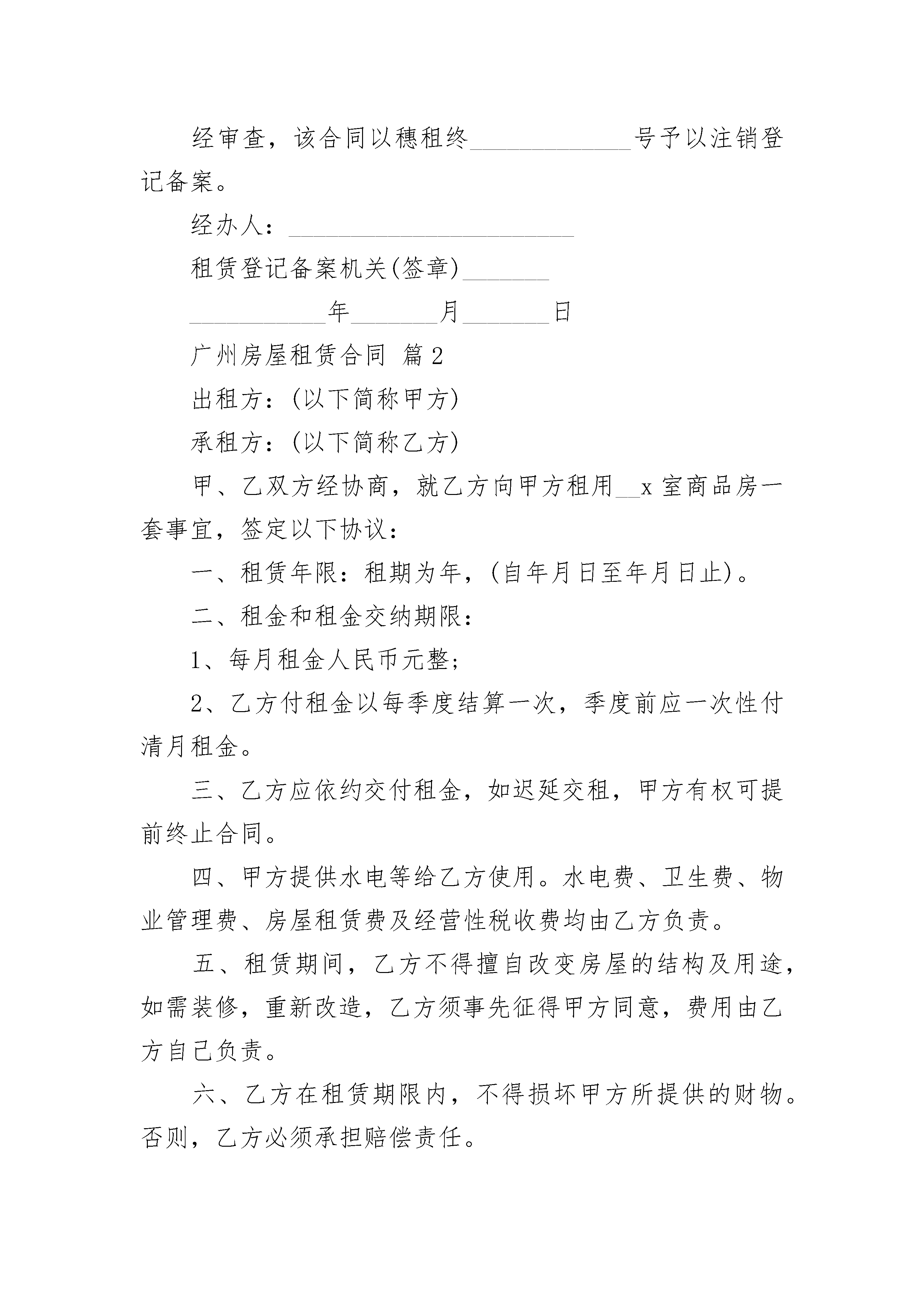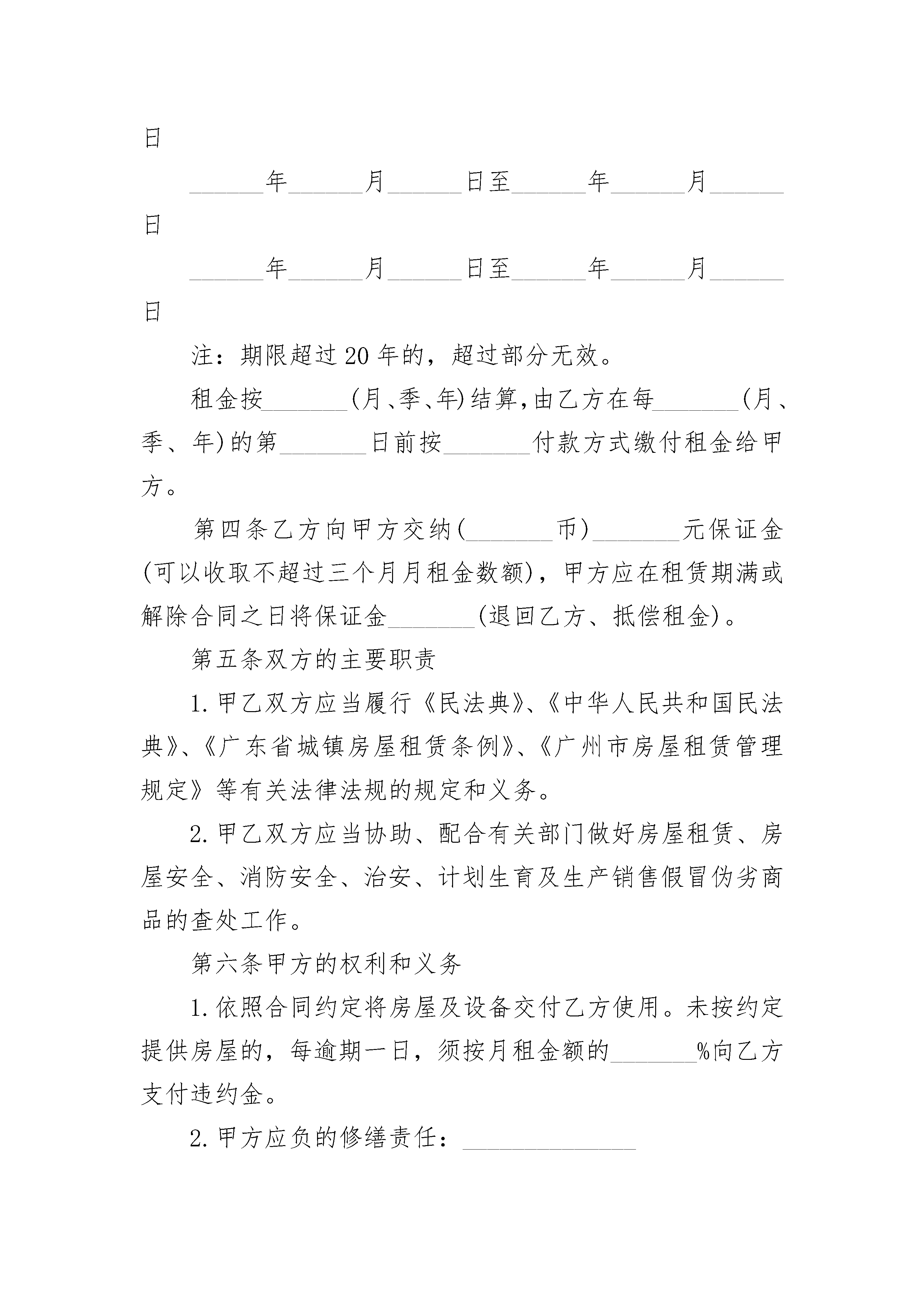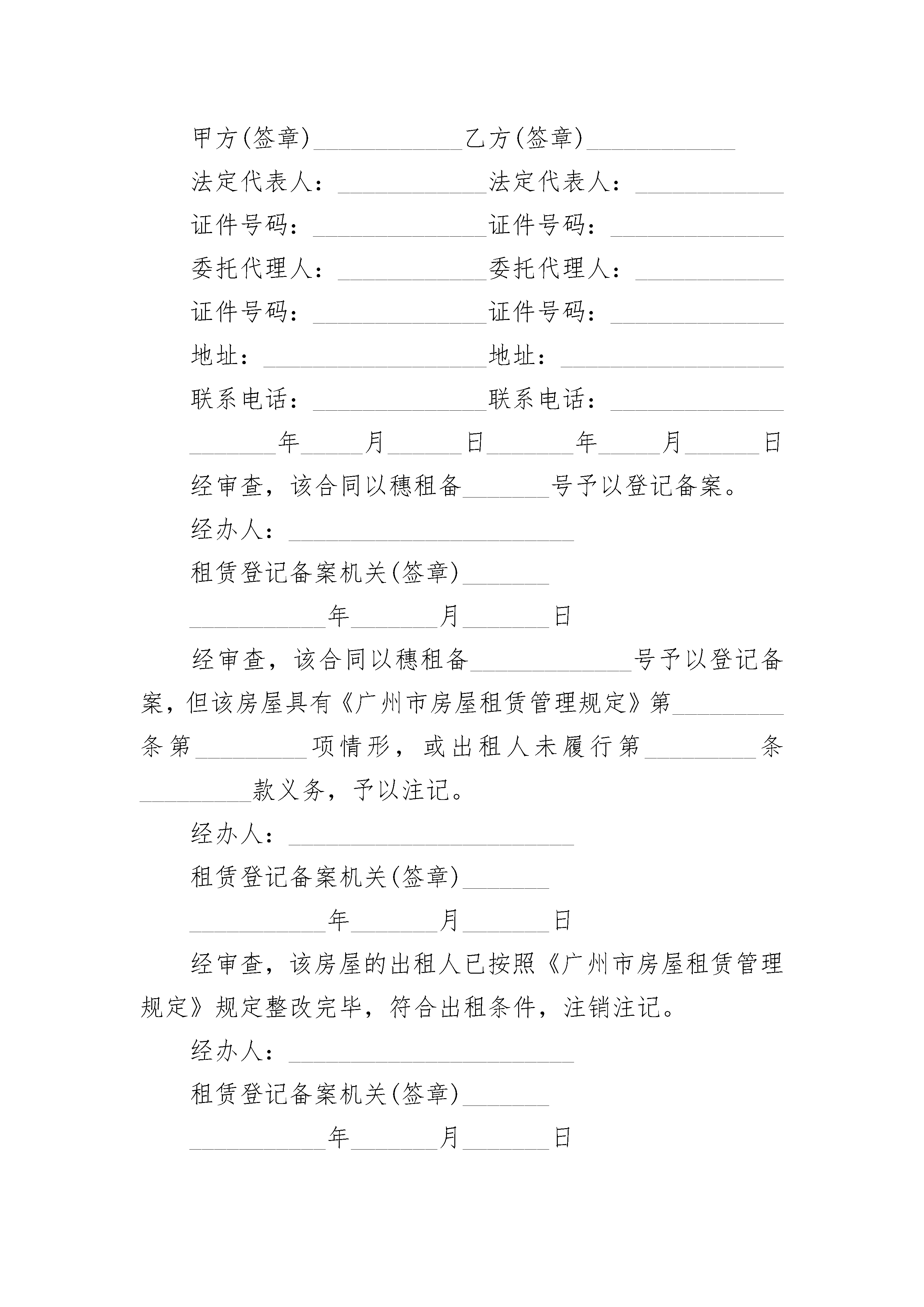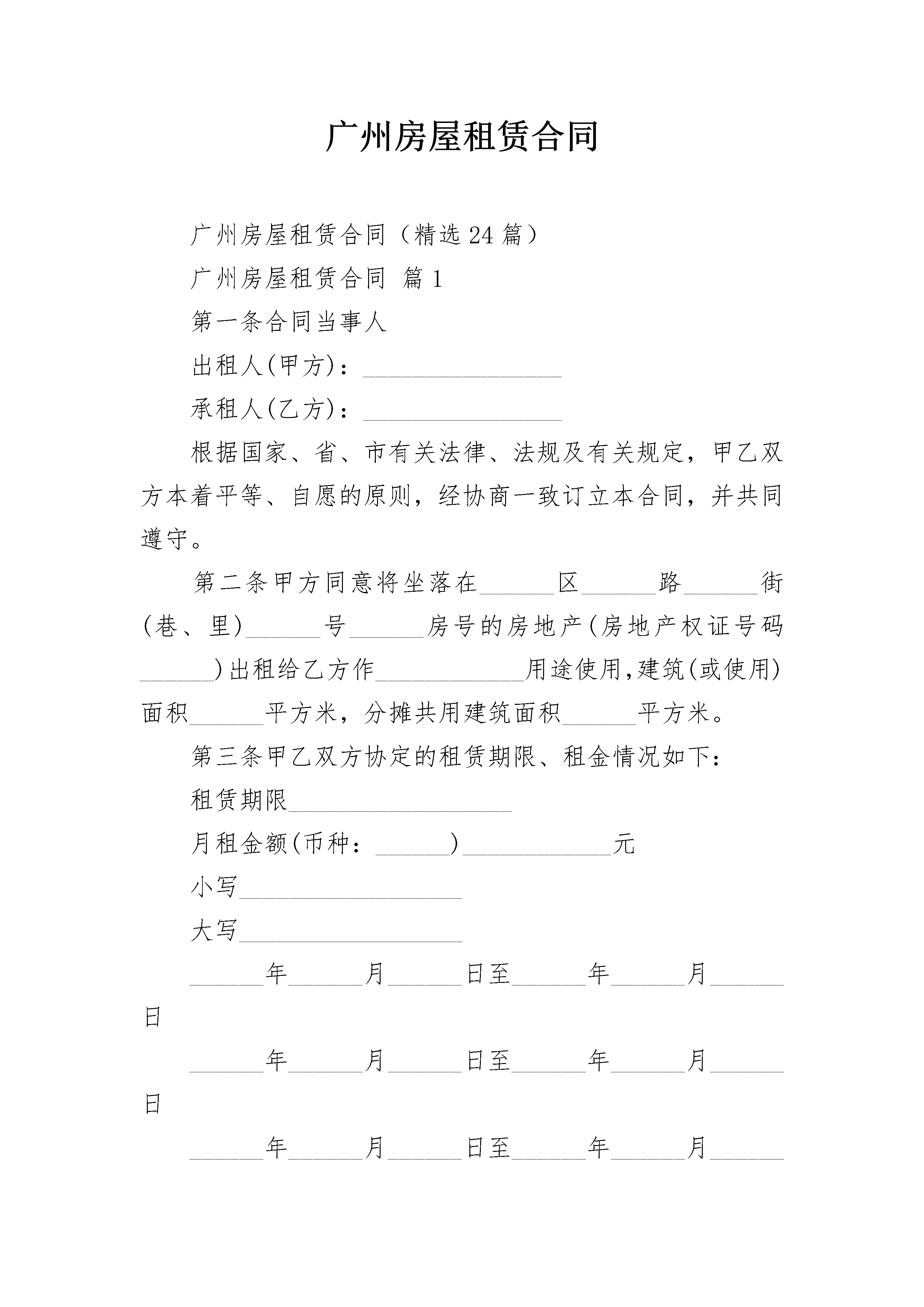 广州房屋租赁合同广州房屋租赁合同(精选24篇)广州房屋租赁合同篇1第一条合同当事人出租人(甲方):________________承租人(乙方):________________根据国家、省、市有关法律、法规及有关规定,甲乙双方本着平等、自愿的原则,经协商一致订立本合同,并共同遵守。第二条甲方同意将坐落在______区______路______街(巷、里)______号______房号的房地产(房地产权证号码______)出租给乙方作____________用途使用,建筑(或使用)面积______平方米,分摊共用建筑面积______平方米。第三条甲乙双方协定的租赁期限、租金情况如下:租赁期限__________________月租金额(币种:______)____________元小写__________________大写________________________年______月______日至______年______月______日______年______月______日至______年______月______日______年______月______日至______年______月______日______年______月______日至______年______月______日______年______月______日至______年______月______日注:期限超过20年的,超过部分无效。租金按_______(月、季、年)结算,由乙方在每_______(月、季、年)的第_______日前按_______付款方式缴付租金给甲方。第四条乙方向甲方交纳(_______币)_______元保证金(可以收取不超过三个月月租金数额),甲方应在租赁期满或解除合同之日将保证金_______(退回乙方、抵偿租金)。第五条双方的主要职责1.甲乙双方应当履行《民法典》、《中华人民共和国民法典》、《广东省城镇房屋租赁条例》、《广州市房屋租赁管理规定》等有关法律法规的规定和义务。2.甲乙双方应当协助、配合有关部门做好房屋租赁、房屋安全、消防安全、治安、计划生育及生产销售假冒伪劣商品的查处工作。第六条甲方的权利和义务1.依照合同约定将房屋及设备交付乙方使用。未按约定提供房屋的,每逾期一日,须按月租金额的_______%向乙方支付违约金。2.甲方应负的修缮责任:______________3.租赁期间转让该房屋时,须提前_______个月(不少于3个月)书面通知乙方;抵押该房屋须提前_______日书面通知乙方。4.发现乙方擅自改变房屋结构、用途致使租赁物受到损失的,或者乙方拖欠租金6个月以上的,甲方可解除合同,收回房屋,并要求赔偿损失。第七条乙方的权利和义务1.依时交纳租金。逾期交付租金的,每逾期一日,乙方须按当月租金额的_______%向甲方支付违约金。2.乙方应负的修缮责任:_____________________3.租赁期届满,应将原承租房屋交回甲方;如需继续承租房屋,应提前_______日与甲方协商,双方另行签订合同。第八条其他约定____________________________第九条甲乙任何一方未能履行本合同条款或者违反有关法律、法规,经催告后在合理期限内仍未履行的,造成的损失由责任方承担。第十条在租赁期内,如遇不可抗力,致使合同无法履行时,甲乙双方应按有关法律规定及时协商处理。第十一条本合同一式_____份,甲乙双方各持一份,送一份给街(镇)出租屋管理服务中心备案。第十二条本合同在履行中如发生争议,双方应协商解决,协商不成时,依法向人民法院起诉,或向____________仲裁委员会申请仲裁。第十三条本合同自双方签之日起生效。甲方(签章)____________乙方(签章)____________法定代表人:____________法定代表人:____________证件号码:______________证件号码:______________委托代理人:____________委托代理人:____________证件号码:______________证件号码:______________地址:__________________地址:__________________联系电话:______________联系电话:_____________________年_____月______日_______年_____月______日经审查,该合同以穗租备_______号予以登记备案。经办人:_______________________租赁登记备案机关(签章)__________________年_______月_______日经审查,该合同以穗租备_____________号予以登记备案,但该房屋具有《广