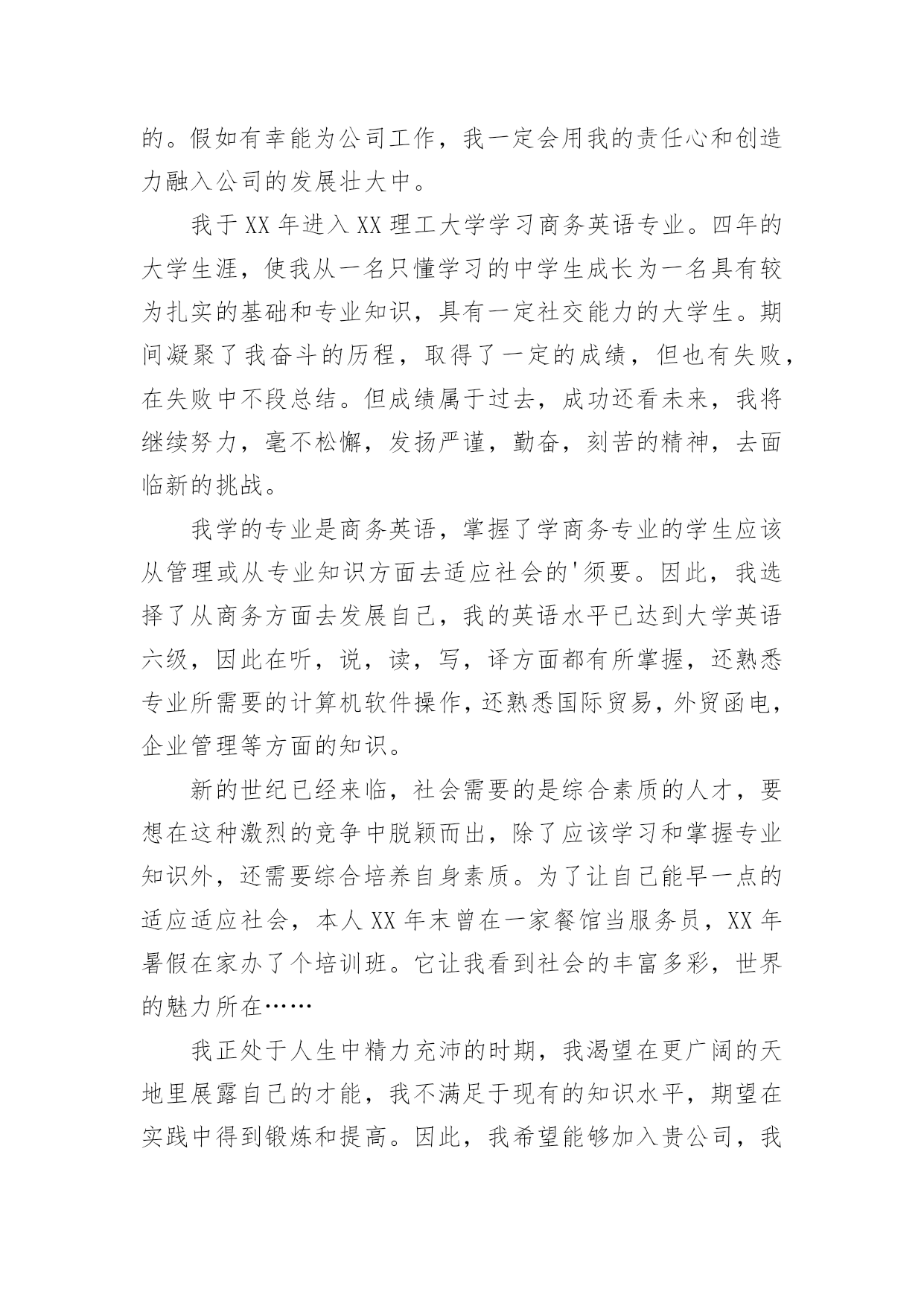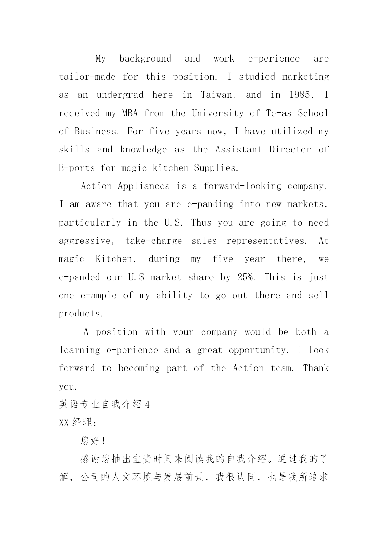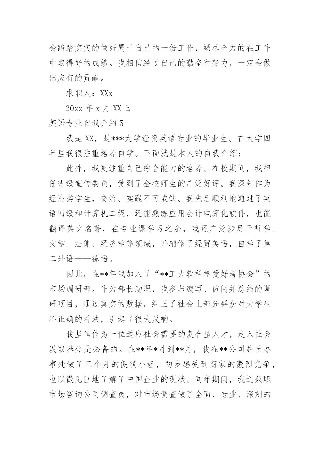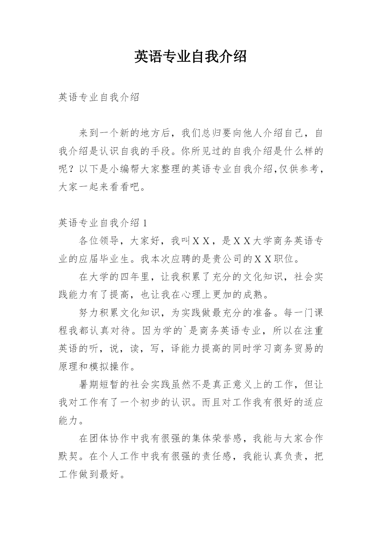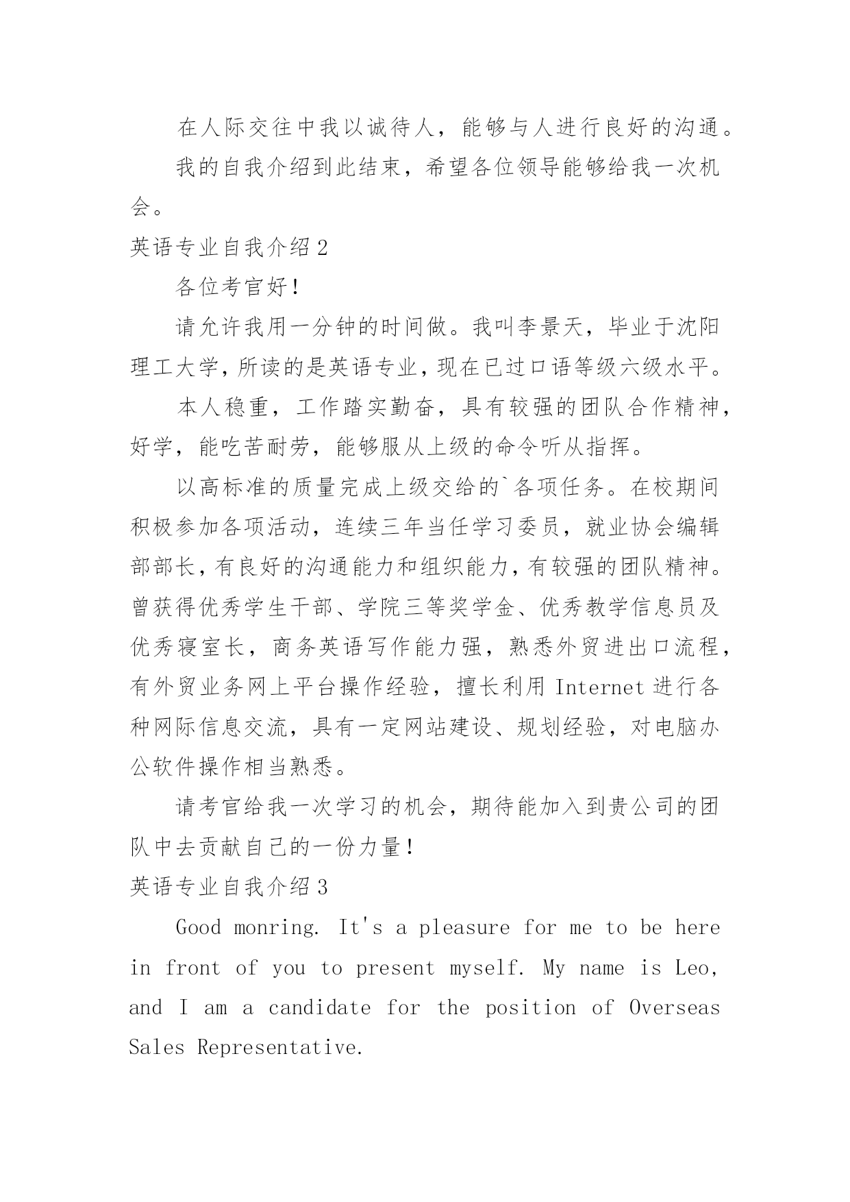 英语专业自我介绍 英语专业自我介绍来到一个新的地方后,我们总归要向他人介绍自己,自我介绍是认识自我的手段。你所见过的自我介绍是什么样的呢?以下是小编帮大家整理的英语专业自我介绍,仅供参考,大家一起来看看吧。英语专业自我介绍1各位领导,大家好,我叫XX,是XX大学商务英语专业的应届毕业生。我本次应聘的是贵公司的XX职位。在大学的四年里,让我积累了充分的文化知识,社会实践能力有了提高,也让我在心理上更加的成熟。努力积累文化知识,为实践做最充分的准备。每一门课程我都认真对待。因为学的`是商务英语专业,所以在注重英语的听,说,读,写,译能力提高的同时学习商务贸易的原理和模拟操作。暑期短暂的社会实践虽然不是真正意义上的工作,但让我对工作有了一个初步的认识。而且对工作我有很好的适应能力。在团体协作中我有很强的集体荣誉感,我能与大家合作默契。在个人工作中我有很强的责任感,我能认真负责,把工作做到最好。在人际交往中我以诚待人,能够与人进行良好的沟通。我的自我介绍到此结束,希望各位领导能够给我一次机会。英语专业自我介绍2各位考官好!请允许我用一分钟的时间做。我叫李景天,毕业于沈阳理工大学,所读的是英语专业,现在已过口语等级六级水平。本人稳重,工作踏实勤奋,具有较强的团队合作精神,好学,能吃苦耐劳,能够服从上级的命令听从指挥。以高标准的质量完成上级交给的`各项任务。在校期间积极参加各项活动,连续三年当任学习委员,就业协会编辑部部长,有良好的沟通能力和组织能力,有较强的团队精神。曾获得优秀学生干部、学院三等奖学金、优秀教学信息员及优秀寝室长,商务英语写作能力强,熟悉外贸进出口流程,有外贸业务网上平台操作经验,擅长利用Internet进行各种网际信息交流,具有一定网站建设、规划经验,对电脑办公软件操作相当熟悉。请考官给我一次学习的机会,期待能加入到贵公司的团队中去贡献自己的一份力量!英语专业自我介绍3Goodmonring.It'sapleasureformetobehereinfrontofyoutopresentmyself.MynameisLeo,andIamacandidateforthepositionofOverseasSalesRepresentative.Mybackgroundandworke-periencearetailor-madeforthisposition.IstudiedmarketingasanundergradhereinTaiwan,andin1985,IreceivedmyMBAfromtheUniversityofTe-asSchoolofBusiness.Forfiveyearsnow,IhaveutilizedmyskillsandknowledgeastheAssistantDirectorofE-portsformagickitchenSupplies.ActionAppliancesisaforward-lookingcompany.Iamawarethatyouaree-pandingintonewmarkets,particularlyintheU.S.Thusyouaregoingtoneedaggressive,take-chargesalesrepresentatives.AtmagicKitchen,duringmyfiveyearthere,wee-pandedourU.Smarketshareby25%.Thisisjustonee-ampleofmyabilitytogooutthereandsellproducts.Apositionwithyourcompanywouldbebothalearninge-perienceandagreatopportunity.IlookforwardtobecomingpartoftheActionteam.Thankyou.英语专业自我介绍4XX经理:您好!感谢您抽出宝贵时间来阅读我的自我介绍。通过我的了解,公司的人文环境与发展前景,我很认同,也是我所追求的。假如有幸能为公司工作,我一定会用我的责任心和创造力融入公司的发展壮大中。我于XX年进入XX理工大学学习商务英语专业。四年的大学生涯,使我从一名只懂学习的中学生成长为一名具有较为扎实的基础和专业知识,具有一定社交能力的大学生。期间凝聚了我奋斗的历程,取得了一定的成绩,但也有失败,在失败中不段总结。但成绩属于过去,成功还看未来,我将继续努力,毫不松懈,发扬严谨,勤奋,刻苦的精神,去面临新的挑战。我学的专业是商务英语,掌握了学商务专业的学生应该从管理或从专业知识方面去适应社会的'须要。因此,我选择了从商务方面去发展自己,我的英语水平已达到大学英语六级,因此在听,说,读,写,译方面都有所掌握