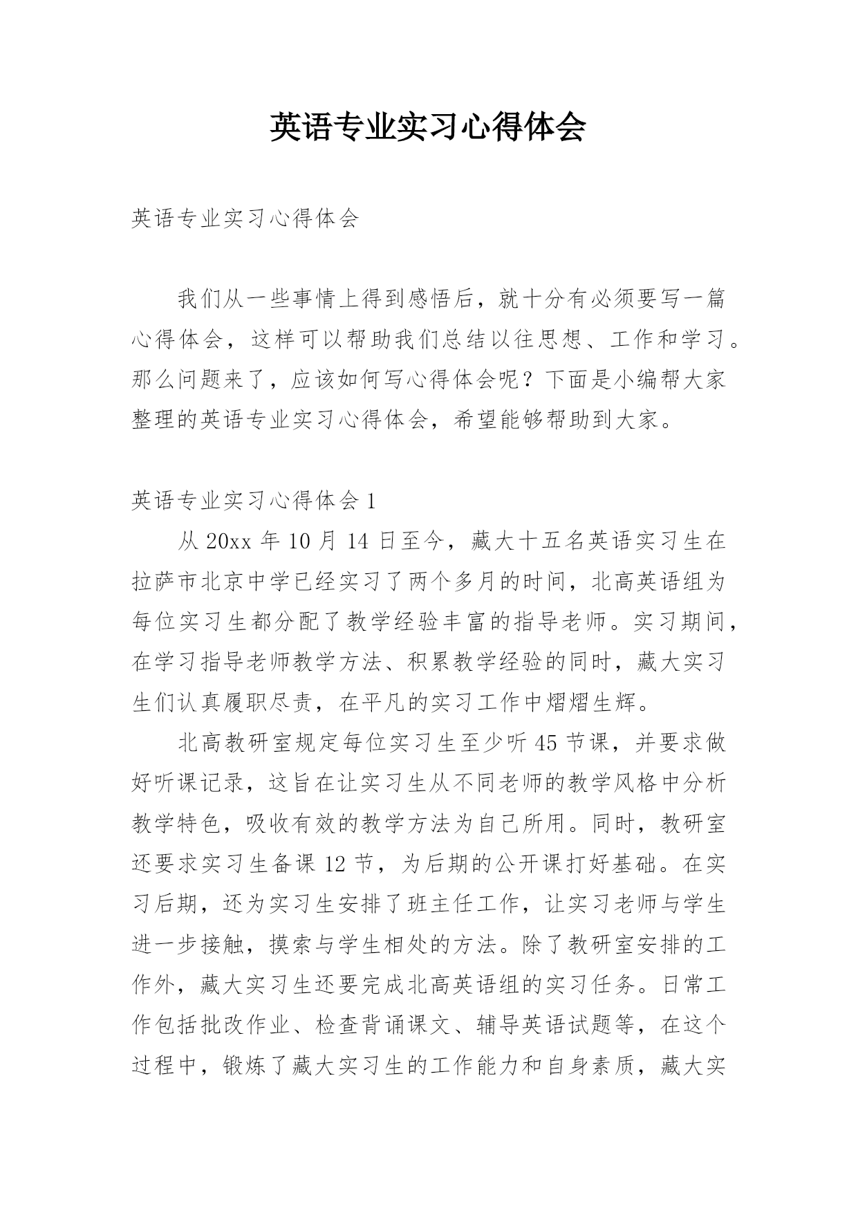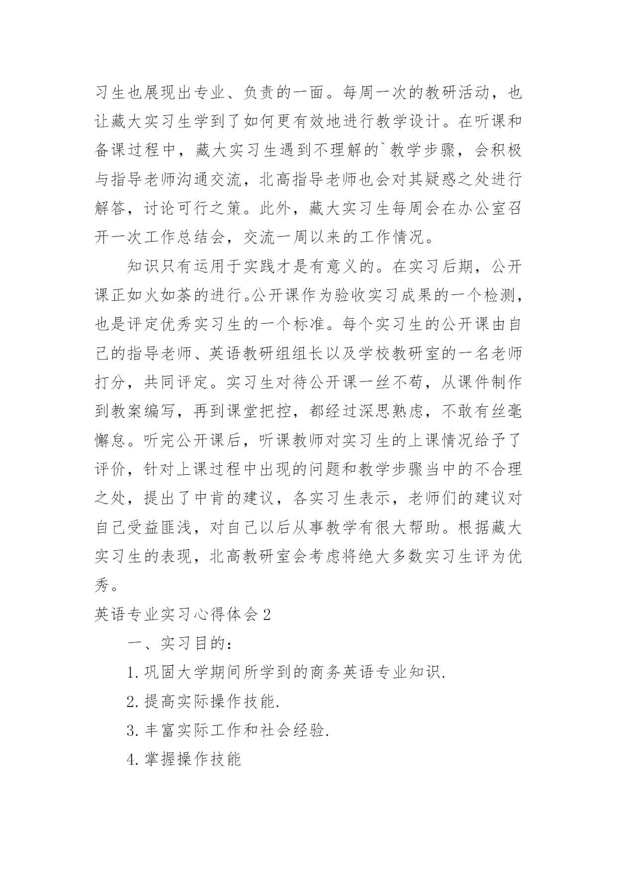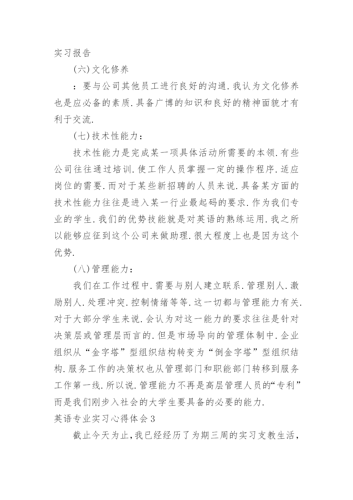 英语专业实习心得体会 英语专业实习心得体会我们从一些事情上得到感悟后,就十分有必须要写一篇心得体会,这样可以帮助我们总结以往思想、工作和学习。那么问题来了,应该如何写心得体会呢?下面是小编帮大家整理的英语专业实习心得体会,希望能够帮助到大家。英语专业实习心得体会1从20xx年10月14日至今,藏大十五名英语实习生在拉萨市北京中学已经实习了两个多月的时间,北高英语组为每位实习生都分配了教学经验丰富的指导老师。实习期间,在学习指导老师教学方法、积累教学经验的同时,藏大实习生们认真履职尽责,在平凡的实习工作中熠熠生辉。北高教研室规定每位实习生至少听45节课,并要求做好听课记录,这旨在让实习生从不同老师的教学风格中分析教学特色,吸收有效的教学方法为自己所用。同时,教研室还要求实习生备课12节,为后期的公开课打好基础。在实习后期,还为实习生安排了班主任工作,让实习老师与学生进一步接触,摸索与学生相处的方法。除了教研室安排的工作外,藏大实习生还要完成北高英语组的实习任务。日常工作包括批改作业、检查背诵课文、辅导英语试题等,在这个过程中,锻炼了藏大实习生的工作能力和自身素质,藏大实习生也展现出专业、负责的一面。每周一次的教研活动,也让藏大实习生学到了如何更有效地进行教学设计。在听课和备课过程中,藏大实习生遇到不理解的`教学步骤,会积极与指导老师沟通交流,北高指导老师也会对其疑惑之处进行解答,讨论可行之策。此外,藏大实习生每周会在办公室召开一次工作总结会,交流一周以来的工作情况。知识只有运用于实践才是有意义的。在实习后期,公开课正如火如荼的进行。公开课作为验收实习成果的一个检测,也是评定优秀实习生的一个标准。每个实习生的公开课由自己的指导老师、英语教研组组长以及学校教研室的一名老师打分,共同评定。实习生对待公开课一丝不苟,从课件制作到教案编写,再到课堂把控,都经过深思熟虑,不敢有丝毫懈怠。听完公开课后,听课教师对实习生的上课情况给予了评价,针对上课过程中出现的问题和教学步骤当中的不合理之处,提出了中肯的建议,各实习生表示,老师们的建议对自己受益匪浅,对自己以后从事教学有很大帮助。根据藏大实习生的表现,北高教研室会考虑将绝大多数实习生评为优秀。英语专业实习心得体会2一、实习目的:1.巩固大学期间所学到的商务英语专业知识.2.提高实际操作技能.3.丰富实际工作和社会经验.4.掌握操作技能5.将所学知识运用于实际工作.二、实习心得体会两个月的实习.让我学到了很多在书本上没学过的东西.也让我对这个社会有了更多深入的了解.我认为学我们这个专业或者说在做总经理助理这个工作时应当具备以下几种能力:(一)交际能力:善于与他人交往是做这项工作应具备的首要能力.说到底.助理其实也是一种服务人员.而服务人员就必须懂得如何与他人接触.“他人”既包括外部的客户.也包括内部的同事和领导.我们必须要学会如何与他人建立和维持关系.学会倾听别人的意见表达自己的想法.注重交往艺术.能够区别不同性别.不同场合.不同年龄.不同文化背景的人应采取交往方式.对自己一定要有正确的定位.才能在工作中提供优质的服务.(二)合作能力:助理工作不像某些物质工作那样工序分明.无论是在前台还是在后台的服务都必须与公司的上司、下属、同事、顾客、供应商等进行合作.另外.做一名助理还应当有全局观念.较强的协调沟通意识.学会与供应商协商.与同事合作.充分发挥不同角色的作用.利用现有的各种因素为公司提供满意的服务.发挥助理的中介、纽带作用.(三)学习能力:在我看来.整个实习过程既是我向用人单位提供服务的过程.也是一个学习的过程.助理必须根据公司和客户的具体需要确立服务方式.我们如果越了解他人的期望.就越能为他人提供优质的服务.而市场需求的不断变化就要求我们应有不断学习新知识、新技能的能力.有较强的适应能力.我刚到单位的第二天.副总就要求我为公司写一份商业计划书.但我连商业计划书的格式是什么都不知道.最后只有闷在办公室通过上网查询.才学习到商业计划书的写作方式.该计划书完成后.虽然在实际内容上与副总要求的有所差距.但我的学习能力却得到了用人单位的肯定.(四)教育、说服能力:在工作过程中.助理往往会成为经理和其他工作人员之间的.“传声筒”.负责着将上级的指示传达给下级.将下级意见反馈给上级的任务.如何给有效的促进二者之间的交流.助理就必须通过语言去吸引人.打动人.说服人的能力.懂得清晰.简洁.明了的表达中心思想.为上下级提供准确易懂的信息.也就是说.在这样一个信息沟通的过程中.个人沟通能力直接影响着沟通的结果.(五)企业环境.顾客知识:在工作过程中.对企业内部环境.对市场情况.对顾客的特点掌握的越全面.就越能为单位提供满意的服务.平时工作时要善于观察.还要学会换位思考.根据企业本身的特点调整自己的服务方式.可以