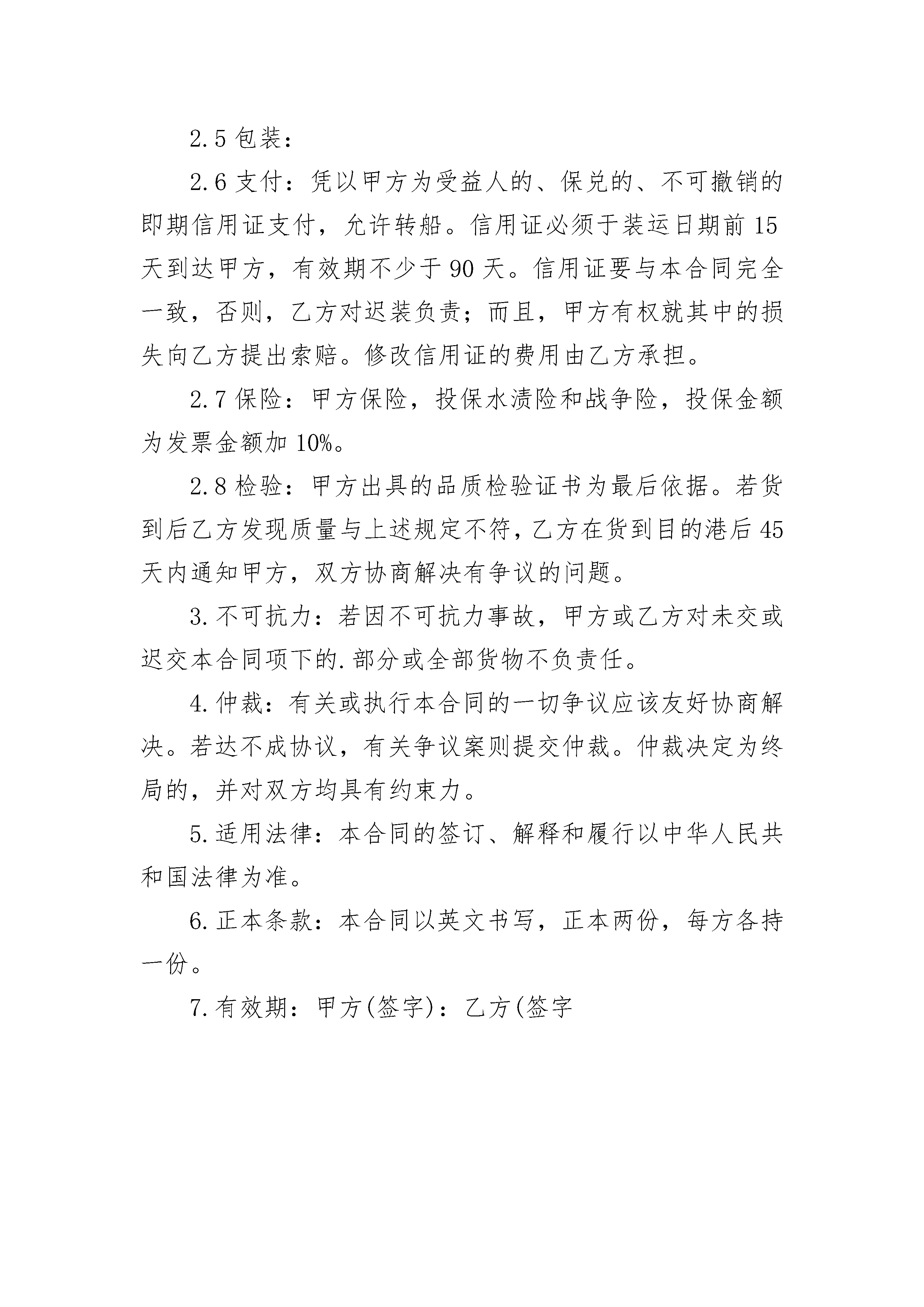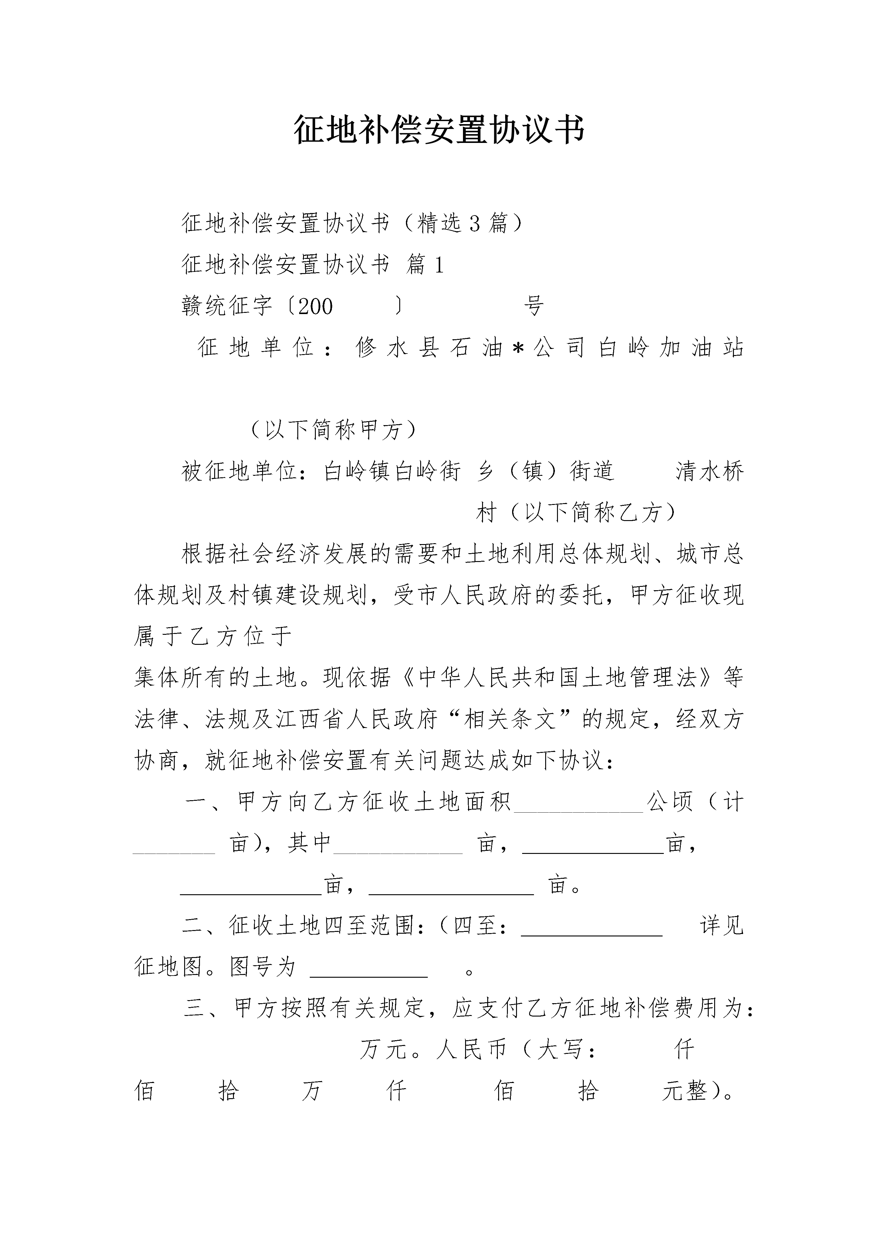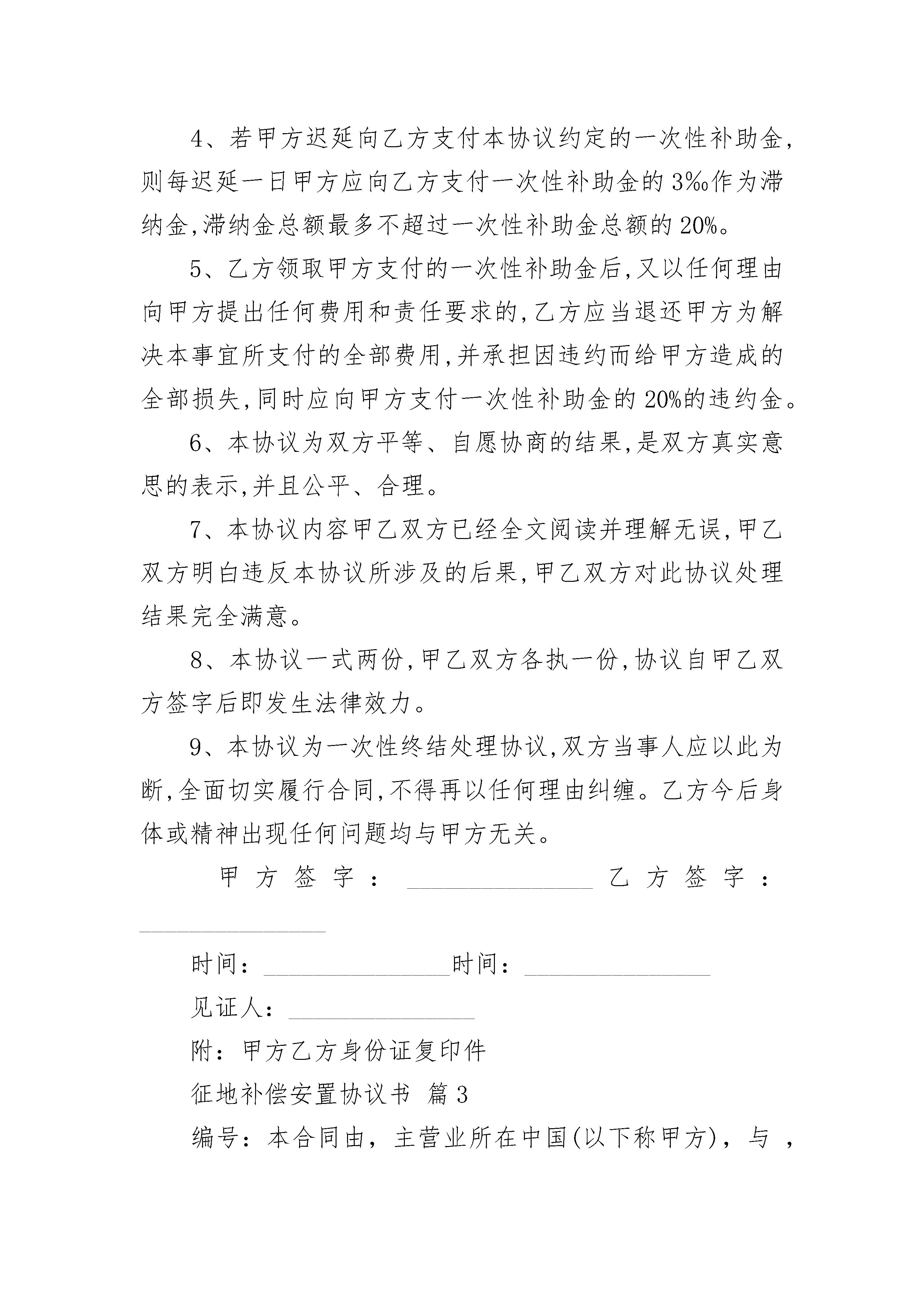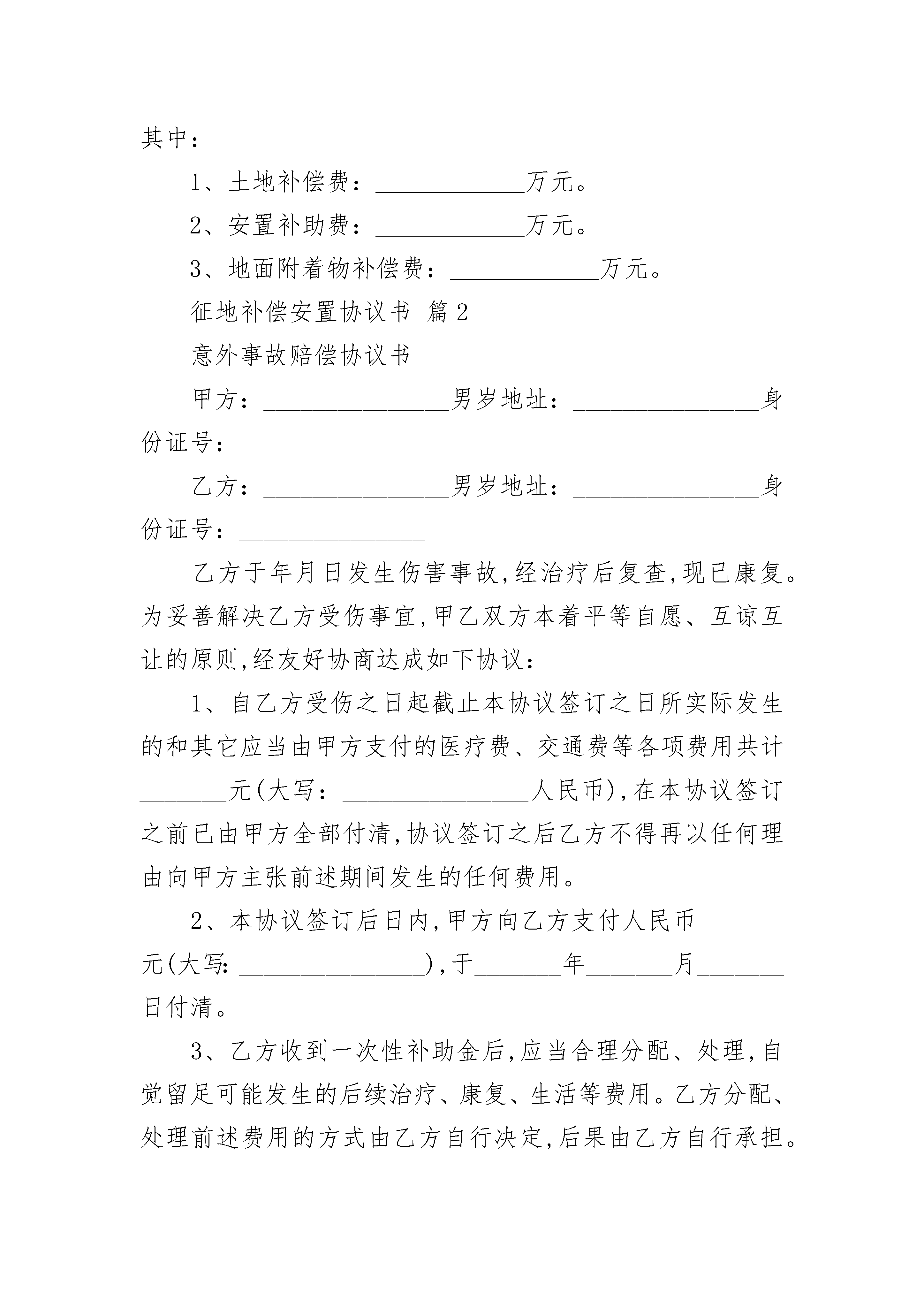 征地补偿安置协议书征地补偿安置协议书(精选3篇)征地补偿安置协议书篇1赣统征字〔200〕号征地单位:修水县石油*公司白岭加油站(以下简称甲方)被征地单位:白岭镇白岭街乡(镇)街道清水桥村(以下简称乙方)根据社会经济发展的需要和土地利用总体规划、城市总体规划及村镇建设规划,受市人民政府的委托,甲方征收现属于乙方位于集体所有的土地。现依据《中华人民共和国土地管理法》等法律、法规及江西省人民政府“相关条文”的规定,经双方协商,就征地补偿安置有关问题达成如下协议:一、甲方向乙方征收土地面积___________公顷(计_______亩),其中___________亩,______亩,______亩,_______亩。二、征收土地四至范围:(四至:______详见征地图。图号为_____。三、甲方按照有关规定,应支付乙方征地补偿费用为:万元。人民币(大写:仟佰拾万仟佰拾元整)。其中:1、土地补偿费:______万元。2、安置补助费:______万元。3、地面附着物补偿费:______万元。征地补偿安置协议书篇2意外事故赔偿协议书甲方:_______________男岁地址:_______________身份证号:_______________乙方:_______________男岁地址:_______________身份证号:_______________乙方于年月日发生伤害事故,经治疗后复查,现已康复。为妥善解决乙方受伤事宜,甲乙双方本着平等自愿、互谅互让的原则,经友好协商达成如下协议:1、自乙方受伤之日起截止本协议签订之日所实际发生的和其它应当由甲方支付的医疗费、交通费等各项费用共计_______元(大写:_______________人民币),在本协议签订之前已由甲方全部付清,协议签订之后乙方不得再以任何理由向甲方主张前述期间发生的任何费用。2、本协议签订后日内,甲方向乙方支付人民币_______元(大写:_______________),于_______年_______月_______日付清。3、乙方收到一次性补助金后,应当合理分配、处理,自觉留足可能发生的后续治疗、康复、生活等费用。乙方分配、处理前述费用的方式由乙方自行决定,后果由乙方自行承担。4、若甲方迟延向乙方支付本协议约定的一次性补助金,则每迟延一日甲方应向乙方支付一次性补助金的3‰作为滞纳金,滞纳金总额最多不超过一次性补助金总额的20%。5、乙方领取甲方支付的一次性补助金后,又以任何理由向甲方提出任何费用和责任要求的,乙方应当退还甲方为解决本事宜所支付的全部费用,并承担因违约而给甲方造成的全部损失,同时应向甲方支付一次性补助金的20%的违约金。6、本协议为双方平等、自愿协商的结果,是双方真实意思的表示,并且公平、合理。7、本协议内容甲乙双方已经全文阅读并理解无误,甲乙双方明白违反本协议所涉及的后果,甲乙双方对此协议处理结果完全满意。8、本协议一式两份,甲乙双方各执一份,协议自甲乙双方签字后即发生法律效力。9、本协议为一次性终结处理协议,双方当事人应以此为断,全面切实履行合同,不得再以任何理由纠缠。乙方今后身体或精神出现任何问题均与甲方无关。甲方签字:_______________乙方签字:_______________时间:_______________时间:_______________见证人:_______________附:甲方乙方身份证复印件征地补偿安置协议书篇3编号:本合同由,主营业所在中国(以下称甲方),与,主营业所在美国(以下称乙方)于在中国签署。兹证明:鉴于乙方现拥有用于制造的机器设备,并愿意将机器设备卖给甲方;鉴于乙方同意购买甲方用乙方提供的机器设备生产的,以补偿其机器设备的价款;鉴于甲方同意从乙方购买该项机器设备;鉴于甲方同意向乙方出售,以偿还乙方的机器设备价款;因此,考虑到本协议所述的前提和约定,甲、乙双方特此立约:1.购买协议:甲方同意从乙方按下列条款购买下述商品:1.1商品、规格及其生产能力:商品:规格:生产能力:1.2数量:1.3价格:港fb价:单价:总价:1.4支付:机器设备价款以甲方的产品偿还,全部价款在连续________年内平均三次付清,自日开始支付。1.5装运:装运期:装运港:目的港:装运唛头:1.6保险:由甲方投保。1.7检验:1.8保证:乙方保证其机器设备从未用过,性能先进,质量好,并保证该机器能生产符合规格,产量达到每年米。2.销售协议:甲方以偿还购买乙方机器设备的价款。2.1商品及规格:商品:规格:2.2数量:每年米。2.3价