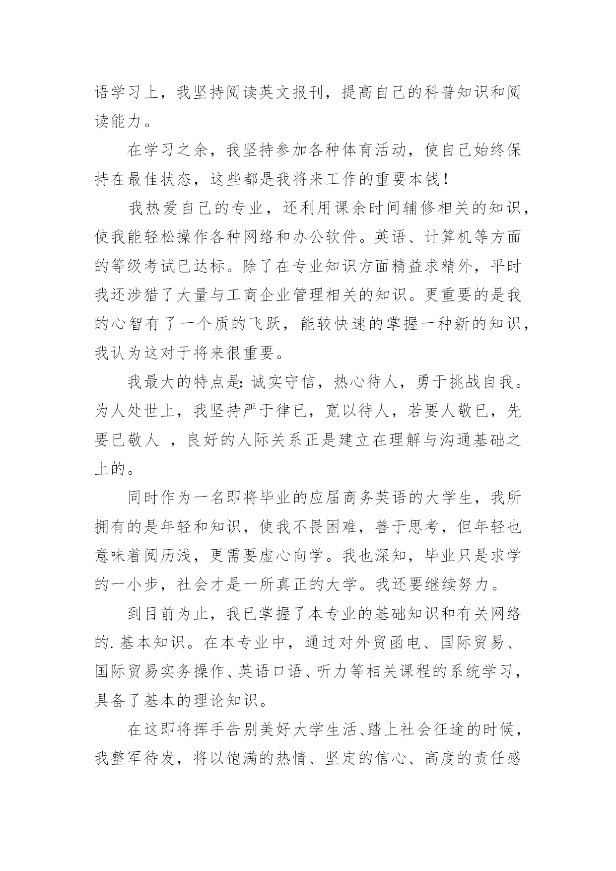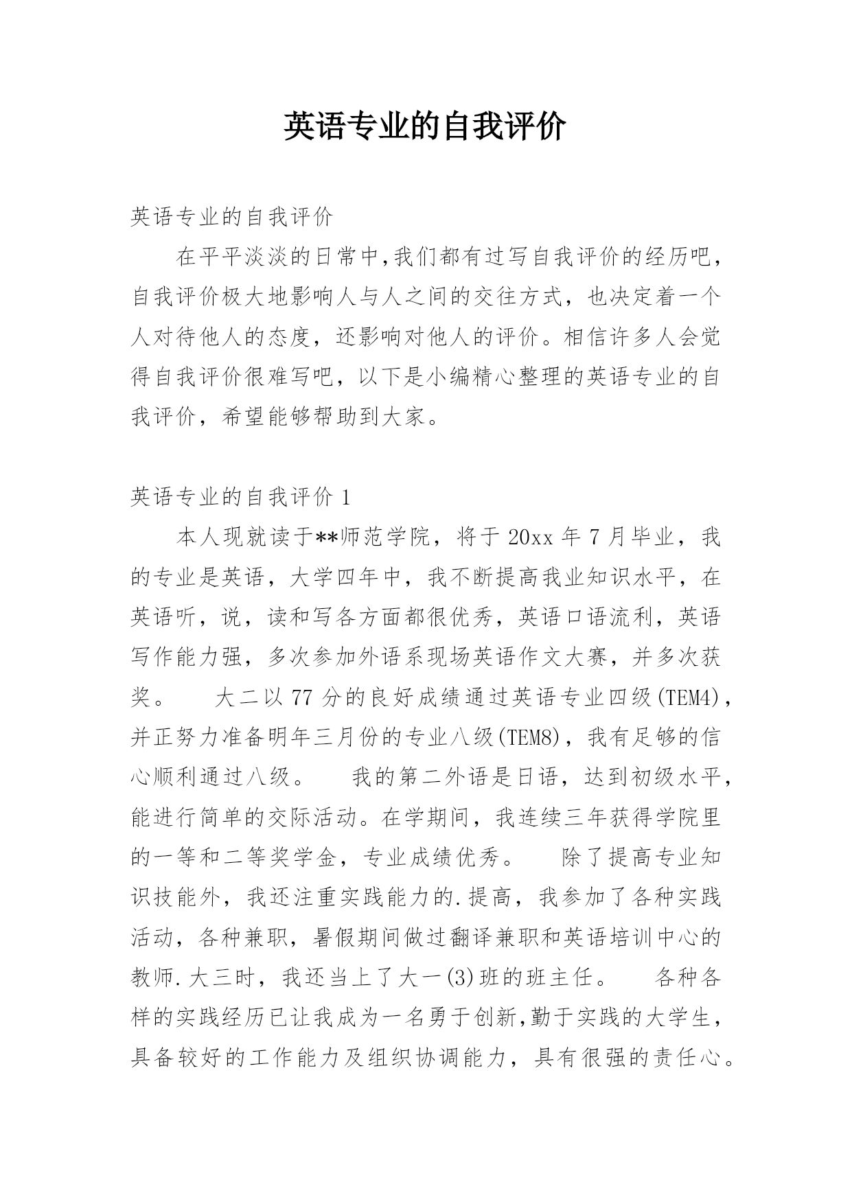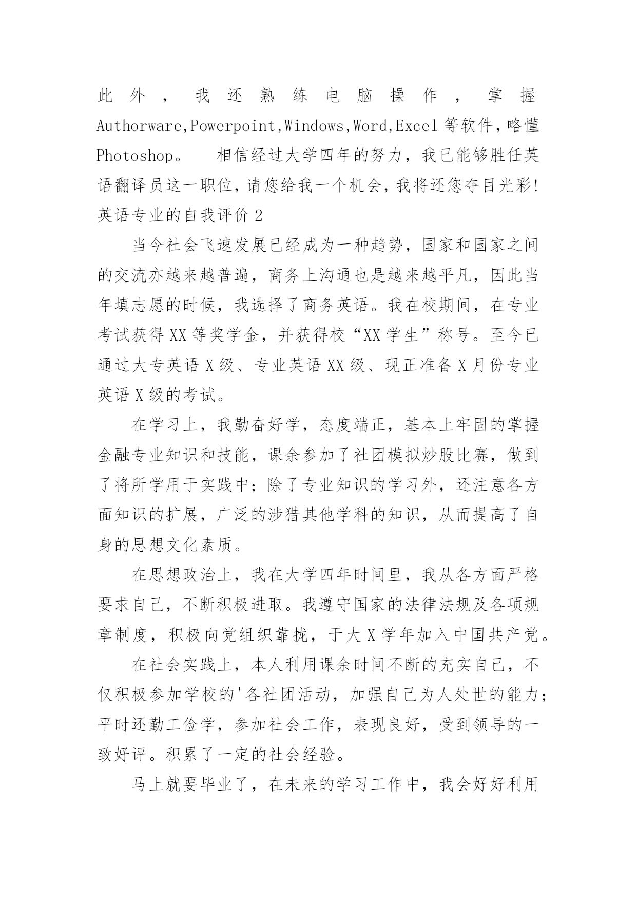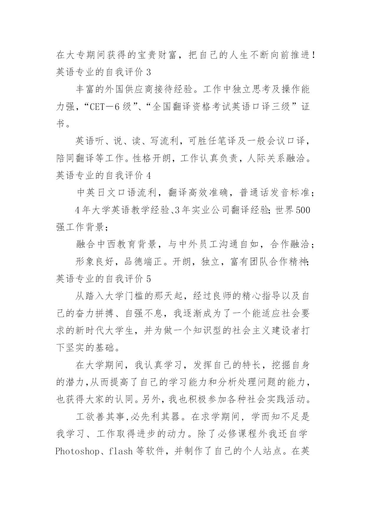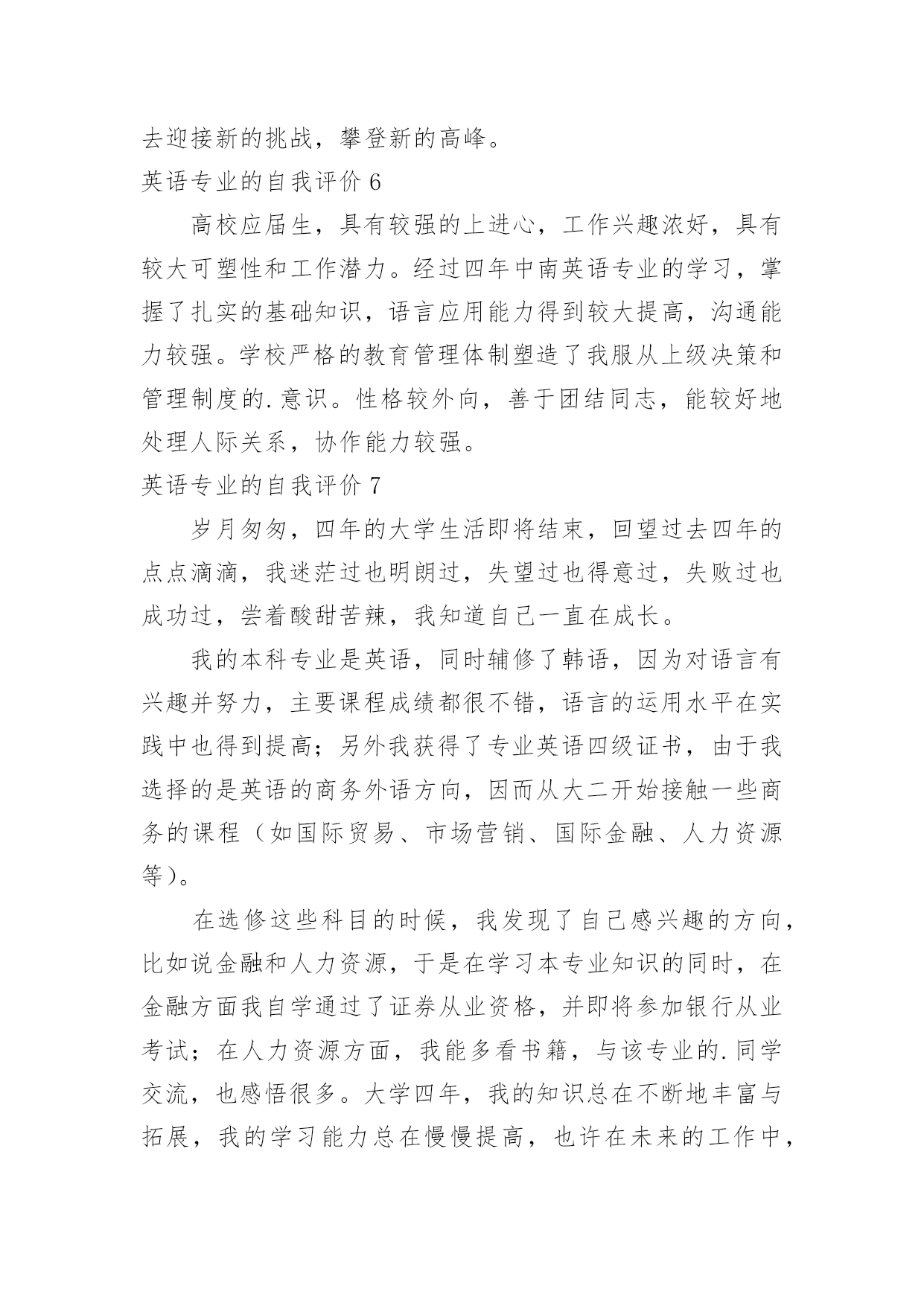 英语专业的自我评价 英语专业的自我评价在平平淡淡的日常中,我们都有过写自我评价的经历吧,自我评价极大地影响人与人之间的交往方式,也决定着一个人对待他人的态度,还影响对他人的评价。相信许多人会觉得自我评价很难写吧,以下是小编精心整理的英语专业的自我评价,希望能够帮助到大家。英语专业的自我评价1本人现就读于**师范学院,将于20xx年7月毕业,我的专业是英语,大学四年中,我不断提高我业知识水平,在英语听,说,读和写各方面都很优秀,英语口语流利,英语写作能力强,多次参加外语系现场英语作文大赛,并多次获奖。大二以77分的良好成绩通过英语专业四级(TEM4),并正努力准备明年三月份的专业八级(TEM8),我有足够的信心顺利通过八级。我的第二外语是日语,达到初级水平,能进行简单的交际活动。在学期间,我连续三年获得学院里的一等和二等奖学金,专业成绩优秀。除了提高专业知识技能外,我还注重实践能力的.提高,我参加了各种实践活动,各种兼职,暑假期间做过翻译兼职和英语培训中心的教师.大三时,我还当上了大一(3)班的班主任。各种各样的实践经历已让我成为一名勇于创新,勤于实践的大学生,具备较好的工作能力及组织协调能力,具有很强的责任心。此外,我还熟练电脑操作,掌握Authorware,Powerpoint,Windows,Word,Excel等软件,略懂Photoshop。相信经过大学四年的努力,我已能够胜任英语翻译员这一职位,请您给我一个机会,我将还您夺目光彩!英语专业的自我评价2当今社会飞速发展已经成为一种趋势,国家和国家之间的交流亦越来越普遍,商务上沟通也是越来越平凡,因此当年填志愿的时候,我选择了商务英语。我在校期间,在专业考试获得XX等奖学金,并获得校“XX学生”称号。至今已通过大专英语X级、专业英语XX级、现正准备X月份专业英语X级的考试。在学习上,我勤奋好学,态度端正,基本上牢固的掌握金融专业知识和技能,课余参加了社团模拟炒股比赛,做到了将所学用于实践中;除了专业知识的学习外,还注意各方面知识的扩展,广泛的涉猎其他学科的知识,从而提高了自身的思想文化素质。在思想政治上,我在大学四年时间里,我从各方面严格要求自己,不断积极进取。我遵守国家的法律法规及各项规章制度,积极向党组织靠拢,于大X学年加入中国共产党。在社会实践上,本人利用课余时间不断的充实自己,不仅积极参加学校的'各社团活动,加强自己为人处世的能力;平时还勤工俭学,参加社会工作,表现良好,受到领导的一致好评。积累了一定的社会经验。马上就要毕业了,在未来的学习工作中,我会好好利用在大专期间获得的宝贵财富,把自己的人生不断向前推进!英语专业的自我评价3丰富的外国供应商接待经验。工作中独立思考及操作能力强,“CET-6级”、“全国翻译资格考试英语口译三级”证书。英语听、说、读、写流利,可胜任笔译及一般会议口译,陪同翻译等工作。性格开朗,工作认真负责,人际关系融洽。英语专业的自我评价4中英日文口语流利,翻译高效准确,普通话发音标准;4年大学英语教学经验、3年实业公司翻译经验;世界500强工作背景;融合中西教育背景,与中外员工沟通自如,合作融洽;形象良好,品德端正。开朗,独立,富有团队合作精神;英语专业的自我评价5从踏入大学门槛的那天起,经过良师的精心指导以及自己的奋力拼搏、自强不息,我逐渐成为了一个能适应社会要求的新时代大学生,并为做一个知识型的社会主义建设者打下坚实的基础。在大学期间,我认真学习,发挥自己的特长,挖掘自身的潜力,从而提高了自己的学习能力和分析处理问题的能力,也获得大家的认同。另外,我也积极参加各种社会实践活动。工欲善其事,必先利其器。在求学期间,学而知不足是我学习、工作取得进步的动力。除了必修课程外我还自学Photoshop、flash等软件,并制作了自己的个人站点。在英语学习上,我坚持阅读英文报刊,提高自己的科普知识和阅读能力。在学习之余,我坚持参加各种体育活动,使自己始终保持在最佳状态,这些都是我将来工作的重要本钱!我热爱自己的专业,还利用课余时间辅修相关的知识,使我能轻松操作各种网络和办公软件。英语、计算机等方面的等级考试已达标。除了在专业知识方面精益求精外,平时我还涉猎了大量与工商企业管理相关的知识。更重要的是我的心智有了一个质的飞跃,能较快速的掌握一种新的知识,我认为这对于将来很重要。我最大的特点是:诚实守信,热心待人,勇于挑战自我。为人处世上,我坚持严于律已,宽以待人,若要人敬已,先要已敬人,良好的人际关系正是建立在理解与沟通基础之上的。同时作为一名即将毕业的应届商务英语的大学生,我所拥有的是年轻和知识,使我不畏困难,善于思考,但年轻也意味着阅历浅,更需要虚心向学。我也深知,毕业只是求学的一小步,社会才是一所真正的大学。我还要继续努力。到目前为止,我已掌握了本