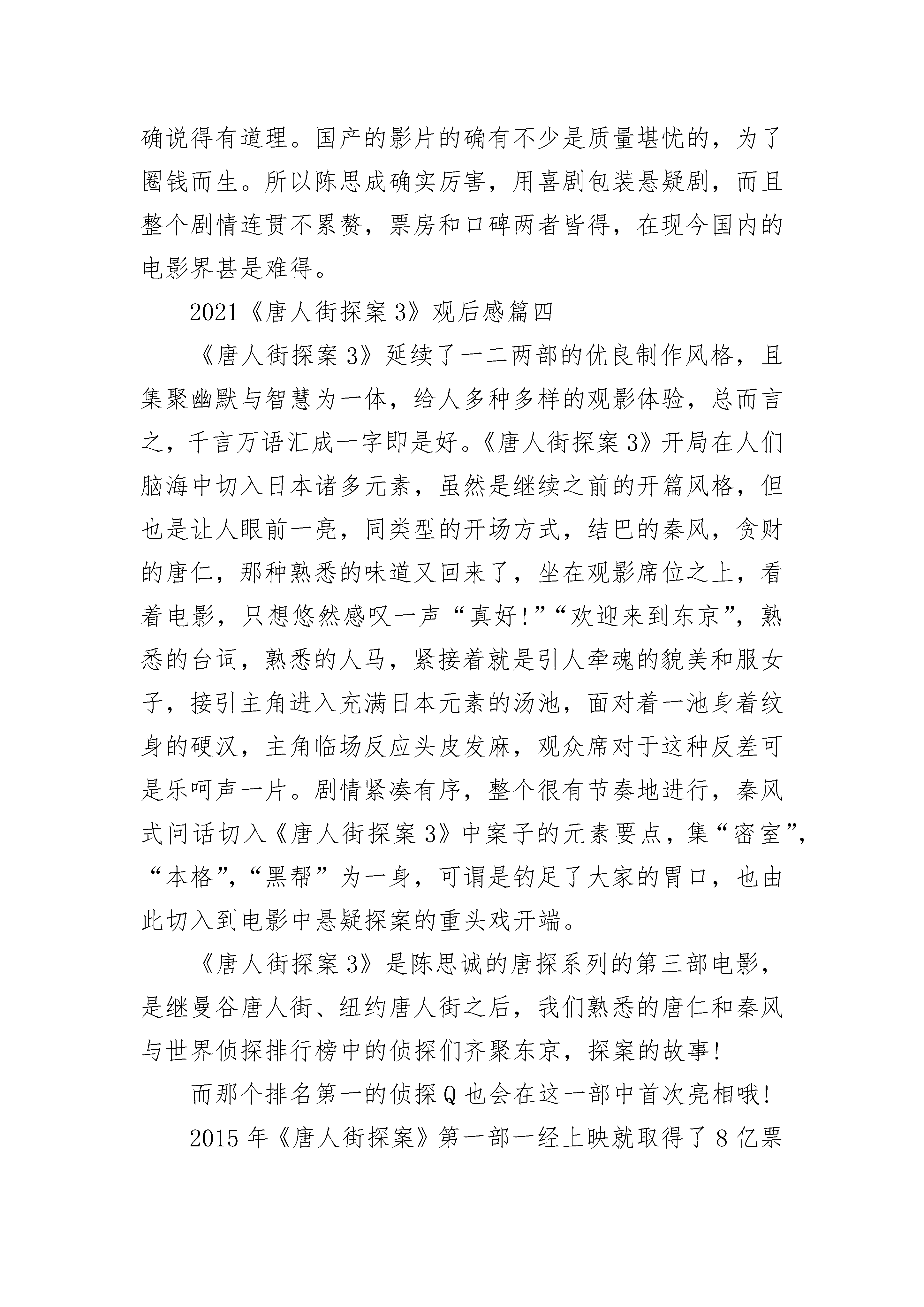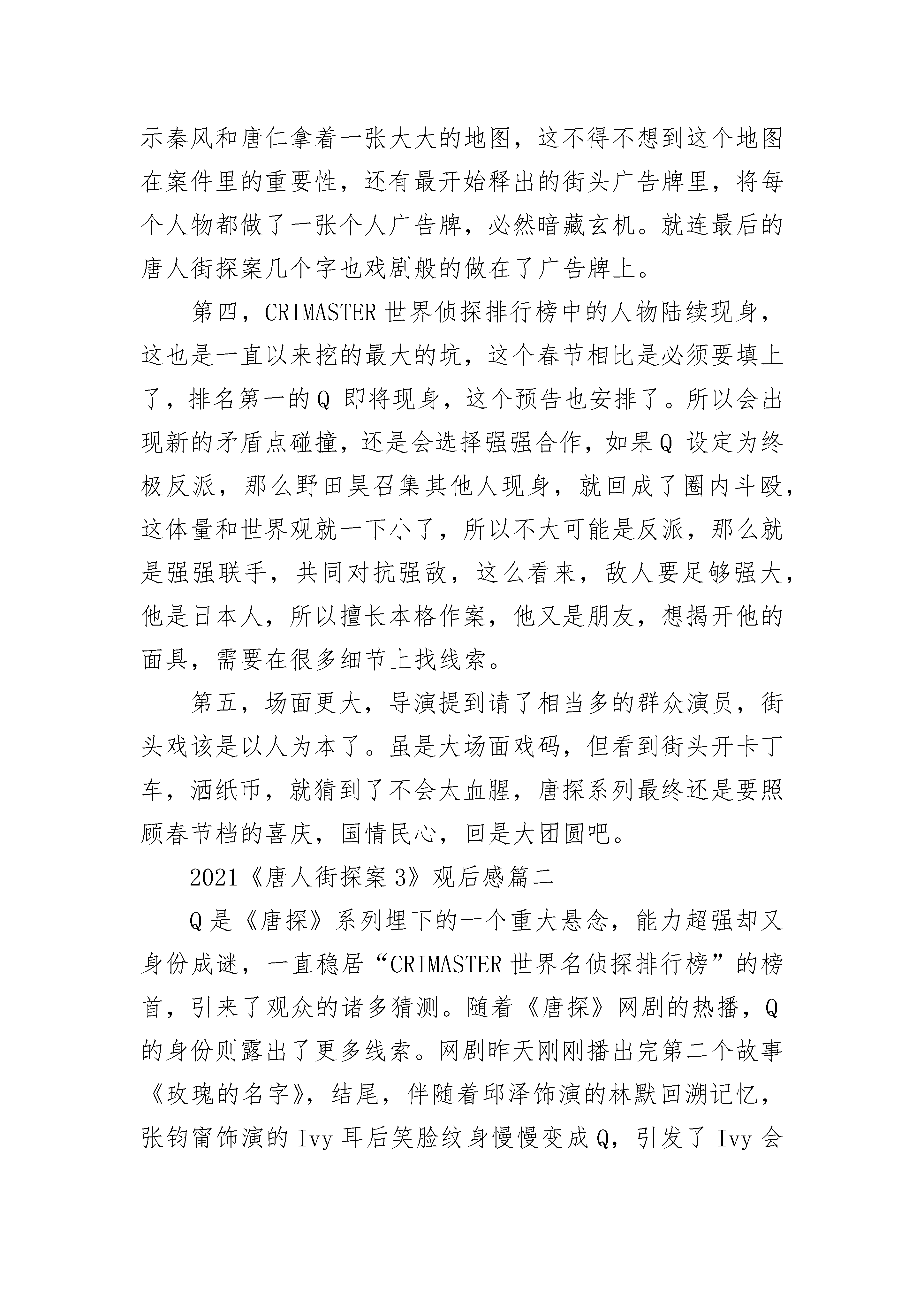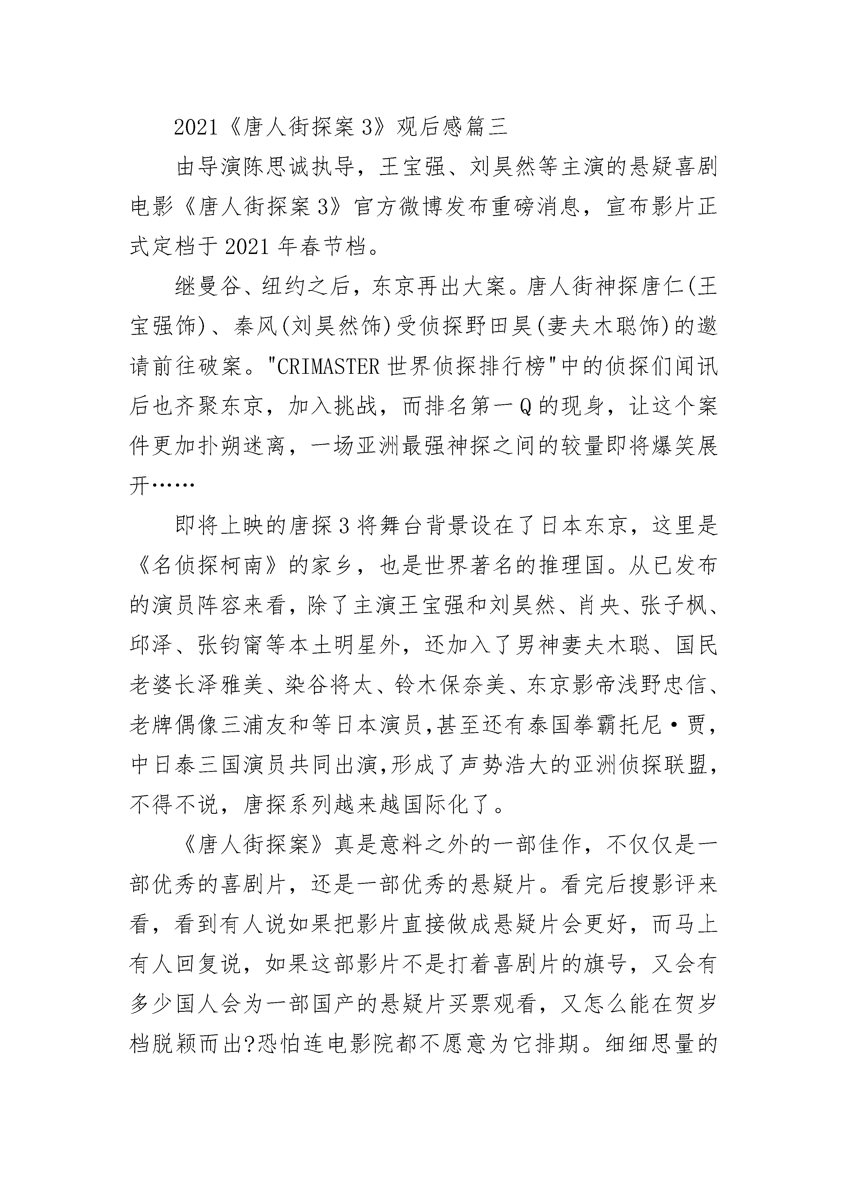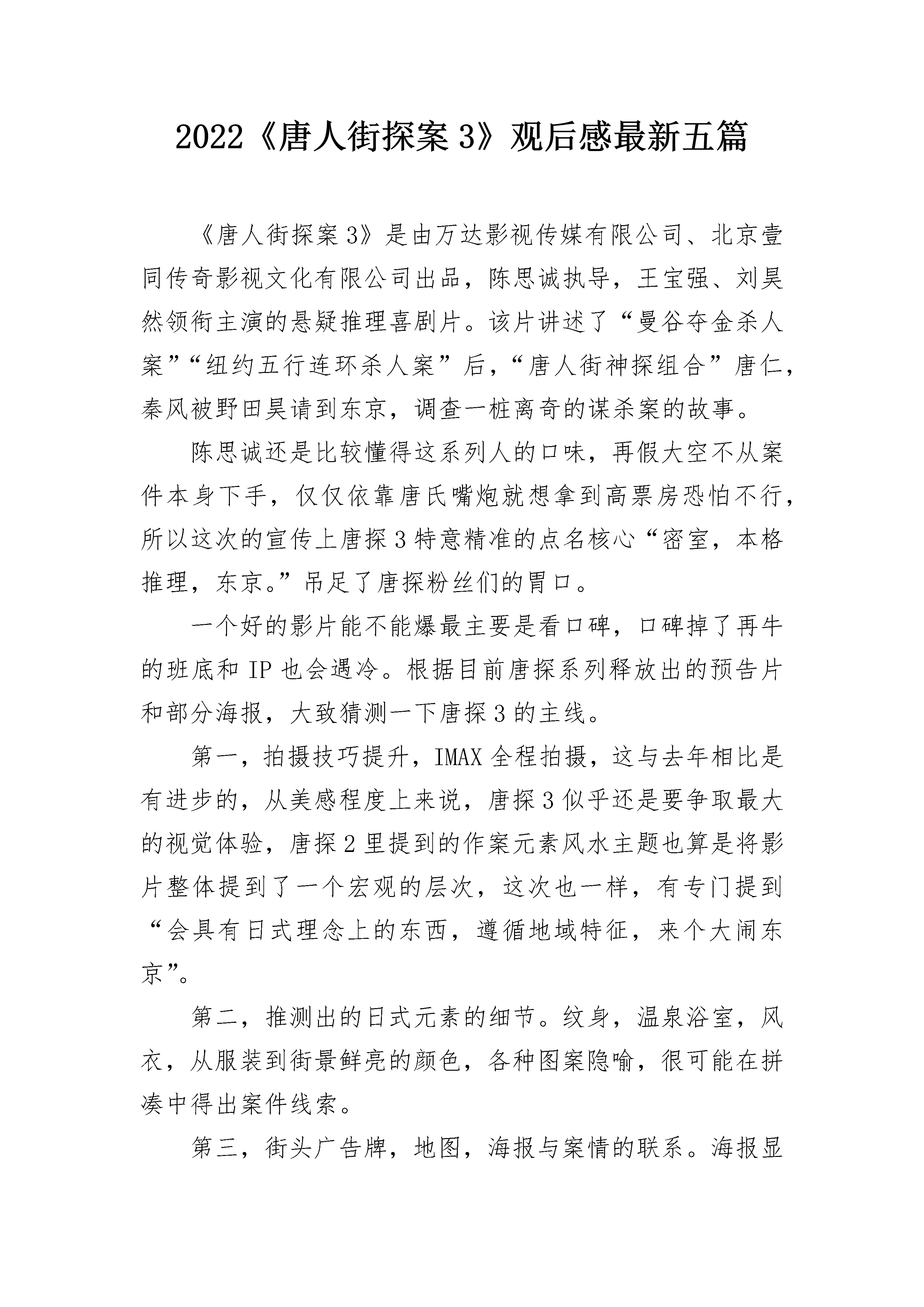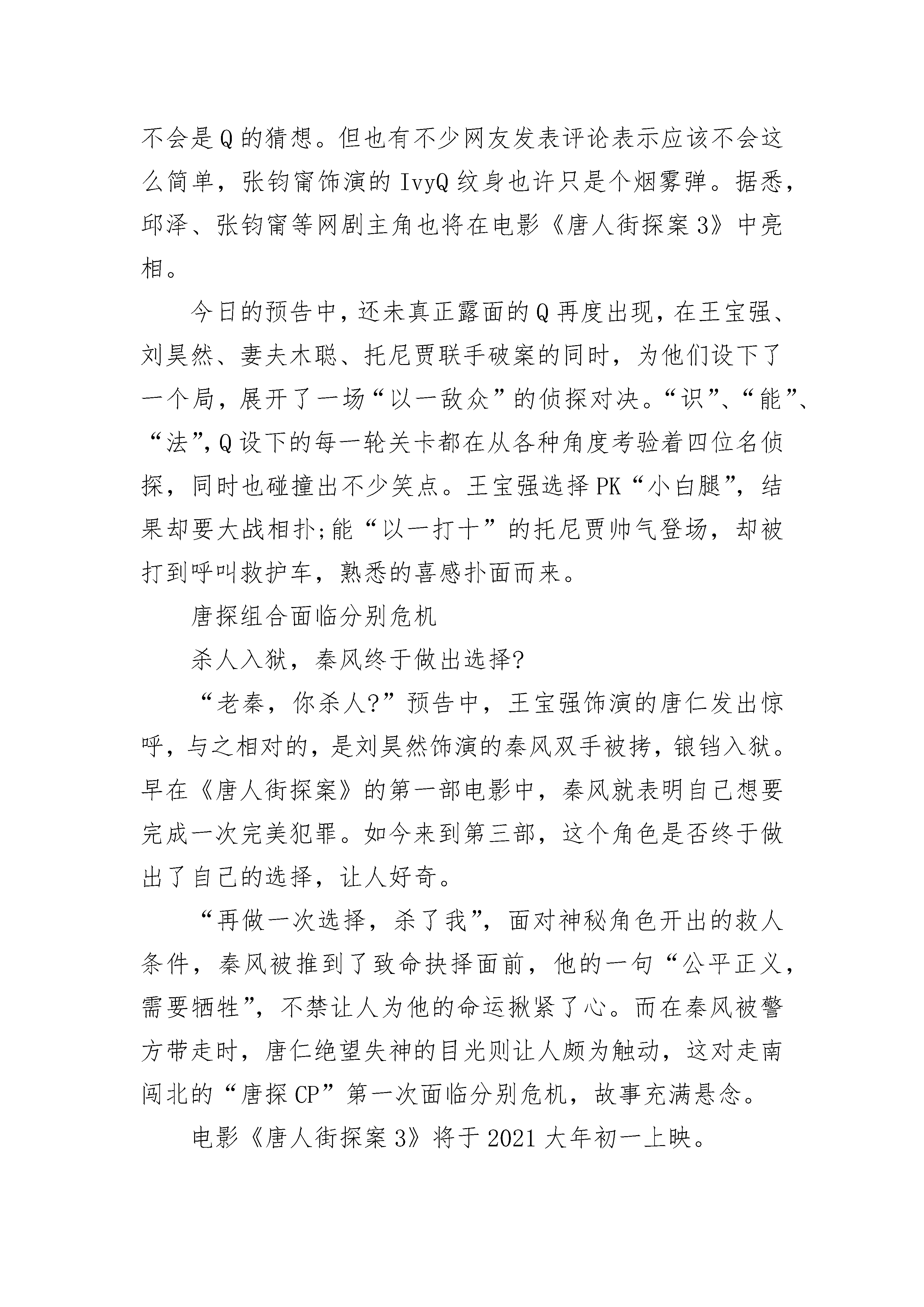 2022《唐人街探案3》观后感最新五篇《唐人街探案3》是由万达影视传媒有限公司、北京壹同传奇影视文化有限公司出品,陈思诚执导,王宝强、刘昊然领衔主演的悬疑推理喜剧片。该片讲述了“曼谷夺金杀人案”“纽约五行连环杀人案”后,“唐人街神探组合”唐仁,秦风被野田昊请到东京,调查一桩离奇的谋杀案的故事。陈思诚还是比较懂得这系列人的口味,再假大空不从案件本身下手,仅仅依靠唐氏嘴炮就想拿到高票房恐怕不行,所以这次的宣传上唐探3特意精准的点名核心“密室,本格推理,东京。”吊足了唐探粉丝们的胃口。一个好的影片能不能爆最主要是看口碑,口碑掉了再牛的班底和IP也会遇冷。根据目前唐探系列释放出的预告片和部分海报,大致猜测一下唐探3的主线。第一,拍摄技巧提升,IMAX全程拍摄,这与去年相比是有进步的,从美感程度上来说,唐探3似乎还是要争取最大的视觉体验,唐探2里提到的作案元素风水主题也算是将影片整体提到了一个宏观的层次,这次也一样,有专门提到“会具有日式理念上的东西,遵循地域特征,来个大闹东京”。第二,推测出的日式元素的细节。纹身,温泉浴室,风衣,从服装到街景鲜亮的颜色,各种图案隐喻,很可能在拼凑中得出案件线索。第三,街头广告牌,地图,海报与案情的联系。海报显示秦风和唐仁拿着一张大大的地图,这不得不想到这个地图在案件里的重要性,还有最开始释出的街头广告牌里,将每个人物都做了一张个人广告牌,必然暗藏玄机。就连最后的唐人街探案几个字也戏剧般的做在了广告牌上。第四,CRIMASTER世界侦探排行榜中的人物陆续现身,这也是一直以来挖的最大的坑,这个春节相比是必须要填上了,排名第一的Q即将现身,这个预告也安排了。所以会出现新的矛盾点碰撞,还是会选择强强合作,如果Q设定为终极反派,那么野田昊召集其他人现身,就回成了圈内斗殴,这体量和世界观就一下小了,所以不大可能是反派,那么就是强强联手,共同对抗强敌,这么看来,敌人要足够强大,他是日本人,所以擅长本格作案,他又是朋友,想揭开他的面具,需要在很多细节上找线索。第五,场面更大,导演提到请了相当多的群众演员,街头戏该是以人为本了。虽是大场面戏码,但看到街头开卡丁车,洒纸币,就猜到了不会太血腥,唐探系列最终还是要照顾春节档的喜庆,国情民心,回是大团圆吧。2021《唐人街探案3》观后感篇二Q是《唐探》系列埋下的一个重大悬念,能力超强却又身份成谜,一直稳居“CRIMASTER世界名侦探排行榜”的榜首,引来了观众的诸多猜测。随着《唐探》网剧的热播,Q的身份则露出了更多线索。网剧昨天刚刚播出完第二个故事《玫瑰的名字》,结尾,伴随着邱泽饰演的林默回溯记忆,张钧甯饰演的Ivy耳后笑脸纹身慢慢变成Q,引发了Ivy会不会是Q的猜想。但也有不少网友发表评论表示应该不会这么简单,张钧甯饰演的IvyQ纹身也许只是个烟雾弹。据悉,邱泽、张钧甯等网剧主角也将在电影《唐人街探案3》中亮相。今日的预告中,还未真正露面的Q再度出现,在王宝强、刘昊然、妻夫木聪、托尼贾联手破案的同时,为他们设下了一个局,展开了一场“以一敌众”的侦探对决。“识”、“能”、“法”,Q设下的每一轮关卡都在从各种角度考验着四位名侦探,同时也碰撞出不少笑点。王宝强选择PK“小白腿”,结果却要大战相扑;能“以一打十”的托尼贾帅气登场,却被打到呼叫救护车,熟悉的喜感扑面而来。唐探组合面临分别危机杀人入狱,秦风终于做出选择?“老秦,你杀人?”预告中,王宝强饰演的唐仁发出惊呼,与之相对的,是刘昊然饰演的秦风双手被拷,锒铛入狱。早在《唐人街探案》的第一部电影中,秦风就表明自己想要完成一次完美犯罪。如今来到第三部,这个角色是否终于做出了自己的选择,让人好奇。“再做一次选择,杀了我”,面对神秘角色开出的救人条件,秦风被推到了致命抉择面前,他的一句“公平正义,需要牺牲”,不禁让人为他的命运揪紧了心。而在秦风被警方带走时,唐仁绝望失神的目光则让人颇为触动,这对走南闯北的“唐探CP”第一次面临分别危机,故事充满悬念。电影《唐人街探案3》将于2021大年初一上映。2021《唐人街探案3》观后感篇三由导演陈思诚执导,王宝强、刘昊然等主演的悬疑喜剧电影《唐人街探案3》官方微博发布重磅消息,宣布影片正式定档于2021年春节档。继曼谷、纽约之后,东京再出大案。唐人街神探唐仁(王宝强饰)、秦风(刘昊然饰)受侦探野田昊(妻夫木聪饰)的邀请前往破案。"CRIMASTER世界侦探排行榜"中的侦探们闻讯后也齐聚东京,加入挑战,而排名第一Q的现身,让这个案件更加扑朔迷离,一场亚洲最强神探之间的较量即将爆笑展开……即将上映的唐探3将舞台背景设在了日本东京,这里是《名侦探柯南》的家乡,也是世界著名的推理国。从已发布的演员阵容来看,除了主演王宝强和刘昊然、肖央、张子枫、邱泽、张钧甯等本土明星外,还加入了男神妻夫木聪、国民老婆长