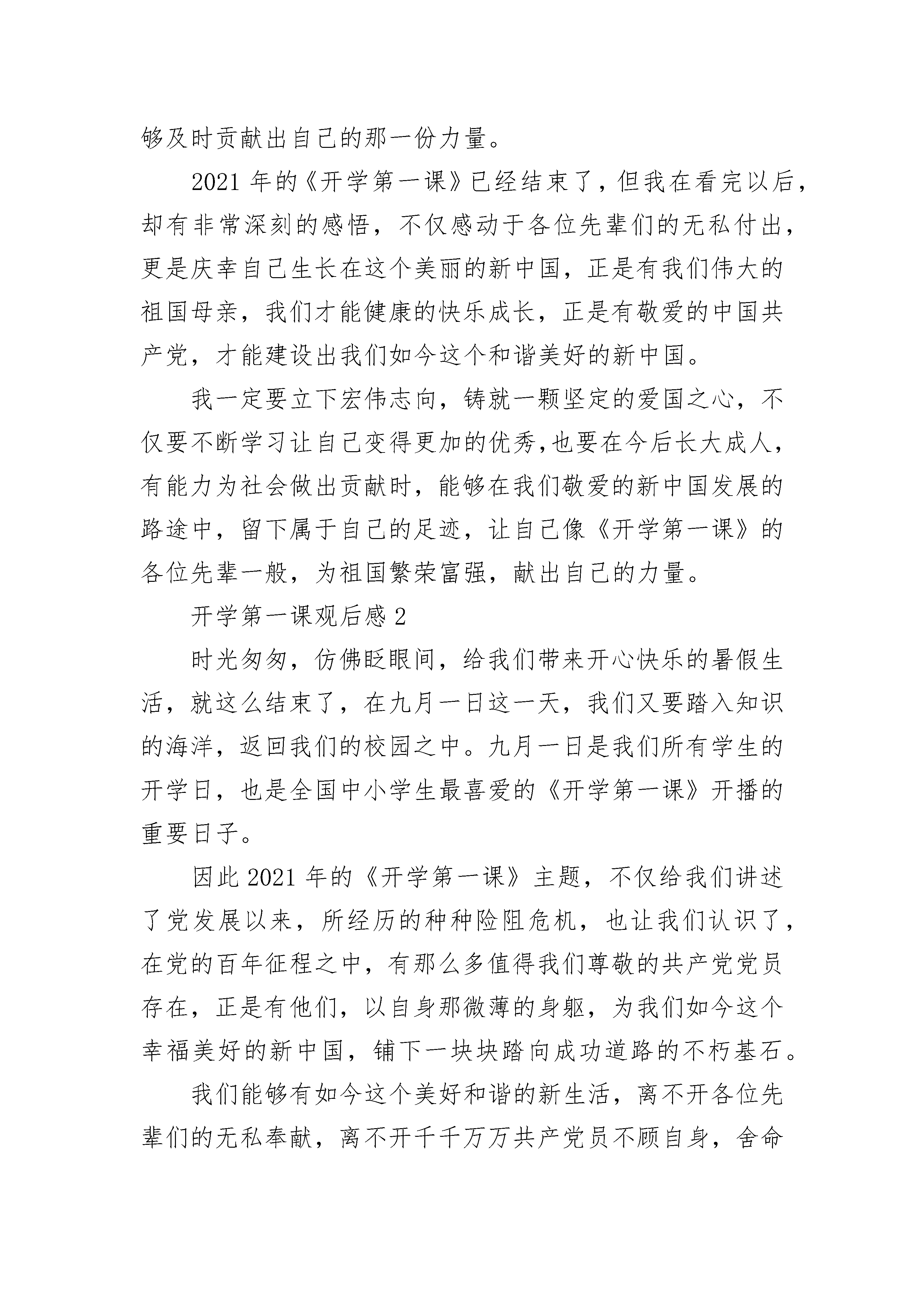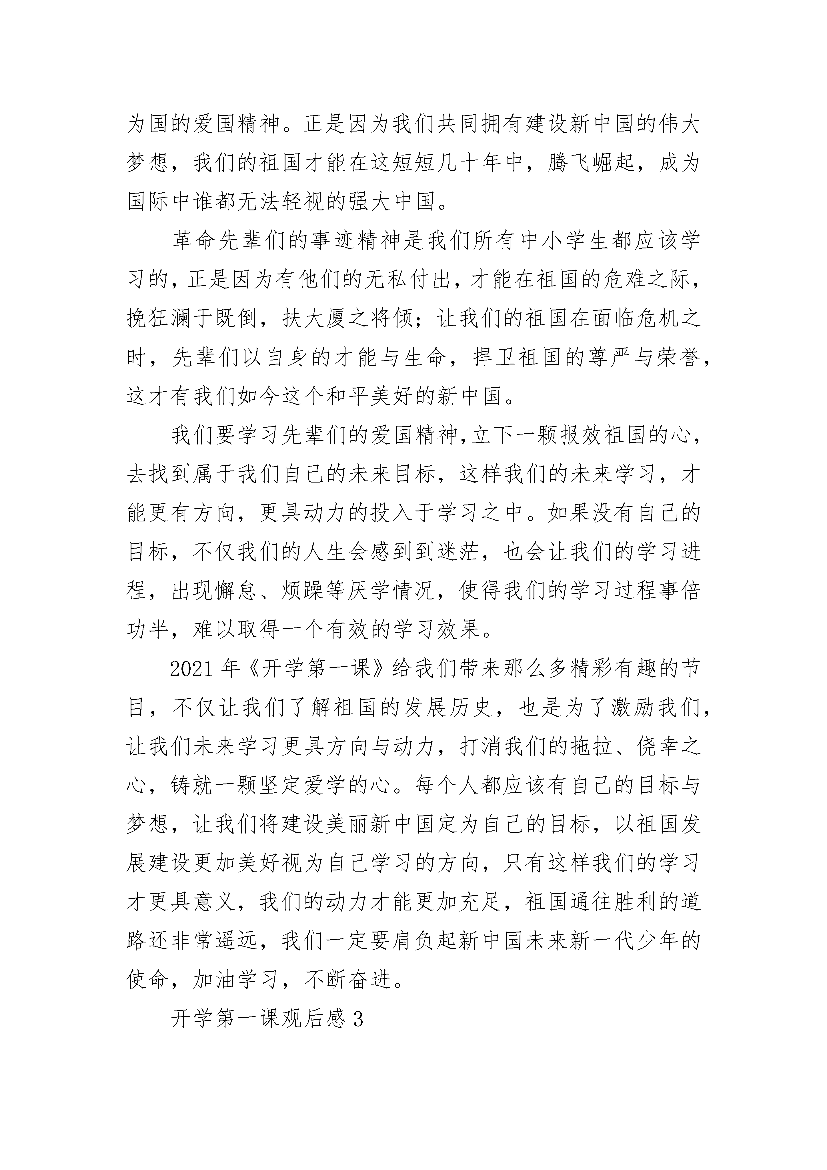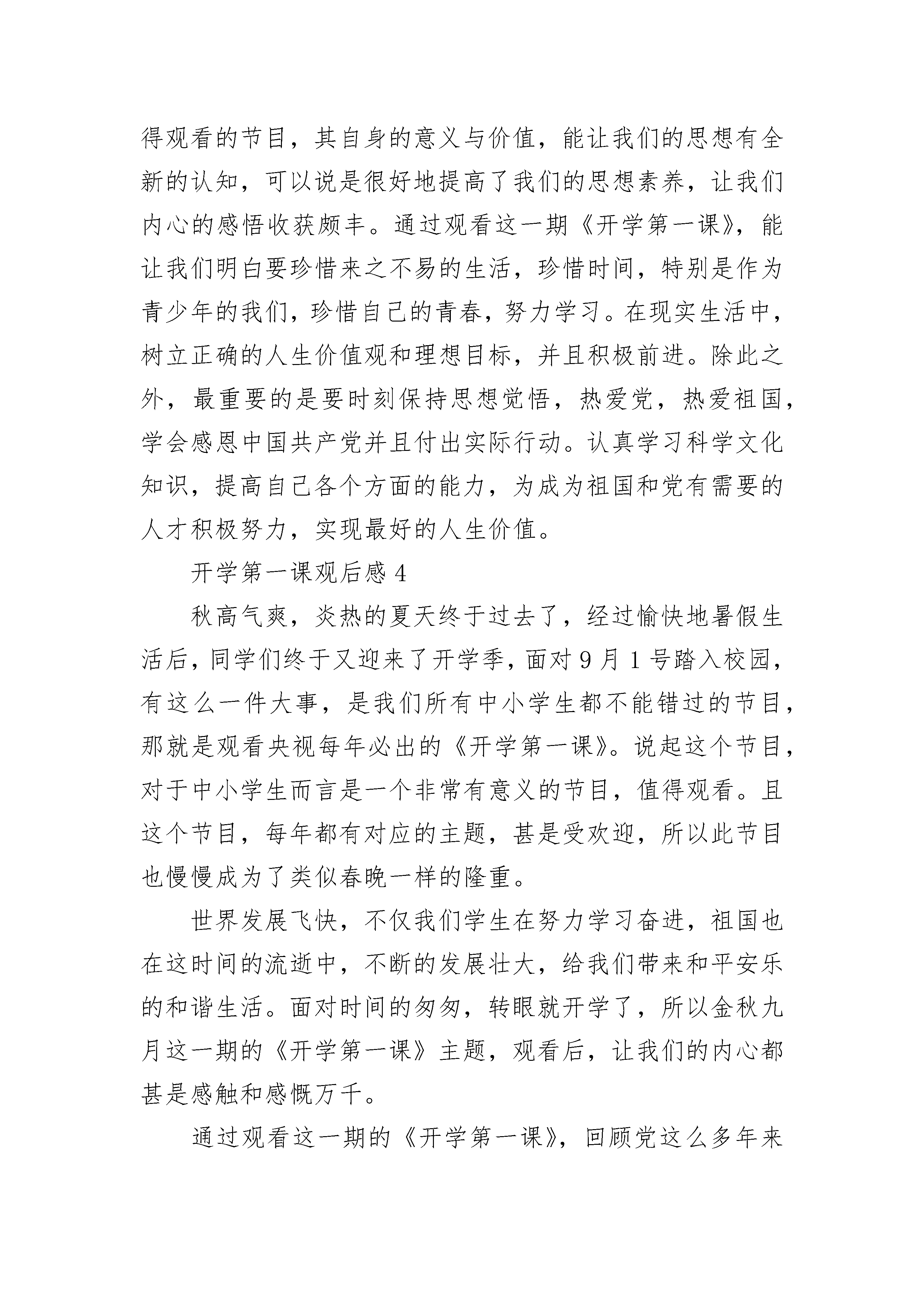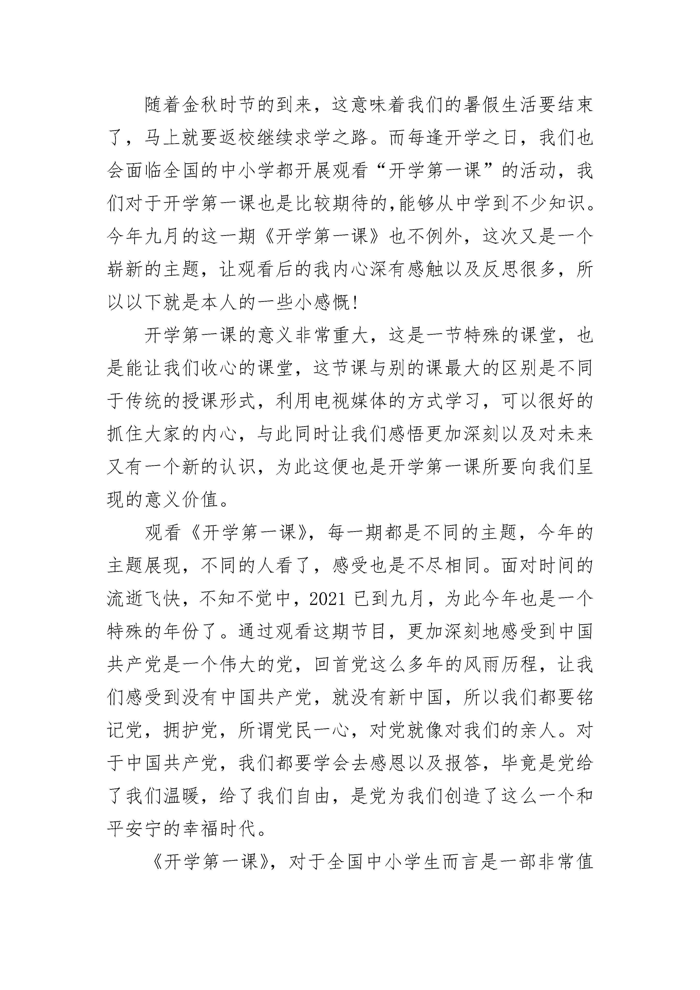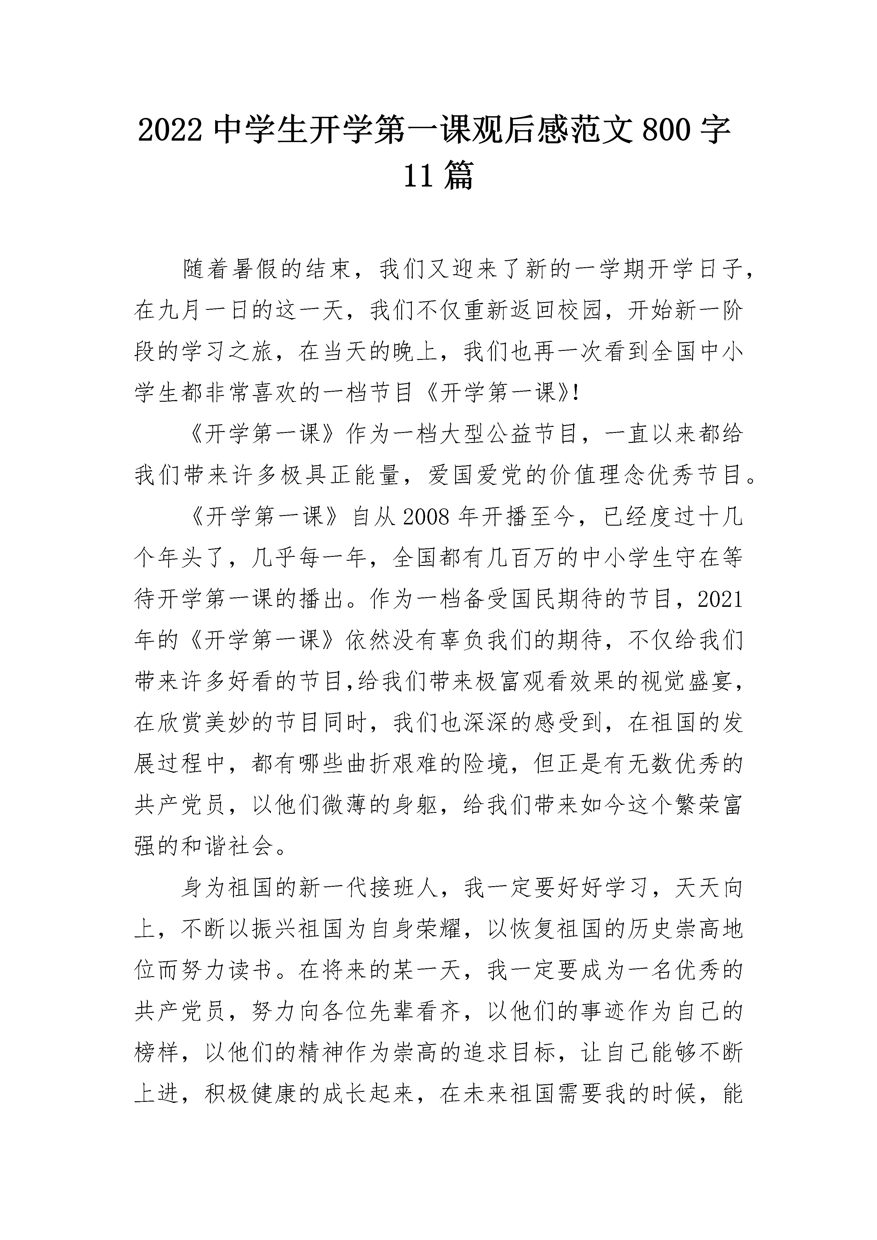 2022中学生开学第一课观后感范文800字11篇随着暑假的结束,我们又迎来了新的一学期开学日子,在九月一日的这一天,我们不仅重新返回校园,开始新一阶段的学习之旅,在当天的晚上,我们也再一次看到全国中小学生都非常喜欢的一档节目《开学第一课》!《开学第一课》作为一档大型公益节目,一直以来都给我们带来许多极具正能量,爱国爱党的价值理念优秀节目。《开学第一课》自从2008年开播至今,已经度过十几个年头了,几乎每一年,全国都有几百万的中小学生守在等待开学第一课的播出。作为一档备受国民期待的节目,2021年的《开学第一课》依然没有辜负我们的期待,不仅给我们带来许多好看的节目,给我们带来极富观看效果的视觉盛宴,在欣赏美妙的节目同时,我们也深深的感受到,在祖国的发展过程中,都有哪些曲折艰难的险境,但正是有无数优秀的共产党员,以他们微薄的身躯,给我们带来如今这个繁荣富强的和谐社会。身为祖国的新一代接班人,我一定要好好学习,天天向上,不断以振兴祖国为自身荣耀,以恢复祖国的历史崇高地位而努力读书。在将来的某一天,我一定要成为一名优秀的共产党员,努力向各位先辈看齐,以他们的事迹作为自己的榜样,以他们的精神作为崇高的追求目标,让自己能够不断上进,积极健康的成长起来,在未来祖国需要我的时候,能够及时贡献出自己的那一份力量。2021年的《开学第一课》已经结束了,但我在看完以后,却有非常深刻的感悟,不仅感动于各位先辈们的无私付出,更是庆幸自己生长在这个美丽的新中国,正是有我们伟大的祖国母亲,我们才能健康的快乐成长,正是有敬爱的中国共产党,才能建设出我们如今这个和谐美好的新中国。我一定要立下宏伟志向,铸就一颗坚定的爱国之心,不仅要不断学习让自己变得更加的优秀,也要在今后长大成人,有能力为社会做出贡献时,能够在我们敬爱的新中国发展的路途中,留下属于自己的足迹,让自己像《开学第一课》的各位先辈一般,为祖国繁荣富强,献出自己的力量。开学第一课观后感2时光匆匆,仿佛眨眼间,给我们带来开心快乐的暑假生活,就这么结束了,在九月一日这一天,我们又要踏入知识的海洋,返回我们的校园之中。九月一日是我们所有学生的开学日,也是全国中小学生最喜爱的《开学第一课》开播的重要日子。因此2021年的《开学第一课》主题,不仅给我们讲述了党发展以来,所经历的种种险阻危机,也让我们认识了,在党的百年征程之中,有那么多值得我们尊敬的共产党党员存在,正是有他们,以自身那微薄的身躯,为我们如今这个幸福美好的新中国,铺下一块块踏向成功道路的不朽基石。我们能够有如今这个美好和谐的新生活,离不开各位先辈们的无私奉献,离不开千千万万共产党员不顾自身,舍命为国的爱国精神。正是因为我们共同拥有建设新中国的伟大梦想,我们的祖国才能在这短短几十年中,腾飞崛起,成为国际中谁都无法轻视的强大中国。革命先辈们的事迹精神是我们所有中小学生都应该学习的,正是因为有他们的无私付出,才能在祖国的危难之际,挽狂澜于既倒,扶大厦之将倾;让我们的祖国在面临危机之时,先辈们以自身的才能与生命,捍卫祖国的尊严与荣誉,这才有我们如今这个和平美好的新中国。我们要学习先辈们的爱国精神,立下一颗报效祖国的心,去找到属于我们自己的未来目标,这样我们的未来学习,才能更有方向,更具动力的投入于学习之中。如果没有自己的目标,不仅我们的人生会感到到迷茫,也会让我们的学习进程,出现懈怠、烦躁等厌学情况,使得我们的学习过程事倍功半,难以取得一个有效的学习效果。2021年《开学第一课》给我们带来那么多精彩有趣的节目,不仅让我们了解祖国的发展历史,也是为了激励我们,让我们未来学习更具方向与动力,打消我们的拖拉、侥幸之心,铸就一颗坚定爱学的心。每个人都应该有自己的目标与梦想,让我们将建设美丽新中国定为自己的目标,以祖国发展建设更加美好视为自己学习的方向,只有这样我们的学习才更具意义,我们的动力才能更加充足,祖国通往胜利的道路还非常遥远,我们一定要肩负起新中国未来新一代少年的使命,加油学习,不断奋进。开学第一课观后感3随着金秋时节的到来,这意味着我们的暑假生活要结束了,马上就要返校继续求学之路。而每逢开学之日,我们也会面临全国的中小学都开展观看“开学第一课”的活动,我们对于开学第一课也是比较期待的,能够从中学到不少知识。今年九月的这一期《开学第一课》也不例外,这次又是一个崭新的主题,让观看后的我内心深有感触以及反思很多,所以以下就是本人的一些小感慨!开学第一课的意义非常重大,这是一节特殊的课堂,也是能让我们收心的课堂,这节课与别的课最大的区别是不同于传统的授课形式,利用电视媒体的方式学习,可以很好的抓住大家的内心,与此同时让我们感悟更加深刻以及对未来又有一个新的认识,为此这便也是开学第一课所要向我们呈现的意义价值。观看《开学第一课》,每一期都是不同的主题,今年的主题