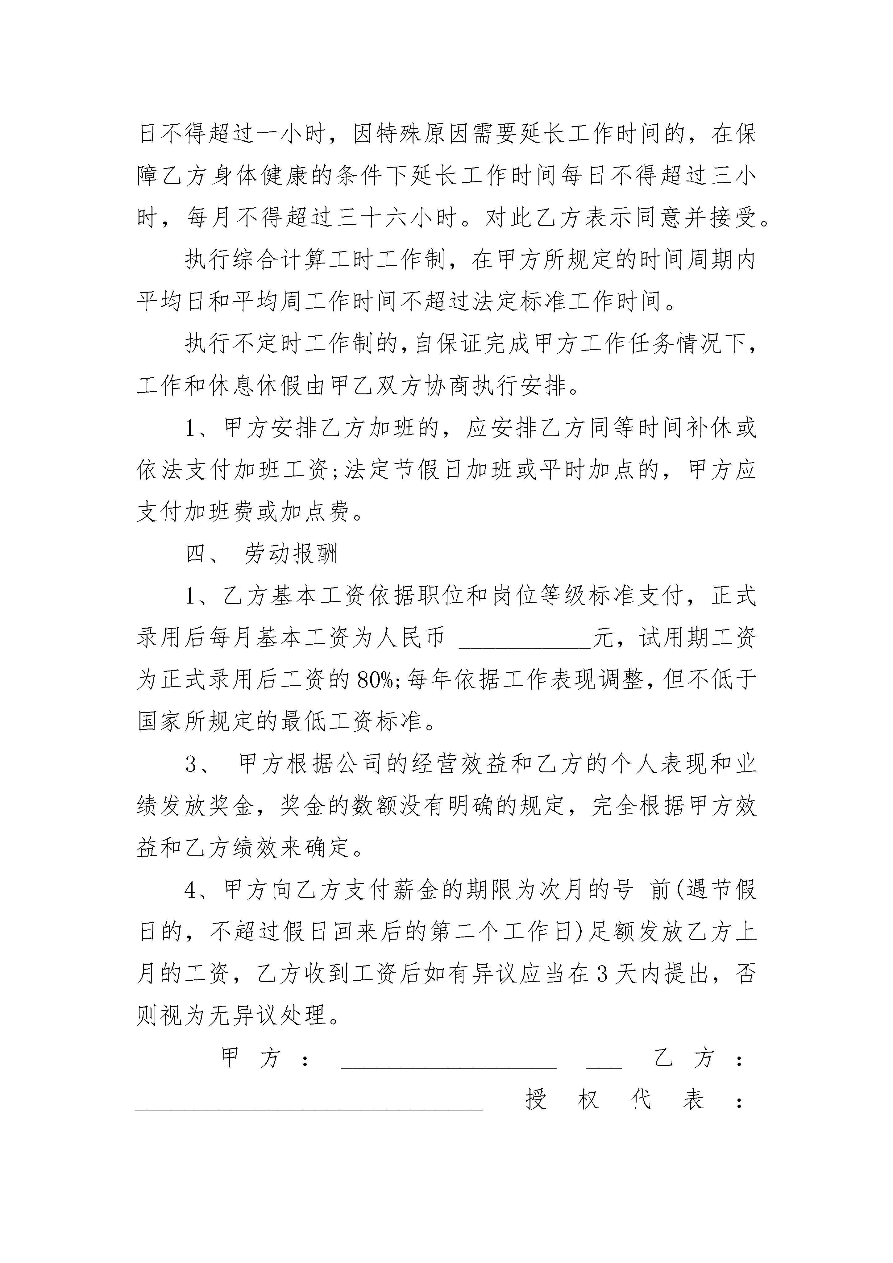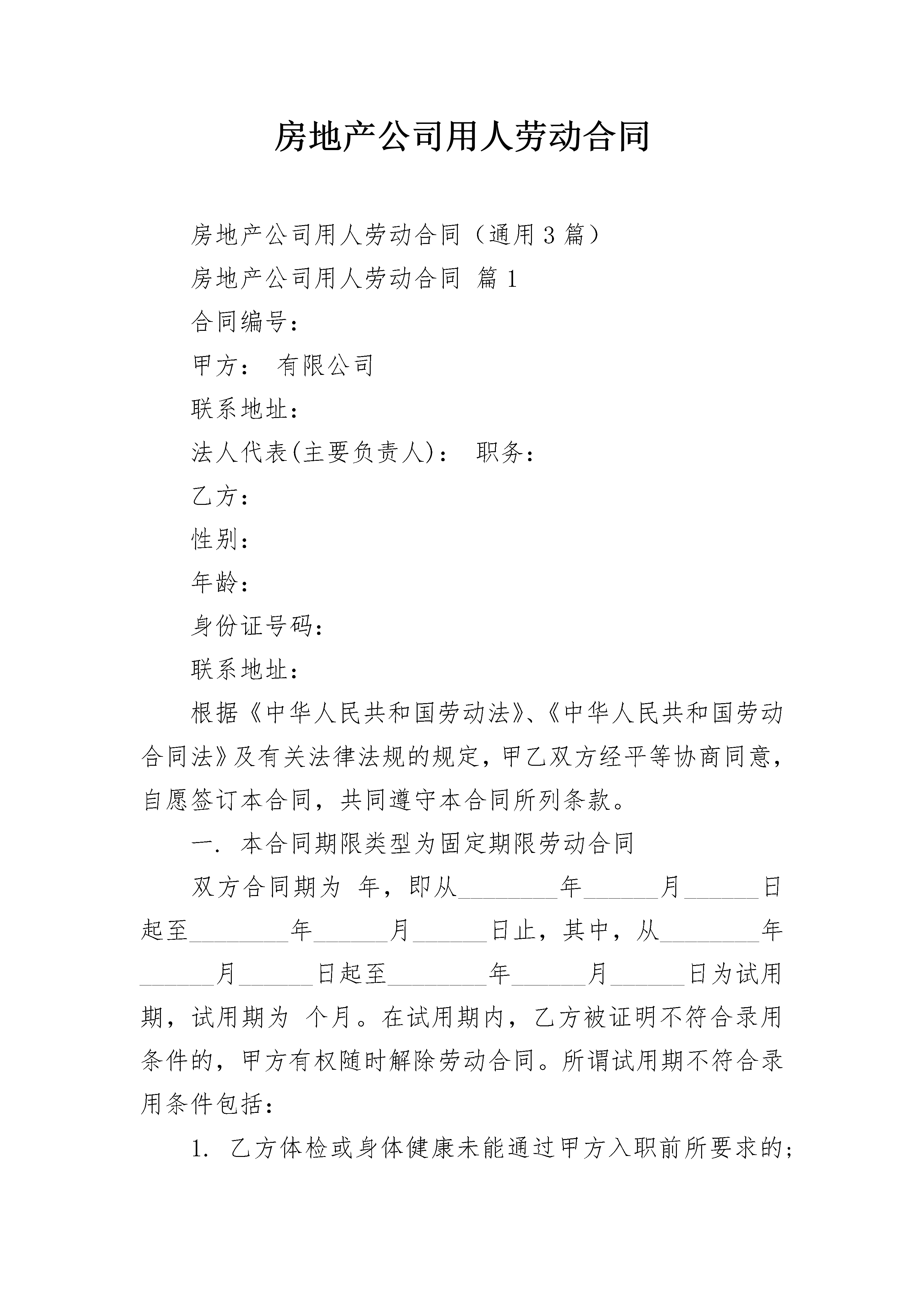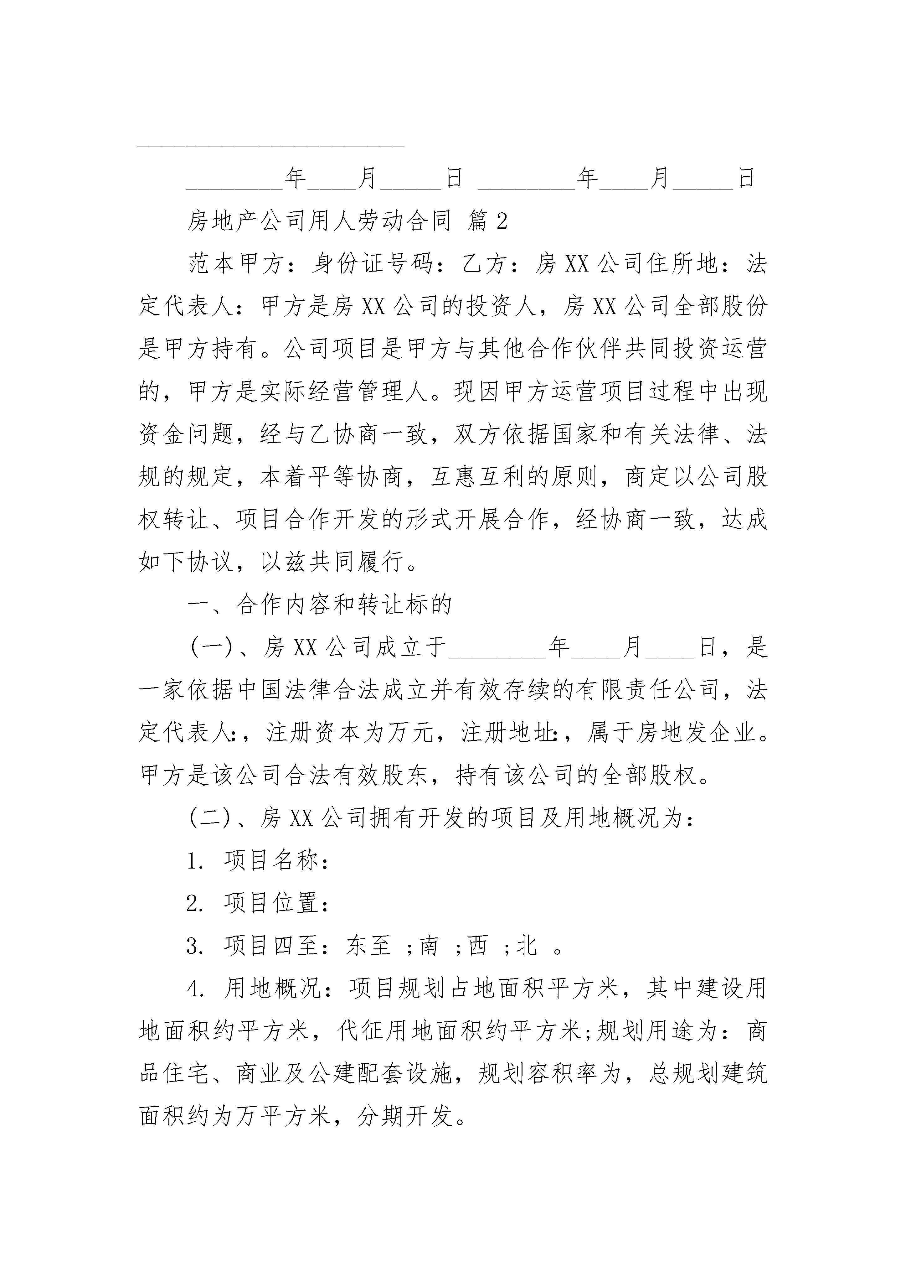 房地产公司用人劳动合同房地产公司用人劳动合同(通用3篇)房地产公司用人劳动合同篇1合同编号:甲方:有限公司联系地址:法人代表(主要负责人):职务:乙方:性别:年龄:身份证号码:联系地址:根据《中华人民共和国劳动法》、《中华人民共和国劳动合同法》及有关法律法规的规定,甲乙双方经平等协商同意,自愿签订本合同,共同遵守本合同所列条款。一.本合同期限类型为固定期限劳动合同双方合同期为年,即从________年______月______日起至________年______月______日止,其中,从________年______月______日起至________年______月______日为试用期,试用期为个月。在试用期内,乙方被证明不符合录用条件的,甲方有权随时解除劳动合同。所谓试用期不符合录用条件包括:1.乙方体检或身体健康未能通过甲方入职前所要求的;2.乙方在日前未能完备所规定的手续的;3.乙方不能达到所担任岗位的绩效指标或者相应的要求的;4.乙方在试用期内请假次数超过5天或者迟到早退超过6次的;5.乙方的背景调查或者在履历中发现有弄虚作假行为的;6.乙方顶撞上司或在工作期间发生殴斗行为的;或者其他任何主管认为乙方不能符合该职位的要求的;二、工作内容1、乙方同意根据甲方工作需要,在____________部门,担任_________岗位(工种)工作,工作地点为:,其主要工作职责见其“岗位职责说明书”。2、甲方根据工作经营需要,以及乙方的实际能力(专业、工作、体力)可作适当临时性调整是不对本合同相应条款作出修改的调整。乙方根据甲方安排的工作内容和要求,按质、按量、按时地完成任务并接受甲方的考核。如果甲方欲与乙方作出非临时性的调整,将同乙方协商并达成一致意见后修订本合同条款中的全部或者部分内容才予以实施,对此乙方表示同意并接受。三、甲方安排乙方执行___________工作制。执行标准工作制的,甲方安排乙方每日工作时间不超过八小时,平均每周不超过四十小时。甲方保证乙方每周至少休息1日。甲方根据工作需要,可以延长工作时间,一般每日不得超过一小时,因特殊原因需要延长工作时间的,在保障乙方身体健康的条件下延长工作时间每日不得超过三小时,每月不得超过三十六小时。对此乙方表示同意并接受。执行综合计算工时工作制,在甲方所规定的时间周期内平均日和平均周工作时间不超过法定标准工作时间。执行不定时工作制的,自保证完成甲方工作任务情况下,工作和休息休假由甲乙双方协商执行安排。1、甲方安排乙方加班的,应安排乙方同等时间补休或依法支付加班工资;法定节假日加班或平时加点的,甲方应支付加班费或加点费。四、劳动报酬1、乙方基本工资依据职位和岗位等级标准支付,正式录用后每月基本工资为人民币___________元,试用期工资为正式录用后工资的80%;每年依据工作表现调整,但不低于国家所规定的最低工资标准。3、甲方根据公司的经营效益和乙方的个人表现和业绩发放奖金,奖金的数额没有明确的规定,完全根据甲方效益和乙方绩效来确定。4、甲方向乙方支付薪金的期限为次月的号前(遇节假日的,不超过假日回来后的第二个工作日)足额发放乙方上月的工资,乙方收到工资后如有异议应当在3天内提出,否则视为无异议处理。甲方:_____________________乙方:_____________________________授权代表:______________________________年____月_____日________年____月_____日房地产公司用人劳动合同篇2范本甲方:身份证号码:乙方:房XX公司住所地:法定代表人:甲方是房XX公司的投资人,房XX公司全部股份是甲方持有。公司项目是甲方与其他合作伙伴共同投资运营的,甲方是实际经营管理人。现因甲方运营项目过程中出现资金问题,经与乙协商一致,双方依据国家和有关法律、法规的规定,本着平等协商,互惠互利的原则,商定以公司股权转让、项目合作开发的形式开展合作,经协商一致,达成如下协议,以兹共同履行。一、合作内容和转让标的(一)、房XX公司成立于________年____月____日,是一家依据中国法律合法成立并有效存续的有限责任公司,法定代表人:,注册资本为万元,注册地址:,属于房地发企业。甲方是该公司合法有效股东,持有该公司的全部股权。(二)、房XX公司拥有开发的项目及用地概况为:1.项目名称:2.项目位置:3.项目四至:东至;南;西;北。4.用地概况:项目规划占地面积平方米,其中建设用地面积约平方米,代征用地面积约平方米;规划用途为:商品住宅、商业及公建配套设施,规划容积率为,总规划建筑面积约为万平方米,分期开发。(1)一期(____区):项目名称为,规划占地面积约平方米,建设用地面积约平方米,容积率,规划用途为:(2)
