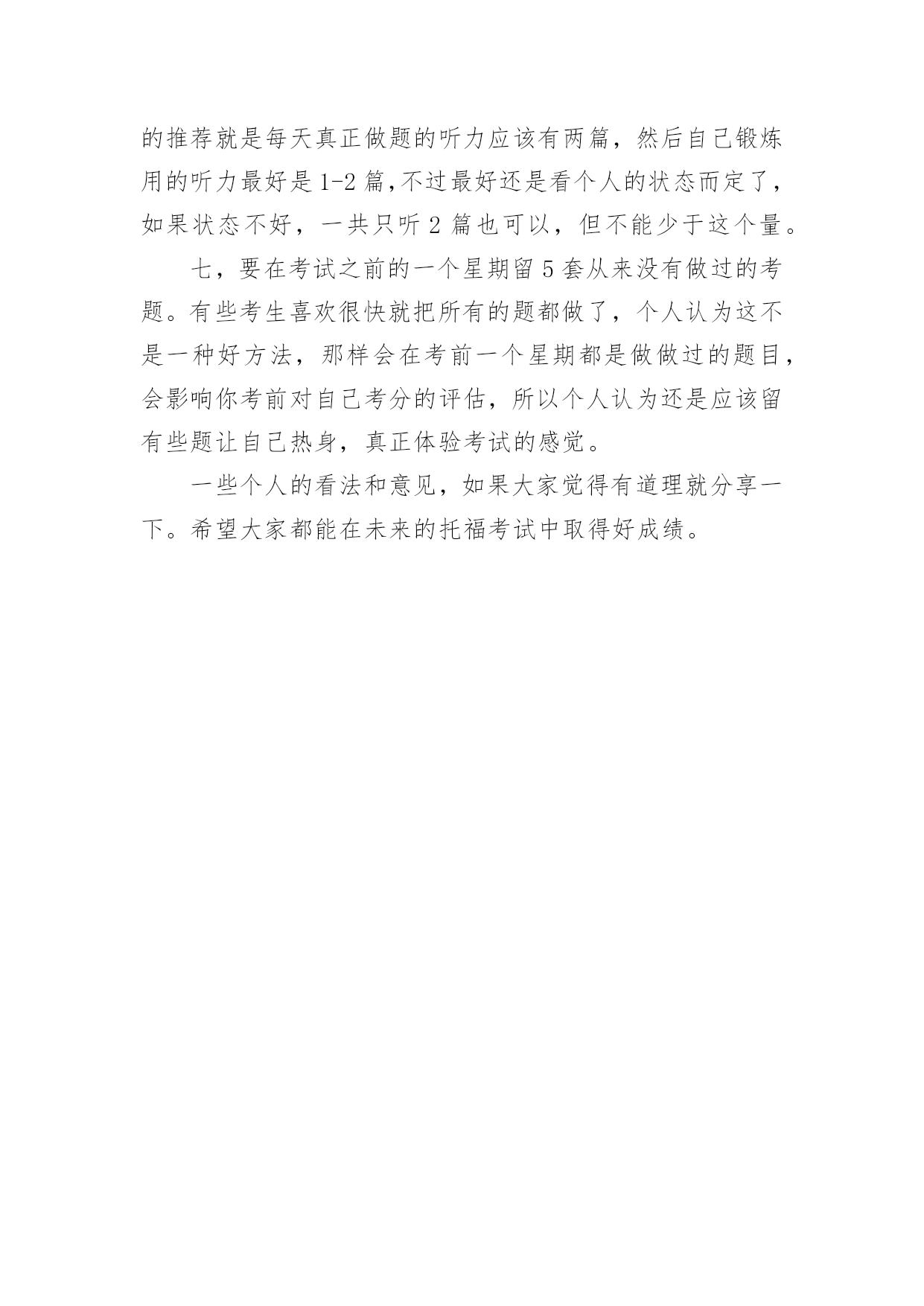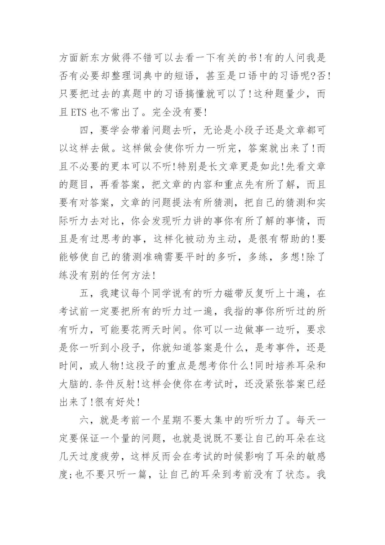 托福听力考试经验分享 托福听力考试经验分享怎么应对托福听力考试关于解答托福听力考试小建议,小编在文章中进行了简要说明。攻克托福听力的一些窍门:ETS明年准备出台的新托福也在一定的程度上加强了对考生的听力和口语的测试,而这两种测试难度的加强对中国学生来说无疑是当头一棒。所以,在这里我将我自己对托福听力的一些需要注意的问题罗列如下,与大家分享一下:一,千万记住听力没有窍门,即使有所谓的窍门也不过就是实战的经验!比如新东方的弦外之音,最近有很多朋友反映,对于98年之后的托福听力考试更本没有用!的确如此!唯一有用的只有对于美国教育制度和文章的背景知识的了解的那一小部分了!所以要考好托福听力首先要下定决心硬听!切记,从第一天复习托福就开始听力训练。二,练习过程中对于文章或段子听不懂是否应该硬听,至到听懂为止呢?否,千万不要这做,听3到5遍之后,若发现听不懂应马上看原文才是!但看过原文之后应反复听,直到听到关键词都能够大脑条件反射,既不用想也知道!记住!对于听力而言,反复听已听懂的要比听听不懂的重要的多!同时效果也好很多!因为当你听不懂而去翻原文时很少是应为单词不认识耳听不懂,大多是熟词但出现场合改变而已!三,对于托福小段子题中的短语,你一定要熟记,在这方面新东方做得不错可以去看一下有关的书!有的人问我是否有必要却整理词典中的短语,甚至是口语中的习语呢?否!只要把过去的真题中的习语搞懂就可以了!这种题量少,而且ETS也不常出了。完全没有要!四,要学会带着问题去听,无论是小段子还是文章都可以这样去做。这样做会使你听力一听完,答案就出来了!而且不必要的更本可以不听!特别是长文章更是如此!先看文章的题目,再看答案,把文章的内容和重点先有所了解,而且要有对答案,文章的问题提法有所猜测,把自己的猜测和实际听力去对比,你会发现听力讲的事你有所了解的事情,而且是有过思考的事,这样化被动为主动,是很有帮助的!要能够使自己的猜测准确需要平时的多听,多练,多想!除了练没有别的任何方法!五,我建议每个同学说有的听力磁带反复听上十遍,在考试前一定要把所有的听力过一遍,我指的事你所听过的所有听力,可能要花两天时间。你可以一边做事一边听,要求是你一听到小段子,你就知道答案是什么,是考事件,还是时间,或人物!这段子的重点是想考你什么!同时培养耳朵和大脑的.条件反射!这样会使你在考试时,还没紧张答案已经出来了!很有好处!六,就是考前一个星期不要太集中的听听力了。每天一定要保证一个量的问题,也就是说既不要让自己的耳朵在这几天过度疲劳,这样反而会在考试的时候影响了耳朵的敏感度;也不要只听一篇,让自己的耳朵到考前没有了状态。我的推荐就是每天真正做题的听力应该有两篇,然后自己锻炼用的听力最好是1-2篇,不过最好还是看个人的状态而定了,如果状态不好,一共只听2篇也可以,但不能少于这个量。七,要在考试之前的一个星期留5套从来没有做过的考题。有些考生喜欢很快就把所有的题都做了,个人认为这不是一种好方法,那样会在考前一个星期都是做做过的题目,会影响你考前对自己考分的评估,所以个人认为还是应该留有些题让自己热身,真正体验考试的感觉。一些个人的看法和意见,如果大家觉得有道理就分享一下。希望大家都能在未来的托福考试中取得好成绩。