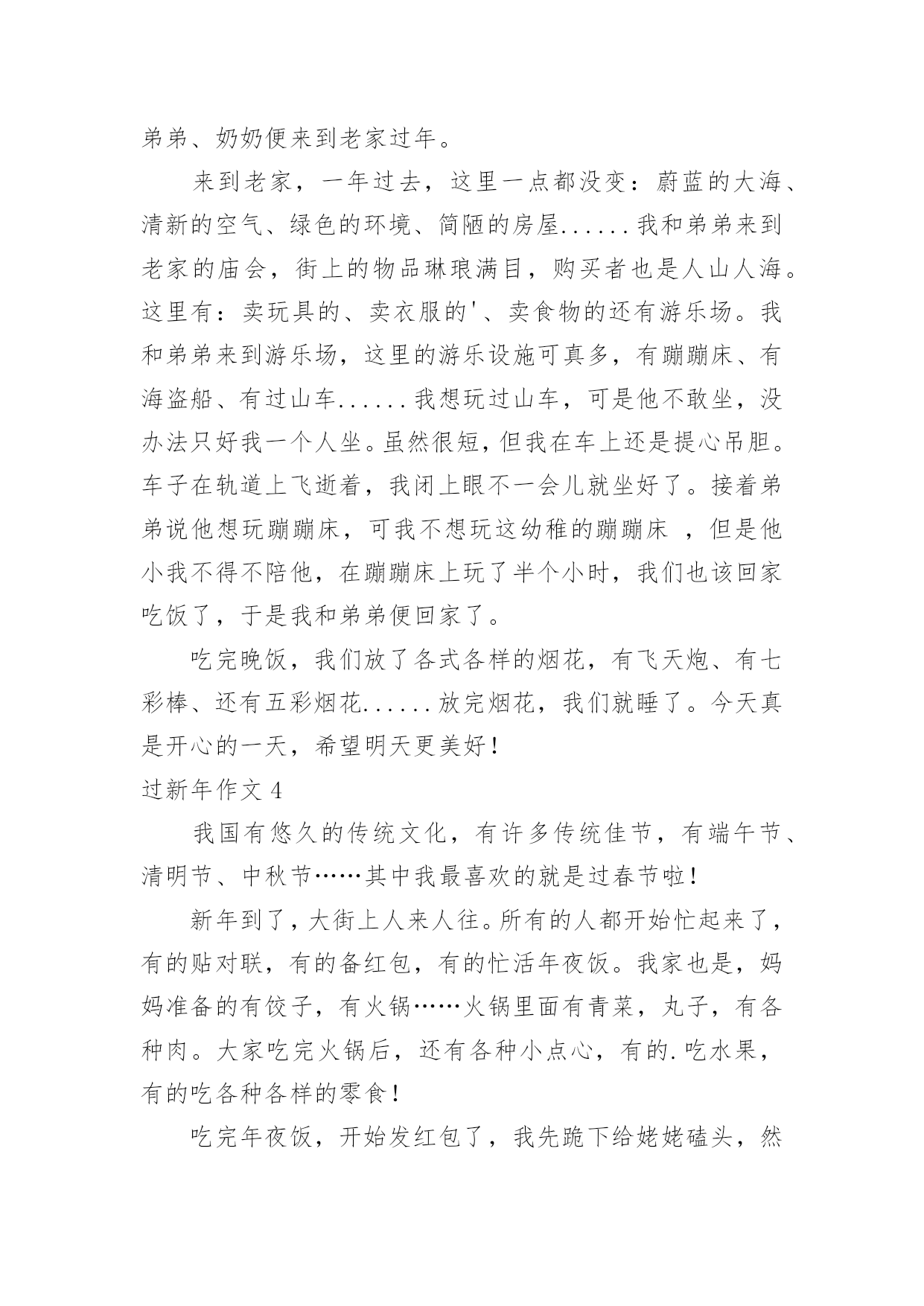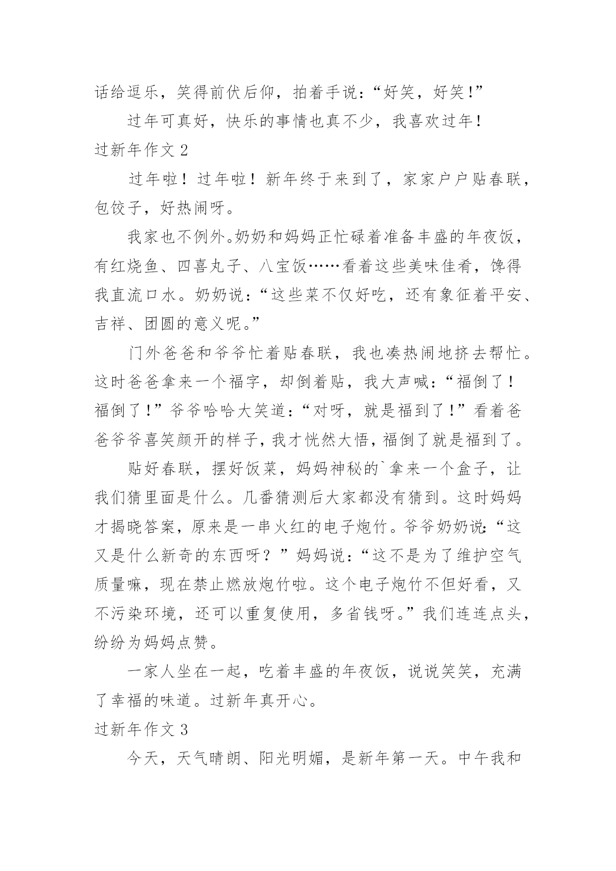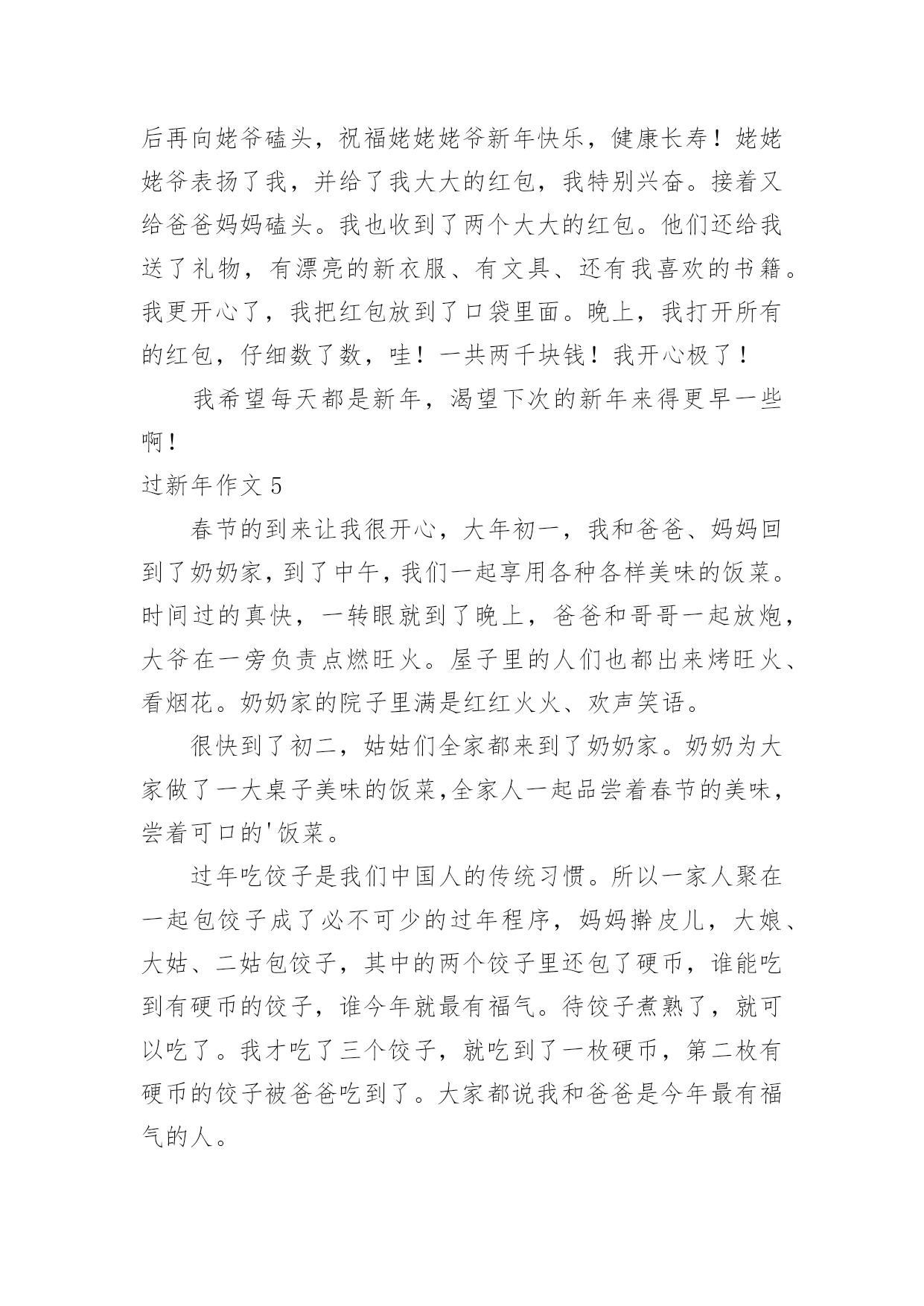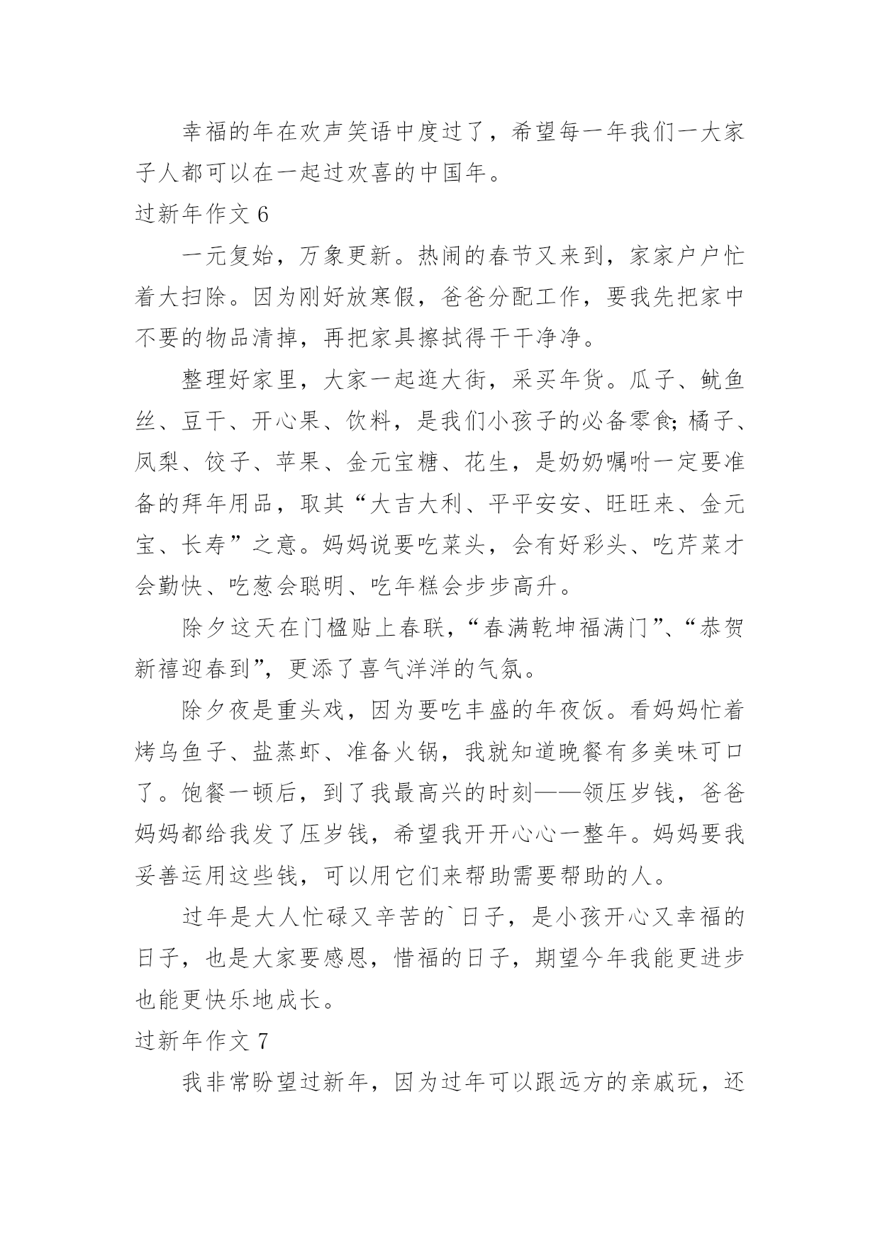 过新年作文 【荐】过新年作文在学习、工作或生活中,大家或多或少都会接触过作文吧,根据写作命题的特点,作文可以分为命题作文和非命题作文。作文的注意事项有许多,你确定会写吗?下面是小编为大家整理的过新年作文,仅供参考,希望能够帮助到大家。过新年作文1新年来到了,家家户户都放起了鞭炮,大街上人可真多,好热闹呀!在新年里属我最开心,快乐的事情也真不少!第一件事情是我最最快乐的'——放烟花。在过年前我就和爸爸一起来到买鞭炮的地方,各种各样的鞭炮一堆一堆整齐得摆放在一起,琳琅满目,让我看得眼花缭乱,每一样烟花都想买,最后东挑西拣,买下了我最喜欢的魔术弹和甩甩花。晚上我就着急地让爸爸赶紧和我一起放烟花,点燃导火线,“砰,砰,砰”,每一颗魔术弹中放出来的烟花都五光十色,在夜空中显得十分耀眼,十分漂亮,就像天女散花一样。第二件快乐事情就是吃团圆饭。今年爷爷奶奶、伯伯和姐姐们都到我家来吃团圆饭。大家欢聚在一起,边吃边说,我还和我姐姐一起看故事书、玩游戏,真开心啊!第三件快乐的事情当然就是看电视。在春节晚会节目中我最喜欢看小品了,每次看到小品节目,我都会被他们说的话给逗乐,笑得前伏后仰,拍着手说:“好笑,好笑!”过年可真好,快乐的事情也真不少,我喜欢过年!过新年作文2过年啦!过年啦!新年终于来到了,家家户户贴春联,包饺子,好热闹呀。我家也不例外。奶奶和妈妈正忙碌着准备丰盛的年夜饭,有红烧鱼、四喜丸子、八宝饭……看着这些美味佳肴,馋得我直流口水。奶奶说:“这些菜不仅好吃,还有象征着平安、吉祥、团圆的意义呢。”门外爸爸和爷爷忙着贴春联,我也凑热闹地挤去帮忙。这时爸爸拿来一个福字,却倒着贴,我大声喊:“福倒了!福倒了!”爷爷哈哈大笑道:“对呀,就是福到了!”看着爸爸爷爷喜笑颜开的样子,我才恍然大悟,福倒了就是福到了。贴好春联,摆好饭菜,妈妈神秘的`拿来一个盒子,让我们猜里面是什么。几番猜测后大家都没有猜到。这时妈妈才揭晓答案,原来是一串火红的电子炮竹。爷爷奶奶说:“这又是什么新奇的东西呀?”妈妈说:“这不是为了维护空气质量嘛,现在禁止燃放炮竹啦。这个电子炮竹不但好看,又不污染环境,还可以重复使用,多省钱呀。”我们连连点头,纷纷为妈妈点赞。一家人坐在一起,吃着丰盛的年夜饭,说说笑笑,充满了幸福的味道。过新年真开心。过新年作文3今天,天气晴朗、阳光明媚,是新年第一天。中午我和弟弟、奶奶便来到老家过年。来到老家,一年过去,这里一点都没变:蔚蓝的大海、清新的空气、绿色的环境、简陋的房屋......我和弟弟来到老家的庙会,街上的物品琳琅满目,购买者也是人山人海。这里有:卖玩具的、卖衣服的'、卖食物的还有游乐场。我和弟弟来到游乐场,这里的游乐设施可真多,有蹦蹦床、有海盗船、有过山车......我想玩过山车,可是他不敢坐,没办法只好我一个人坐。虽然很短,但我在车上还是提心吊胆。车子在轨道上飞逝着,我闭上眼不一会儿就坐好了。接着弟弟说他想玩蹦蹦床,可我不想玩这幼稚的蹦蹦床,但是他小我不得不陪他,在蹦蹦床上玩了半个小时,我们也该回家吃饭了,于是我和弟弟便回家了。吃完晚饭,我们放了各式各样的烟花,有飞天炮、有七彩棒、还有五彩烟花......放完烟花,我们就睡了。今天真是开心的一天,希望明天更美好!过新年作文4我国有悠久的传统文化,有许多传统佳节,有端午节、清明节、中秋节……其中我最喜欢的就是过春节啦!新年到了,大街上人来人往。所有的人都开始忙起来了,有的贴对联,有的备红包,有的忙活年夜饭。我家也是,妈妈准备的有饺子,有火锅……火锅里面有青菜,丸子,有各种肉。大家吃完火锅后,还有各种小点心,有的.吃水果,有的吃各种各样的零食!吃完年夜饭,开始发红包了,我先跪下给姥姥磕头,然后再向姥爷磕头,祝福姥姥姥爷新年快乐,健康长寿!姥姥姥爷表扬了我,并给了我大大的红包,我特别兴奋。接着又给爸爸妈妈磕头。我也收到了两个大大的红包。他们还给我送了礼物,有漂亮的新衣服、有文具、还有我喜欢的书籍。我更开心了,我把红包放到了口袋里面。晚上,我打开所有的红包,仔细数了数,哇!一共两千块钱!我开心极了!我希望每天都是新年,渴望下次的新年来得更早一些啊!过新年作文5春节的到来让我很开心,大年初一,我和爸爸、妈妈回到了奶奶家,到了中午,我们一起享用各种各样美味的饭菜。时间过的真快,一转眼就到了晚上,爸爸和哥哥一起放炮,大爷在一旁负责点燃旺火。屋子里的人们也都出来烤旺火、看烟花。奶奶家的院子里满是红红火火、欢声笑语。很快到了初二,姑姑们全家都来到了奶奶家。奶奶为大家做了一大桌子美味的饭菜,全家人一起品尝着春节的美味,尝着可口的'饭菜。过年吃饺子是我们中国人的传统习惯。所以一家人聚在一起包饺子成了必不可少的过年程序,妈妈擀皮儿,大娘、大姑、二姑包饺子,其中的两个饺子里还包了硬币,谁能吃到有硬币的饺子,谁今年