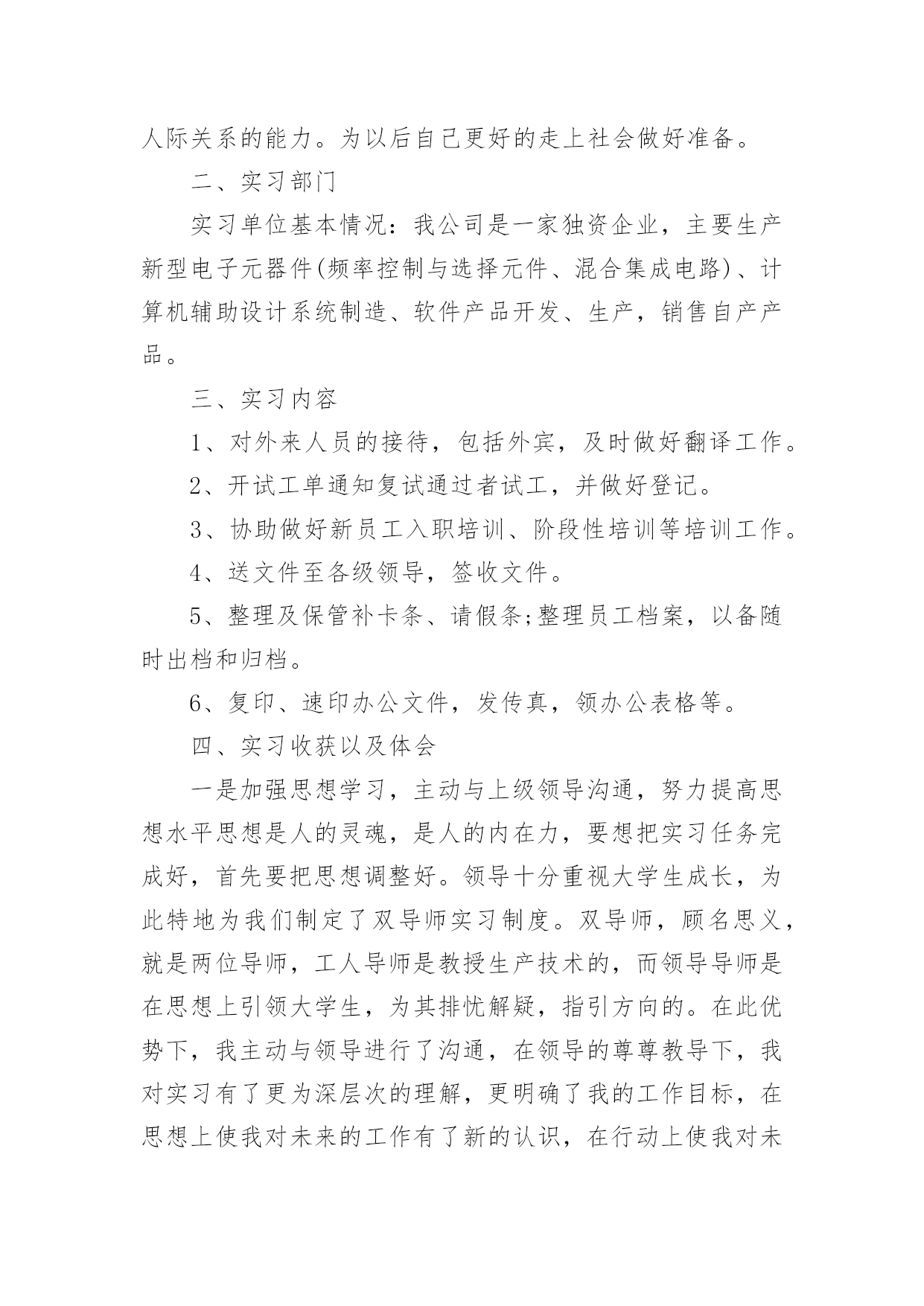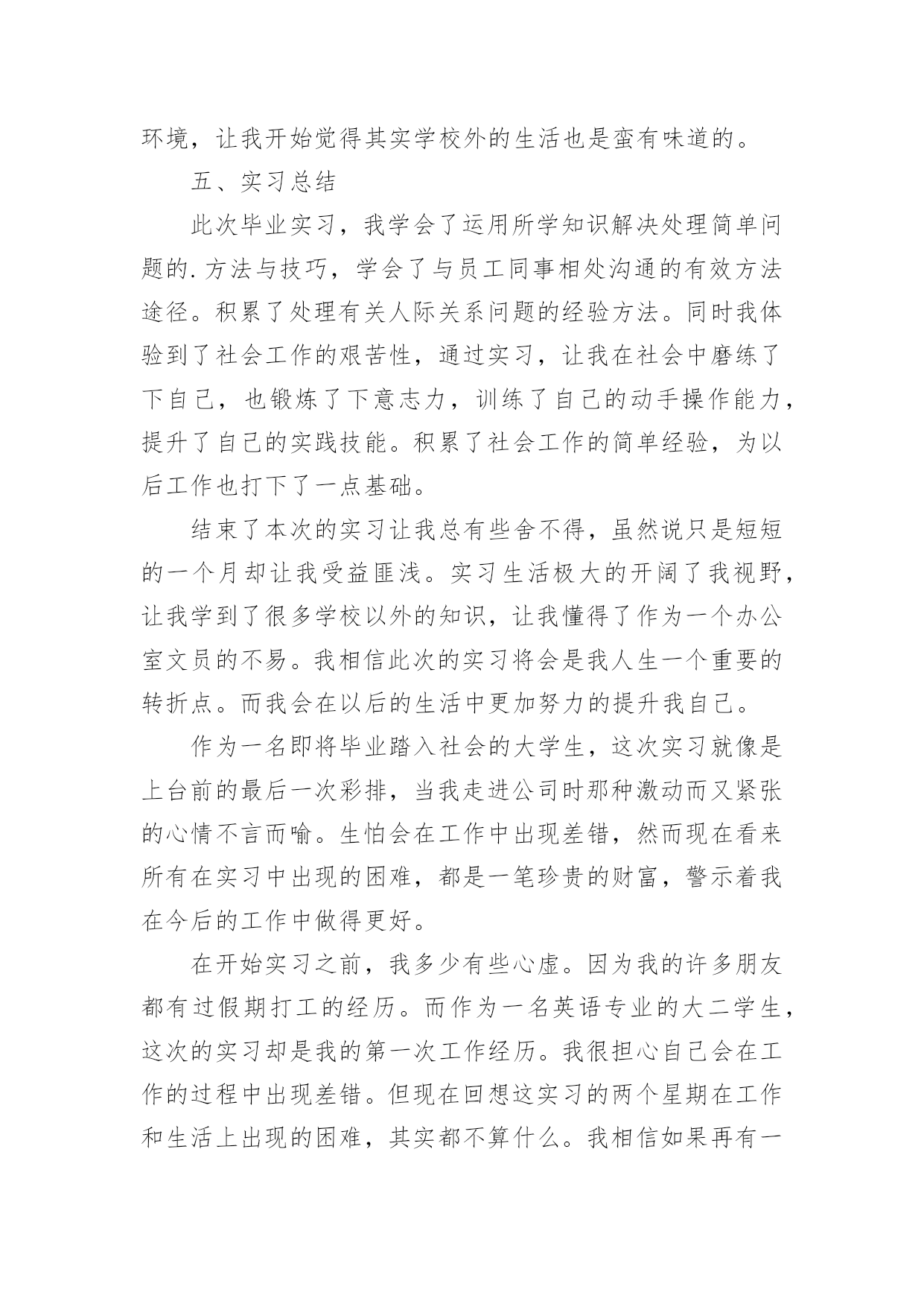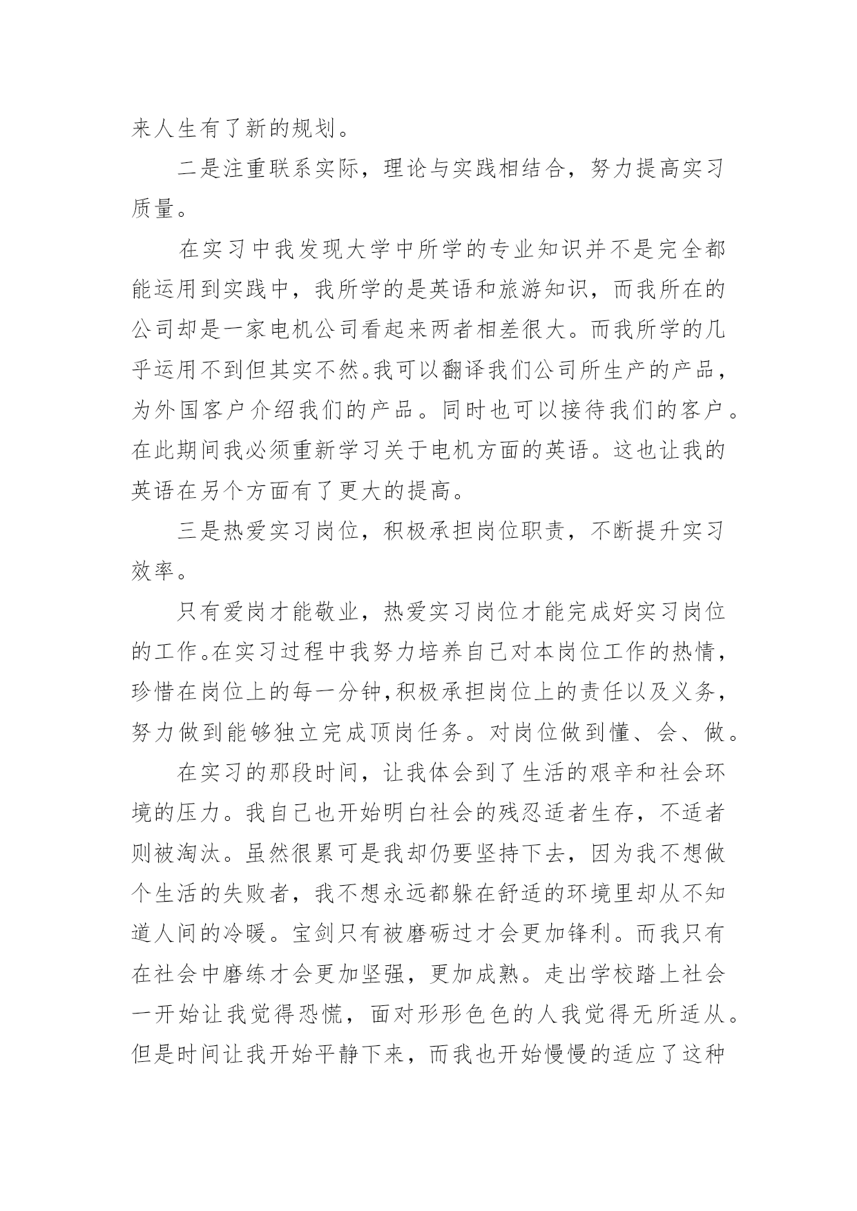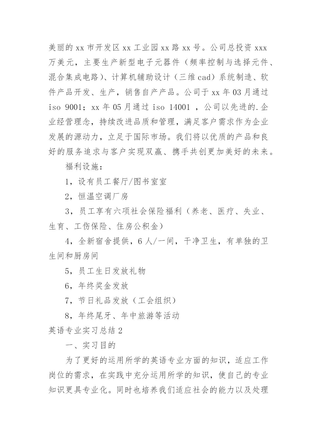 英语专业实习总结 英语专业实习总结(精选15篇)总结是对取得的成绩、存在的问题及得到的经验和教训等方面情况进行评价与描述的一种书面材料,它可以提升我们发现问题的能力,我想我们需要写一份总结了吧。我们该怎么写总结呢?以下是小编帮大家整理的英语专业实习总结,仅供参考,希望能够帮助到大家。英语专业实习总结1一、实习目的为了更好的运用所学的英语和日语以及计算机的知识,适应工作岗位的需求,在实践中充分运用所学的知识,使自己的专业知识更具专业化。同时也培养我们适应社会的能力以及处理人际关系的能力。为以后自己更好的走上社会做好准备。二、实习时间xx年11月至xx年6月三、实习地点xx电机有限公司四、实习单位和部门xx电机行政部门实习单位基本情况:我公司是一家日本独资企业,位于美丽的xx市开发区xx工业园xx路xx号。公司总投资xxx万美元,主要生产新型电子元器件(频率控制与选择元件、混合集成电路)、计算机辅助设计(三维cad)系统制造、软件产品开发、生产,销售自产产品。公司于xx年03月通过iso9001;xx年05月通过iso14001,公司以先进的.企业经营理念,持续改进品质和管理,满足客户需求作为企业发展的源动力,立足于国际市场。我们将以优质的产品和良好的服务追求与客户实现双赢、携手共创更加美好的未来。福利设施:1,设有员工餐厅/图书室室2,恒温空调厂房3,员工享有六项社会保险福利(养老、医疗、失业、生育、工伤保险、住房公积金)4,全新宿舍提供,6人/一间,干净卫生,有单独的卫生间和厨房间5,员工生日发放礼物6,年终奖金发放7,节日礼品发放(工会组织)8,年终尾牙、年中旅游等活动英语专业实习总结2一、实习目的为了更好的运用所学的英语专业方面的知识,适应工作岗位的需求,在实践中充分运用所学的知识,使自己的专业知识更具专业化。同时也培养我们适应社会的能力以及处理人际关系的能力。为以后自己更好的走上社会做好准备。二、实习部门实习单位基本情况:我公司是一家独资企业,主要生产新型电子元器件(频率控制与选择元件、混合集成电路)、计算机辅助设计系统制造、软件产品开发、生产,销售自产产品。三、实习内容1、对外来人员的接待,包括外宾,及时做好翻译工作。2、开试工单通知复试通过者试工,并做好登记。3、协助做好新员工入职培训、阶段性培训等培训工作。4、送文件至各级领导,签收文件。5、整理及保管补卡条、请假条;整理员工档案,以备随时出档和归档。6、复印、速印办公文件,发传真,领办公表格等。四、实习收获以及体会一是加强思想学习,主动与上级领导沟通,努力提高思想水平思想是人的灵魂,是人的内在力,要想把实习任务完成好,首先要把思想调整好。领导十分重视大学生成长,为此特地为我们制定了双导师实习制度。双导师,顾名思义,就是两位导师,工人导师是教授生产技术的,而领导导师是在思想上引领大学生,为其排忧解疑,指引方向的。在此优势下,我主动与领导进行了沟通,在领导的尊尊教导下,我对实习有了更为深层次的理解,更明确了我的工作目标,在思想上使我对未来的工作有了新的认识,在行动上使我对未来人生有了新的规划。二是注重联系实际,理论与实践相结合,努力提高实习质量。在实习中我发现大学中所学的专业知识并不是完全都能运用到实践中,我所学的是英语和旅游知识,而我所在的公司却是一家电机公司看起来两者相差很大。而我所学的几乎运用不到但其实不然。我可以翻译我们公司所生产的产品,为外国客户介绍我们的产品。同时也可以接待我们的客户。在此期间我必须重新学习关于电机方面的英语。这也让我的英语在另个方面有了更大的提高。三是热爱实习岗位,积极承担岗位职责,不断提升实习效率。只有爱岗才能敬业,热爱实习岗位才能完成好实习岗位的工作。在实习过程中我努力培养自己对本岗位工作的热情,珍惜在岗位上的每一分钟,积极承担岗位上的责任以及义务,努力做到能够独立完成顶岗任务。对岗位做到懂、会、做。在实习的那段时间,让我体会到了生活的艰辛和社会环境的压力。我自己也开始明白社会的残忍适者生存,不适者则被淘汰。虽然很累可是我却仍要坚持下去,因为我不想做个生活的失败者,我不想永远都躲在舒适的环境里却从不知道人间的冷暖。宝剑只有被磨砺过才会更加锋利。而我只有在社会中磨练才会更加坚强,更加成熟。走出学校踏上社会一开始让我觉得恐慌,面对形形色色的人我觉得无所适从。但是时间让我开始平静下来,而我也开始慢慢的适应了这种环境,让我开始觉得其实学校外的生活也是蛮有味道的。五、实习总结此次毕业实习,我学会了运用所学知识解决处理简单问题的.方法与技巧,学会了与员工同事相处沟通的有效方法途径。积累了处理有关人际关系问题的经验方法。同时我体验到了社会工作的艰苦性,通过实习,让我在社会中磨练了下自己,也锻炼了下意志力,训练了自己的动手操作能力,提升了自己的实践