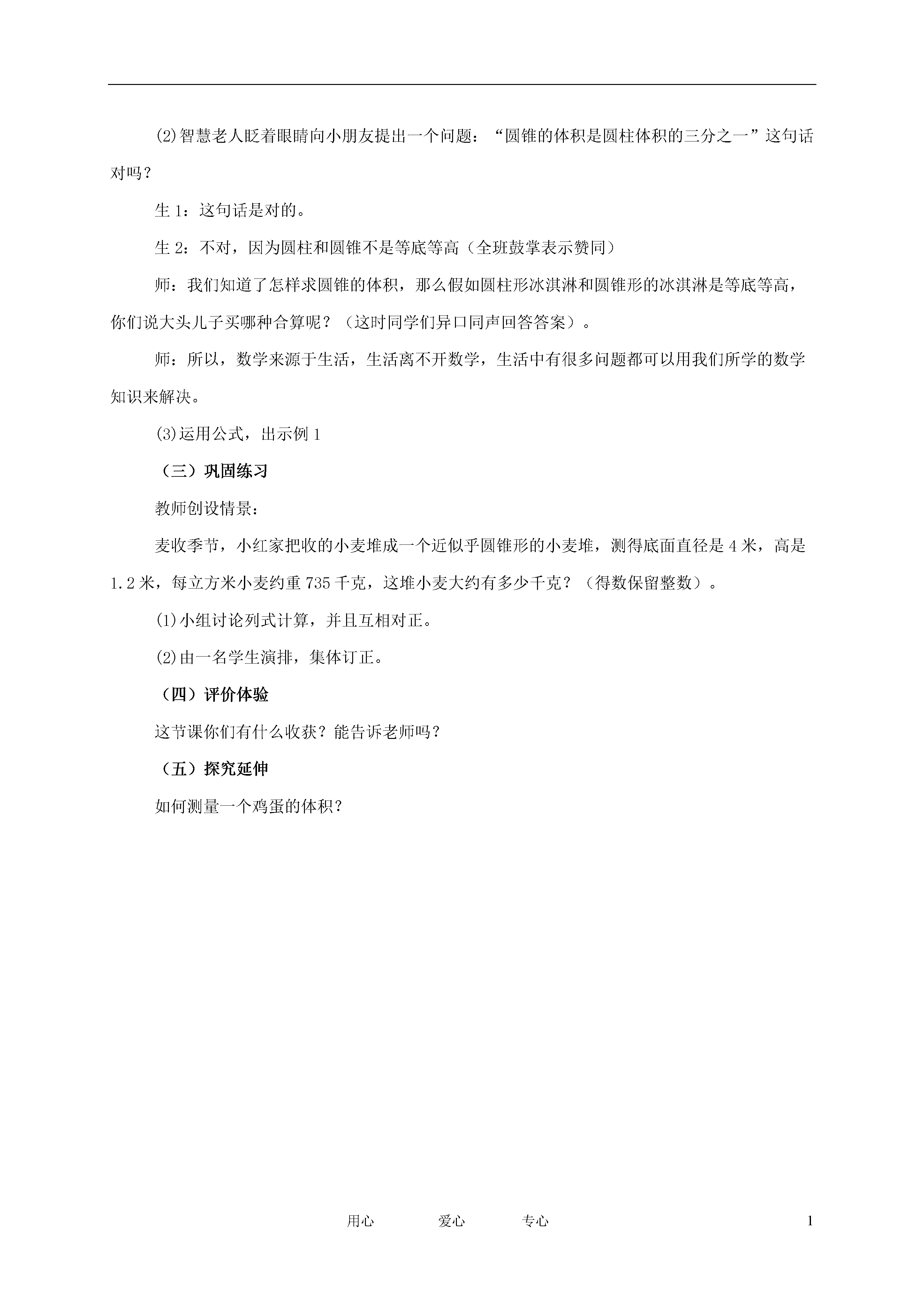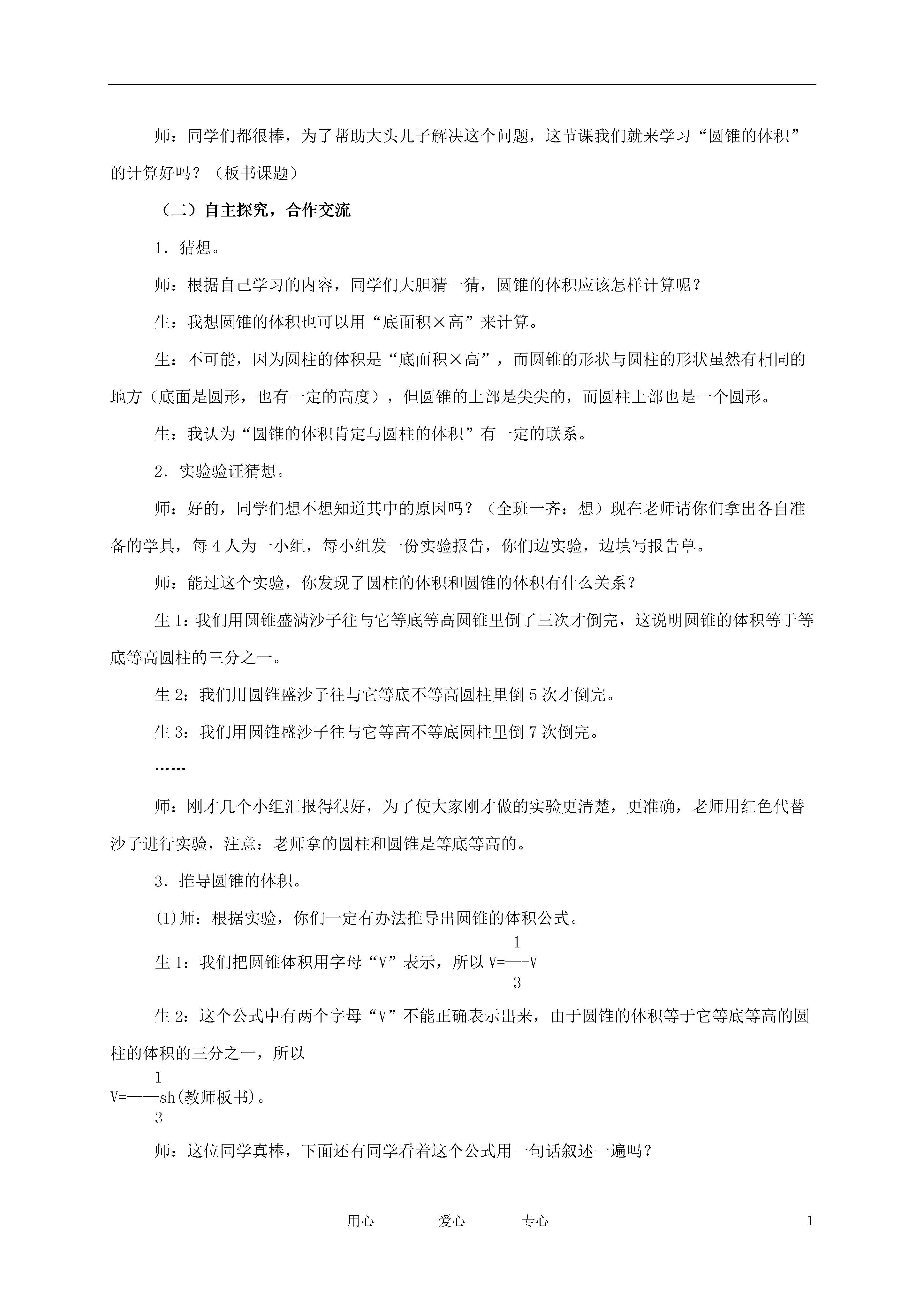 1用心爱心专心圆锥的体积教学目标:1.使同学们理解并掌握圆锥体积公式的推导过程,能运用公式计算圆锥的体积。2.培养同学们的空间想象,动手操作,概括推理和创新能力,能运用所学的知识解决生活中的实际问题。3.使同学们感受到数学来源于生活,积极参与数学活动体验数学活动中的探索与创造,本着实事求是的态度,养成质疑和独立思考的良好习惯。教学重点:圆锥体积计算公式教学难点:圆锥体积计算公式的推导过程教学用具:学具:(4人为一小组)每小组准备用硬纸自制等底等高,等高不等底,等底不等高的圆柱和圆锥各一对,黄沙一小袋。教学过程:(一)联系生活,激趣设疑1.激趣引入师:一个夏天上午大头儿子和小头爸爸到武汉动物园,那里的风景可真美,就是天气有点热,他们决定买冰淇淋。大头儿子来到冷饮店,看见两种冰淇淋。一种圆柱形的,2元一支;一种圆锥形的0.5元一支。大头儿子摸摸脑袋,不知买哪一种既经济又实惠的冰淇淋,同学们,你们能帮帮他吗?2.引入新知(这时学生争论不休)生1:他应该买圆柱形的,圆柱形容量多些。生2:他应该买圆锥形的那种,因为那种经济些。生3:我们不能盲目下决定,不要看其外形,圆柱形哪种虽然多些,但它比较贵,圆锥形那种少一些,但它经济,所以我们还要调查调查。生4:刚才那位同学说得对,我们应该算出圆柱形那种和圆锥形那种的容量各是多少,也就是要算出它们体积是多少才能决定。圆柱形的体积等于底面积×高;圆锥的体积呢?师:同学们都很棒,为了帮助大头儿子解决这个问题,这节课我们就来学习“圆锥的体积”的计算好吗?(板书课题)(二)自主探究,合作交流1.猜想。师:根据自己学习的内容,同学们大胆猜一猜,圆锥的体积应该怎样计算呢?生:我想圆锥的体积也可以用“底面积×高”来计算。生:不可能,因为圆柱的体积是“底面积×高”,而圆锥的形状与圆柱的形状虽然有相同的地方(底面是圆形,也有一定的高度),但圆锥的上部是尖尖的,而圆柱上部也是一个圆形。生:我认为“圆锥的体积肯定与圆柱的体积”有一定的联系。2.实验验证猜想。师:好的,同学们想不想知道其中的原因吗?(全班一齐:想)现在老师请你们拿出各自准备的学具,每4人为一小组,每小组发一份实验报告,你们边实验,边填写报告单。师:能过这个实验,你发现了圆柱的体积和圆锥的体积有什么关系?生1:我们用圆锥盛满沙子往与它等底等高圆锥里倒了三次才倒完,这说明圆锥的体积等于等底等高圆柱的三分之一。生2:我们用圆锥盛沙子往与它等底不等高圆柱里倒5次才倒完。生3:我们用圆锥盛沙子往与它等高不等底圆柱里倒7次倒完。……师:刚才几个小组汇报得很好,为了使大家刚才做的实验更清楚,更准确,老师用红色代替沙子进行实验,注意:老师拿的圆柱和圆锥是等底等高的。3.推导圆锥的体积。(1)师:根据实验,你们一定有办法推导出圆锥的体积公式。1生1:我们把圆锥体积用字母“V”表示,所以V=—-V3生2:这个公式中有两个字母“V”不能正确表示出来,由于圆锥的体积等于它等底等高的圆柱的体积的三分之一,所以1V=——sh(教师板书)。3师:这位同学真棒,下面还有同学看着这个公式用一句话叙述一遍吗?(2)智慧老人眨着眼睛向小朋友提出一个问题:“圆锥的体积是圆柱体积的三分之一”这句话对吗?生1:这句话是对的。生2:不对,因为圆柱和圆锥不是等底等高(全班鼓掌表示赞同)师:我们知道了怎样求圆锥的体积,那么假如圆柱形冰淇淋和圆锥形的冰淇淋是等底等高,你们说大头儿子买哪种合算呢?(这时同学们异口同声回答答案)。师:所以,数学来源于生活,生活离不开数学,生活中有很多问题都可以用我们所学的数学知识来解决。(3)运用公式,出示例1(三)巩固练习教师创设情景:麦收季节,小红家把收的小麦堆成一个近似乎圆锥形的小麦堆,测得底面直径是4米,高是1.2米,每立方米小麦约重735千克,这堆小麦大约有多少千克?(得数保留整数)。(1)小组讨论列式计算,并且互相对正。(2)由一名学生演排,集体订正。(四)评价体验这节课你们有什么收获?能告诉老师吗?(五)探究延伸如何测量一个鸡蛋的体积?