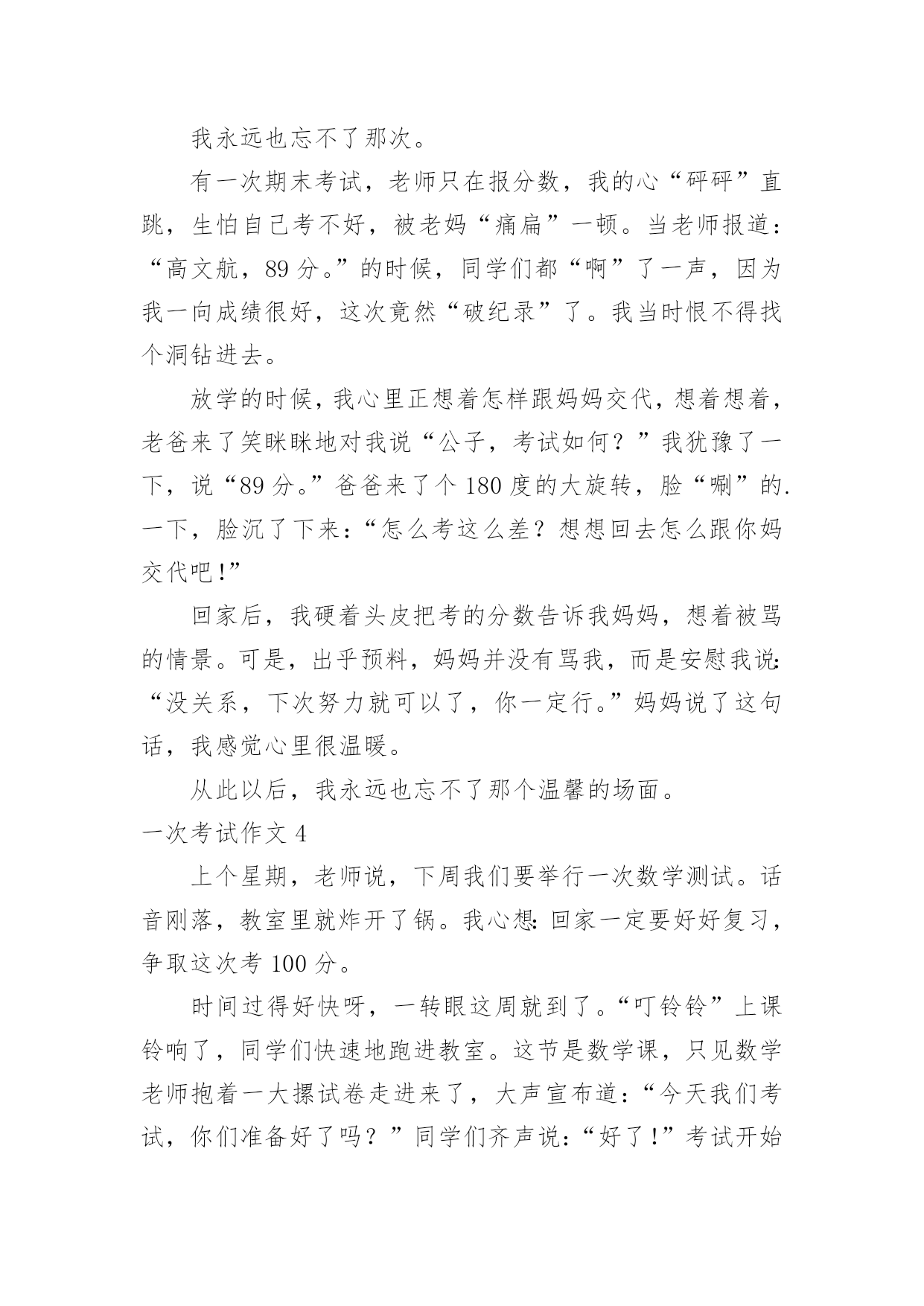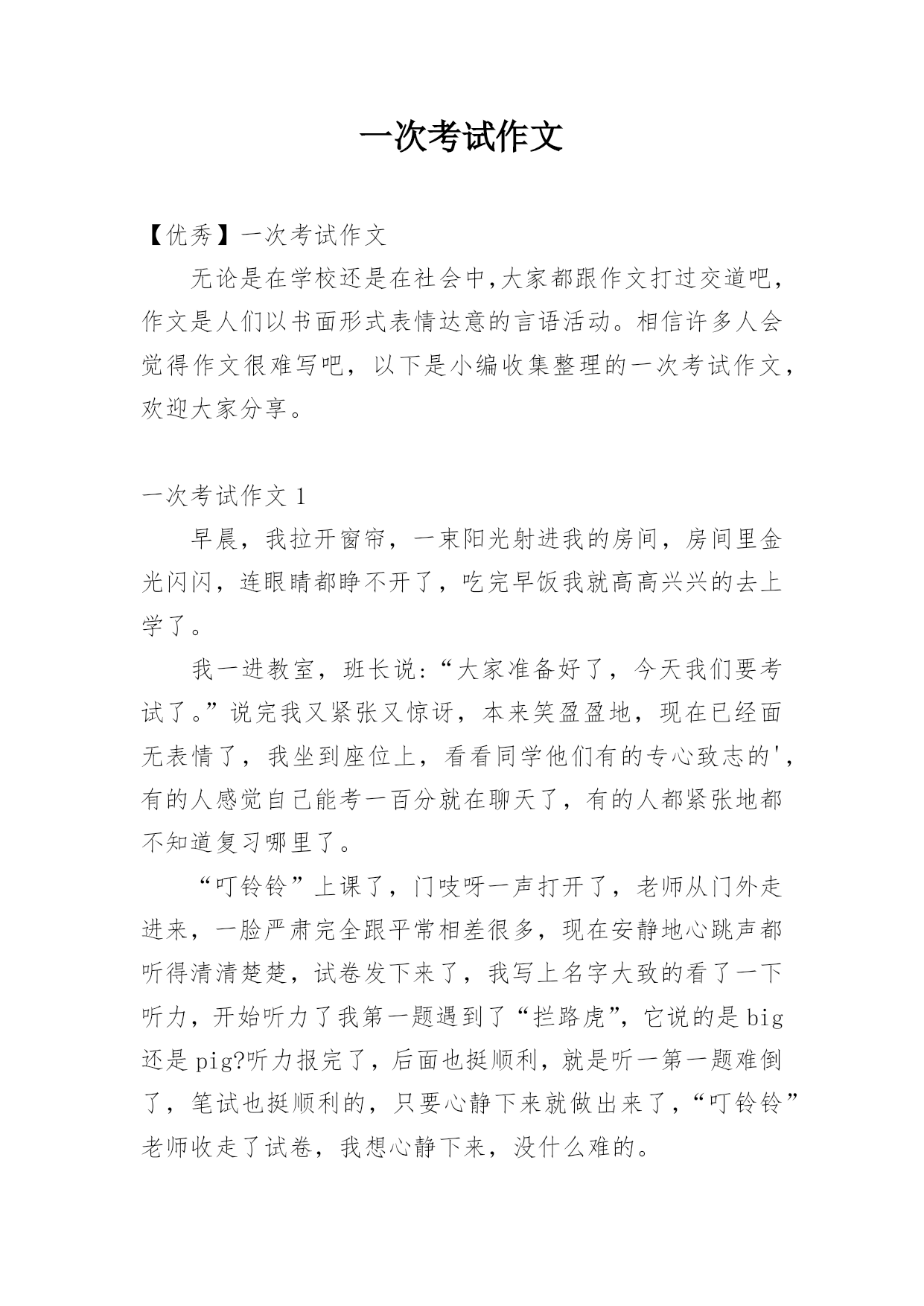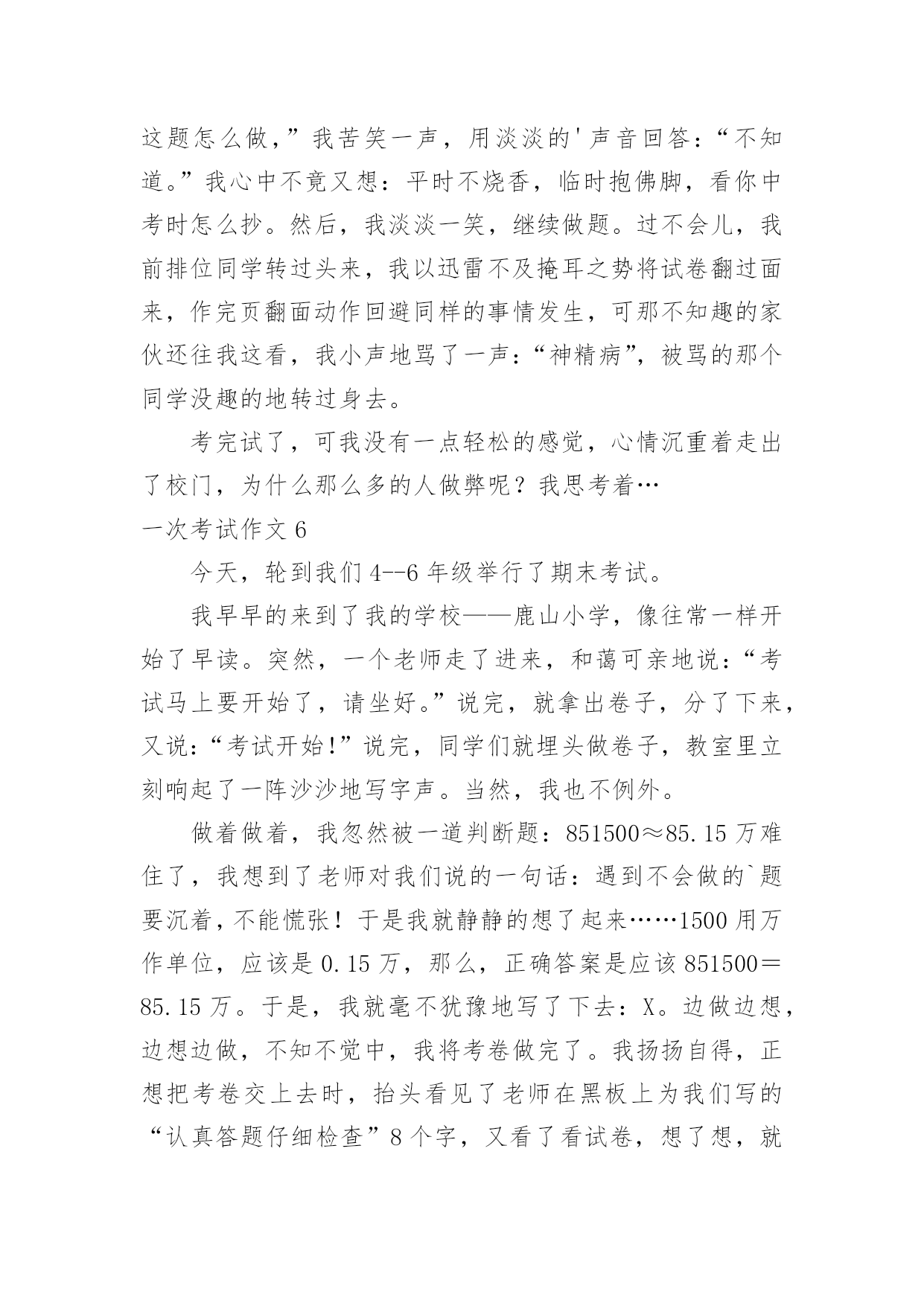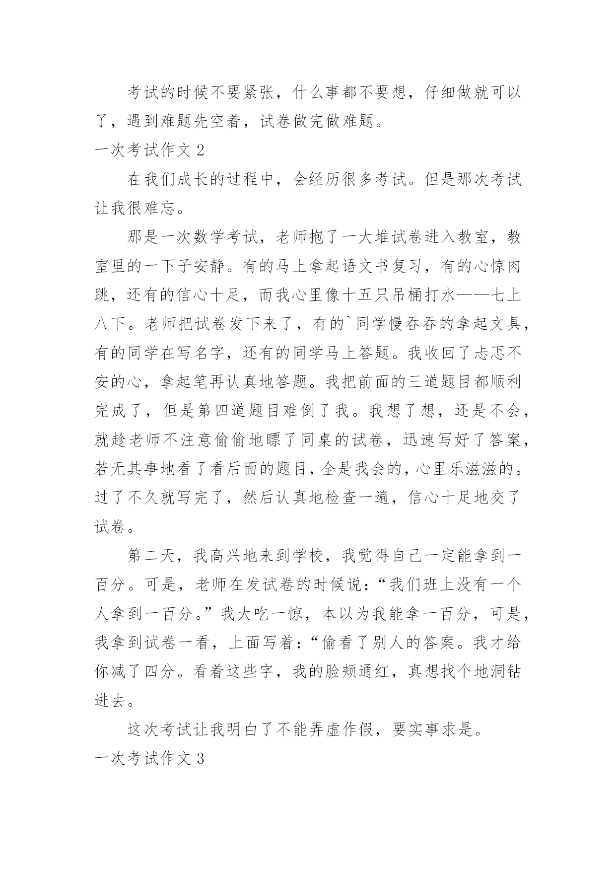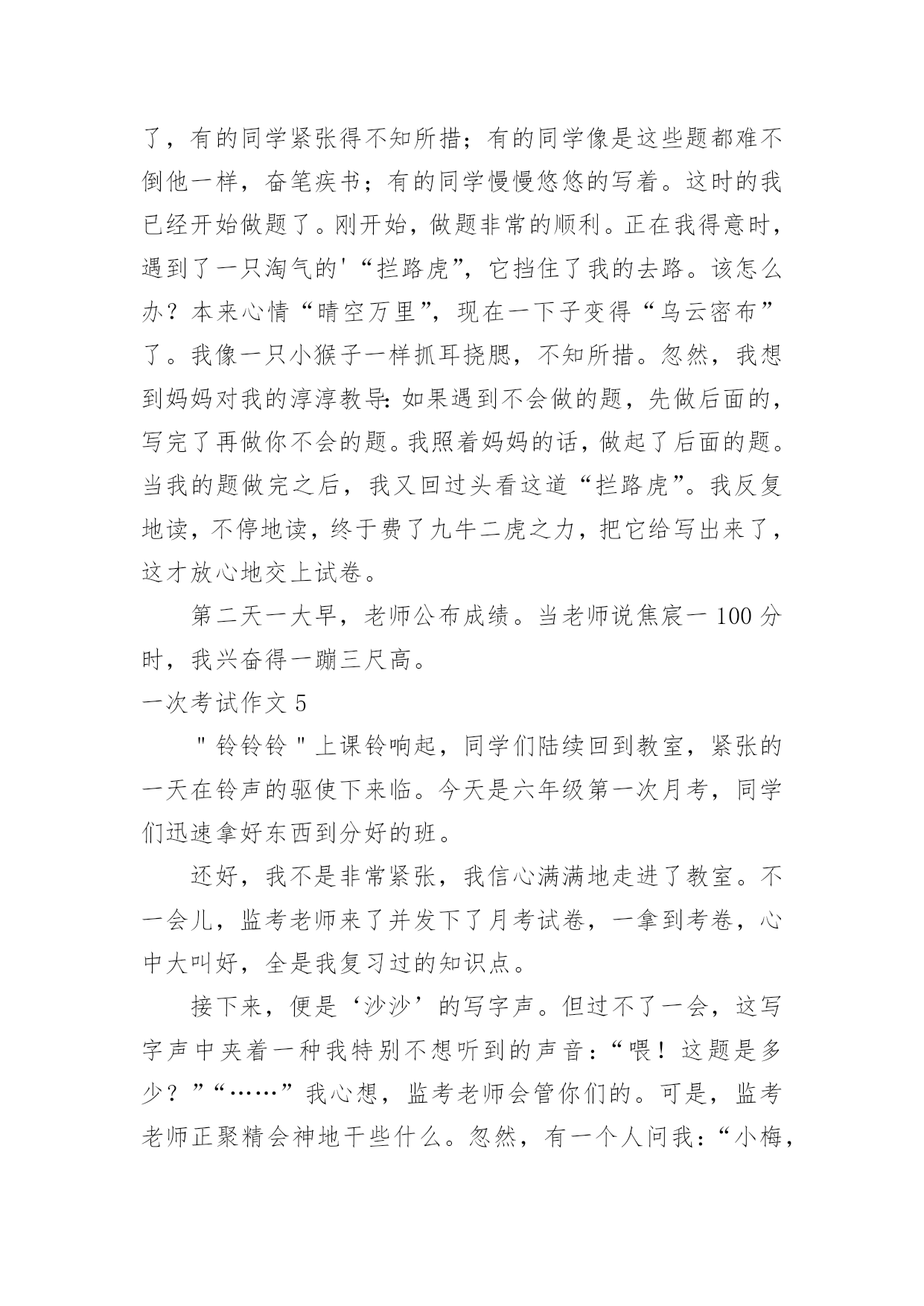 一次考试作文 【优秀】一次考试作文无论是在学校还是在社会中,大家都跟作文打过交道吧,作文是人们以书面形式表情达意的言语活动。相信许多人会觉得作文很难写吧,以下是小编收集整理的一次考试作文,欢迎大家分享。一次考试作文1早晨,我拉开窗帘,一束阳光射进我的房间,房间里金光闪闪,连眼睛都睁不开了,吃完早饭我就高高兴兴的去上学了。我一进教室,班长说:“大家准备好了,今天我们要考试了。”说完我又紧张又惊讶,本来笑盈盈地,现在已经面无表情了,我坐到座位上,看看同学他们有的专心致志的',有的人感觉自己能考一百分就在聊天了,有的人都紧张地都不知道复习哪里了。“叮铃铃”上课了,门吱呀一声打开了,老师从门外走进来,一脸严肃完全跟平常相差很多,现在安静地心跳声都听得清清楚楚,试卷发下来了,我写上名字大致的看了一下听力,开始听力了我第一题遇到了“拦路虎”,它说的是big还是pig?听力报完了,后面也挺顺利,就是听一第一题难倒了,笔试也挺顺利的,只要心静下来就做出来了,“叮铃铃”老师收走了试卷,我想心静下来,没什么难的。考试的时候不要紧张,什么事都不要想,仔细做就可以了,遇到难题先空着,试卷做完做难题。一次考试作文2在我们成长的过程中,会经历很多考试。但是那次考试让我很难忘。那是一次数学考试,老师抱了一大堆试卷进入教室,教室里的一下子安静。有的马上拿起语文书复习,有的心惊肉跳,还有的信心十足,而我心里像十五只吊桶打水——七上八下。老师把试卷发下来了,有的`同学慢吞吞的拿起文具,有的同学在写名字,还有的同学马上答题。我收回了忐忑不安的心,拿起笔再认真地答题。我把前面的三道题目都顺利完成了,但是第四道题目难倒了我。我想了想,还是不会,就趁老师不注意偷偷地瞟了同桌的试卷,迅速写好了答案,若无其事地看了看后面的题目,全是我会的,心里乐滋滋的。过了不久就写完了,然后认真地检查一遍,信心十足地交了试卷。第二天,我高兴地来到学校,我觉得自己一定能拿到一百分。可是,老师在发试卷的时候说:“我们班上没有一个人拿到一百分。”我大吃一惊,本以为我能拿一百分,可是,我拿到试卷一看,上面写着:“偷看了别人的答案。我才给你减了四分。看着这些字,我的脸颊通红,真想找个地洞钻进去。这次考试让我明白了不能弄虚作假,要实事求是。一次考试作文3我永远也忘不了那次。有一次期末考试,老师只在报分数,我的心“砰砰”直跳,生怕自己考不好,被老妈“痛扁”一顿。当老师报道:“高文航,89分。”的时候,同学们都“啊”了一声,因为我一向成绩很好,这次竟然“破纪录”了。我当时恨不得找个洞钻进去。放学的时候,我心里正想着怎样跟妈妈交代,想着想着,老爸来了笑眯眯地对我说“公子,考试如何?”我犹豫了一下,说“89分。”爸爸来了个180度的大旋转,脸“唰”的.一下,脸沉了下来:“怎么考这么差?想想回去怎么跟你妈交代吧!”回家后,我硬着头皮把考的分数告诉我妈妈,想着被骂的情景。可是,出乎预料,妈妈并没有骂我,而是安慰我说:“没关系,下次努力就可以了,你一定行。”妈妈说了这句话,我感觉心里很温暖。从此以后,我永远也忘不了那个温馨的场面。一次考试作文4上个星期,老师说,下周我们要举行一次数学测试。话音刚落,教室里就炸开了锅。我心想:回家一定要好好复习,争取这次考100分。时间过得好快呀,一转眼这周就到了。“叮铃铃”上课铃响了,同学们快速地跑进教室。这节是数学课,只见数学老师抱着一大摞试卷走进来了,大声宣布道:“今天我们考试,你们准备好了吗?”同学们齐声说:“好了!”考试开始了,有的同学紧张得不知所措;有的同学像是这些题都难不倒他一样,奋笔疾书;有的同学慢慢悠悠的写着。这时的我已经开始做题了。刚开始,做题非常的顺利。正在我得意时,遇到了一只淘气的'“拦路虎”,它挡住了我的去路。该怎么办?本来心情“晴空万里”,现在一下子变得“乌云密布”了。我像一只小猴子一样抓耳挠腮,不知所措。忽然,我想到妈妈对我的淳淳教导:如果遇到不会做的题,先做后面的,写完了再做你不会的题。我照着妈妈的话,做起了后面的题。当我的题做完之后,我又回过头看这道“拦路虎”。我反复地读,不停地读,终于费了九牛二虎之力,把它给写出来了,这才放心地交上试卷。第二天一大早,老师公布成绩。当老师说焦宸一100分时,我兴奋得一蹦三尺高。一次考试作文5"铃铃铃"上课铃响起,同学们陆续回到教室,紧张的一天在铃声的驱使下来临。今天是六年级第一次月考,同学们迅速拿好东西到分好的班。还好,我不是非常紧张,我信心满满地走进了教室。不一会儿,监考老师来了并发下了月考试卷,一拿到考卷,心中大叫好,全是我复习过的知识点。接下来,便是‘沙沙’的写字声。但过不了一会,这写字声中夹着一种我特别不想听到的声音:“喂!这题是多少?”“……”我心想,监考老师会管你们的。可是,监考老师正聚精会神地干些什