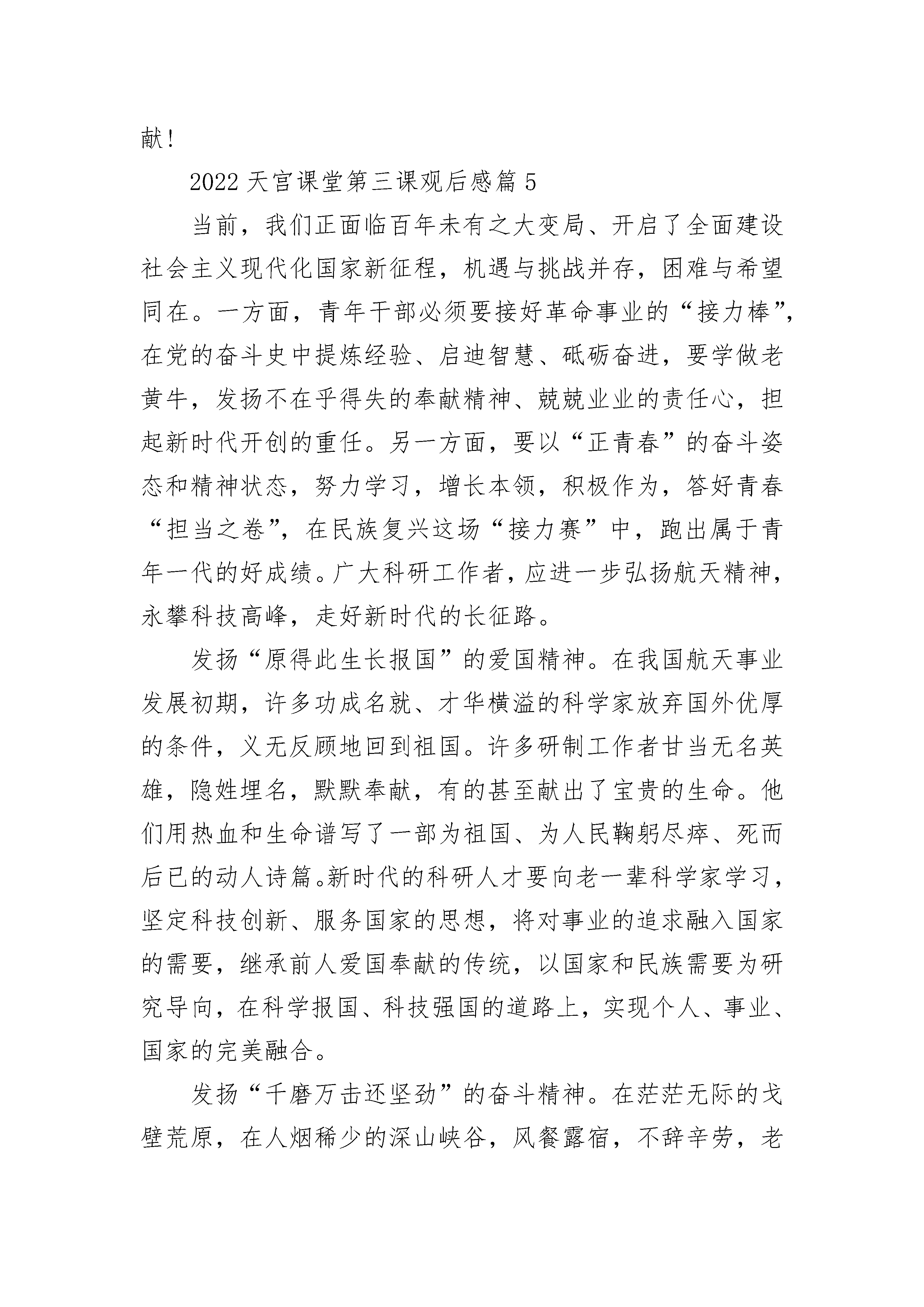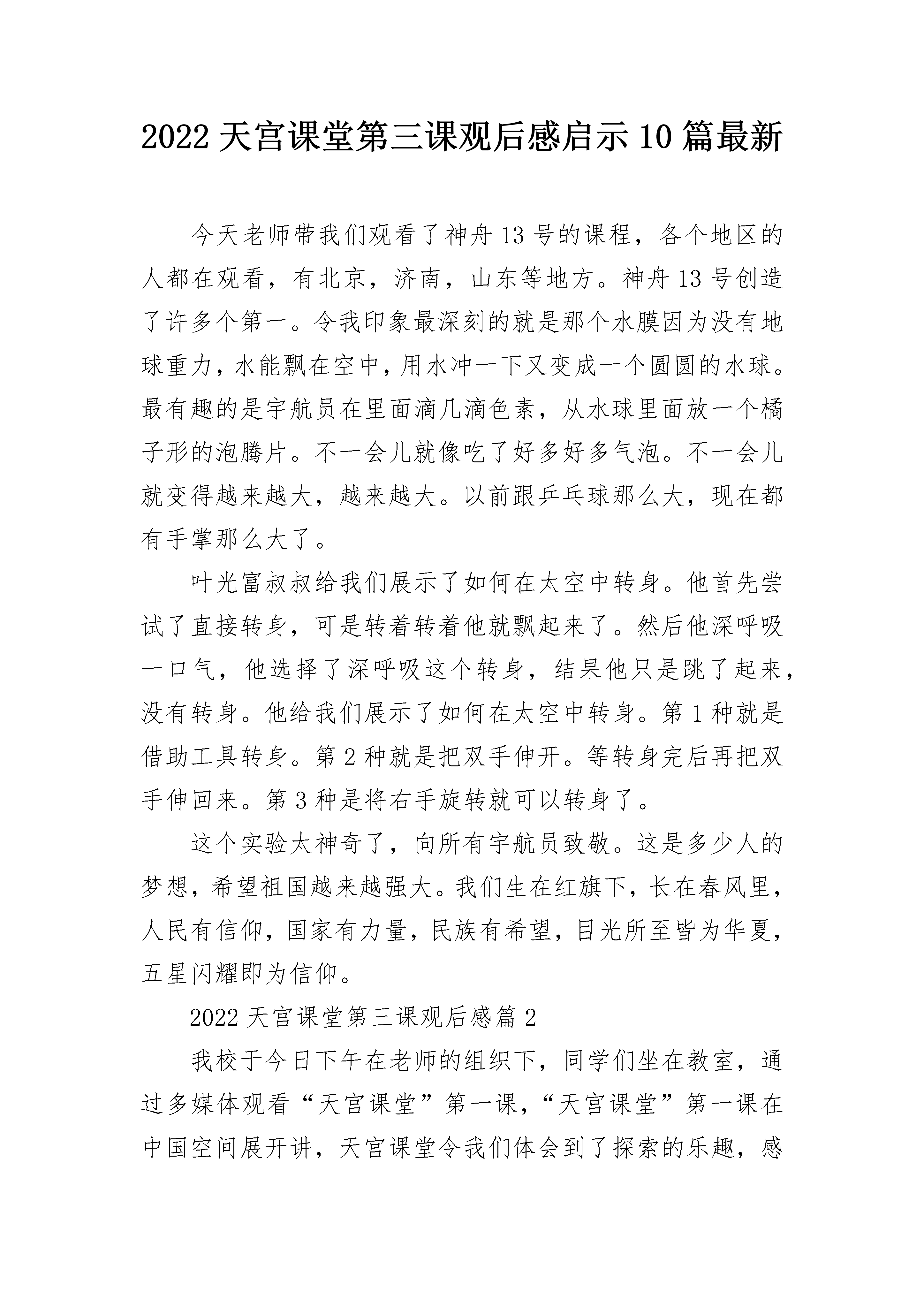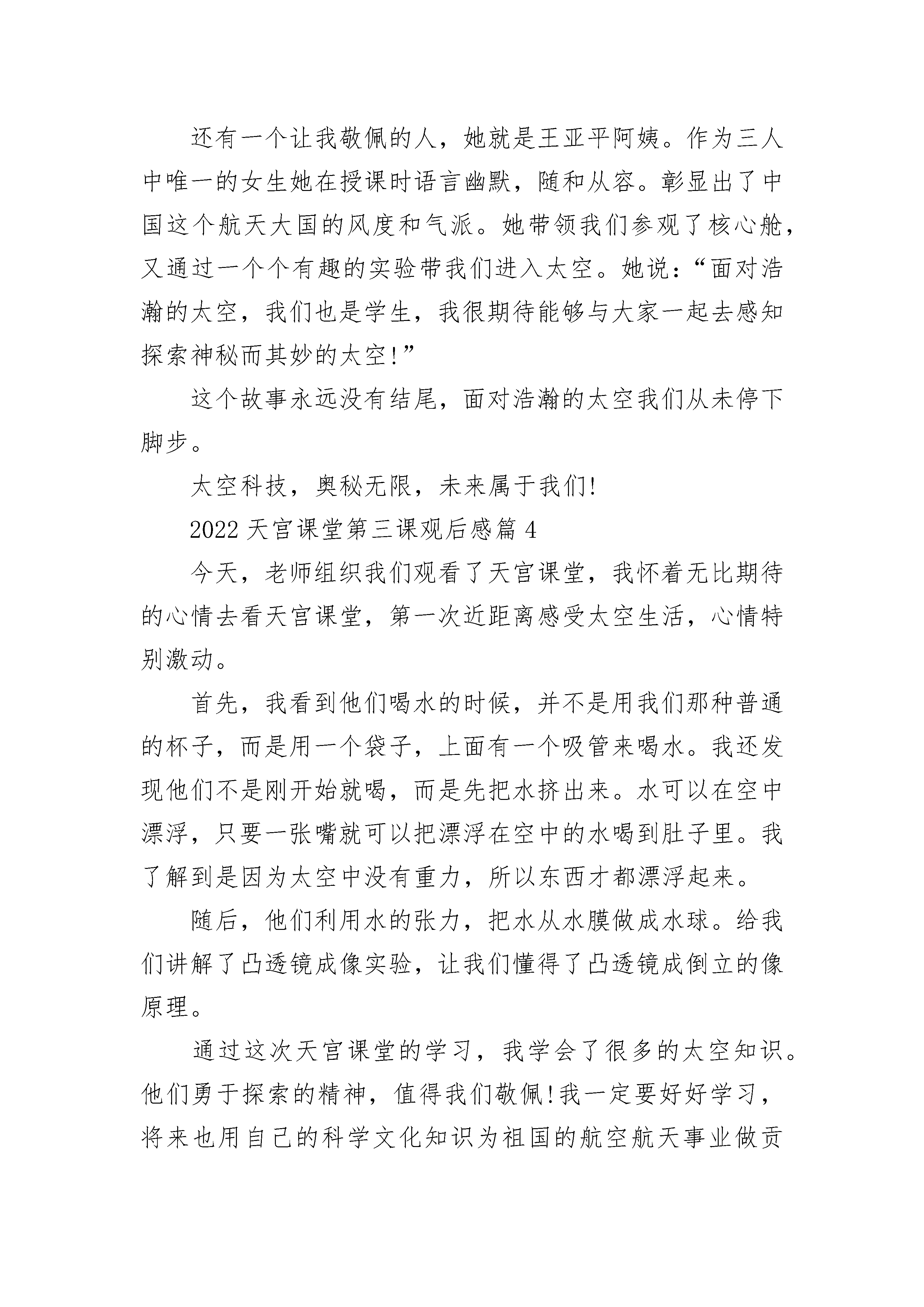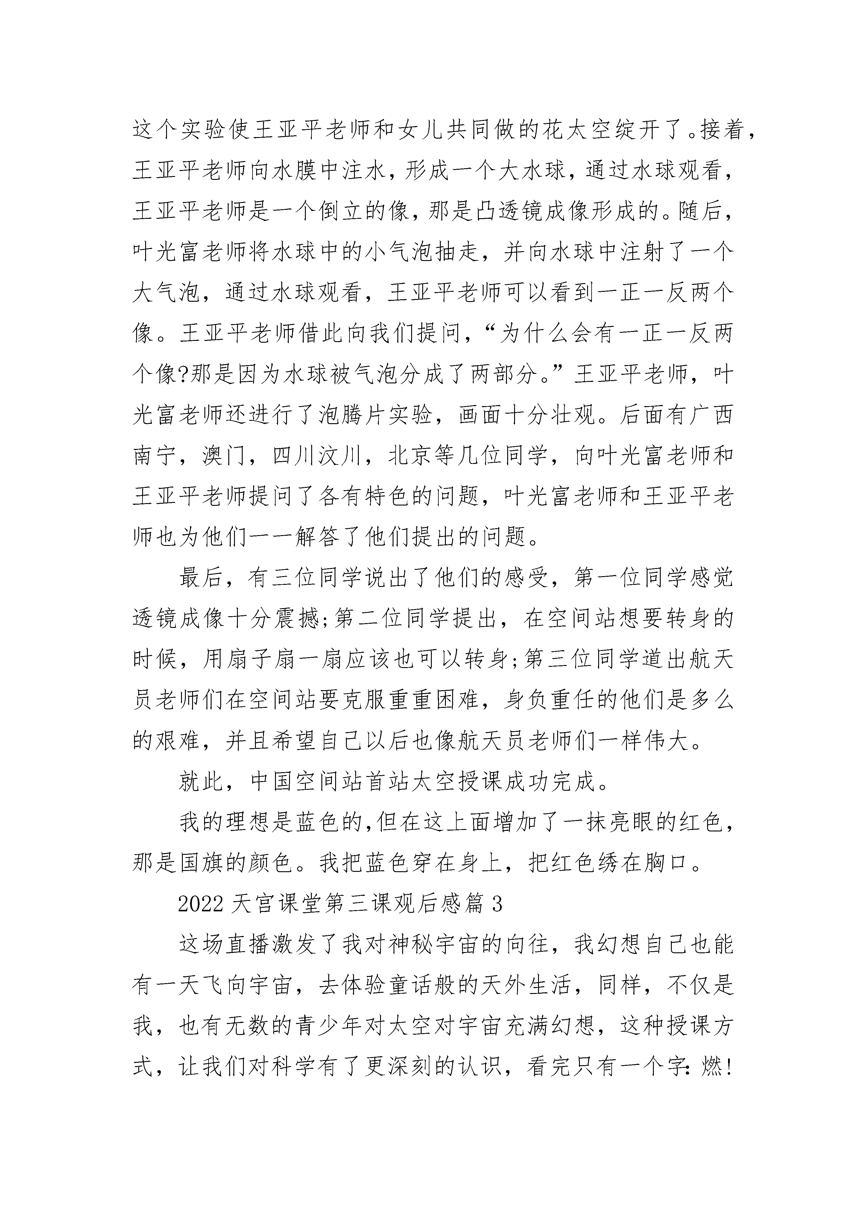 2022天宫课堂第三课观后感启示10篇最新今天老师带我们观看了神舟13号的课程,各个地区的人都在观看,有北京,济南,山东等地方。神舟13号创造了许多个第一。令我印象最深刻的就是那个水膜因为没有地球重力,水能飘在空中,用水冲一下又变成一个圆圆的水球。最有趣的是宇航员在里面滴几滴色素,从水球里面放一个橘子形的泡腾片。不一会儿就像吃了好多好多气泡。不一会儿就变得越来越大,越来越大。以前跟乒乓球那么大,现在都有手掌那么大了。叶光富叔叔给我们展示了如何在太空中转身。他首先尝试了直接转身,可是转着转着他就飘起来了。然后他深呼吸一口气,他选择了深呼吸这个转身,结果他只是跳了起来,没有转身。他给我们展示了如何在太空中转身。第1种就是借助工具转身。第2种就是把双手伸开。等转身完后再把双手伸回来。第3种是将右手旋转就可以转身了。这个实验太神奇了,向所有宇航员致敬。这是多少人的梦想,希望祖国越来越强大。我们生在红旗下,长在春风里,人民有信仰,国家有力量,民族有希望,目光所至皆为华夏,五星闪耀即为信仰。2022天宫课堂第三课观后感篇2我校于今日下午在老师的组织下,同学们坐在教室,通过多媒体观看“天宫课堂”第一课,“天宫课堂”第一课在中国空间展开讲,天宫课堂令我们体会到了探索的乐趣,感知宇宙奥秘,天地之间进行互动。“天宫课堂”开讲,太空真奇妙,讲述了中国航天员在空间站的衣食住行,并向我们详细介绍了航天服的内部设计以及功能,企鹅服的功能是对降肌肉萎缩,心血管功能下降。接着讲述了细胞生物学夜光服展示失重条件下细胞生长发育研究,详细讲解了心肌细胞,细胞在太空中很神奇,荧光显微镜下跳动,并且一闪一闪的十分震撼,成片的心肌细胞做着收缩运动。到了同学提问的环节,他们提出的问题也是各有特色,第一位同学向空间站中的叶光富老师,王亚平老师提问,“在空间站里,可以像在地面上一样自由行走吗?”王亚平老师为我们做出了解答,因为空间站中没有重力的帮助,所以空间站中的人无法像人在地面上一样的行走。他们总是飘来飘去的,并且在旋转的过程中,上半身向右转,下半身会向左转,上半身向左转,下半身会向右转,吹气等动作在空间站并不能令其转身,这是叶光富老师向我们展示的,但手臂大幅度转动时,可以令其转身。第二位同学向王亚平老师提问,“在空间站中的生活用水可以循环使用吗?”王亚平老师向我们作出了解答,由于他们用的是处理过的生水,所以不能循环利用。并且水在地面上有浮力作用,把乒乓球放在水杯里向下按,乒乓球会不断的浮出水面,但是在空间站乒乓球并没有浮出水面,而是在被按压后沉在水底,王亚平老师向我们解释,那是因为在空间站中浮力几乎消失。水膜实验是王亚平老师和叶光富老师共同进行完成的,这个实验使王亚平老师和女儿共同做的花太空绽开了。接着,王亚平老师向水膜中注水,形成一个大水球,通过水球观看,王亚平老师是一个倒立的像,那是凸透镜成像形成的。随后,叶光富老师将水球中的小气泡抽走,并向水球中注射了一个大气泡,通过水球观看,王亚平老师可以看到一正一反两个像。王亚平老师借此向我们提问,“为什么会有一正一反两个像?那是因为水球被气泡分成了两部分。”王亚平老师,叶光富老师还进行了泡腾片实验,画面十分壮观。后面有广西南宁,澳门,四川汶川,北京等几位同学,向叶光富老师和王亚平老师提问了各有特色的问题,叶光富老师和王亚平老师也为他们一一解答了他们提出的问题。最后,有三位同学说出了他们的感受,第一位同学感觉透镜成像十分震撼;第二位同学提出,在空间站想要转身的时候,用扇子扇一扇应该也可以转身;第三位同学道出航天员老师们在空间站要克服重重困难,身负重任的他们是多么的艰难,并且希望自己以后也像航天员老师们一样伟大。就此,中国空间站首站太空授课成功完成。我的理想是蓝色的,但在这上面增加了一抹亮眼的红色,那是国旗的颜色。我把蓝色穿在身上,把红色绣在胸口。2022天宫课堂第三课观后感篇3这场直播激发了我对神秘宇宙的向往,我幻想自己也能有一天飞向宇宙,去体验童话般的天外生活,同样,不仅是我,也有无数的青少年对太空对宇宙充满幻想,这种授课方式,让我们对科学有了更深刻的认识,看完只有一个字:燃!还有一个让我敬佩的人,她就是王亚平阿姨。作为三人中唯一的女生她在授课时语言幽默,随和从容。彰显出了中国这个航天大国的风度和气派。她带领我们参观了核心舱,又通过一个个有趣的实验带我们进入太空。她说:“面对浩瀚的太空,我们也是学生,我很期待能够与大家一起去感知探索神秘而其妙的太空!”这个故事永远没有结尾,面对浩瀚的太空我们从未停下脚步。太空科技,奥秘无限,未来属于我们!2022天宫课堂第三课观后感篇4今天,老师组织我们观看了天宫课堂,我怀着无比期待的心情去看天宫课堂,第一次近距离感受太空生活,心情特别激动。首先,我看到他们喝水的时候,并不是用我们那种普通