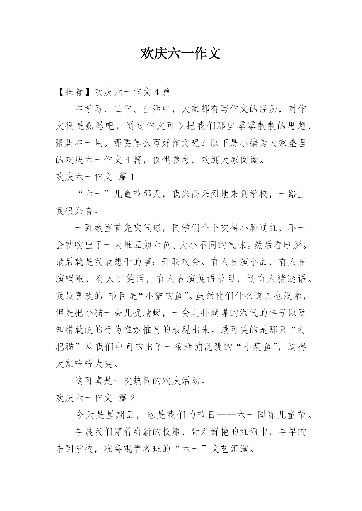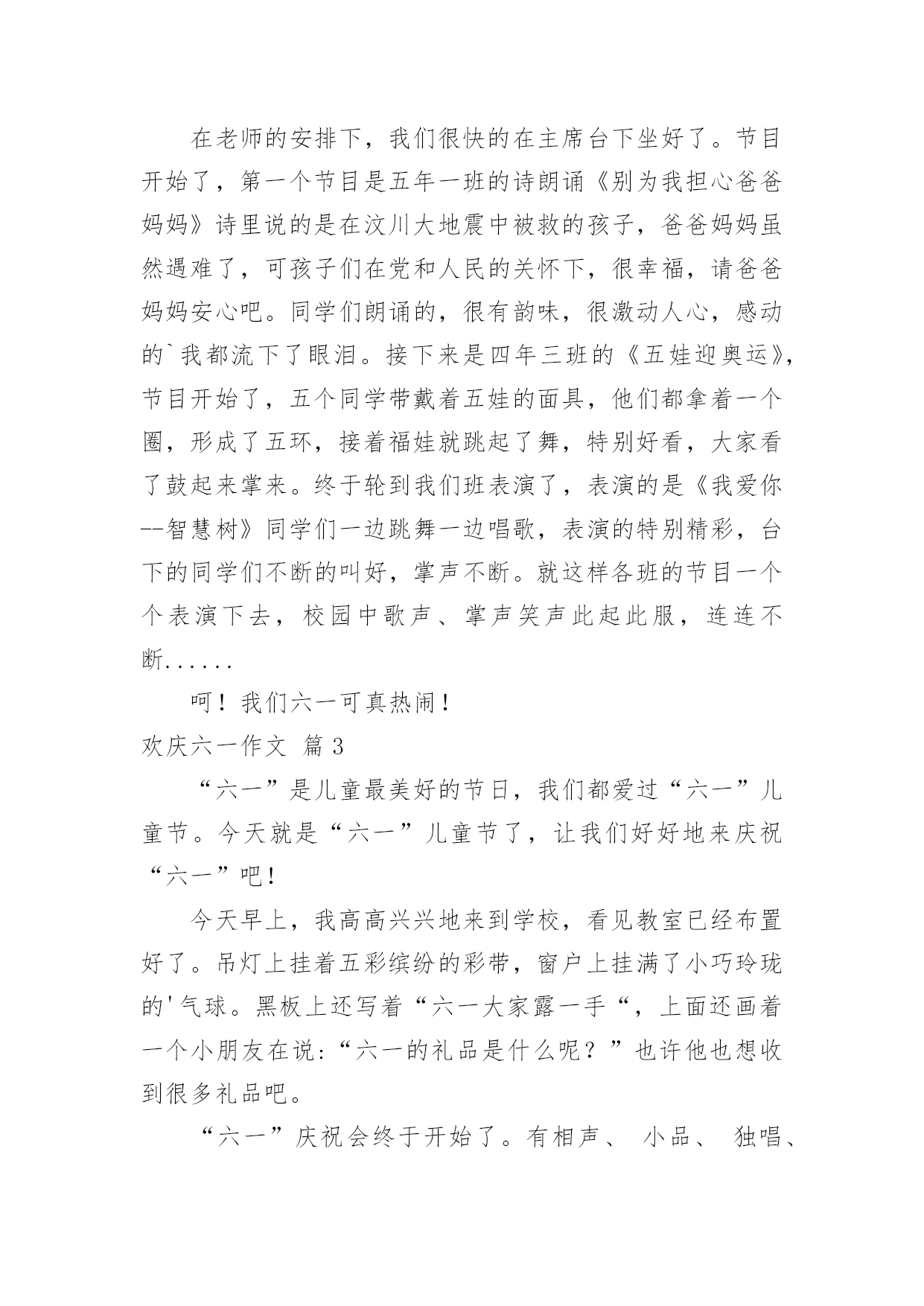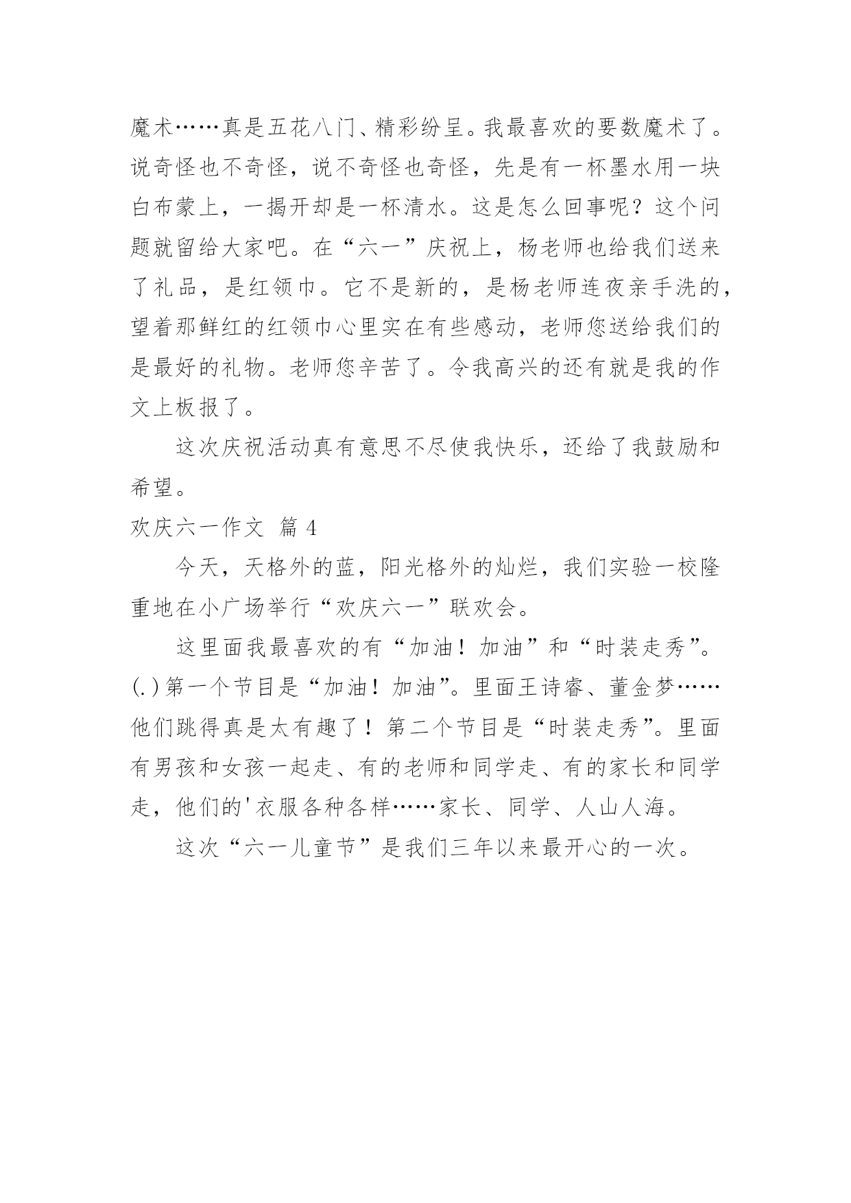 欢庆六一作文 【推荐】欢庆六一作文4篇在学习、工作、生活中,大家都有写作文的经历,对作文很是熟悉吧,通过作文可以把我们那些零零散散的思想,聚集在一块。那要怎么写好作文呢?以下是小编为大家整理的欢庆六一作文4篇,仅供参考,欢迎大家阅读。欢庆六一作文篇1“六一”儿童节那天,我兴高采烈地来到学校,一路上我很兴奋。一到教室首先吹气球,同学们个个吹得小脸通红,不一会就吹出了一大堆五颜六色、大小不同的气球。然后看电影。最后就是我最想干的事:开联欢会。有人表演小品,有人表演唱歌,有人讲笑话,有人表演英语节目,还有人猜谜语。我最喜欢的`节目是“小猫钓鱼”。虽然他们什么道具也没拿,但是把小猫一会儿捉蜻蜓,一会儿扑蝴蝶的淘气的样子以及知错就改的行为惟妙惟肖的表现出来。最可笑的是那只“打肥猫”从我们中间钓出了一条活蹦乱跳的“小瘦鱼”,逗得大家哈哈大笑。这可真是一次热闹的欢庆活动。欢庆六一作文篇2今天是星期五,也是我们的节日——六一国际儿童节。早晨我们穿着崭新的校服,带着鲜艳的红领巾,早早的来到学校,准备观看各班的“六一”文艺汇演。在老师的安排下,我们很快的在主席台下坐好了。节目开始了,第一个节目是五年一班的诗朗诵《别为我担心爸爸妈妈》诗里说的是在汶川大地震中被救的孩子,爸爸妈妈虽然遇难了,可孩子们在党和人民的关怀下,很幸福,请爸爸妈妈安心吧。同学们朗诵的,很有韵味,很激动人心,感动的`我都流下了眼泪。接下来是四年三班的《五娃迎奥运》,节目开始了,五个同学带戴着五娃的面具,他们都拿着一个圈,形成了五环,接着福娃就跳起了舞,特别好看,大家看了鼓起来掌来。终于轮到我们班表演了,表演的是《我爱你--智慧树》同学们一边跳舞一边唱歌,表演的特别精彩,台下的同学们不断的叫好,掌声不断。就这样各班的节目一个个表演下去,校园中歌声、掌声笑声此起此服,连连不断......呵!我们六一可真热闹!欢庆六一作文篇3“六一”是儿童最美好的节日,我们都爱过“六一”儿童节。今天就是“六一”儿童节了,让我们好好地来庆祝“六一”吧!今天早上,我高高兴兴地来到学校,看见教室已经布置好了。吊灯上挂着五彩缤纷的彩带,窗户上挂满了小巧玲珑的'气球。黑板上还写着“六一大家露一手“,上面还画着一个小朋友在说:“六一的礼品是什么呢?”也许他也想收到很多礼品吧。“六一”庆祝会终于开始了。有相声、小品、独唱、魔术……真是五花八门、精彩纷呈。我最喜欢的要数魔术了。说奇怪也不奇怪,说不奇怪也奇怪,先是有一杯墨水用一块白布蒙上,一揭开却是一杯清水。这是怎么回事呢?这个问题就留给大家吧。在“六一”庆祝上,杨老师也给我们送来了礼品,是红领巾。它不是新的,是杨老师连夜亲手洗的,望着那鲜红的红领巾心里实在有些感动,老师您送给我们的是最好的礼物。老师您辛苦了。令我高兴的还有就是我的作文上板报了。这次庆祝活动真有意思不尽使我快乐,还给了我鼓励和希望。欢庆六一作文篇4今天,天格外的蓝,阳光格外的灿烂,我们实验一校隆重地在小广场举行“欢庆六一”联欢会。这里面我最喜欢的有“加油!加油”和“时装走秀”。(.)第一个节目是“加油!加油”。里面王诗睿、董金梦……他们跳得真是太有趣了!第二个节目是“时装走秀”。里面有男孩和女孩一起走、有的老师和同学走、有的家长和同学走,他们的'衣服各种各样……家长、同学、人山人海。这次“六一儿童节”是我们三年以来最开心的一次。
