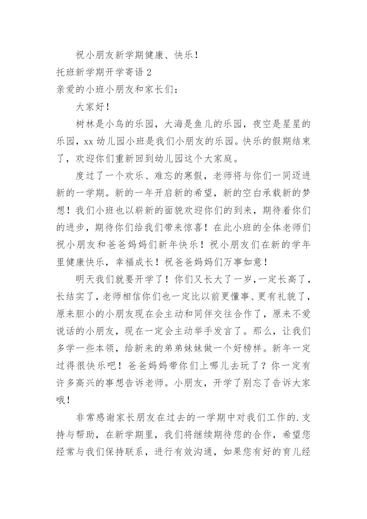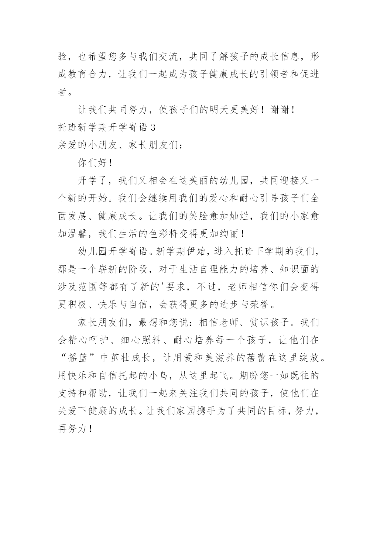 托班新学期开学寄语 托班新学期开学寄语在日复一日的学习、工作或生活中,大家都经常接触到寄语吧,寄语的文体没有严格限制,可以是诗歌、散文或者随笔。什么样的寄语才是好的呢?以下是小编整理的托班新学期开学寄语,欢迎大家借鉴与参考,希望对大家有所帮助。托班新学期开学寄语1亲爱的小朋友们:你们即将成为小班的小哥哥小姐姐了,会交到更多的朋友,学到更多的本领,是不是很开心呢!到了幼儿园你要做什么呢?见到老师问个好,见到朋友抱一抱,见到不认识的新朋友怎么办?我们来想想——是不是可以对新朋友说:"你好,我是xxx,我们一起玩好吗?"还有其它的办法吗?你可以试试,一定很不错喔!我们现在是中班啦,你一进幼儿园能找到我们的`教室吗?我们的教室在一进幼儿园右边的教室哦!新学期开始了,由x老师、x老师还有x老师和你们一起生活,在这个快乐的集体里,我们一起学习、生活、游戏、交往、参观、远足……在这些丰富而有趣的活动中,你们会更加快乐,也会变得越来越聪明能干、活泼健康、自信且富有创造性……祝小朋友新学期健康、快乐!托班新学期开学寄语2亲爱的小班小朋友和家长们:大家好!树林是小鸟的乐园,大海是鱼儿的乐园,夜空是星星的乐园,xx幼儿园小班是我们小朋友的乐园。快乐的假期结束了,欢迎你们重新回到幼儿园这个大家庭。度过了一个欢乐、难忘的寒假,老师将与你们一同迈进新的一学期。新的一年开启新的希望,新的空白承载新的梦想!我们小班也以崭新的面貌欢迎你们的到来,期待着你们的进步,期待你们给我们带来惊喜!在此小班的全体老师们祝小朋友和爸爸妈妈们新年快乐!祝小朋友们在新的学年里健康快乐,幸福成长!祝爸爸妈妈们万事如意!明天我们就要开学了!你们又长大了一岁,一定长高了,长结实了,老师相信你们也一定比以前更懂事、更有礼貌了,原来胆小的小朋友现在会主动和同伴交往合作了,原来不爱说话的小朋友,现在一定会主动举手发言了。那么,让我们多学一些本领,给新来的弟弟妹妹做一个好榜样。新年一定过得很快乐吧!爸爸妈妈带你们上哪儿去玩了?你一定有许多高兴的事想告诉老师。小朋友,开学了别忘了告诉大家哦!非常感谢家长朋友在过去的一学期中对我们工作的.支持与帮助,在新学期里,我们将继续期待您的合作,希望您经常与我们保持联系,进行有效沟通,如果您有好的育儿经验,也希望您多与我们交流,共同了解孩子的成长信息,形成教育合力,让我们一起成为孩子健康成长的引领者和促进者。让我们共同努力,使孩子们的明天更美好!谢谢!托班新学期开学寄语3亲爱的小朋友、家长朋友们:你们好!开学了,我们又相会在这美丽的幼儿园,共同迎接又一个新的开始。我们会继续用我们的爱心和耐心引导孩子们全面发展、健康成长。让我们的笑脸愈加灿烂,我们的小家愈加温馨,我们生活的色彩将变得更加绚丽!幼儿园开学寄语。新学期伊始,进入托班下学期的我们,那是一个崭新的阶段,对于生活自理能力的培养、知识面的涉及范围等都有了新的'要求,不过,老师相信你们会变得更积极、快乐与自信,会获得更多的进步与荣誉。家长朋友们,最想和您说:相信老师、赏识孩子。我们会精心呵护、细心照料、耐心培养每一个孩子,让他们在“摇篮”中茁壮成长,让用爱和美滋养的蓓蕾在这里绽放。用快乐和自信托起的小鸟,从这里起飞。期盼您一如既往的支持和帮助,让我们一起来关注我们共同的孩子,使他们在关爱下健康的成长。让我们家园携手为了共同的目标,努力,再努力!