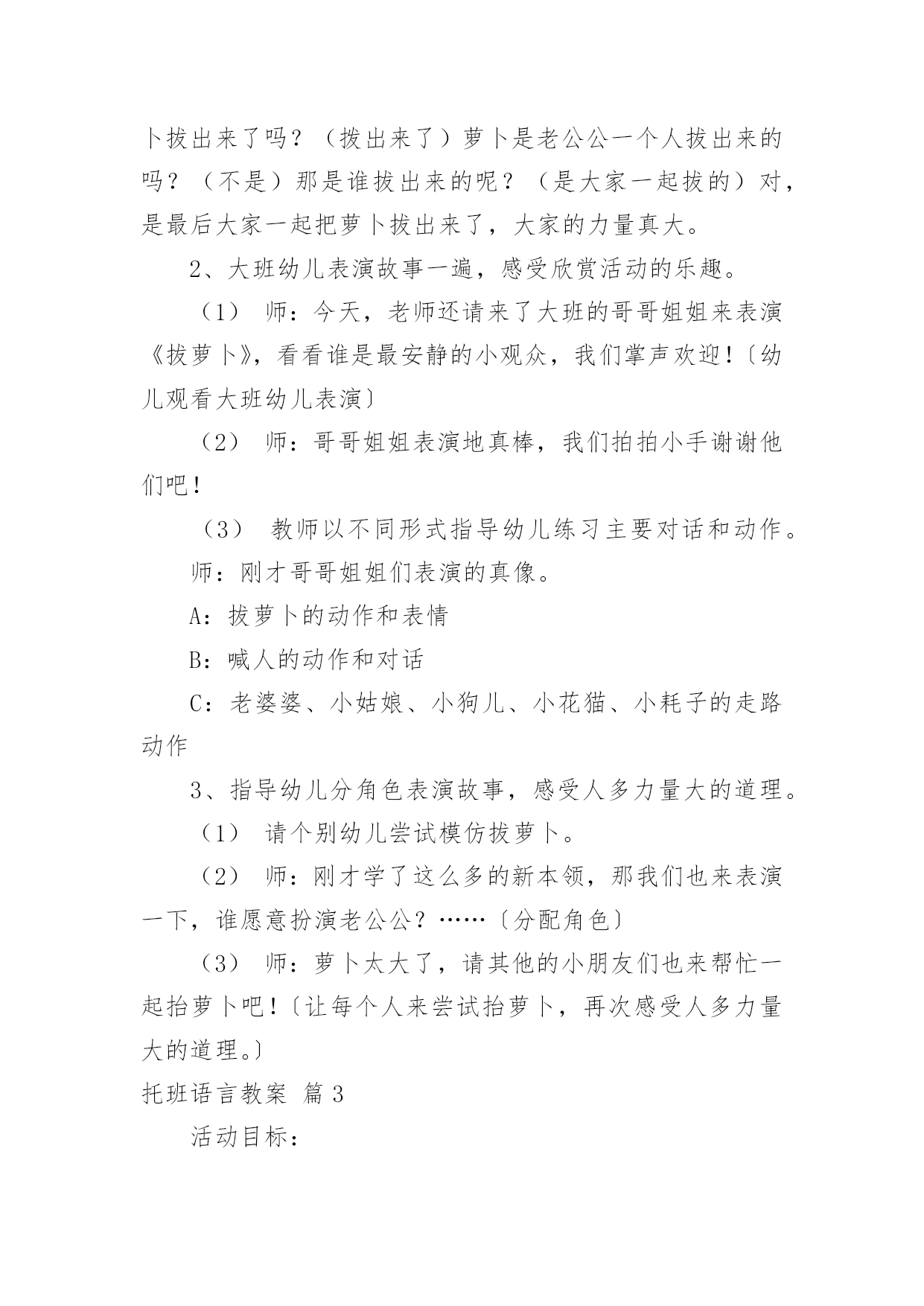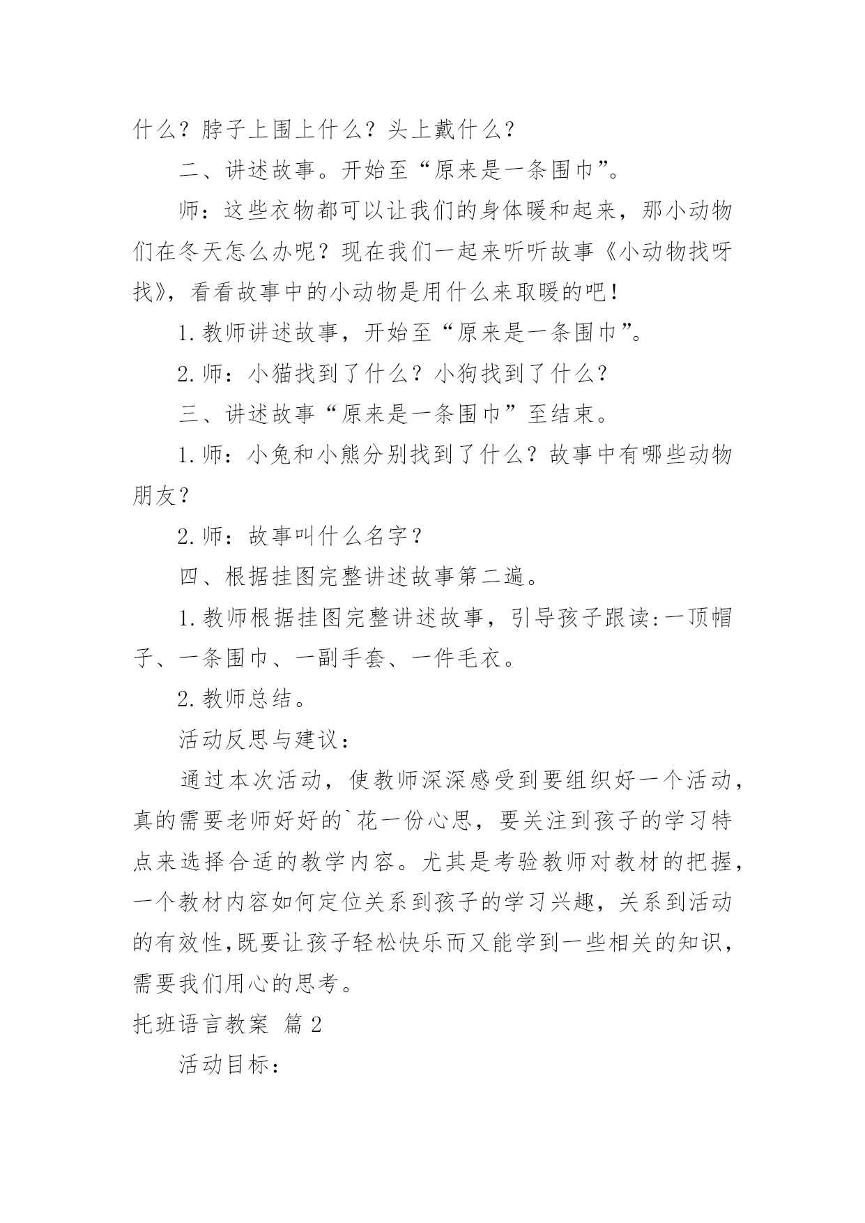 托班语言教案 【实用】托班语言教案三篇作为一名人民教师,时常要开展教案准备工作,编写教案有利于我们准确把握教材的重点与难点,进而选择恰当的教学方法。怎样写教案才更能起到其作用呢?以下是小编为大家整理的托班语言教案3篇,仅供参考,希望能够帮助到大家。托班语言教案篇1活动目标:1.通过活动引发幼儿的好奇心,激发幼儿的探索欲望。2.帮助幼儿积累相关的认知经验,鼓励幼儿开口说。活动准备:1.图谱。2.小狗小猫等卡片。活动过程:一、教师与幼儿自由交流经验师:小朋友们有没有发现今天啊班里多了许多的客人老师,他们啊是来瞧瞧托(2)班小朋友表现的棒不棒,小朋友们棒不棒啊?1.谈话导入。师:小朋友们现在是冬天,冬天会刮风,下雪,天气非常冷。所以小朋友的爸爸妈妈会给你们穿什么呀?手上戴上什么?脖子上围上什么?头上戴什么?二、讲述故事。开始至“原来是一条围巾”。师:这些衣物都可以让我们的身体暖和起来,那小动物们在冬天怎么办呢?现在我们一起来听听故事《小动物找呀找》,看看故事中的小动物是用什么来取暖的吧!1.教师讲述故事,开始至“原来是一条围巾”。2.师:小猫找到了什么?小狗找到了什么?三、讲述故事“原来是一条围巾”至结束。1.师:小兔和小熊分别找到了什么?故事中有哪些动物朋友?2.师:故事叫什么名字?四、根据挂图完整讲述故事第二遍。1.教师根据挂图完整讲述故事,引导孩子跟读:一顶帽子、一条围巾、一副手套、一件毛衣。2.教师总结。活动反思与建议:通过本次活动,使教师深深感受到要组织好一个活动,真的需要老师好好的`花一份心思,要关注到孩子的学习特点来选择合适的教学内容。尤其是考验教师对教材的把握,一个教材内容如何定位关系到孩子的学习兴趣,关系到活动的有效性,既要让孩子轻松快乐而又能学到一些相关的知识,需要我们用心的思考。托班语言教案篇2活动目标:1、能安静听故事,理解故事内容并学说主要对话。2、分角色进行简单的表演,知道人多力量大的道理。活动重点:学说故事中主要的对话,分角色进行简单的表演。活动难点:知道人多力量大的道理。活动准备:1、请大班幼儿准备故事表演,故事和舞蹈的背景音乐。2、表演故事用的'道具(大萝卜、胡子、围裙)和头饰(老公公、老婆婆、小姑娘、小狗儿、小花猫、小耗子)。3、背景图一幅、萝卜等贴绒若干。活动过程:1、出示老公公,边讲述故事边出示贴绒教具,引导幼儿学说主要对话。(1)师:看,是谁来了?(老公公)〔讲述故事第一段后出示背景图〕(2)继续讲述故事,引导幼儿边说边做动作,“嗨哟,嗨哟”“×××,×××,快来帮忙拔萝卜!”“唉——来了,来了。”问1:老婆婆去叫谁了啊?问2:小姑娘怎么说的?问3:小狗说……问4:小狗喊……(3)师:小朋友真棒,跟老师一起把故事讲完了,萝卜拔出来了吗?(拨出来了)萝卜是老公公一个人拔出来的吗?(不是)那是谁拔出来的呢?(是大家一起拔的)对,是最后大家一起把萝卜拔出来了,大家的力量真大。2、大班幼儿表演故事一遍,感受欣赏活动的乐趣。(1)师:今天,老师还请来了大班的哥哥姐姐来表演《拔萝卜》,看看谁是最安静的小观众,我们掌声欢迎!〔幼儿观看大班幼儿表演〕(2)师:哥哥姐姐表演地真棒,我们拍拍小手谢谢他们吧!(3)教师以不同形式指导幼儿练习主要对话和动作。师:刚才哥哥姐姐们表演的真像。A:拔萝卜的动作和表情B:喊人的动作和对话C:老婆婆、小姑娘、小狗儿、小花猫、小耗子的走路动作3、指导幼儿分角色表演故事,感受人多力量大的道理。(1)请个别幼儿尝试模仿拔萝卜。(2)师:刚才学了这么多的新本领,那我们也来表演一下,谁愿意扮演老公公?……〔分配角色〕(3)师:萝卜太大了,请其他的小朋友们也来帮忙一起抬萝卜吧!〔让每个人来尝试抬萝卜,再次感受人多力量大的道理。〕托班语言教案篇3活动目标:听信号稳步地四散走材料:穿线的旧纸盒、娃娃等玩具若干只活动过程:1、幼儿每人一辆拉线的`纸车,自主地挑选一只玩具娃娃放在拉线纸车里,在场地上四散随意走。2、幼儿走了若干圈后,听到教师说“娃娃要回家了”的信号后,将娃娃拉到家门口,放娃娃到老师身边休息。3、师生交流游戏情况。4、幼儿再次选娃娃,进行“我陪娃娃出去玩”的游戏。活动建议:1.拖拉线的长约80cm,线不宜太细。2.娃娃家的门口要设4-5个,避免幼儿拥挤。活动二:大家玩得真高兴活动内容:大家玩得真高兴(阅读)材料:图片、儿歌《大家玩得真高兴》活动过程:1.幼儿随意阅读,教师个别指导。2.教师出示挂图,朗读儿歌。3.幼儿边看书边听教师朗读。4.教师放慢速度,引导幼儿跟读儿歌。活动建议:教师活动前将儿歌录音,活动中可以多次播放录音,便于幼儿反复感受和模仿。附儿歌:大家玩得真高兴小朋友,快来看,幼儿园里玩具多,有汽车,有积木,还有一个布娃娃,你来玩,我来玩,大家玩得真高兴。