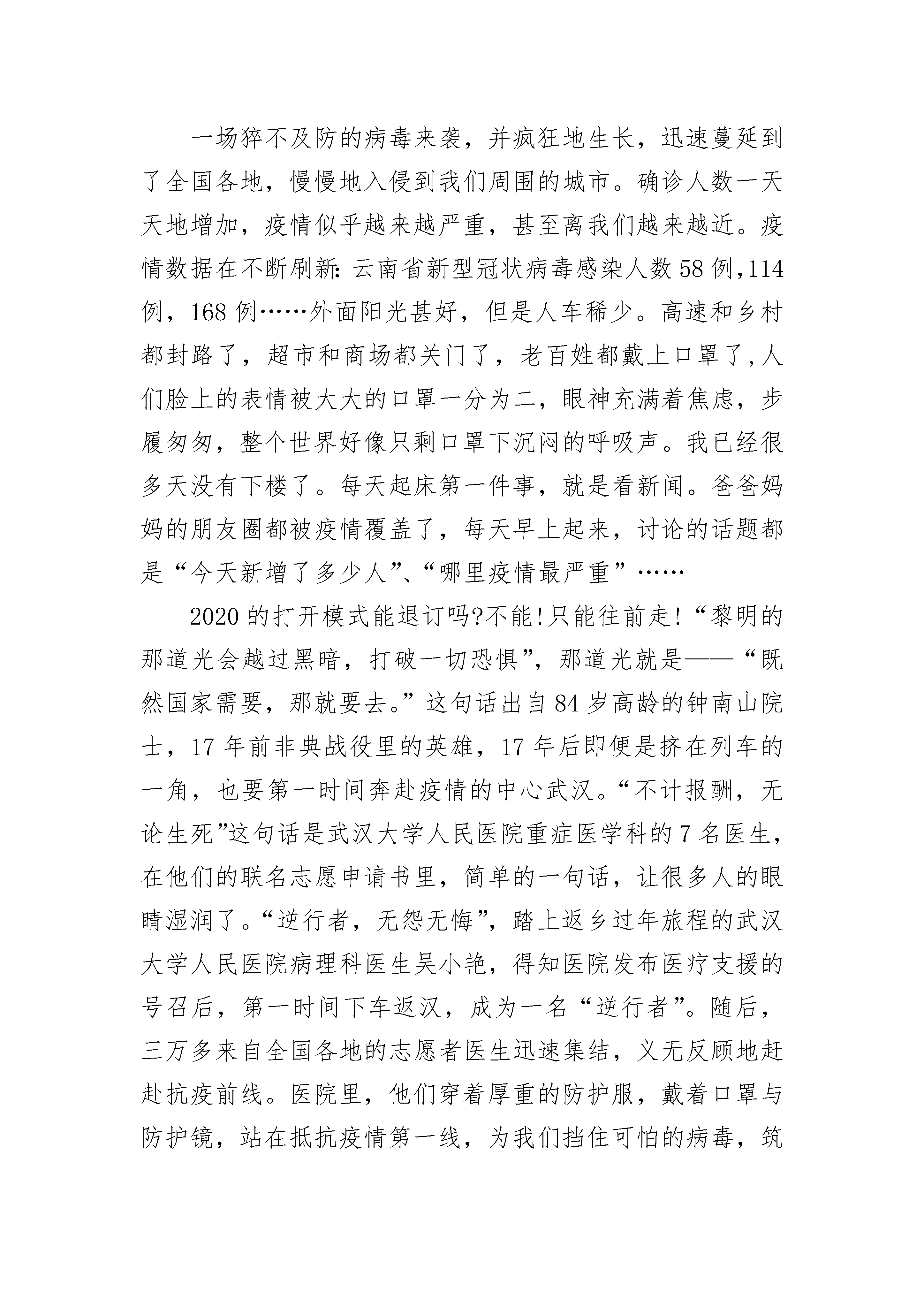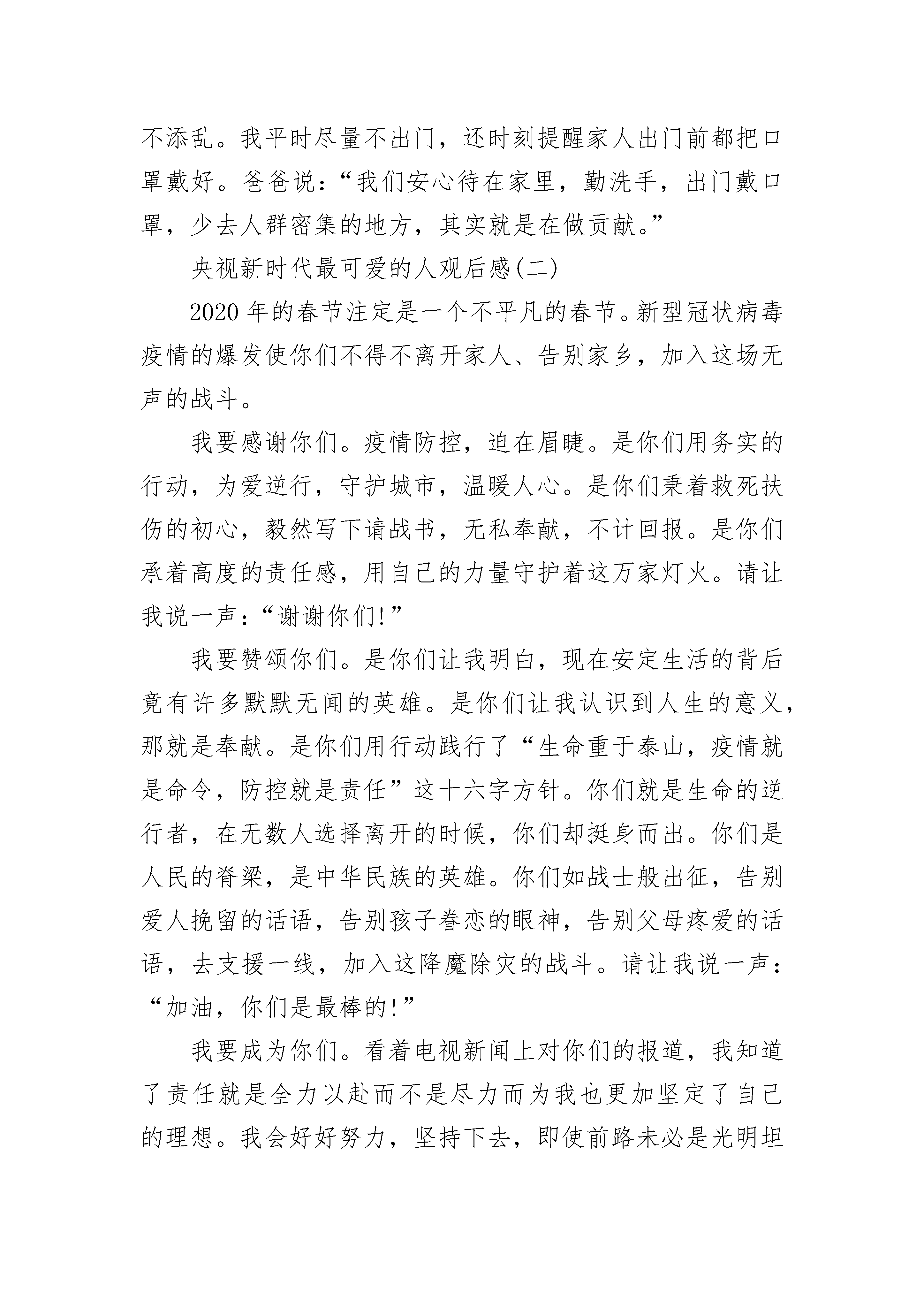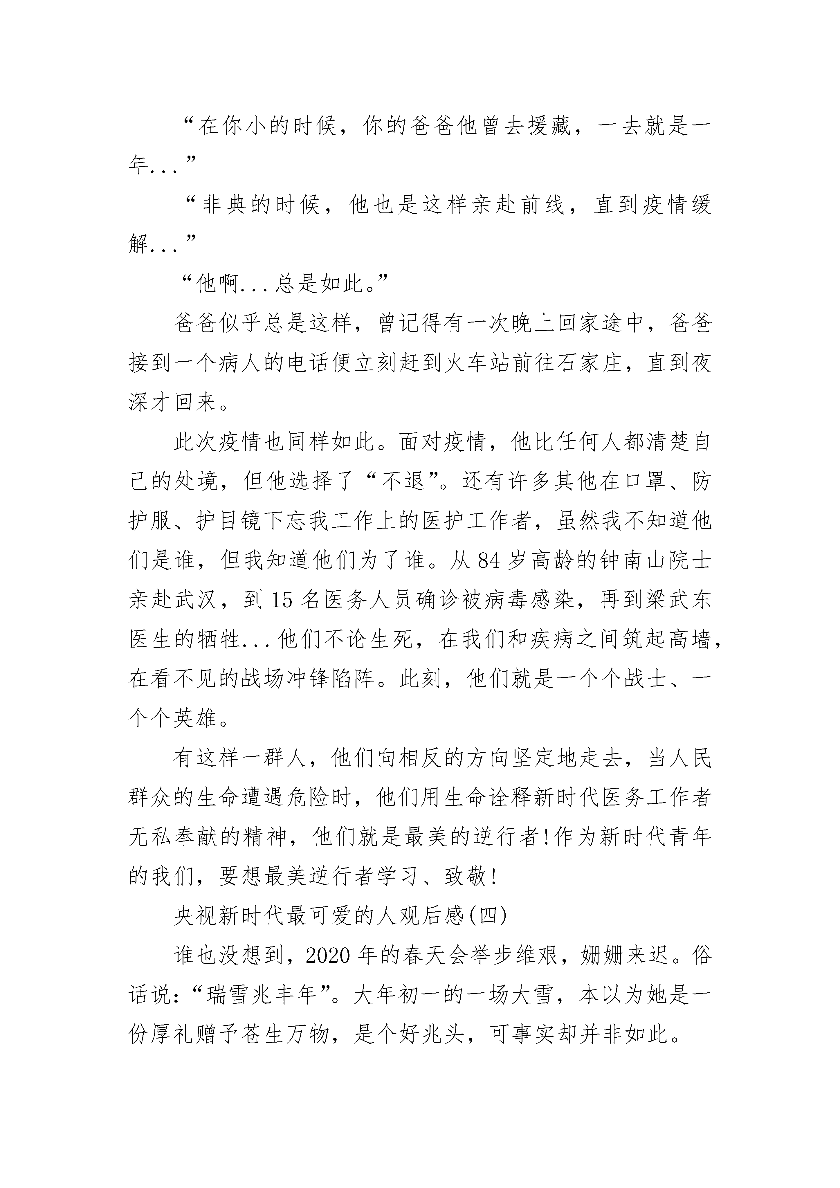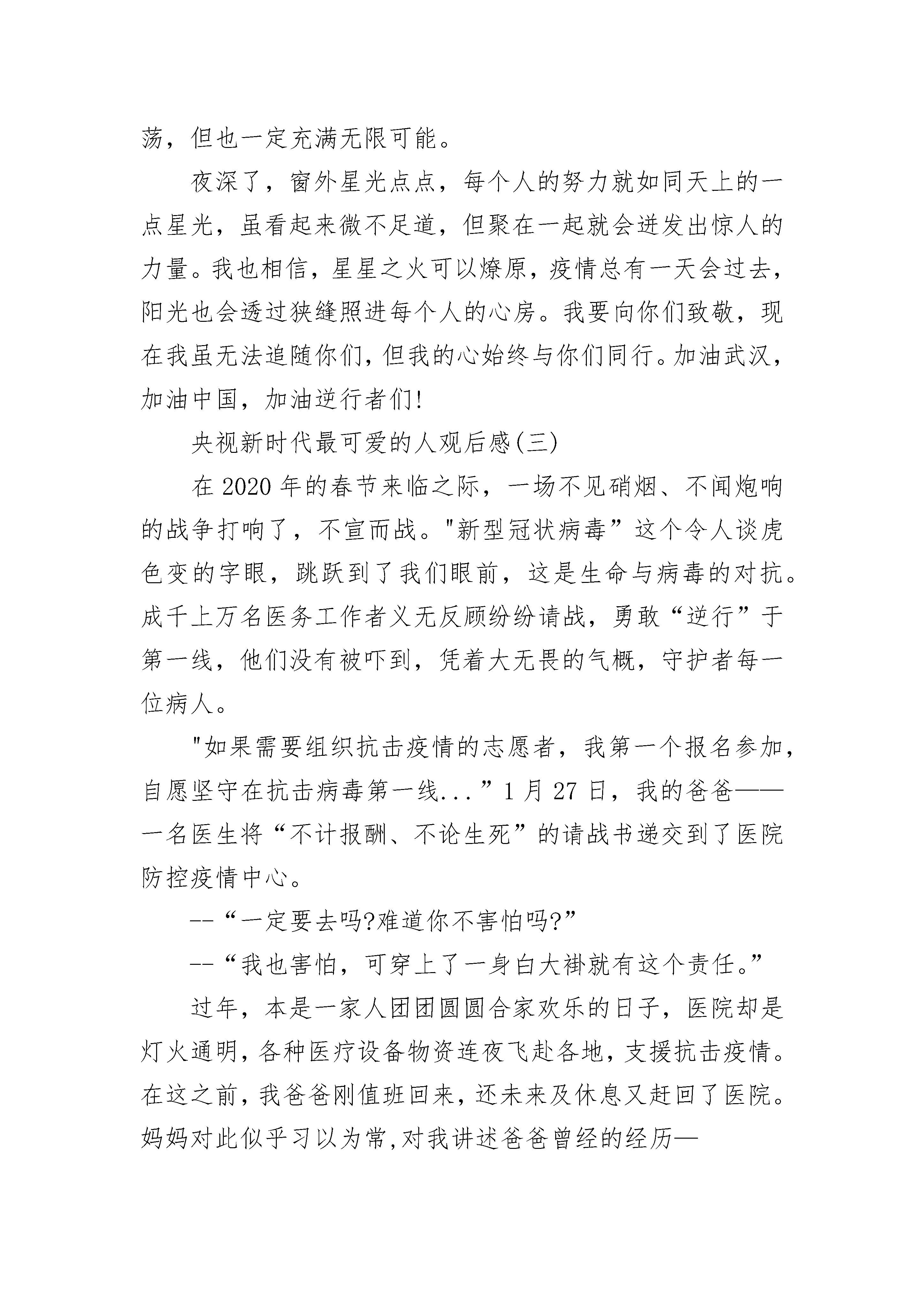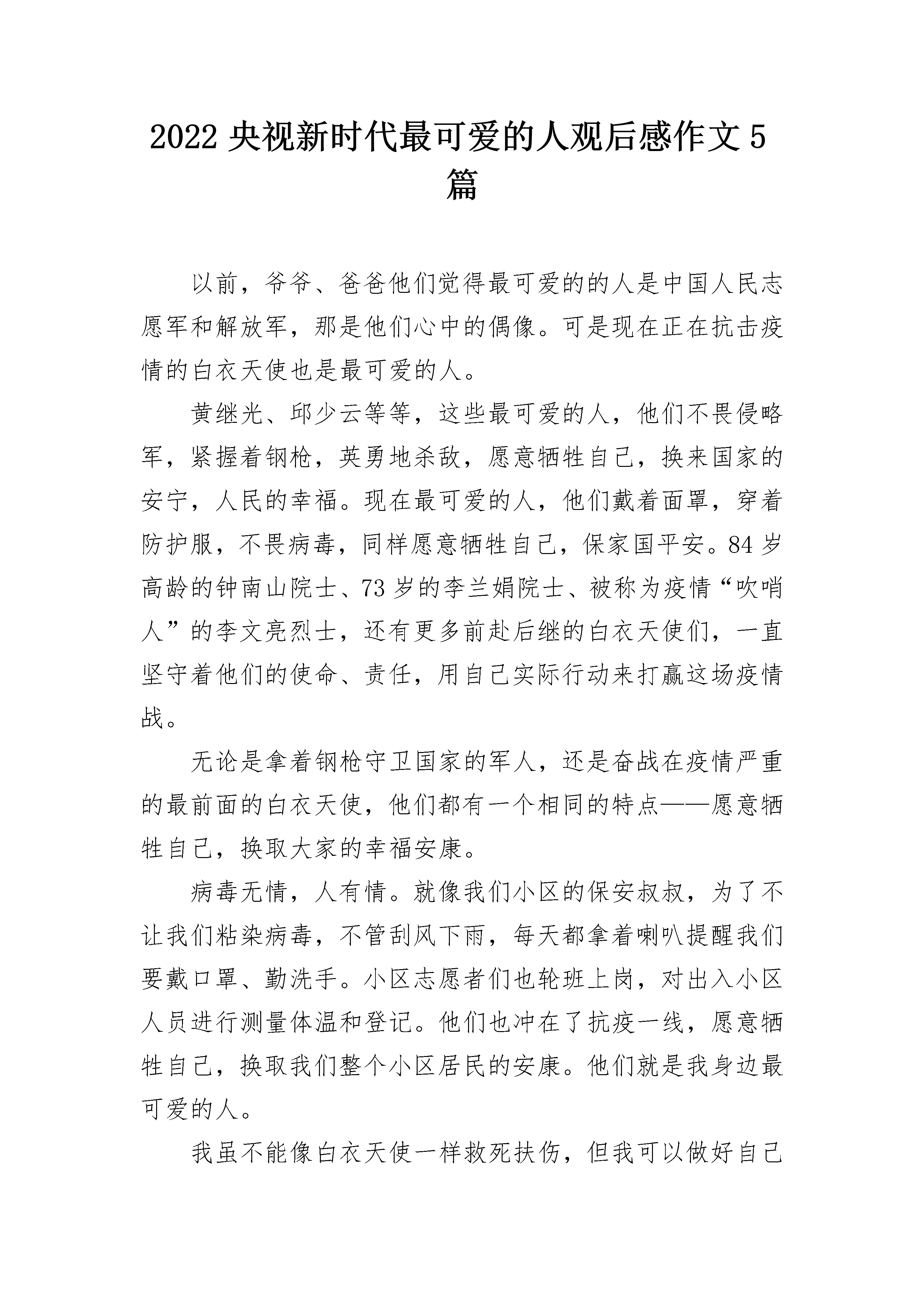 2022央视新时代最可爱的人观后感作文5篇以前,爷爷、爸爸他们觉得最可爱的的人是中国人民志愿军和解放军,那是他们心中的偶像。可是现在正在抗击疫情的白衣天使也是最可爱的人。黄继光、邱少云等等,这些最可爱的人,他们不畏侵略军,紧握着钢枪,英勇地杀敌,愿意牺牲自己,换来国家的安宁,人民的幸福。现在最可爱的人,他们戴着面罩,穿着防护服,不畏病毒,同样愿意牺牲自己,保家国平安。84岁高龄的钟南山院士、73岁的李兰娟院士、被称为疫情“吹哨人”的李文亮烈士,还有更多前赴后继的白衣天使们,一直坚守着他们的使命、责任,用自己实际行动来打赢这场疫情战。无论是拿着钢枪守卫国家的军人,还是奋战在疫情严重的最前面的白衣天使,他们都有一个相同的特点——愿意牺牲自己,换取大家的幸福安康。病毒无情,人有情。就像我们小区的保安叔叔,为了不让我们粘染病毒,不管刮风下雨,每天都拿着喇叭提醒我们要戴口罩、勤洗手。小区志愿者们也轮班上岗,对出入小区人员进行测量体温和登记。他们也冲在了抗疫一线,愿意牺牲自己,换取我们整个小区居民的安康。他们就是我身边最可爱的人。我虽不能像白衣天使一样救死扶伤,但我可以做好自己不添乱。我平时尽量不出门,还时刻提醒家人出门前都把口罩戴好。爸爸说:“我们安心待在家里,勤洗手,出门戴口罩,少去人群密集的地方,其实就是在做贡献。”央视新时代最可爱的人观后感(二)2020年的春节注定是一个不平凡的春节。新型冠状病毒疫情的爆发使你们不得不离开家人、告别家乡,加入这场无声的战斗。我要感谢你们。疫情防控,迫在眉睫。是你们用务实的行动,为爱逆行,守护城市,温暖人心。是你们秉着救死扶伤的初心,毅然写下请战书,无私奉献,不计回报。是你们承着高度的责任感,用自己的力量守护着这万家灯火。请让我说一声:“谢谢你们!”我要赞颂你们。是你们让我明白,现在安定生活的背后竟有许多默默无闻的英雄。是你们让我认识到人生的意义,那就是奉献。是你们用行动践行了“生命重于泰山,疫情就是命令,防控就是责任”这十六字方针。你们就是生命的逆行者,在无数人选择离开的时候,你们却挺身而出。你们是人民的脊梁,是中华民族的英雄。你们如战士般出征,告别爱人挽留的话语,告别孩子眷恋的眼神,告别父母疼爱的话语,去支援一线,加入这降魔除灾的战斗。请让我说一声:“加油,你们是最棒的!”我要成为你们。看着电视新闻上对你们的报道,我知道了责任就是全力以赴而不是尽力而为我也更加坚定了自己的理想。我会好好努力,坚持下去,即使前路未必是光明坦荡,但也一定充满无限可能。夜深了,窗外星光点点,每个人的努力就如同天上的一点星光,虽看起来微不足道,但聚在一起就会迸发出惊人的力量。我也相信,星星之火可以燎原,疫情总有一天会过去,阳光也会透过狭缝照进每个人的心房。我要向你们致敬,现在我虽无法追随你们,但我的心始终与你们同行。加油武汉,加油中国,加油逆行者们!央视新时代最可爱的人观后感(三)在2020年的春节来临之际,一场不见硝烟、不闻炮响的战争打响了,不宣而战。"新型冠状病毒”这个令人谈虎色变的字眼,跳跃到了我们眼前,这是生命与病毒的对抗。成千上万名医务工作者义无反顾纷纷请战,勇敢“逆行”于第一线,他们没有被吓到,凭着大无畏的气概,守护者每一位病人。"如果需要组织抗击疫情的志愿者,我第一个报名参加,自愿坚守在抗击病毒第一线...”1月27日,我的爸爸——一名医生将“不计报酬、不论生死”的请战书递交到了医院防控疫情中心。--“一定要去吗?难道你不害怕吗?”--“我也害怕,可穿上了一身白大褂就有这个责任。”过年,本是一家人团团圆圆合家欢乐的日子,医院却是灯火通明,各种医疗设备物资连夜飞赴各地,支援抗击疫情。在这之前,我爸爸刚值班回来,还未来及休息又赶回了医院。妈妈对此似乎习以为常,对我讲述爸爸曾经的经历—“在你小的时候,你的爸爸他曾去援藏,一去就是一年...”“非典的时候,他也是这样亲赴前线,直到疫情缓解...”“他啊...总是如此。”爸爸似乎总是这样,曾记得有一次晚上回家途中,爸爸接到一个病人的电话便立刻赶到火车站前往石家庄,直到夜深才回来。此次疫情也同样如此。面对疫情,他比任何人都清楚自己的处境,但他选择了“不退”。还有许多其他在口罩、防护服、护目镜下忘我工作上的医护工作者,虽然我不知道他们是谁,但我知道他们为了谁。从84岁高龄的钟南山院士亲赴武汉,到15名医务人员确诊被病毒感染,再到梁武东医生的牺牲...他们不论生死,在我们和疾病之间筑起高墙,在看不见的战场冲锋陷阵。此刻,他们就是一个个战士、一个个英雄。有这样一群人,他们向相反的方向坚定地走去,当人民群众的生命遭遇危险时,他们用生命诠释新时代医务工作者无私奉献的精神,他们就是最美的逆行者!作为新时代青年的我们,要想最美逆行者学习、致敬!央视新时代最可爱的人观后感(四)谁也