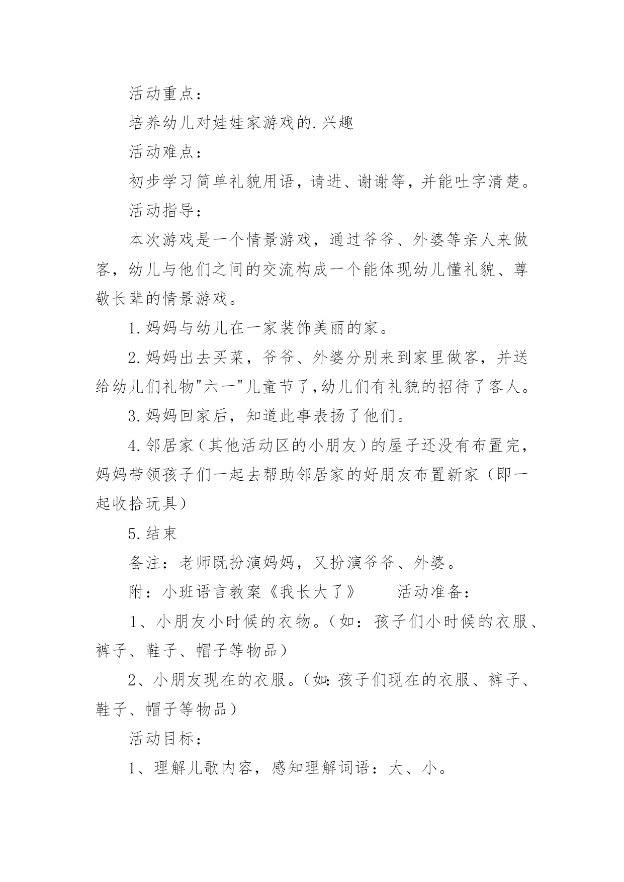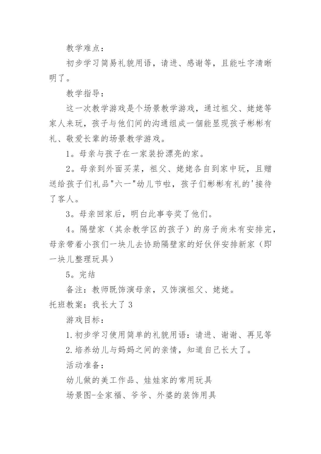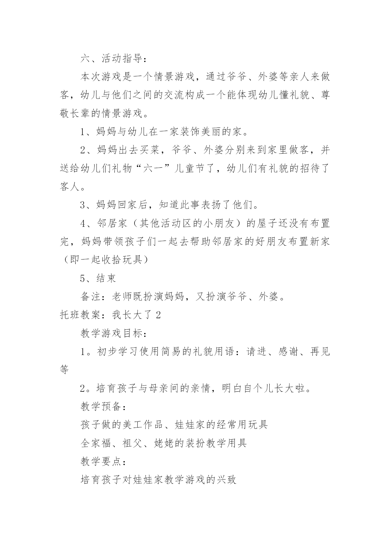 托班教案:我长大了 托班教案:我长大了4篇作为一位兢兢业业的人民教师,有必要进行细致的教案准备工作,借助教案可以恰当地选择和运用教学方法,调动学生学习的积极性。如何把教案做到重点突出呢?以下是小编为大家收集的托班教案:我长大了,欢迎大家借鉴与参考,希望对大家有所帮助。托班教案:我长大了1一、游戏名称:娃娃家游戏——我长大了二、游戏目标:1、初步学习使用简单的礼貌用语:请进、谢谢、再见等2、培养幼儿与妈妈之间的亲情,知道自己长大了。三、活动准备:幼儿做的美工作品、娃娃家的常用玩具场景图—全家福、爷爷、外婆的装饰用具四、活动重点:培养幼儿对娃娃家游戏的`兴趣五、活动难点:初步学习简单礼貌用语,请进、谢谢等,并能吐字清楚。六、活动指导:本次游戏是一个情景游戏,通过爷爷、外婆等亲人来做客,幼儿与他们之间的交流构成一个能体现幼儿懂礼貌、尊敬长辈的情景游戏。1、妈妈与幼儿在一家装饰美丽的家。2、妈妈出去买菜,爷爷、外婆分别来到家里做客,并送给幼儿们礼物“六一”儿童节了,幼儿们有礼貌的招待了客人。3、妈妈回家后,知道此事表扬了他们。4、邻居家(其他活动区的小朋友)的屋子还没有布置完,妈妈带领孩子们一起去帮助邻居家的好朋友布置新家(即一起收拾玩具)5、结束备注:老师既扮演妈妈,又扮演爷爷、外婆。托班教案:我长大了2教学游戏目标:1。初步学习使用简易的礼貌用语:请进、感谢、再见等2。培育孩子与母亲间的亲情,明白自个儿长大啦。教学预备:孩子做的美工作品、娃娃家的经常用玩具全家福、祖父、姥姥的装扮教学用具教学要点:培育孩子对娃娃家教学游戏的兴致教学难点:初步学习简易礼貌用语,请进、感谢等,且能吐字清晰明了。教学指导:这一次教学游戏是个场景教学游戏,通过祖父、姥姥等家人来玩,孩子与他们间的沟通组成一個能显现孩子彬彬有礼、敬爱长辈的场景教学游戏。1。母亲与孩子在一家装扮漂亮的家。2。母亲到外面买菜,祖父、姥姥各自到家中玩,且赠送给孩子们礼品"六一"幼儿节啦,孩子们彬彬有礼的'接待了客人。3。母亲回家后,明白此事夸奖了他们。4。隔壁家(其余教学区的孩子)的房子尚未有安排完,母亲带着小孩们一块儿去协助隔壁家的好伙伴安排新家(即一块儿整理玩具)5。完结备注:教师既饰演母亲,又饰演祖父、姥姥。托班教案:我长大了3游戏目标:1.初步学习使用简单的礼貌用语:请进、谢谢、再见等2.培养幼儿与妈妈之间的亲情,知道自己长大了。活动准备:幼儿做的美工作品、娃娃家的常用玩具场景图-全家福、爷爷、外婆的装饰用具活动重点:培养幼儿对娃娃家游戏的.兴趣活动难点:初步学习简单礼貌用语,请进、谢谢等,并能吐字清楚。活动指导:本次游戏是一个情景游戏,通过爷爷、外婆等亲人来做客,幼儿与他们之间的交流构成一个能体现幼儿懂礼貌、尊敬长辈的情景游戏。1.妈妈与幼儿在一家装饰美丽的家。2.妈妈出去买菜,爷爷、外婆分别来到家里做客,并送给幼儿们礼物"六一"儿童节了,幼儿们有礼貌的招待了客人。3.妈妈回家后,知道此事表扬了他们。4.邻居家(其他活动区的小朋友)的屋子还没有布置完,妈妈带领孩子们一起去帮助邻居家的好朋友布置新家(即一起收拾玩具)5.结束备注:老师既扮演妈妈,又扮演爷爷、外婆。附:小班语言教案《我长大了》活动准备:1、小朋友小时候的衣物。(如:孩子们小时候的衣服、裤子、鞋子、帽子等物品)2、小朋友现在的衣服。(如:孩子们现在的衣服、裤子、鞋子、帽子等物品)活动目标:1、理解儿歌内容,感知理解词语:大、小。2、尝试运用各种感官,感知自己长大了。活动过程:一、幼儿通过感官感知大、小。1、教师带领幼儿参观自己带来的衣物,请幼儿找找哪些东西大、哪些东西小,感知大与小。教师:今天,你们带了自己小时候的衣服和小时候的衣服来幼儿园,你们现在看一看小时候的衣服和现在的衣服有什么区别。1、引导幼儿穿一穿小时候的衣服,感知大与小。教师:小朋友们可以试一试穿一下自己小时候的'衣服,看看是什么感觉?二、幼儿通过欣赏儿歌感知自己长大了。1、展示幼儿带来的小衣服。教师:这些小衣服现在能穿吗?教师:为什么穿不了了呢?教师:那小袜子呢?小鞋子呢》小帽子呢?能穿吗?为什么不能穿呢?教师:哦!原来我们长大了。2、教师完整的朗诵一遍儿歌。教师:今天老师就要念一首《我长大了》的儿歌给小朋友听一听。三、幼儿学习儿歌。1、帮助幼儿理解儿歌内容。教师:儿歌里说到了哪些东西变小了?(出示相应的实物)哪些东西变大了?(带幼儿做相应的动作)2、引导幼儿完整的朗读儿歌。四、幼儿讲述自己长大了的变化。教师:我们长大了,还有什么方面发生了变化呢?请你和旁边的好朋友说一说。教师:那个小朋友愿意上台来告诉我们自己的发现哪些变化?教师:现在,请小朋友们再把儿歌念一遍。五、收拾教具结束本次活动。托班教案:我长大了4一、游戏名称:娃娃家游戏——我长大了