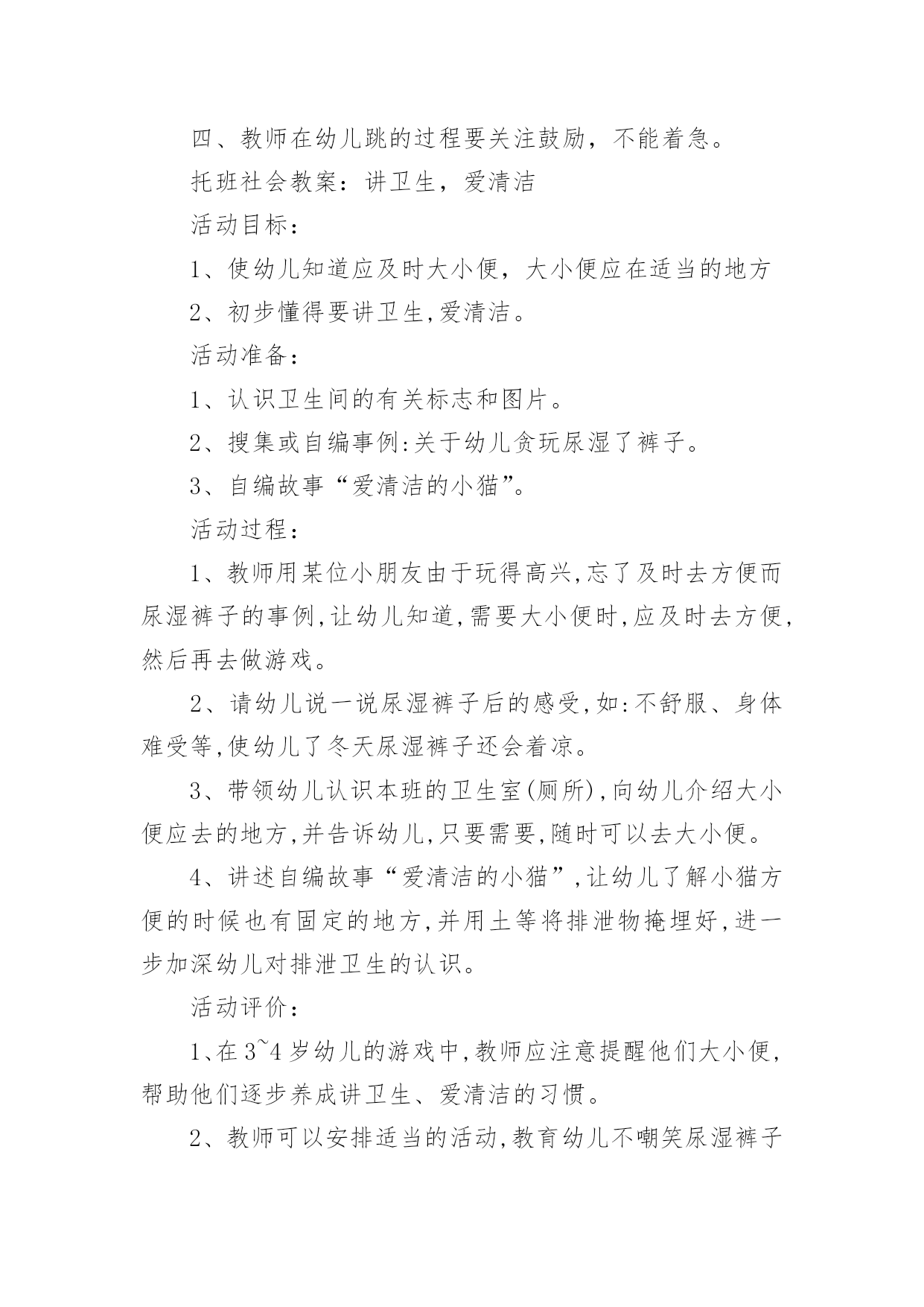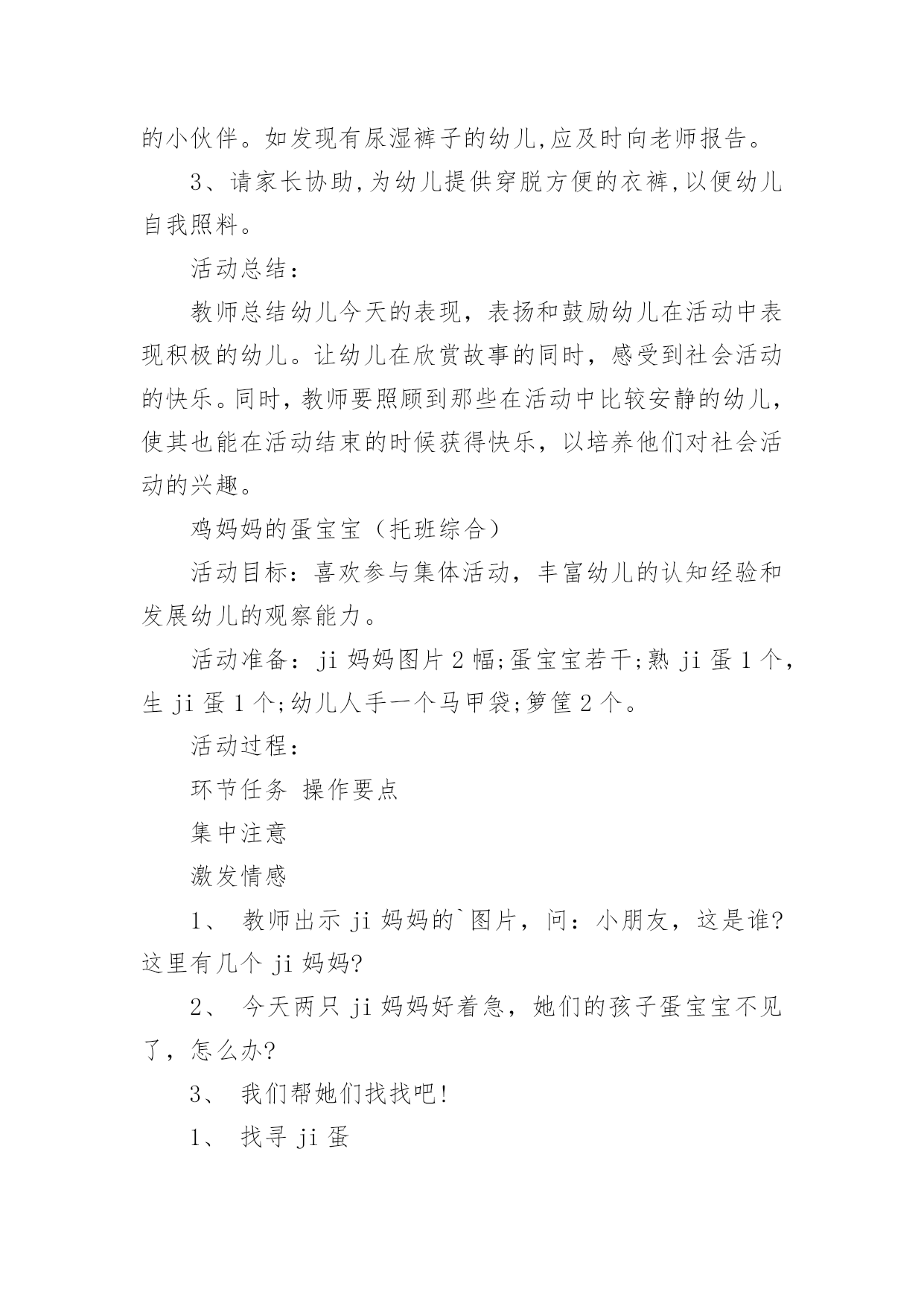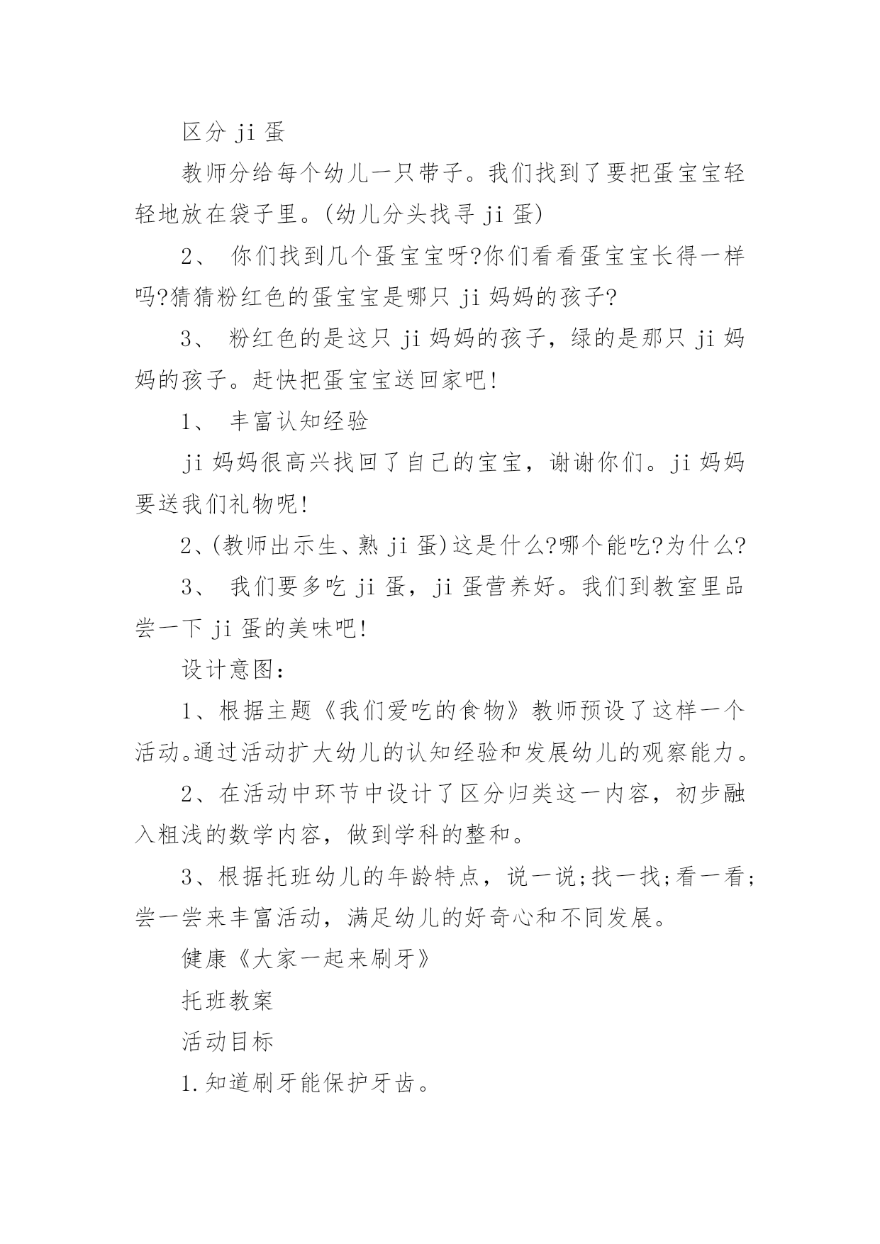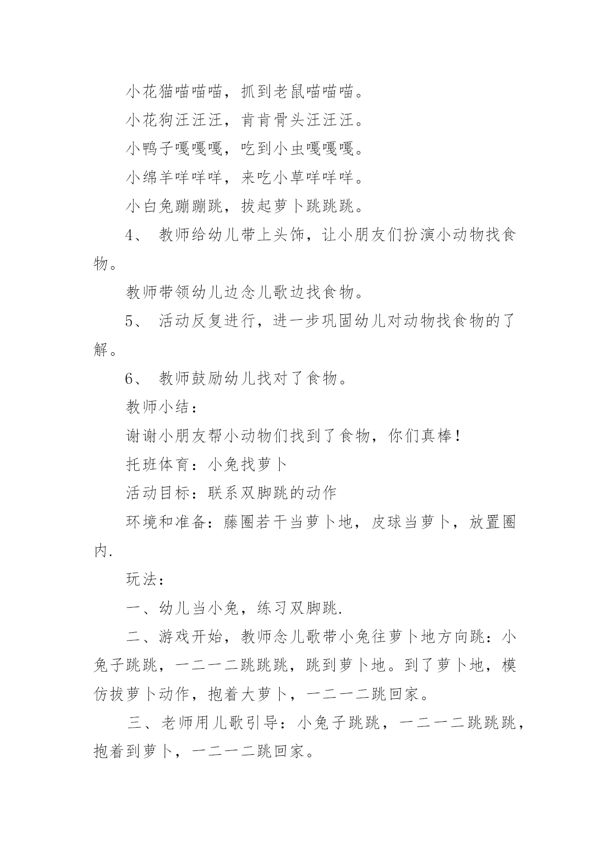 托班益智教案 托班益智教案作为一名教师,通常会被要求编写教案,编写教案助于积累教学经验,不断提高教学质量。那么教案应该怎么写才合适呢?以下是小编帮大家整理的托班益智教案,欢迎阅读与收藏。托班益智教案1活动目标:1、喜欢参加游戏活动。2、注意倾听对方讲话。活动准备:1、小猫、小狗、小羊、小白兔,小鸭子的头饰若干个。3、小鱼、骨头、小草、萝卜,虫子的图案若干个。活动过程:1、教师出示动物头饰,带领幼儿学做动物的样子。我是小花猫,喵喵喵(小狗,小羊,小猴)教师带领幼儿跑一跑,跳一跳)2、教师引导幼儿帮小动物找食物。小动物们肚子饿了,我们来帮小动物找东西吃好吗?小花猫要找什么食物呢?小狗呢……3、边找食物边念儿歌:小花猫喵喵喵,抓到老鼠喵喵喵。小花狗汪汪汪,肯肯骨头汪汪汪。小鸭子嘎嘎嘎,吃到小虫嘎嘎嘎。小绵羊咩咩咩,来吃小草咩咩咩。小白兔蹦蹦跳,拔起萝卜跳跳跳。4、教师给幼儿带上头饰,让小朋友们扮演小动物找食物。教师带领幼儿边念儿歌边找食物。5、活动反复进行,进一步巩固幼儿对动物找食物的了解。6、教师鼓励幼儿找对了食物。教师小结:谢谢小朋友帮小动物们找到了食物,你们真棒!托班体育:小兔找萝卜活动目标:联系双脚跳的动作环境和准备:藤圈若干当萝卜地,皮球当萝卜,放置圈内.玩法:一、幼儿当小兔,练习双脚跳.二、游戏开始,教师念儿歌带小兔往萝卜地方向跳:小兔子跳跳,一二一二跳跳跳,跳到萝卜地。到了萝卜地,模仿拔萝卜动作,抱着大萝卜,一二一二跳回家。三、老师用儿歌引导:小兔子跳跳,一二一二跳跳跳,抱着到萝卜,一二一二跳回家。四、教师在幼儿跳的过程要关注鼓励,不能着急。托班社会教案:讲卫生,爱清洁活动目标:1、使幼儿知道应及时大小便,大小便应在适当的地方2、初步懂得要讲卫生,爱清洁。活动准备:1、认识卫生间的有关标志和图片。2、搜集或自编事例:关于幼儿贪玩尿湿了裤子。3、自编故事“爱清洁的小猫”。活动过程:1、教师用某位小朋友由于玩得高兴,忘了及时去方便而尿湿裤子的事例,让幼儿知道,需要大小便时,应及时去方便,然后再去做游戏。2、请幼儿说一说尿湿裤子后的感受,如:不舒服、身体难受等,使幼儿了冬天尿湿裤子还会着凉。3、带领幼儿认识本班的卫生室(厕所),向幼儿介绍大小便应去的地方,并告诉幼儿,只要需要,随时可以去大小便。4、讲述自编故事“爱清洁的小猫”,让幼儿了解小猫方便的时候也有固定的地方,并用土等将排泄物掩埋好,进一步加深幼儿对排泄卫生的认识。活动评价:1、在3~4岁幼儿的游戏中,教师应注意提醒他们大小便,帮助他们逐步养成讲卫生、爱清洁的习惯。2、教师可以安排适当的活动,教育幼儿不嘲笑尿湿裤子的小伙伴。如发现有尿湿裤子的幼儿,应及时向老师报告。3、请家长协助,为幼儿提供穿脱方便的衣裤,以便幼儿自我照料。活动总结:教师总结幼儿今天的表现,表扬和鼓励幼儿在活动中表现积极的幼儿。让幼儿在欣赏故事的同时,感受到社会活动的快乐。同时,教师要照顾到那些在活动中比较安静的幼儿,使其也能在活动结束的时候获得快乐,以培养他们对社会活动的兴趣。鸡妈妈的蛋宝宝(托班综合)活动目标:喜欢参与集体活动,丰富幼儿的认知经验和发展幼儿的观察能力。活动准备:ji妈妈图片2幅;蛋宝宝若干;熟ji蛋1个,生ji蛋1个;幼儿人手一个马甲袋;箩筐2个。活动过程:环节任务操作要点集中注意激发情感1、教师出示ji妈妈的`图片,问:小朋友,这是谁?这里有几个ji妈妈?2、今天两只ji妈妈好着急,她们的孩子蛋宝宝不见了,怎么办?3、我们帮她们找找吧!1、找寻ji蛋区分ji蛋教师分给每个幼儿一只带子。我们找到了要把蛋宝宝轻轻地放在袋子里。(幼儿分头找寻ji蛋)2、你们找到几个蛋宝宝呀?你们看看蛋宝宝长得一样吗?猜猜粉红色的蛋宝宝是哪只ji妈妈的孩子?3、粉红色的是这只ji妈妈的孩子,绿的是那只ji妈妈的孩子。赶快把蛋宝宝送回家吧!1、丰富认知经验ji妈妈很高兴找回了自己的宝宝,谢谢你们。ji妈妈要送我们礼物呢!2、(教师出示生、熟ji蛋)这是什么?哪个能吃?为什么?3、我们要多吃ji蛋,ji蛋营养好。我们到教室里品尝一下ji蛋的美味吧!设计意图:1、根据主题《我们爱吃的食物》教师预设了这样一个活动。通过活动扩大幼儿的认知经验和发展幼儿的观察能力。2、在活动中环节中设计了区分归类这一内容,初步融入粗浅的数学内容,做到学科的整和。3、根据托班幼儿的年龄特点,说一说;找一找;看一看;尝一尝来丰富活动,满足幼儿的好奇心和不同发展。健康《大家一起来刷牙》托班教案活动目标1.知道刷牙能保护牙齿。2.会模仿成人刷牙。活动准备1.课件—正确的刷牙顺序2.MP3:刷牙歌3.教具--牙刷活动过程一、播放课件:正确的刷牙顺序请宝宝欣赏,吸引宝宝的注意。二、边念歌词,边带领宝宝徒手模仿刷牙动作。1.示范刷牙的正确方法