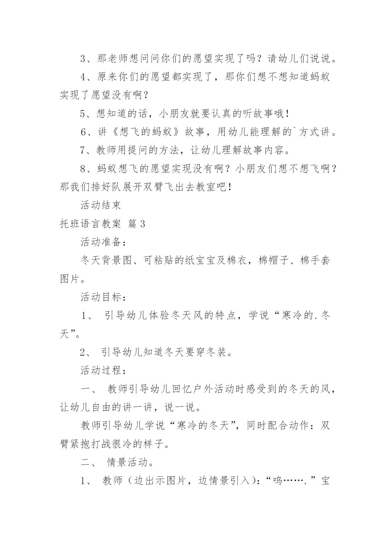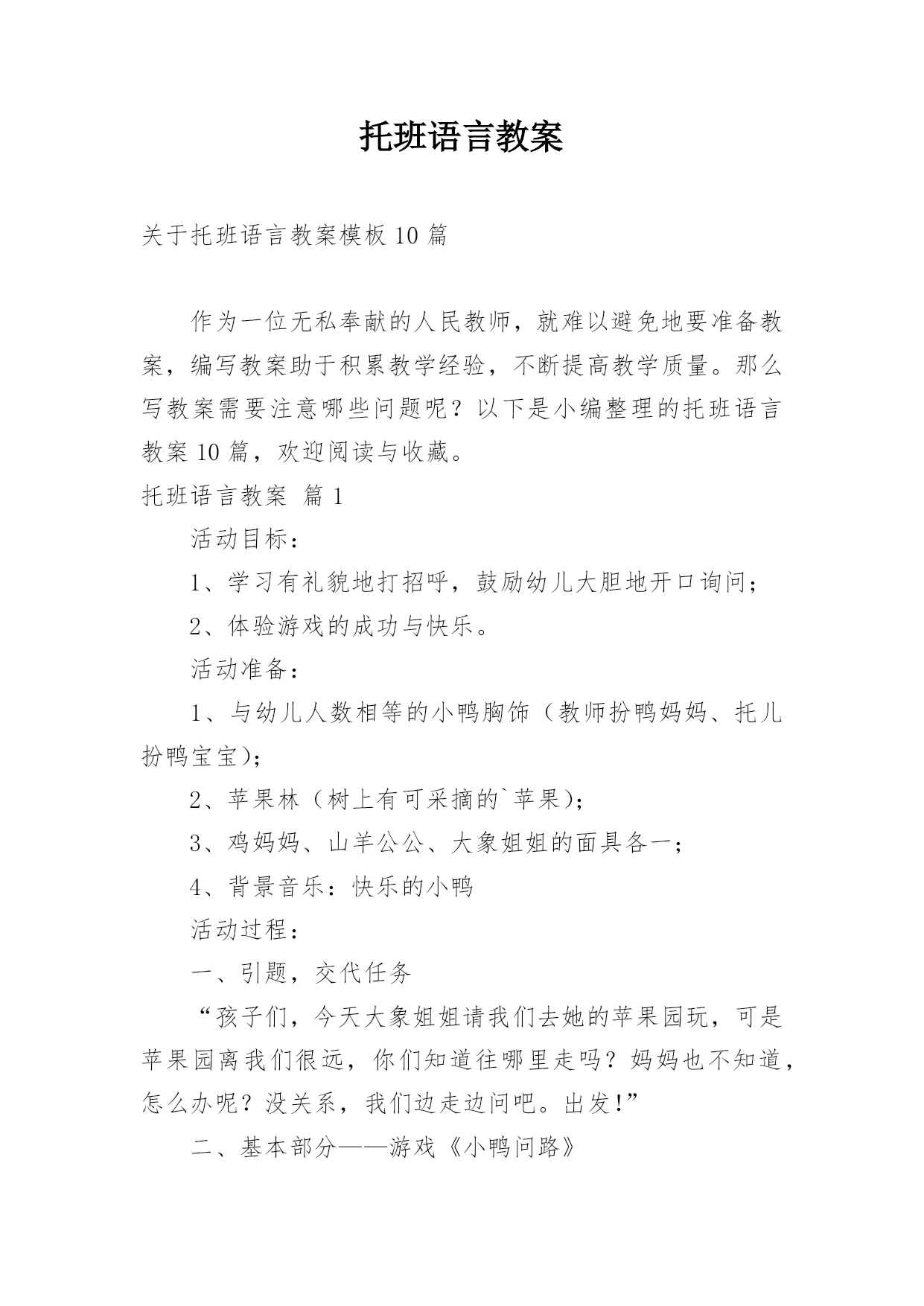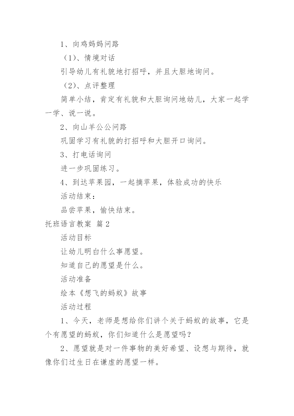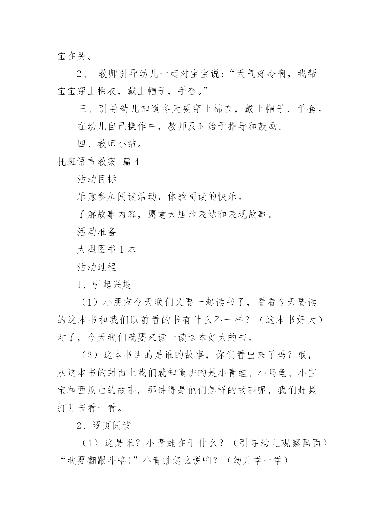 托班语言教案 关于托班语言教案模板10篇作为一位无私奉献的人民教师,就难以避免地要准备教案,编写教案助于积累教学经验,不断提高教学质量。那么写教案需要注意哪些问题呢?以下是小编整理的托班语言教案10篇,欢迎阅读与收藏。托班语言教案篇1活动目标:1、学习有礼貌地打招呼,鼓励幼儿大胆地开口询问;2、体验游戏的成功与快乐。活动准备:1、与幼儿人数相等的小鸭胸饰(教师扮鸭妈妈、托儿扮鸭宝宝);2、苹果林(树上有可采摘的`苹果);3、鸡妈妈、山羊公公、大象姐姐的面具各一;4、背景音乐:快乐的小鸭活动过程:一、引题,交代任务“孩子们,今天大象姐姐请我们去她的苹果园玩,可是苹果园离我们很远,你们知道往哪里走吗?妈妈也不知道,怎么办呢?没关系,我们边走边问吧。出发!”二、基本部分——游戏《小鸭问路》1、向鸡妈妈问路(1)、情境对话引导幼儿有礼貌地打招呼,并且大胆地询问。(2)、点评整理简单小结,肯定有礼貌和大胆询问地幼儿,大家一起学一学、说一说。2、向山羊公公问路巩固学习有礼貌的打招呼和大胆开口询问。3、打电话询问进一步巩固练习。4、到达苹果园,一起摘苹果,体验成功的快乐活动结束:品尝苹果,愉快结束。托班语言教案篇2活动目标让幼儿明白什么事愿望。知道自己的愿望是什么。活动准备绘本《想飞的蚂蚁》故事活动过程1、今天,老师是想给你们讲个关于蚂蚁的故事,它是个有愿望的蚂蚁,你们知道什么是愿望吗?2、愿望就是对一件事物的美好希望、设想与期待,就像你们过生日在谦虚的愿望一样。3、那老师想问问你们的愿望实现了吗?请幼儿们说说。4、原来你们的愿望都实现了,那你们想不想知道蚂蚁实现了愿望没有啊?5、想知道的话,小朋友就要认真的听故事哦!6、讲《想飞的蚂蚁》故事,用幼儿能理解的`方式讲。7、教师用提问的方法,让幼儿理解故事内容。8、蚂蚁想飞的愿望实现没有啊?小朋友们想不想飞啊?那我们排好队展开双臂飞出去教室吧!活动结束托班语言教案篇3活动准备:冬天背景图、可粘贴的纸宝宝及棉衣,棉帽子、棉手套图片。活动目标:1、引导幼儿体验冬天风的特点,学说“寒冷的.冬天”。2、引导幼儿知道冬天要穿冬装。活动过程:一、教师引导幼儿回忆户外活动时感受到的冬天的风,让幼儿自由的讲一讲,说一说。教师引导幼儿学说“寒冷的冬天”,同时配合动作:双臂紧抱打战很冷的样子。二、情景活动。1、教师(边出示图片,边情景引入):“呜…….”宝宝在哭。2、教师引导幼儿一起对宝宝说:“天气好冷啊,我帮宝宝穿上棉衣,戴上帽子,手套。”三、引导幼儿知道冬天要穿上棉衣,戴上帽子、手套。在幼儿自己操作中,教师及时给予指导和鼓励。四、教师小结。托班语言教案篇4活动目标乐意参加阅读活动,体验阅读的快乐。了解故事内容,愿意大胆地表达和表现故事。活动准备大型图书1本活动过程1、引起兴趣(1)小朋友今天我们又要一起读书了,看看今天要读的这本书和我们以前看的书有什么不一样?(这本书好大)对了,今天我们就要来读一读这本好大的书。(2)这本书讲的是谁的故事,你们看出来了吗?哦,从这本书的封面上我们就知道讲的是小青蛙、小乌龟、小宝宝和西瓜虫的故事。那讲得是他们怎样的故事呢,我们赶紧打开书看一看。2、逐页阅读(1)这是谁?小青蛙在干什么?(引导幼儿观察画面)“我要翻跟斗咯!”小青蛙怎么说啊?(幼儿学一学)小青蛙想把它翻跟斗的事告诉大家,声音轻了大家会听得见吗?那我们学着小青蛙大声地喊一喊“我要翻跟斗咯”好吗?(幼儿跟着老师一起大声喊“我要翻跟斗咯”。(2)小青蛙准备翻跟头了,我们一起用力帮它喊一喊“一二三”。(集体喊“一、二、三”)扑通,哎呀呀,翻歪了,小青蛙翻到了哪里?你们看小青蛙翻到河里,河水怎么样?(引导观察画面)河水溅得高不高?那小青蛙掉到河里的声音应该怎么样?我们再一起学一学青蛙翻到河里的声音:小青蛙掉下去啦!“扑通”(集体做一做动作,说一说)(3)故事中的小青蛙在翻跟头,那小乌龟在做什么呢,你们想不想知道?我们赶紧往下看。(看乌龟的图片)小乌龟在干什么?(翻跟头)它会怎么说?我们学着乌龟大声一点告诉大家。(我要翻跟头咯!)小乌龟要翻跟头了,我们一起为它加油喊一喊“一二三”。(4)看,“砰”的一声,小乌龟它翻成什么样了,谁来学一学?(请一幼儿做一做乌龟的动作)小乌龟四脚朝天躺在地上,头好晕啊,爬不起来了!小乌龟在地上摇来摇去发出“咔嗒、咔嗒”的声音。你们想不想也来试试?(幼儿集体一起做乌龟的动作:幼儿一起边摇边发出“咔嗒”的声音。)(5)又有小动物要翻跟头了,我们快起来看看。谁也来翻跟头了?有几条西瓜虫,我们一起数一数,“一、二”,有几条?这条西瓜虫会怎么喊?(请个别幼儿说一说)这条西瓜虫会怎么喊?(集体喊一喊)这条西瓜虫往这边翻,那条西瓜虫往这边翻,它们一起翻跟头会发生什么事?(猜)我们也帮他们喊一喊吧!(教师边做动