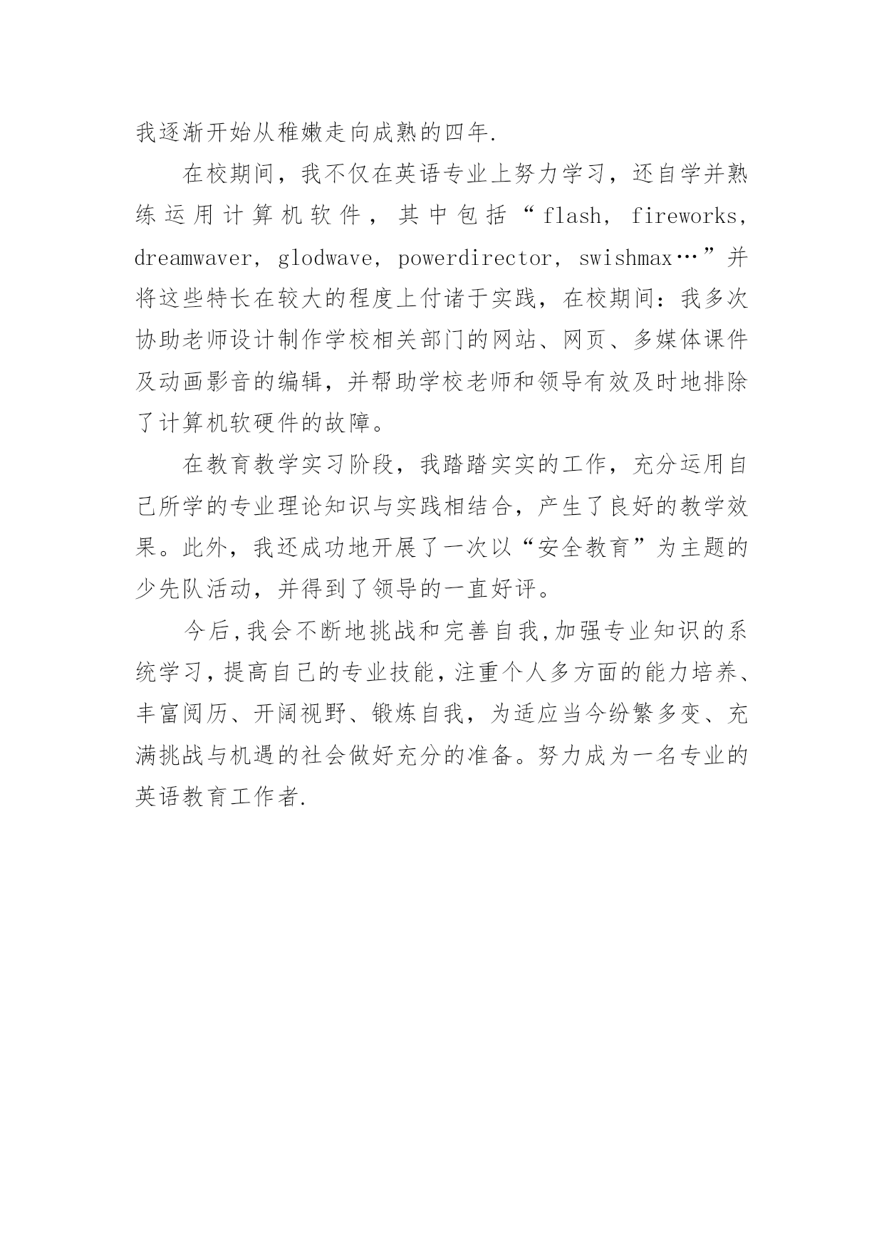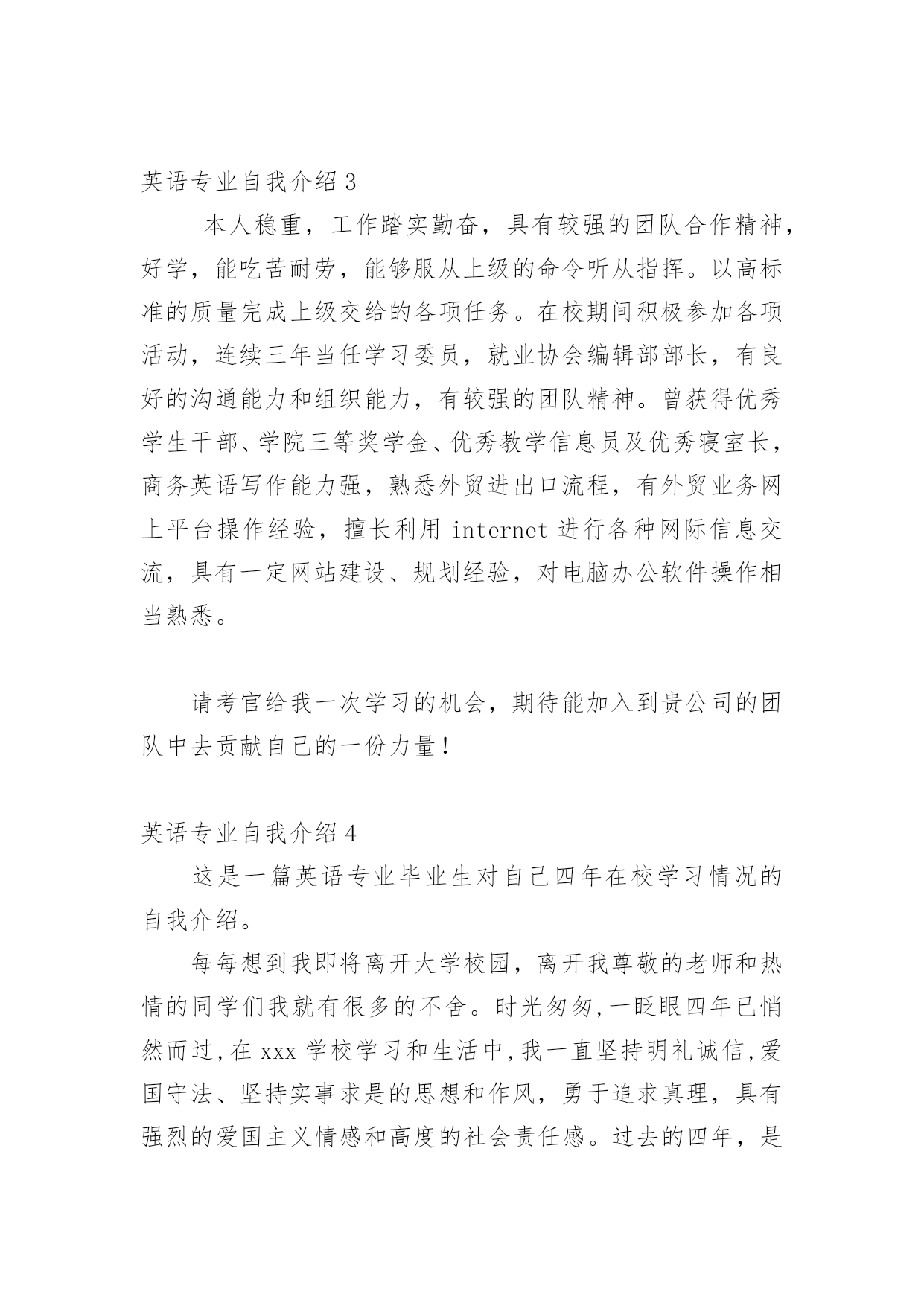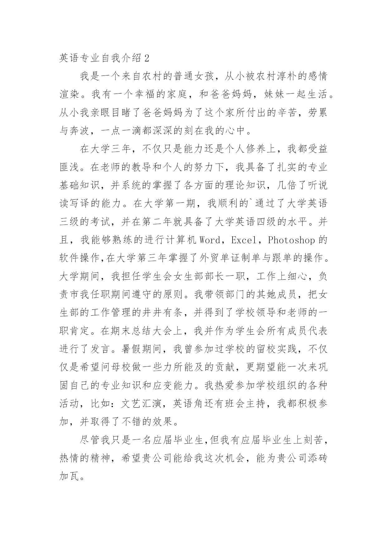 英语专业自我介绍 英语专业自我介绍当来到的一个陌生的地方时,我们总少不了要向他人介绍自己,用自我介绍往往可以让他人有一定的了解。写自我介绍可不能随随便便哦,下面是小编整理的英语专业自我介绍,欢迎大家借鉴与参考,希望对大家有所帮助。英语专业自我介绍1英语专业自我介绍我毕业于xx大学英语专业.对英语比较偏爱,具备较强的英语听、说、读、写、译等能力;擅长撰写和回复英文商业信函,熟练运用网络查阅相关英文资料并能及时予以翻译。对国贸易事务有所了解,并熟悉国贸单证的制作。通过学校日常培训和寒暑假的社会实践活动,熟悉办公室软件的操纵;精通办公自动化,熟练操作windowsxp能独立操作并及时高效的完成日常办公文档的编辑。本人性格稳重、待人热情、真诚。工作认真负责,积极主动,能吃苦耐劳。有较强的交际能力、实际动手能力和团体协作精神,能迅速的适应各种环境,并融合其中。积极参加学院社团活动,并担任过分院组织部和社会实践部的干事,配合部长工作。英语专业自我介绍2我是一个来自农村的普通女孩,从小被农村淳朴的感情渲染。我有一个幸福的家庭,和爸爸妈妈,妹妹一起生活。从小我亲眼目睹了爸爸妈妈为了这个家所付出的辛苦,劳累与奔波,一点一滴都深深的刻在我的心中。在大学三年,不仅只是能力还是个人修养上,我都受益匪浅。在老师的教导和个人的努力下,我具备了扎实的专业基础知识,并系统的掌握了各方面的理论知识,几倍了听说读写译的能力。在大学第一期,我顺利的`通过了大学英语三级的考试,并在第二年就具备了大学英语四级的水平。并且,我能够熟练的进行计算机Word,Excel,Photoshop的软件操作,在大学第三年掌握了外贸单证制单与跟单的操作。大学期间,我担任学生会女生部部长一职,工作上细心,负责市我任职期间遵守的原则。我带领部门的其她成员,把女生部的工作管理的井井有条,并得到了学校领导和老师的一职肯定。在期末总结大会上,我并作为学生会所有成员代表进行了发言。暑假期间,我曾参加过学校的留校实践,不仅仅是希望问母校做一些力所能及的贡献,更期望能一次来巩固自己的专业知识和应变能力。我热爱参加学校组织的各种活动,比如:文艺汇演,英语角还有班会主持,我都积极参加,并取得了不错的效果。尽管我只是一名应届毕业生,但我有应届毕业生上刻苦,热情的精神,希望贵公司能给我这次机会,能为贵公司添砖加瓦。英语专业自我介绍3本人稳重,工作踏实勤奋,具有较强的团队合作精神,好学,能吃苦耐劳,能够服从上级的命令听从指挥。以高标准的质量完成上级交给的各项任务。在校期间积极参加各项活动,连续三年当任学习委员,就业协会编辑部部长,有良好的沟通能力和组织能力,有较强的团队精神。曾获得优秀学生干部、学院三等奖学金、优秀教学信息员及优秀寝室长,商务英语写作能力强,熟悉外贸进出口流程,有外贸业务网上平台操作经验,擅长利用internet进行各种网际信息交流,具有一定网站建设、规划经验,对电脑办公软件操作相当熟悉。请考官给我一次学习的机会,期待能加入到贵公司的团队中去贡献自己的一份力量!英语专业自我介绍4这是一篇英语专业毕业生对自己四年在校学习情况的自我介绍。每每想到我即将离开大学校园,离开我尊敬的老师和热情的同学们我就有很多的不舍。时光匆匆,一眨眼四年已悄然而过,在xxx学校学习和生活中,我一直坚持明礼诚信,爱国守法、坚持实事求是的思想和作风,勇于追求真理,具有强烈的爱国主义情感和高度的社会责任感。过去的四年,是我逐渐开始从稚嫩走向成熟的四年.在校期间,我不仅在英语专业上努力学习,还自学并熟练运用计算机软件,其中包括“flash,fireworks,dreamwaver,glodwave,powerdirector,swishmax…”并将这些特长在较大的程度上付诸于实践,在校期间:我多次协助老师设计制作学校相关部门的网站、网页、多媒体课件及动画影音的编辑,并帮助学校老师和领导有效及时地排除了计算机软硬件的故障。在教育教学实习阶段,我踏踏实实的工作,充分运用自己所学的专业理论知识与实践相结合,产生了良好的教学效果。此外,我还成功地开展了一次以“安全教育”为主题的少先队活动,并得到了领导的一直好评。今后,我会不断地挑战和完善自我,加强专业知识的系统学习,提高自己的专业技能,注重个人多方面的能力培养、丰富阅历、开阔视野、锻炼自我,为适应当今纷繁多变、充满挑战与机遇的社会做好充分的准备。努力成为一名专业的英语教育工作者.