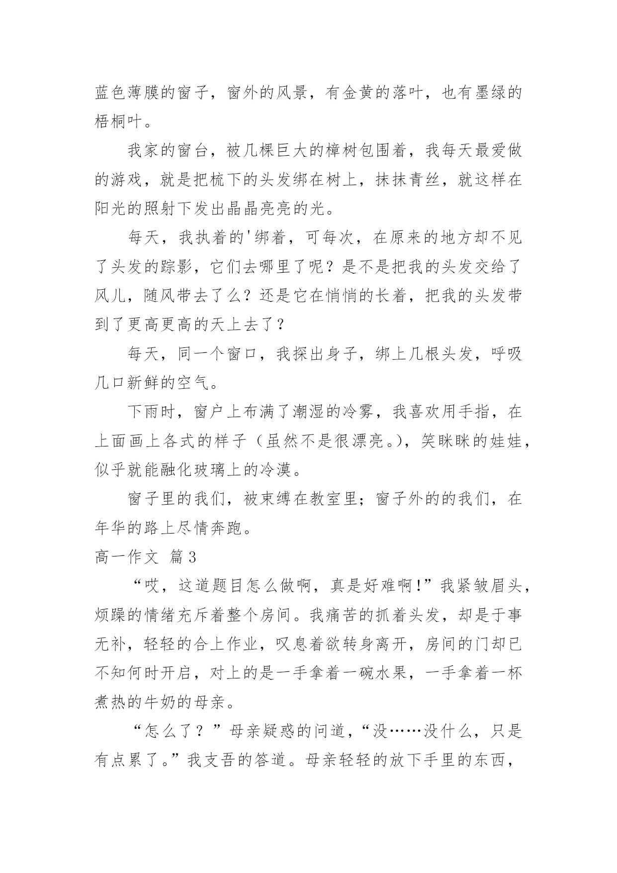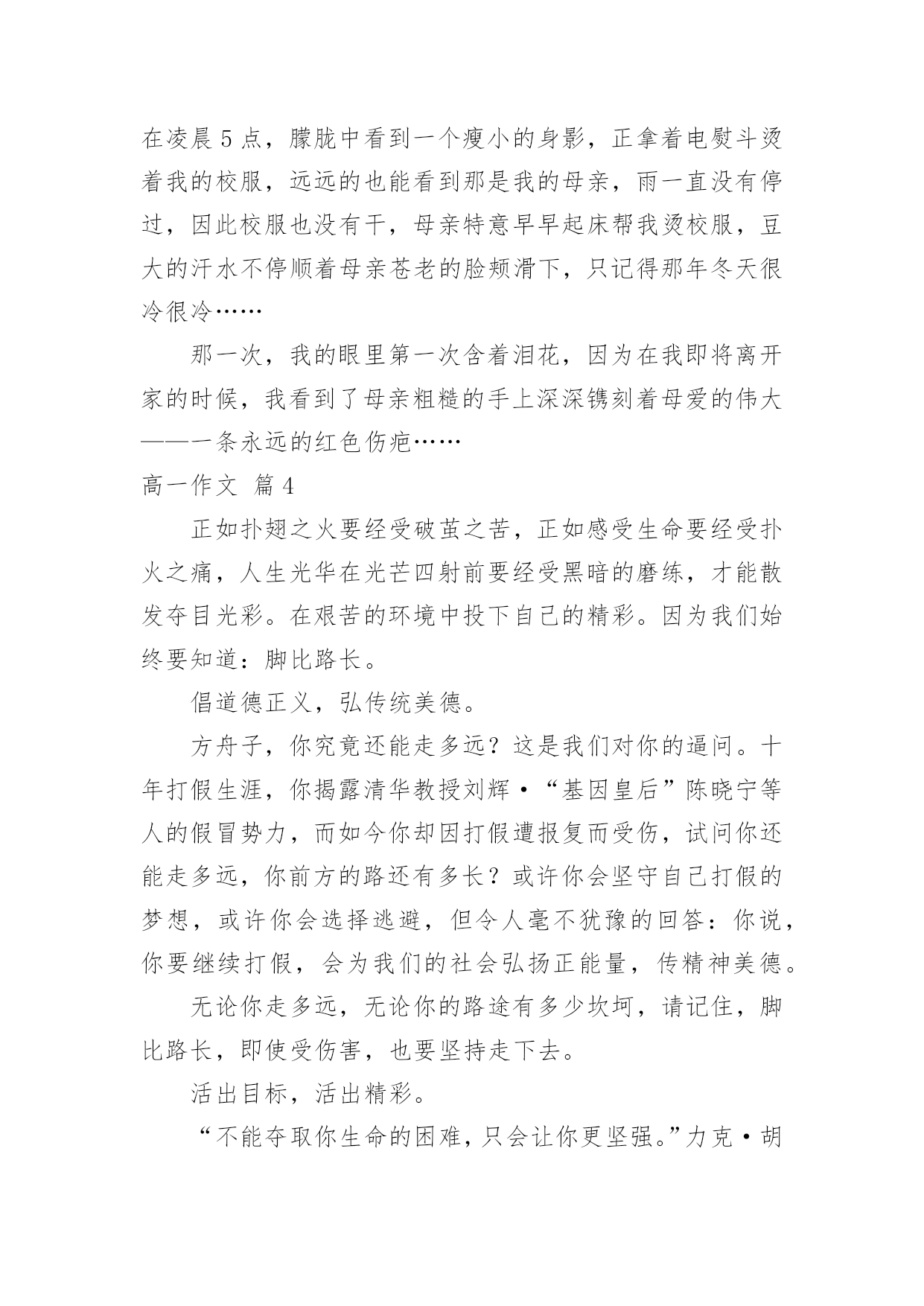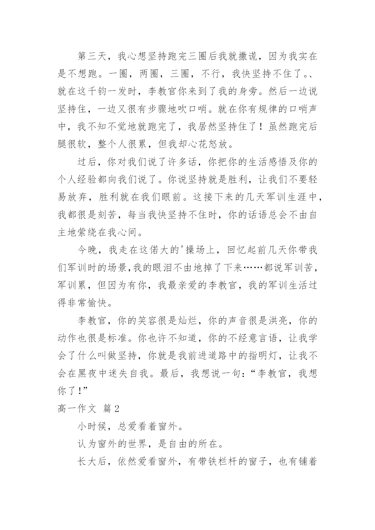 高一作文 实用的高一作文汇总6篇在我们平凡的日常里,大家总免不了要接触或使用作文吧,作文根据体裁的不同可以分为记叙文、说明文、应用文、议论文。作文的注意事项有许多,你确定会写吗?以下是小编为大家收集的高一作文6篇,希望能够帮助到大家。高一作文篇1你不是蜡烛,但你却燃烧自己照亮了别人;你不是工程师,但你却为我们铺设了一条康庄大道;你更不是我的老师,但你却教会了我好多好多……昭通的天很低,昭通的黑夜也很是漆黑。借着校园里的路灯,我独自走在操场上,昏暗的灯光把我的影子拖得很长很长……看着操场上空无一人,校园后面的大柳树随风飘扬,我感触颇深,昔日军训的场景也历历在目……今天是军训第一天,我早早地就起床了,心里很是期盼今天的军训任务。但让我意外的是,我们一来就晨跑,这下可把我累坏了。跑了一圈多,我实在是跑不动了,于是我就撒了一个谎,说我肚子疼。但在剩下的这一天中,我都很是后悔,后悔我为什么没有坚持跑完,心想明天一定跑完。到了第二天,我本来是很有把握跑完的,但才跑了两圈多,我真的累得不行了。于是,我又撒了一个谎。事后,我一直耿耿于怀,我不明白为什么别人可以,而我不可以。第三天,我心想坚持跑完三圈后我就撒谎,因为我实在是不想跑。一圈,两圈,三圈,不行,我快坚持不住了。、就在这千钧一发时,李教官你来到了我的身旁。然后一边说坚持住,一边又很有步骤地吹口哨。就在你有规律的口哨声中,我不知不觉地就跑完了,我居然坚持住了!虽然跑完后腿很软,整个人很累,但我却心花怒放。过后,你对我们说了许多话,你把你的生活感悟及你的个人经验都向我们说了。你说坚持就是胜利,让我们不要轻易放弃,胜利就在我们眼前。这接下来的几天军训生涯中,我都很是刻苦,每当我快坚持不住时,你的话语总会不由自主地萦绕在我心间。今晚,我走在这偌大的'操场上,回忆起前几天你带我们军训时的场景,我的眼泪不由地掉了下来……都说军训苦,军训累,但因为有你,我最亲爱的李教官,我的军训生活过得非常愉快。李教官,你的笑容很是灿烂,你的声音很是洪亮,你的动作也很是标准。你也许不知道,你的不经意言语,让我学会了什么叫做坚持,你就是我前进道路中的指明灯,让我不会在黑夜中迷失自我。最后,我想说一句:“李教官,我想你了!”高一作文篇2小时候,总爱看着窗外。认为窗外的世界,是自由的所在。长大后,依然爱看窗外,有带铁栏杆的窗子,也有铺着蓝色薄膜的窗子,窗外的风景,有金黄的落叶,也有墨绿的梧桐叶。我家的窗台,被几棵巨大的樟树包围着,我每天最爱做的游戏,就是把梳下的头发绑在树上,抹抹青丝,就这样在阳光的照射下发出晶晶亮亮的光。每天,我执着的'绑着,可每次,在原来的地方却不见了头发的踪影,它们去哪里了呢?是不是把我的头发交给了风儿,随风带去了么?还是它在悄悄的长着,把我的头发带到了更高更高的天上去了?每天,同一个窗口,我探出身子,绑上几根头发,呼吸几口新鲜的空气。下雨时,窗户上布满了潮湿的冷雾,我喜欢用手指,在上面画上各式的样子(虽然不是很漂亮。),笑眯眯的娃娃,似乎就能融化玻璃上的冷漠。窗子里的我们,被束缚在教室里;窗子外的的我们,在年华的路上尽情奔跑。高一作文篇3“哎,这道题目怎么做啊,真是好难啊!”我紧皱眉头,烦躁的情绪充斥着整个房间。我痛苦的抓着头发,却是于事无补,轻轻的合上作业,叹息着欲转身离开,房间的门却已不知何时开启,对上的是一手拿着一碗水果,一手拿着一杯煮热的牛奶的母亲。“怎么了?”母亲疑惑的问道,“没……没什么,只是有点累了。”我支吾的答道。母亲轻轻的放下手里的东西,走到了我的书桌前,似发现什么不停的翻阅着桌上的作业,其实我也十分紧张,因为从小到大母亲一贯的严厉作风让我有着一种深深的恐惧,甚至可以说母亲对我的学习有点偏激。她不允许我平常看电视,不允许我在周末玩电脑超过一个小时,甚至不允许我休息,她总是把成功是属于勤奋的人一句挂在嘴边。记得有一次,只因没完成作业以致差点母亲就让我退学,后来还是我父亲多次劝导才平息。至此,我就再也没有敢违抗过母亲,母亲叫我做什么我就做什么,只是不知内心深处却是充满了少年的不甘。“你这道题怎么没有做?”母亲严厉的呵斥道。哎,还是被发现了,我只好硬着头皮解释道:“是这道题太难了,不会做。”“不会做就是理由了吗?你有题目没做完晚上还睡的着觉吗?像你这种没有责任心的人在社会上只能是个社会的蛀虫……“够了!我受够了,你什么都要管我,我没有一点自由,从小到大都是这样。什么水果、牛奶都拿走,别那么虚情假意,我只不过是你的傀儡而已!”我怒不可遏的发泄着,发泄着少年不甘的怒火。出乎意料的是,这次母亲并没有发火,只是怔怔的站在那儿,注视着我良久良久,轻轻的叹了一口气,一如之前那样轻轻的离开,唯有不同的是,母亲那一双自责的'眼神让我一瞬间有股后悔的冲动,随后却是被我的愤怒所吞没,但我却在原地伫立了很