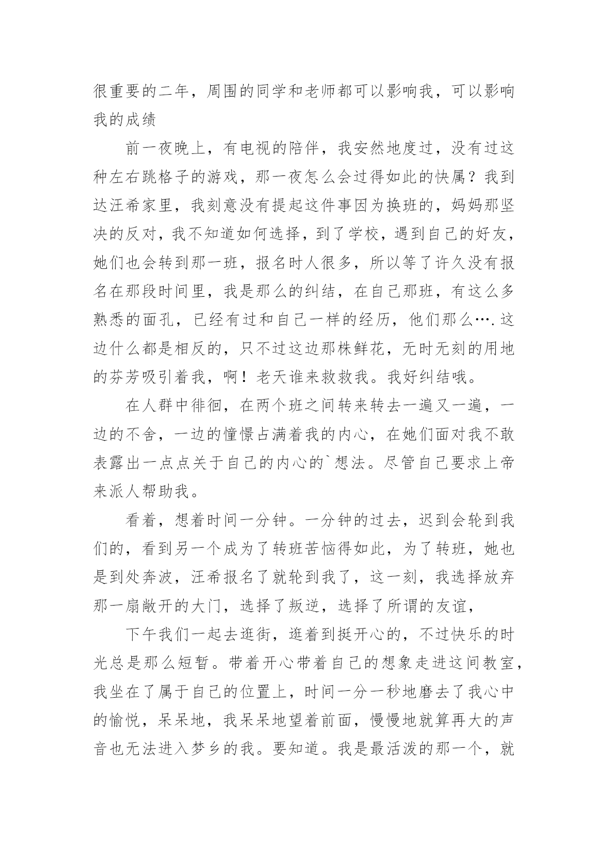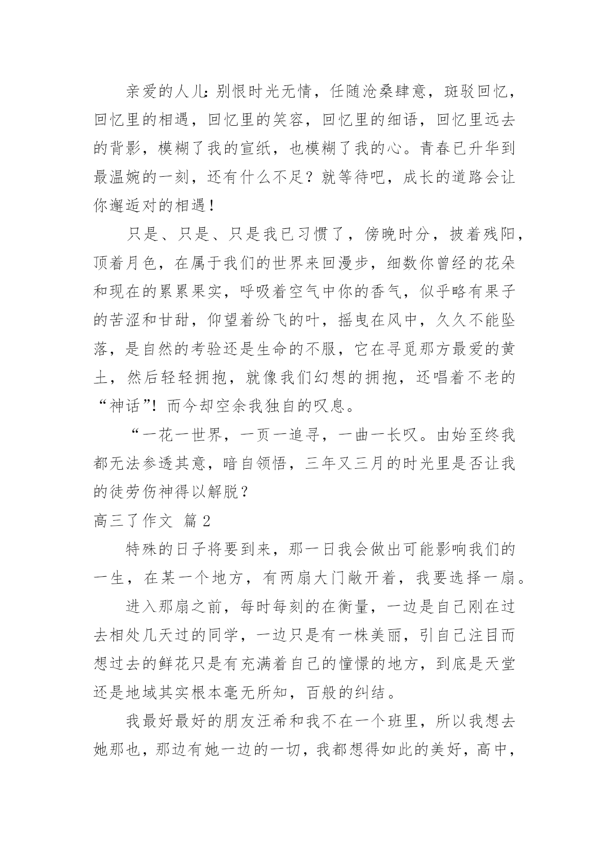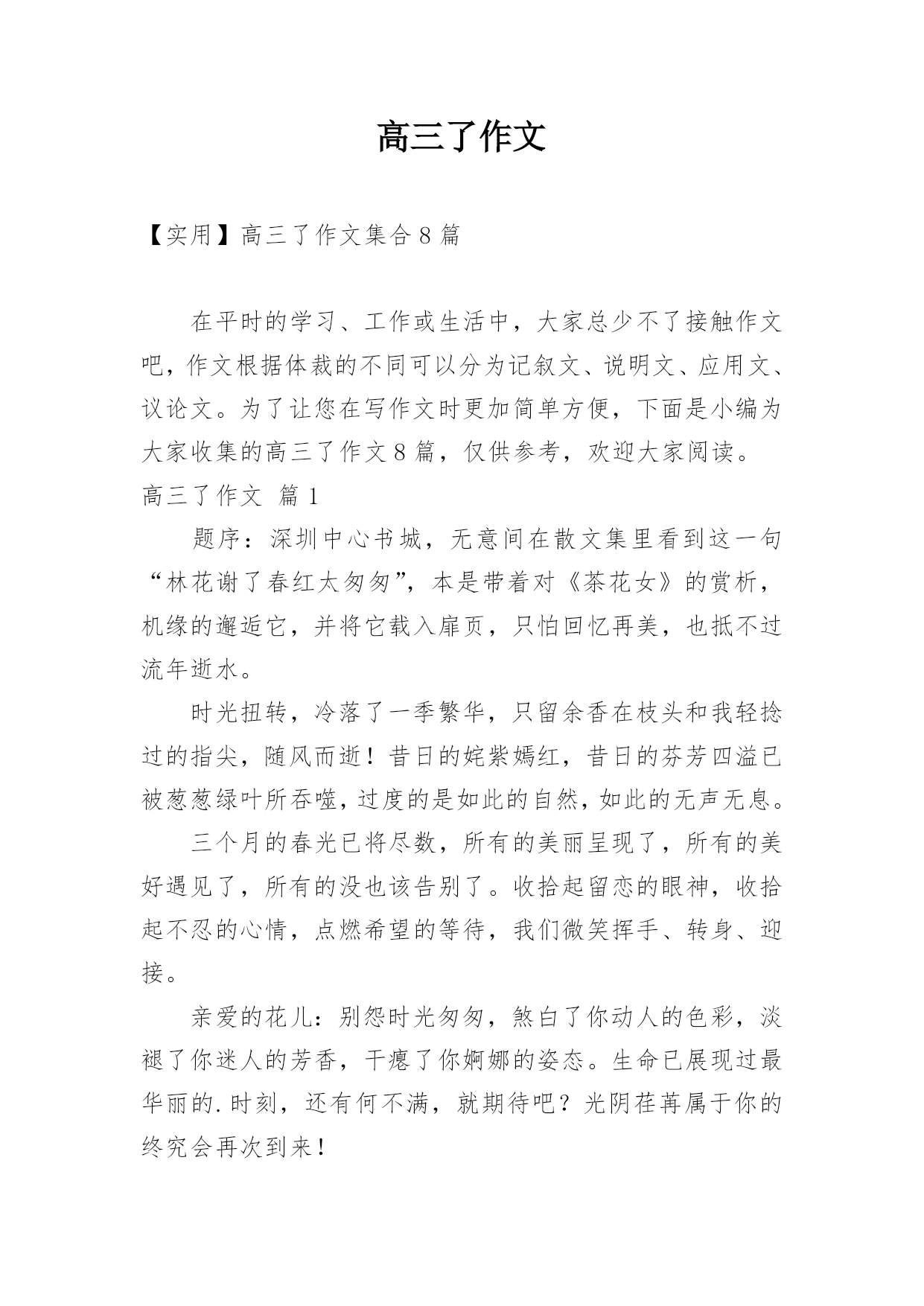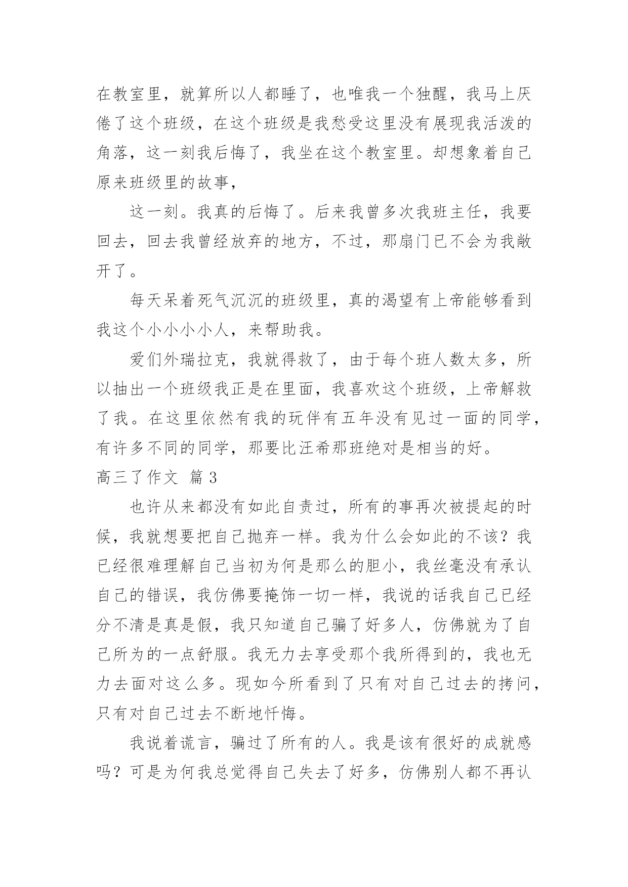 高三了作文 【实用】高三了作文集合8篇在平时的学习、工作或生活中,大家总少不了接触作文吧,作文根据体裁的不同可以分为记叙文、说明文、应用文、议论文。为了让您在写作文时更加简单方便,下面是小编为大家收集的高三了作文8篇,仅供参考,欢迎大家阅读。高三了作文篇1题序:深圳中心书城,无意间在散文集里看到这一句“林花谢了春红太匆匆”,本是带着对《茶花女》的赏析,机缘的邂逅它,并将它载入扉页,只怕回忆再美,也抵不过流年逝水。时光扭转,冷落了一季繁华,只留余香在枝头和我轻捻过的指尖,随风而逝!昔日的姹紫嫣红,昔日的芬芳四溢已被葱葱绿叶所吞噬,过度的是如此的自然,如此的无声无息。三个月的春光已将尽数,所有的美丽呈现了,所有的美好遇见了,所有的没也该告别了。收拾起留恋的眼神,收拾起不忍的心情,点燃希望的等待,我们微笑挥手、转身、迎接。亲爱的花儿:别怨时光匆匆,煞白了你动人的色彩,淡褪了你迷人的芳香,干瘪了你婀娜的姿态。生命已展现过最华丽的.时刻,还有何不满,就期待吧?光阴荏苒属于你的终究会再次到来!亲爱的人儿:别恨时光无情,任随沧桑肆意,斑驳回忆,回忆里的相遇,回忆里的笑容,回忆里的细语,回忆里远去的背影,模糊了我的宣纸,也模糊了我的心。青春已升华到最温婉的一刻,还有什么不足?就等待吧,成长的道路会让你邂逅对的相遇!只是、只是、只是我已习惯了,傍晚时分,披着残阳,顶着月色,在属于我们的世界来回漫步,细数你曾经的花朵和现在的累累果实,呼吸着空气中你的香气,似乎略有果子的苦涩和甘甜,仰望着纷飞的叶,摇曳在风中,久久不能坠落,是自然的考验还是生命的不服,它在寻觅那方最爱的黄土,然后轻轻拥抱,就像我们幻想的拥抱,还唱着不老的“神话”!而今却空余我独自的叹息。“一花一世界,一页一追寻,一曲一长叹。由始至终我都无法参透其意,暗自领悟,三年又三月的时光里是否让我的徒劳伤神得以解脱?高三了作文篇2特殊的日子将要到来,那一日我会做出可能影响我们的一生,在某一个地方,有两扇大门敞开着,我要选择一扇。进入那扇之前,每时每刻的在衡量,一边是自己刚在过去相处几天过的同学,一边只是有一株美丽,引自己注目而想过去的鲜花只是有充满着自己的憧憬的地方,到底是天堂还是地域其实根本毫无所知,百般的纠结。我最好最好的朋友汪希和我不在一个班里,所以我想去她那也,那边有她一边的一切,我都想得如此的美好,高中,很重要的二年,周围的同学和老师都可以影响我,可以影响我的成绩前一夜晚上,有电视的陪伴,我安然地度过,没有过这种左右跳格子的游戏,那一夜怎么会过得如此的快属?我到达汪希家里,我刻意没有提起这件事因为换班的,妈妈那坚决的反对,我不知道如何选择,到了学校,遇到自己的好友,她们也会转到那一班,报名时人很多,所以等了许久没有报名在那段时间里,我是那么的纠结,在自己那班,有这么多熟悉的面孔,已经有过和自己一样的经历,他们那么….这边什么都是相反的,只不过这边那株鲜花,无时无刻的用地的芬芳吸引着我,啊!老天谁来救救我。我好纠结哦。在人群中徘徊,在两个班之间转来转去一遍又一遍,一边的不舍,一边的憧憬占满着我的内心,在她们面对我不敢表露出一点点关于自己的内心的`想法。尽管自己要求上帝来派人帮助我。看着,想着时间一分钟。一分钟的过去,迟到会轮到我们的,看到另一个成为了转班苦恼得如此,为了转班,她也是到处奔波,汪希报名了就轮到我了,这一刻,我选择放弃那一扇敞开的大门,选择了叛逆,选择了所谓的友谊,下午我们一起去逛街,逛着到挺开心的,不过快乐的时光总是那么短暂。带着开心带着自己的想象走进这间教室,我坐在了属于自己的位置上,时间一分一秒地磨去了我心中的愉悦,呆呆地,我呆呆地望着前面,慢慢地就算再大的声音也无法进入梦乡的我。要知道。我是最活泼的那一个,就在教室里,就算所以人都睡了,也唯我一个独醒,我马上厌倦了这个班级,在这个班级是我愁受这里没有展现我活泼的角落,这一刻我后悔了,我坐在这个教室里。却想象着自己原来班级里的故事,这一刻。我真的后悔了。后来我曾多次我班主任,我要回去,回去我曾经放弃的地方,不过,那扇门已不会为我敞开了。每天呆着死气沉沉的班级里,真的渴望有上帝能够看到我这个小小小小人,来帮助我。爱们外瑞拉克,我就得救了,由于每个班人数太多,所以抽出一个班级我正是在里面,我喜欢这个班级,上帝解救了我。在这里依然有我的玩伴有五年没有见过一面的同学,有许多不同的同学,那要比汪希那班绝对是相当的好。高三了作文篇3也许从来都没有如此自责过,所有的事再次被提起的时候,我就想要把自己抛弃一样。我为什么会如此的不该?我已经很难理解自己当初为何是那么的胆小,我丝毫没有承认自己的错误,我仿佛要掩饰一切一样,我说的话我自己已经分不清是真是假,我只知道自己骗了好多人,仿佛就为了自己所为的一点舒服。我无力去享受那个我所得到的,