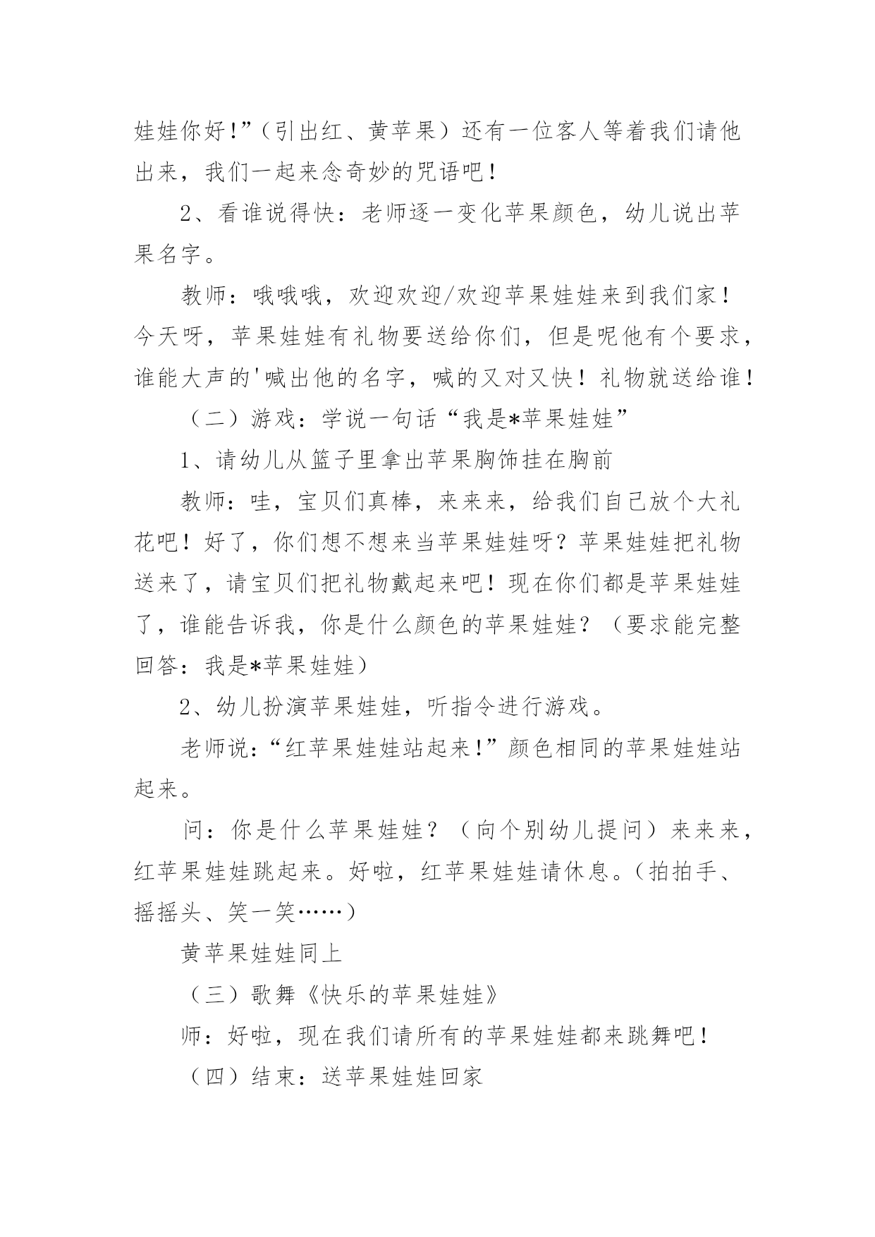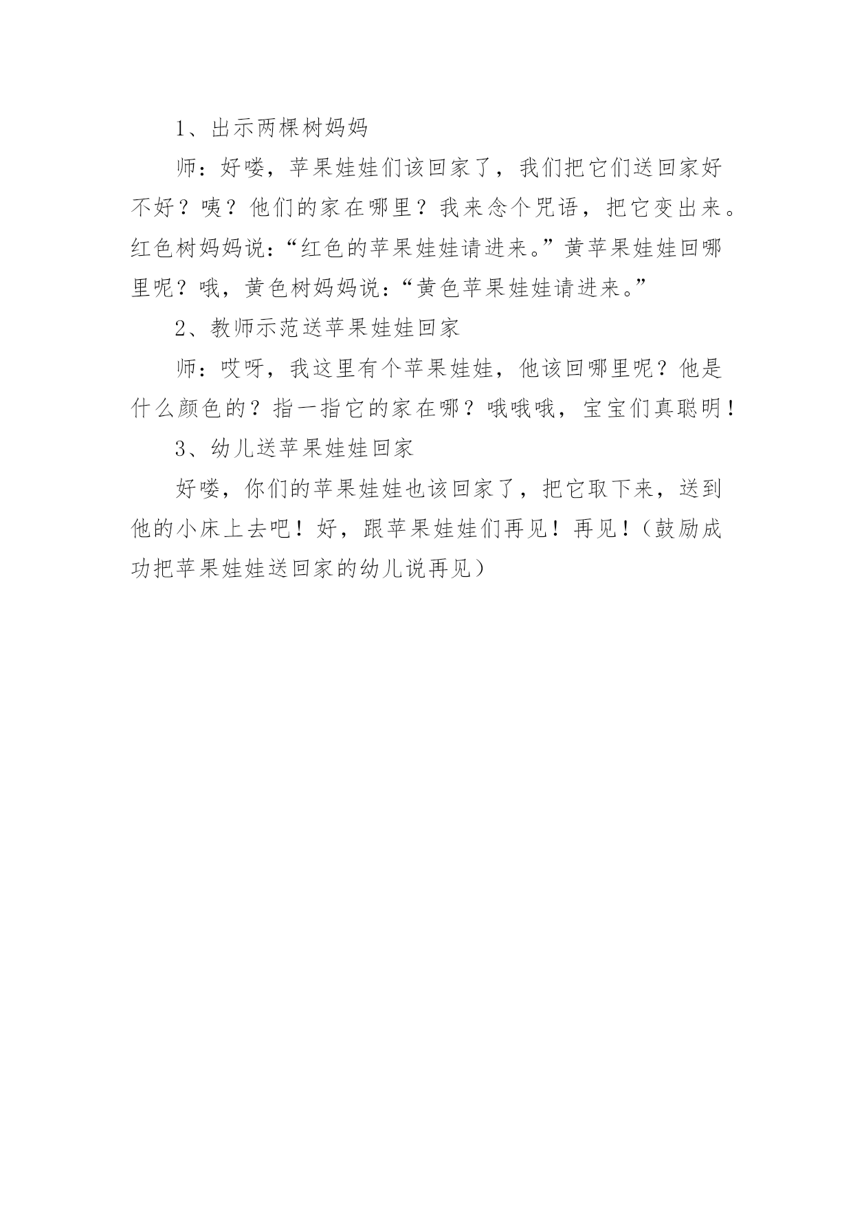 托班语言教案苹果娃娃 托班语言教案苹果娃娃作为一名专为他人授业解惑的人民教师,常常要写一份优秀的教案,通过教案准备可以更好地根据具体情况对教学进程做适当的必要的调整。那么教案应该怎么写才合适呢?下面是小编为大家整理的托班语言教案苹果娃娃,仅供参考,希望能够帮助到大家。一、活动目标:1、积极参加集体游戏,体验大家一起玩的快乐。2、学习句式:我是(红、黄)苹果娃娃。3、在游戏中学习认识并正确区分红、黄、两种颜色。二、活动准备:1、红、黄苹果胸饰各20个2、两棵大苹果树。三、活动过程:(一)逐一出示红、黄两种颜色苹果的卡片1、教师:宝贝们,我们家今天来了好多的水果客人,他们长得圆圆的,猜一猜是什么?(幼儿发散思维,随意猜)究竟是什么呢?想不想来认识他们呀?(与宝宝一起变魔术念咒语后再出示)出示红苹果娃娃,“大家好,我是红苹果娃娃!”来吧,我们一起跟红苹果娃娃问好。“红苹果娃娃你好!”(引出红、黄苹果)还有一位客人等着我们请他出来,我们一起来念奇妙的咒语吧!2、看谁说得快:老师逐一变化苹果颜色,幼儿说出苹果名字。教师:哦哦哦,欢迎欢迎/欢迎苹果娃娃来到我们家!今天呀,苹果娃娃有礼物要送给你们,但是呢他有个要求,谁能大声的'喊出他的名字,喊的又对又快!礼物就送给谁!(二)游戏:学说一句话“我是*苹果娃娃”1、请幼儿从篮子里拿出苹果胸饰挂在胸前教师:哇,宝贝们真棒,来来来,给我们自己放个大礼花吧!好了,你们想不想来当苹果娃娃呀?苹果娃娃把礼物送来了,请宝贝们把礼物戴起来吧!现在你们都是苹果娃娃了,谁能告诉我,你是什么颜色的苹果娃娃?(要求能完整回答:我是*苹果娃娃)2、幼儿扮演苹果娃娃,听指令进行游戏。老师说:“红苹果娃娃站起来!”颜色相同的苹果娃娃站起来。问:你是什么苹果娃娃?(向个别幼儿提问)来来来,红苹果娃娃跳起来。好啦,红苹果娃娃请休息。(拍拍手、摇摇头、笑一笑……)黄苹果娃娃同上(三)歌舞《快乐的苹果娃娃》师:好啦,现在我们请所有的苹果娃娃都来跳舞吧!(四)结束:送苹果娃娃回家1、出示两棵树妈妈师:好喽,苹果娃娃们该回家了,我们把它们送回家好不好?咦?他们的家在哪里?我来念个咒语,把它变出来。红色树妈妈说:“红色的苹果娃娃请进来。”黄苹果娃娃回哪里呢?哦,黄色树妈妈说:“黄色苹果娃娃请进来。”2、教师示范送苹果娃娃回家师:哎呀,我这里有个苹果娃娃,他该回哪里呢?他是什么颜色的?指一指它的家在哪?哦哦哦,宝宝们真聪明!3、幼儿送苹果娃娃回家好喽,你们的苹果娃娃也该回家了,把它取下来,送到他的小床上去吧!好,跟苹果娃娃们再见!再见!(鼓励成功把苹果娃娃送回家的幼儿说再见)
