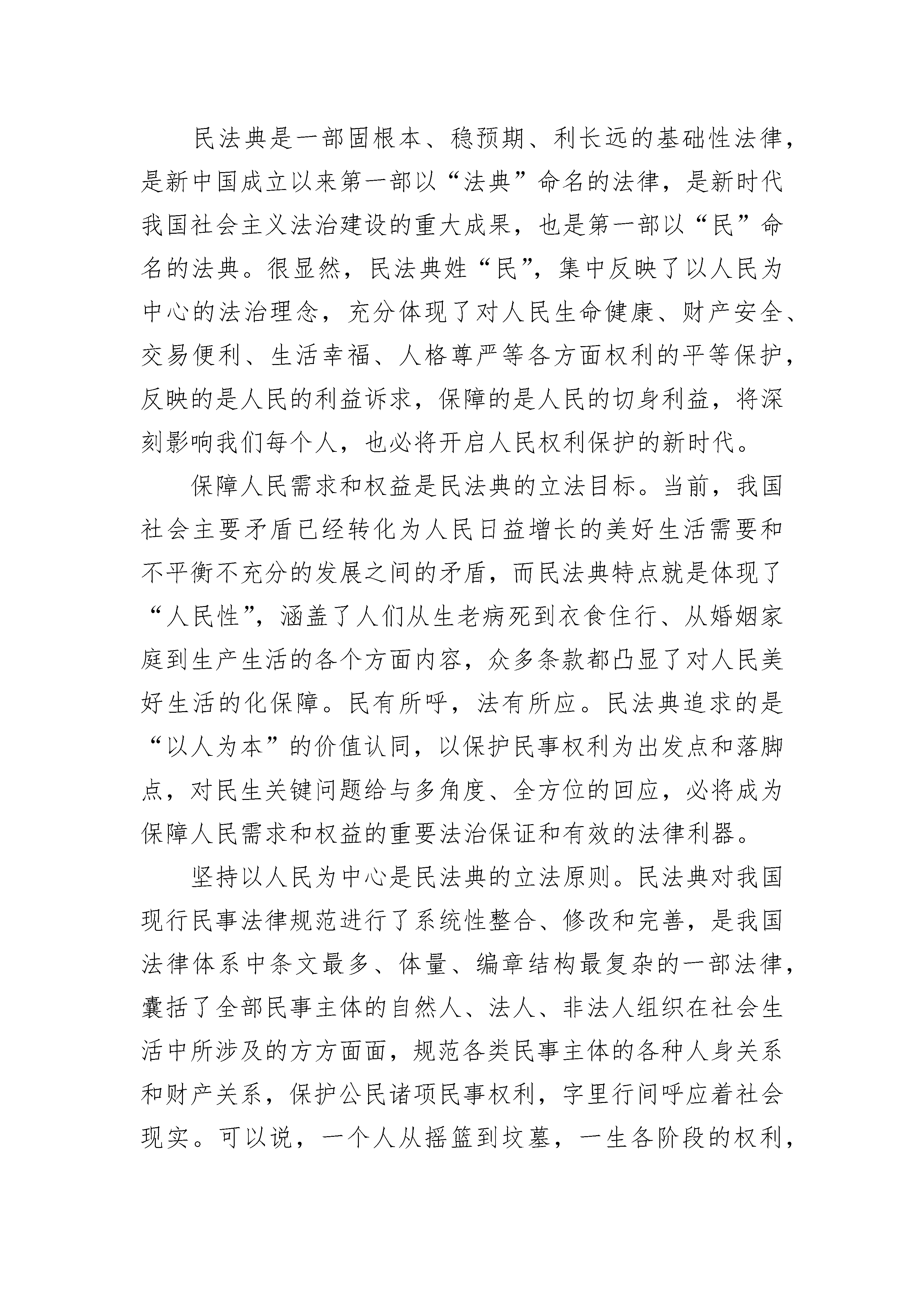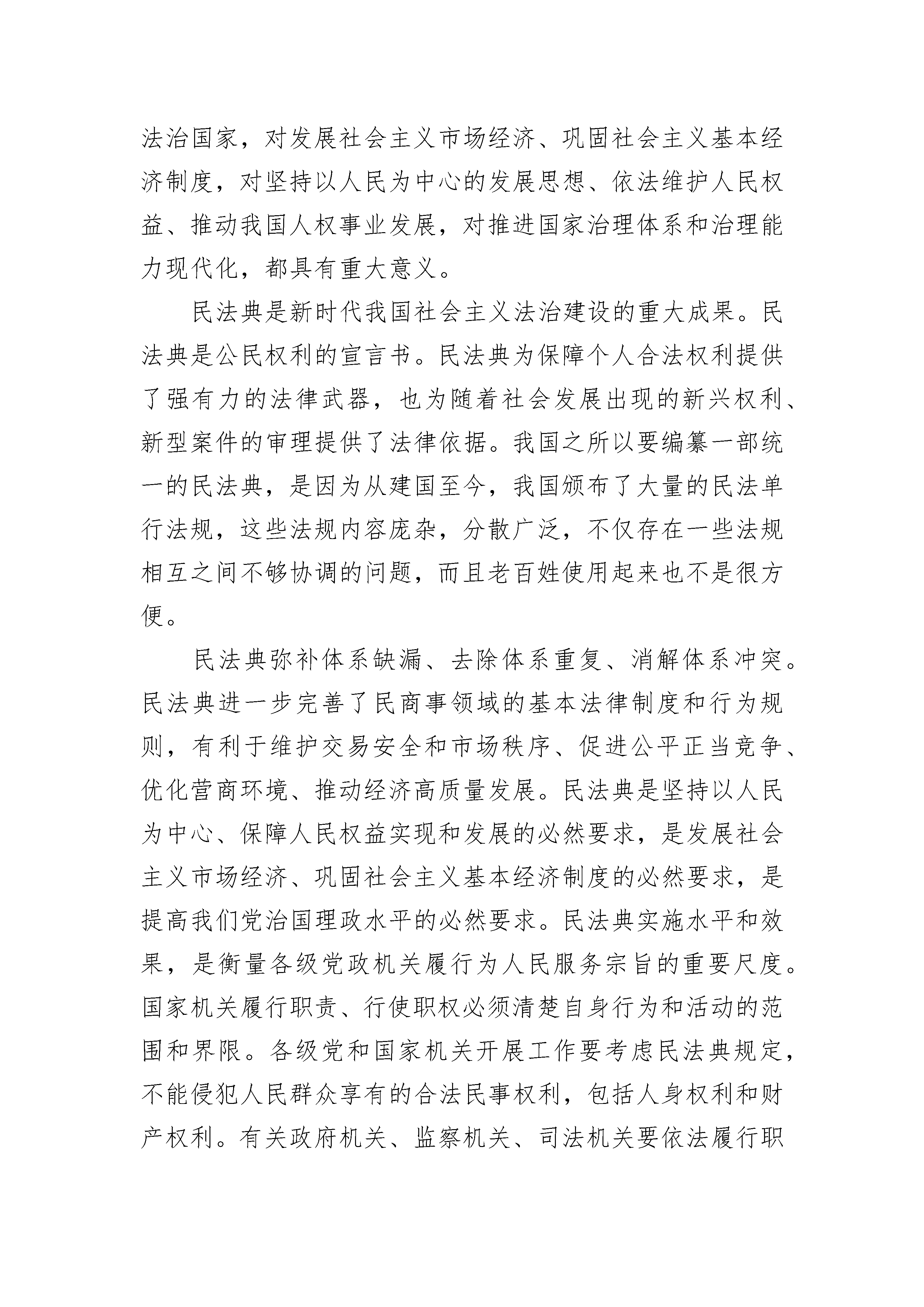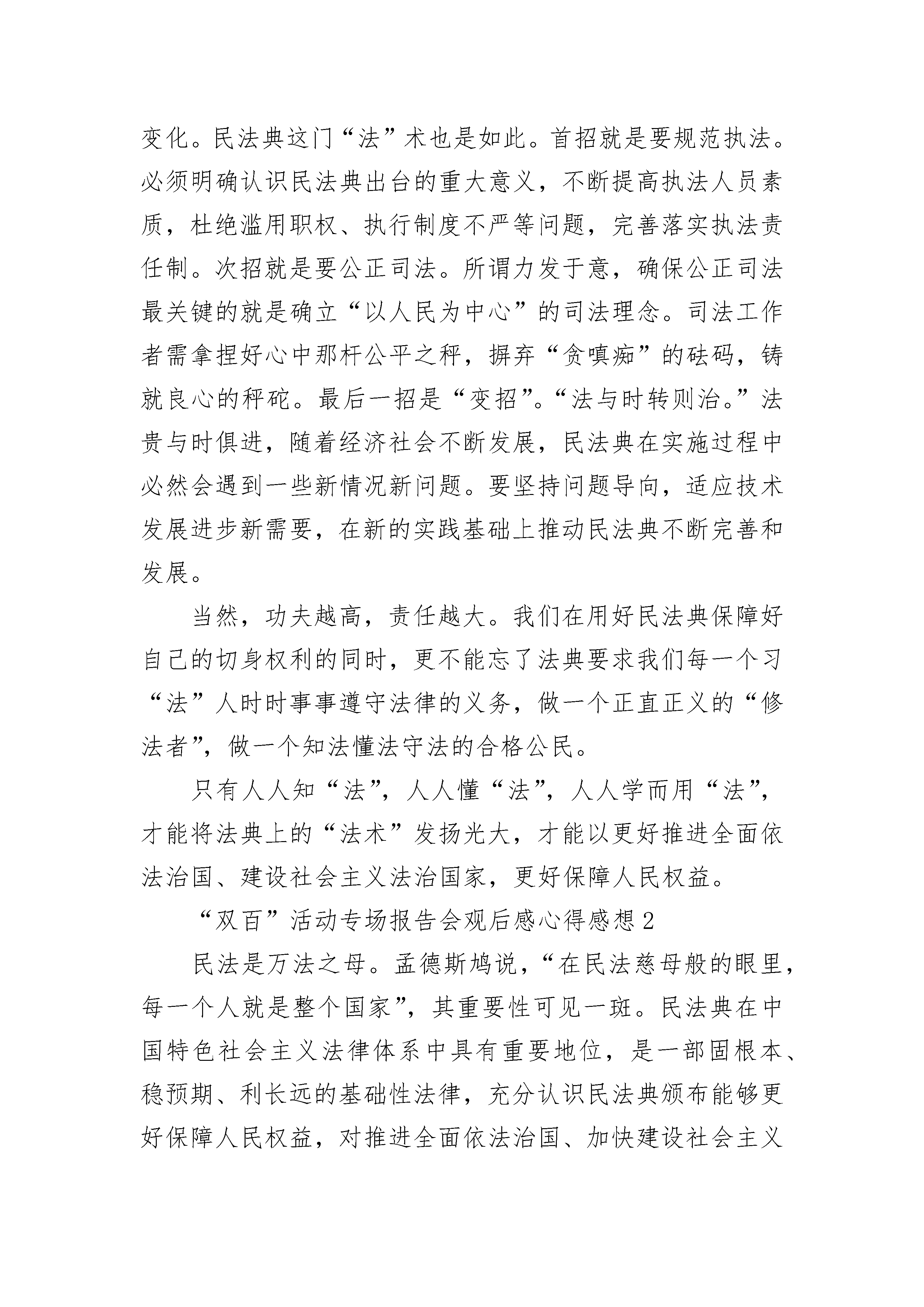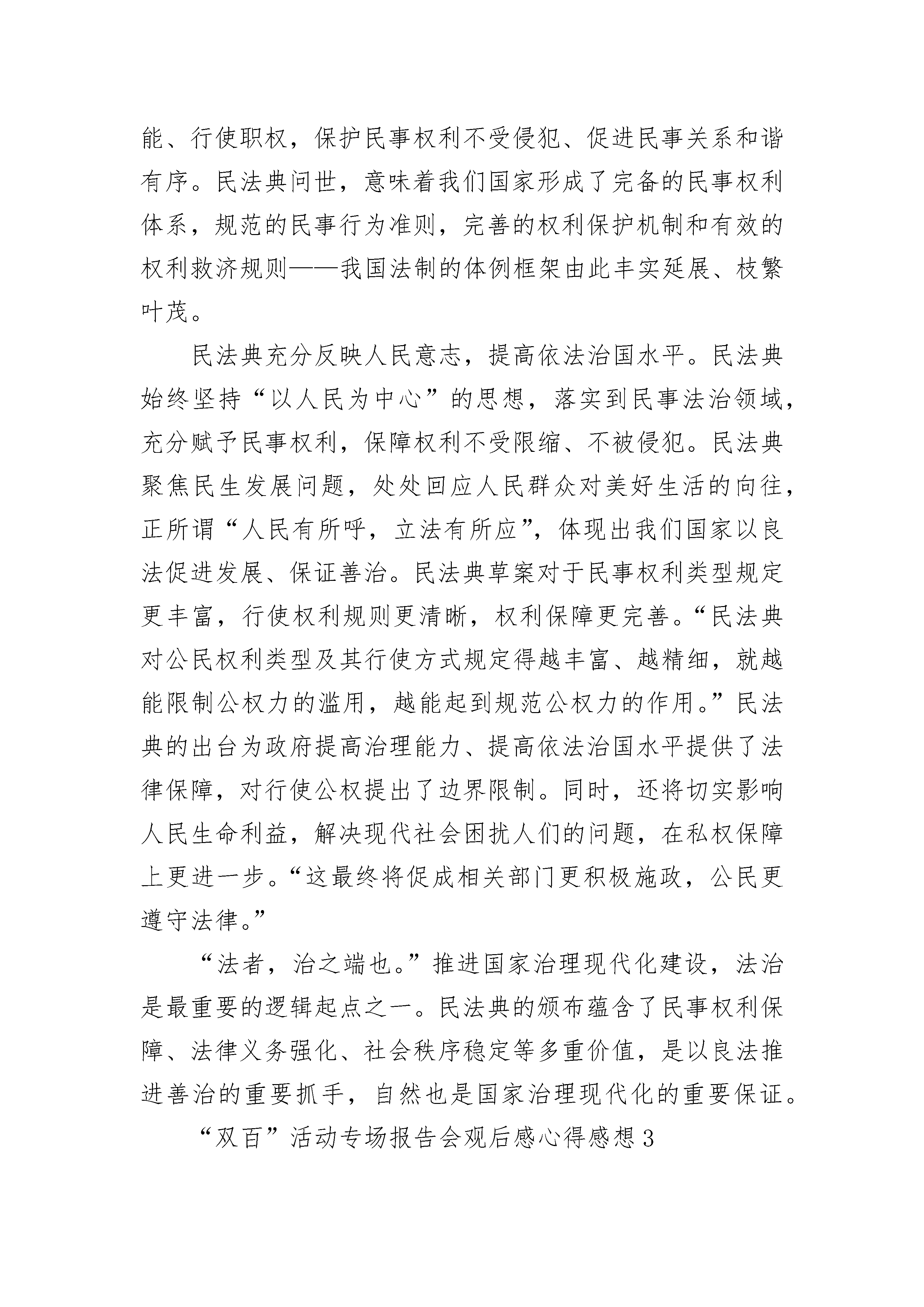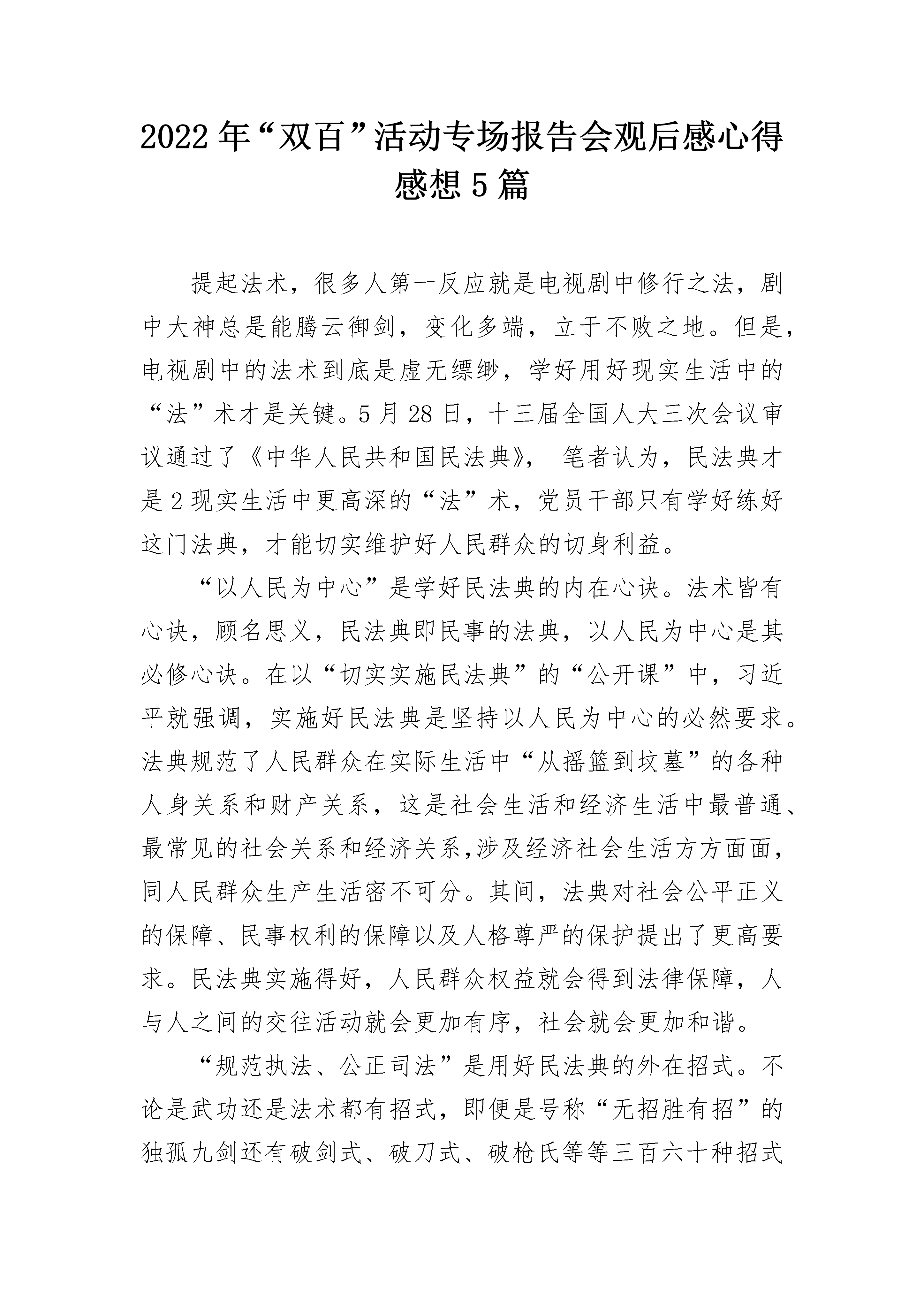 2022年“双百”活动专场报告会观后感心得感想5篇提起法术,很多人第一反应就是电视剧中修行之法,剧中大神总是能腾云御剑,变化多端,立于不败之地。但是,电视剧中的法术到底是虚无缥缈,学好用好现实生活中的“法”术才是关键。5月28日,十三届全国人大三次会议审议通过了《中华人民共和国民法典》,笔者认为,民法典才是2现实生活中更高深的“法”术,党员干部只有学好练好这门法典,才能切实维护好人民群众的切身利益。“以人民为中心”是学好民法典的内在心诀。法术皆有心诀,顾名思义,民法典即民事的法典,以人民为中心是其必修心诀。在以“切实实施民法典”的“公开课”中,习近平就强调,实施好民法典是坚持以人民为中心的必然要求。法典规范了人民群众在实际生活中“从摇篮到坟墓”的各种人身关系和财产关系,这是社会生活和经济生活中最普通、最常见的社会关系和经济关系,涉及经济社会生活方方面面,同人民群众生产生活密不可分。其间,法典对社会公平正义的保障、民事权利的保障以及人格尊严的保护提出了更高要求。民法典实施得好,人民群众权益就会得到法律保障,人与人之间的交往活动就会更加有序,社会就会更加和谐。“规范执法、公正司法”是用好民法典的外在招式。不论是武功还是法术都有招式,即便是号称“无招胜有招”的独孤九剑还有破剑式、破刀式、破枪氏等等三百六十种招式变化。民法典这门“法”术也是如此。首招就是要规范执法。必须明确认识民法典出台的重大意义,不断提高执法人员素质,杜绝滥用职权、执行制度不严等问题,完善落实执法责任制。次招就是要公正司法。所谓力发于意,确保公正司法最关键的就是确立“以人民为中心”的司法理念。司法工作者需拿捏好心中那杆公平之秤,摒弃“贪嗔痴”的砝码,铸就良心的秤砣。最后一招是“变招”。“法与时转则治。”法贵与时俱进,随着经济社会不断发展,民法典在实施过程中必然会遇到一些新情况新问题。要坚持问题导向,适应技术发展进步新需要,在新的实践基础上推动民法典不断完善和发展。当然,功夫越高,责任越大。我们在用好民法典保障好自己的切身权利的同时,更不能忘了法典要求我们每一个习“法”人时时事事遵守法律的义务,做一个正直正义的“修法者”,做一个知法懂法守法的合格公民。只有人人知“法”,人人懂“法”,人人学而用“法”,才能将法典上的“法术”发扬光大,才能以更好推进全面依法治国、建设社会主义法治国家,更好保障人民权益。“双百”活动专场报告会观后感心得感想2民法是万法之母。孟德斯鸠说,“在民法慈母般的眼里,每一个人就是整个国家”,其重要性可见一斑。民法典在中国特色社会主义法律体系中具有重要地位,是一部固根本、稳预期、利长远的基础性法律,充分认识民法典颁布能够更好保障人民权益,对推进全面依法治国、加快建设社会主义法治国家,对发展社会主义市场经济、巩固社会主义基本经济制度,对坚持以人民为中心的发展思想、依法维护人民权益、推动我国人权事业发展,对推进国家治理体系和治理能力现代化,都具有重大意义。民法典是新时代我国社会主义法治建设的重大成果。民法典是公民权利的宣言书。民法典为保障个人合法权利提供了强有力的法律武器,也为随着社会发展出现的新兴权利、新型案件的审理提供了法律依据。我国之所以要编纂一部统一的民法典,是因为从建国至今,我国颁布了大量的民法单行法规,这些法规内容庞杂,分散广泛,不仅存在一些法规相互之间不够协调的问题,而且老百姓使用起来也不是很方便。民法典弥补体系缺漏、去除体系重复、消解体系冲突。民法典进一步完善了民商事领域的基本法律制度和行为规则,有利于维护交易安全和市场秩序、促进公平正当竞争、优化营商环境、推动经济高质量发展。民法典是坚持以人民为中心、保障人民权益实现和发展的必然要求,是发展社会主义市场经济、巩固社会主义基本经济制度的必然要求,是提高我们党治国理政水平的必然要求。民法典实施水平和效果,是衡量各级党政机关履行为人民服务宗旨的重要尺度。国家机关履行职责、行使职权必须清楚自身行为和活动的范围和界限。各级党和国家机关开展工作要考虑民法典规定,不能侵犯人民群众享有的合法民事权利,包括人身权利和财产权利。有关政府机关、监察机关、司法机关要依法履行职能、行使职权,保护民事权利不受侵犯、促进民事关系和谐有序。民法典问世,意味着我们国家形成了完备的民事权利体系,规范的民事行为准则,完善的权利保护机制和有效的权利救济规则——我国法制的体例框架由此丰实延展、枝繁叶茂。民法典充分反映人民意志,提高依法治国水平。民法典始终坚持“以人民为中心”的思想,落实到民事法治领域,充分赋予民事权利,保障权利不受限缩、不被侵犯。民法典聚焦民生发展问题,处处回应人民群众对美好生活的向往,正所谓“人民有所呼,立法有所应”,体现出我们国家以良法促进发展、保证善治。民法典草案对于民事权利类型规定更丰富,行使权利规则更