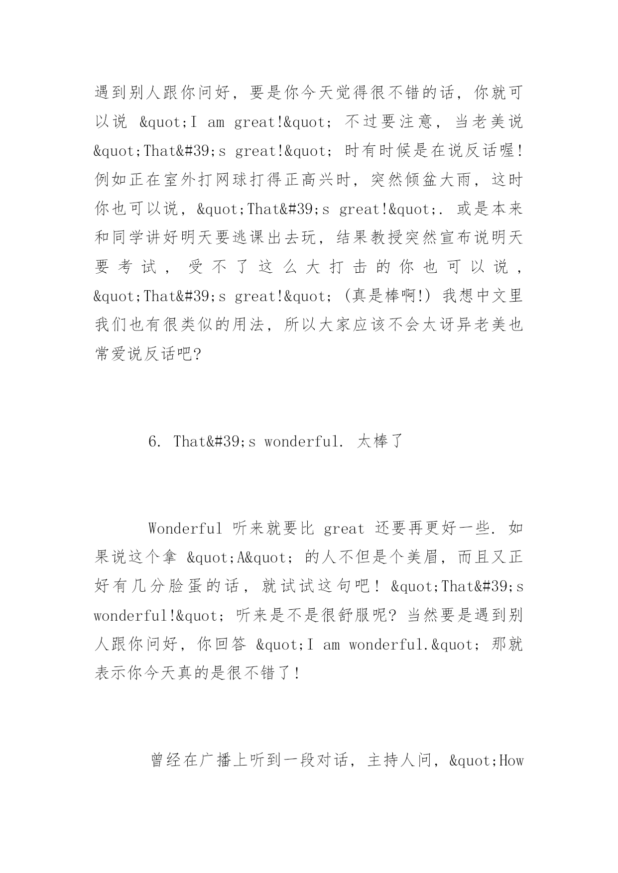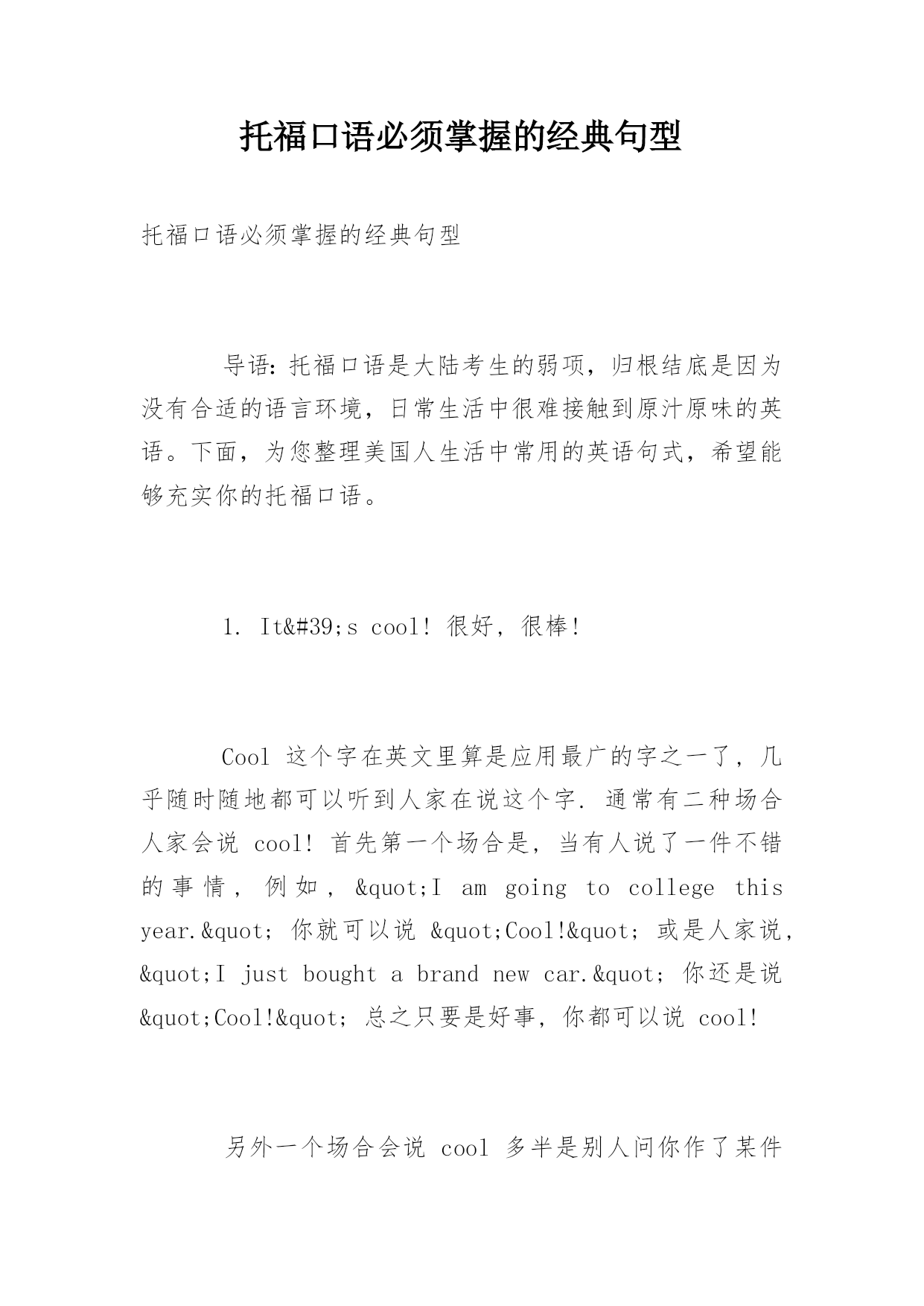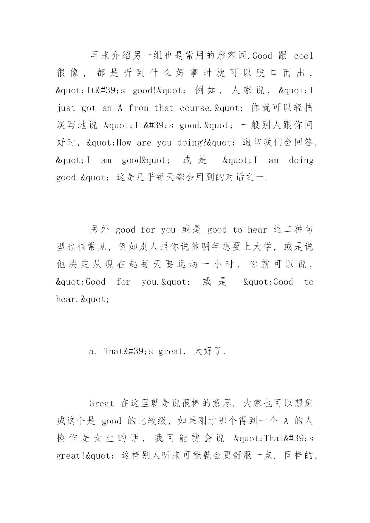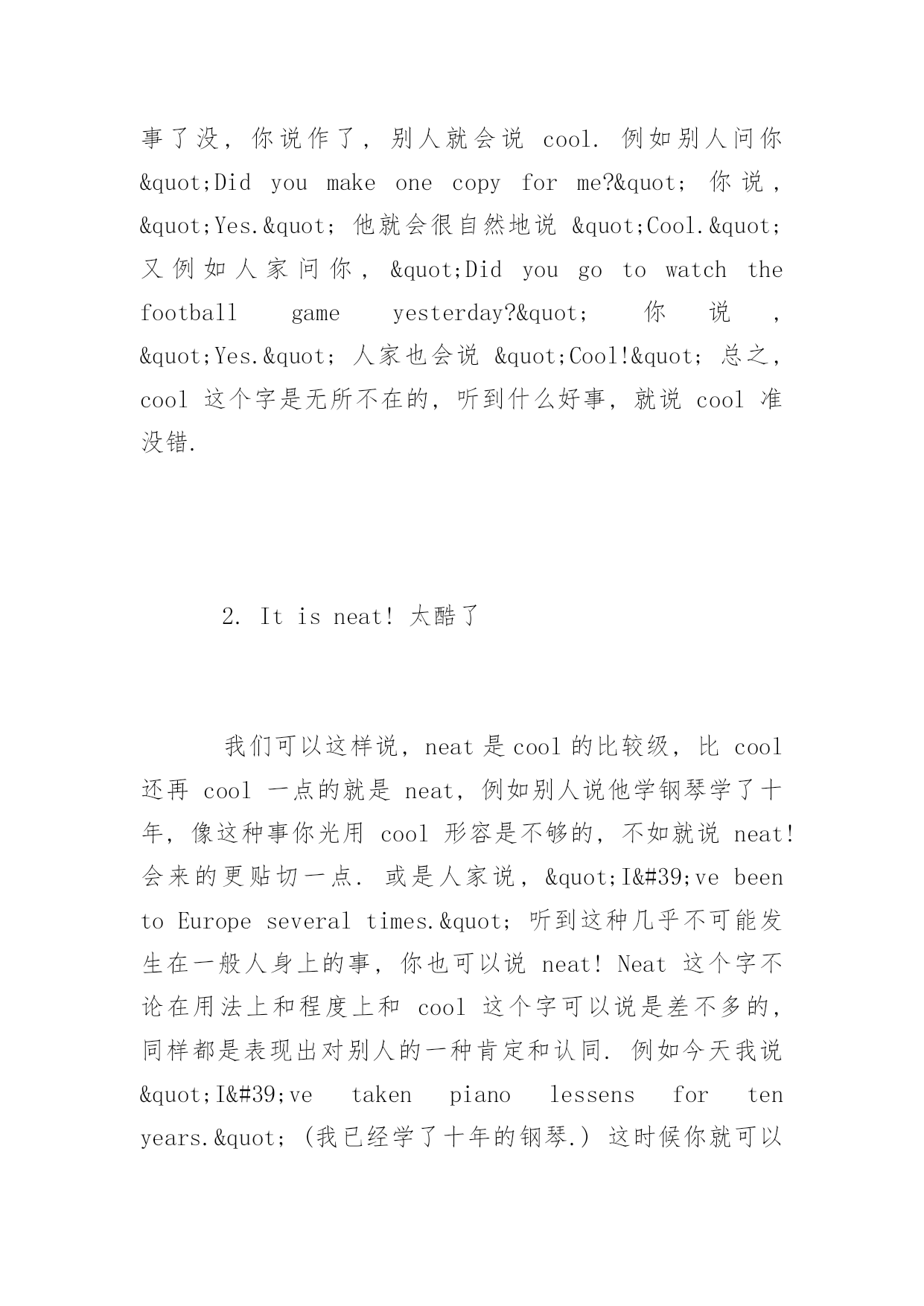托福口语必须掌握的经典句型 托福口语必须掌握的经典句型 导语:托福口语是大陆考生的弱项,归根结底是因为没有合适的语言环境,日常生活中很难接触到原汁原味的英语。下面,为您整理美国人生活中常用的英语句式,希望能够充实你的托福口语。 1.It'scool!很好,很棒! Cool这个字在英文里算是应用最广的字之一了,几乎随时随地都可以听到人家在说这个字.通常有二种场合人家会说cool!首先第一个场合是,当有人说了一件不错的事情,例如,"Iamgoingtocollegethisyear."你就可以说"Cool!"或是人家说,"Ijustboughtabrandnewcar."你还是说"Cool!"总之只要是好事,你都可以说cool! 另外一个场合会说cool多半是别人问你作了某件事了没,你说作了,别人就会说cool.例如别人问你"Didyoumakeonecopyforme?"你说,"Yes."他就会很自然地说"Cool."又例如人家问你,"Didyougotowatchthefootballgameyesterday?"你说,"Yes."人家也会说"Cool!"总之,cool这个字是无所不在的,听到什么好事,就说cool准没错. 2.Itisneat!太酷了 我们可以这样说,neat是cool的比较级,比cool还再cool一点的就是neat,例如别人说他学钢琴学了十年,像这种事你光用cool形容是不够的,不如就说neat!会来的更贴切一点.或是人家说,"I'vebeentoEuropeseveraltimes."听到这种几乎不可能发生在一般人身上的事,你也可以说neat!Neat这个字不论在用法上和程度上和cool这个字可以说是差不多的,同样都是表现出对别人的一种肯定和认同.例如今天我说"I'vetakenpianolessensfortenyears."(我已经学了十年的钢琴.)这时候你就可以接,"Neat!"或"Cool!"(真是不简单!)来表示你的敬佩之意.另外,neat和cool也有「新奇」的意思.当「新奇」解时这两个字常和stuff这个字连用,表示一些很新奇又很棒的事物.例如你为了吸引别人的注意就可以说,"Checkoutthoseneatstuff!"(看看这些很棒的东西.)这里用neat来形容这件东西(stuff)不但很新奇而且值得一看.同样的你也可以说,coolstuff,例如,"I'vejustboughtsomecoolstuff."(我刚买了一些很棒的东西.) 3.Itisrighteous!酷毙了! 这是cool的最高级了,如果一件事让你无法用neat形容,那就只好用这个字了,有人说他刚环游世界一周回来,你就可以跟他说,"It'srighteous!"但是这句蛮少用的,我觉得. 4.It'sgood.很好. 再来介绍另一组也是常用的形容词.Good跟cool很像,都是听到什么好事时就可以脱口而出,"It'sgood!"例如,人家说,"IjustgotanAfromthatcourse."你就可以轻描淡写地说"It'sgood."一般别人跟你问好时,"Howareyoudoing?"通常我们会回答,"Iamgood"或是"Iamdoinggood."这是几乎每天都会用到的对话之一. 另外goodforyou或是goodtohear这二种句型也很常见,例如别人跟你说他明年想要上大学,或是说他决定从现在起每天要运动一小时,你就可以说,"Goodforyou."或是"Goodtohear." 5.That'sgreat.太好了. Great在这里就是说很棒的意思.大家也可以想象成这个是good的比较级,如果刚才那个得到一个A的人换作是女生的话,我可能就会说"That'sgreat!"这样别人听来可能就会更舒服一点.同样的,遇到别人跟你问好,要是你今天觉得很不错的话,你就可以说"Iamgreat!"不过要注意,当老美说"That'sgreat!"时有时候是在说反话喔!例如正在室外
