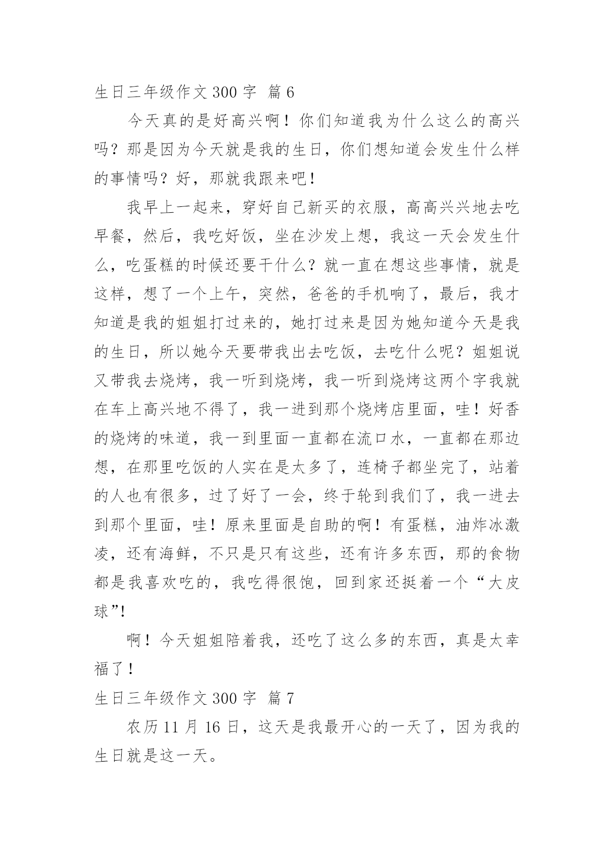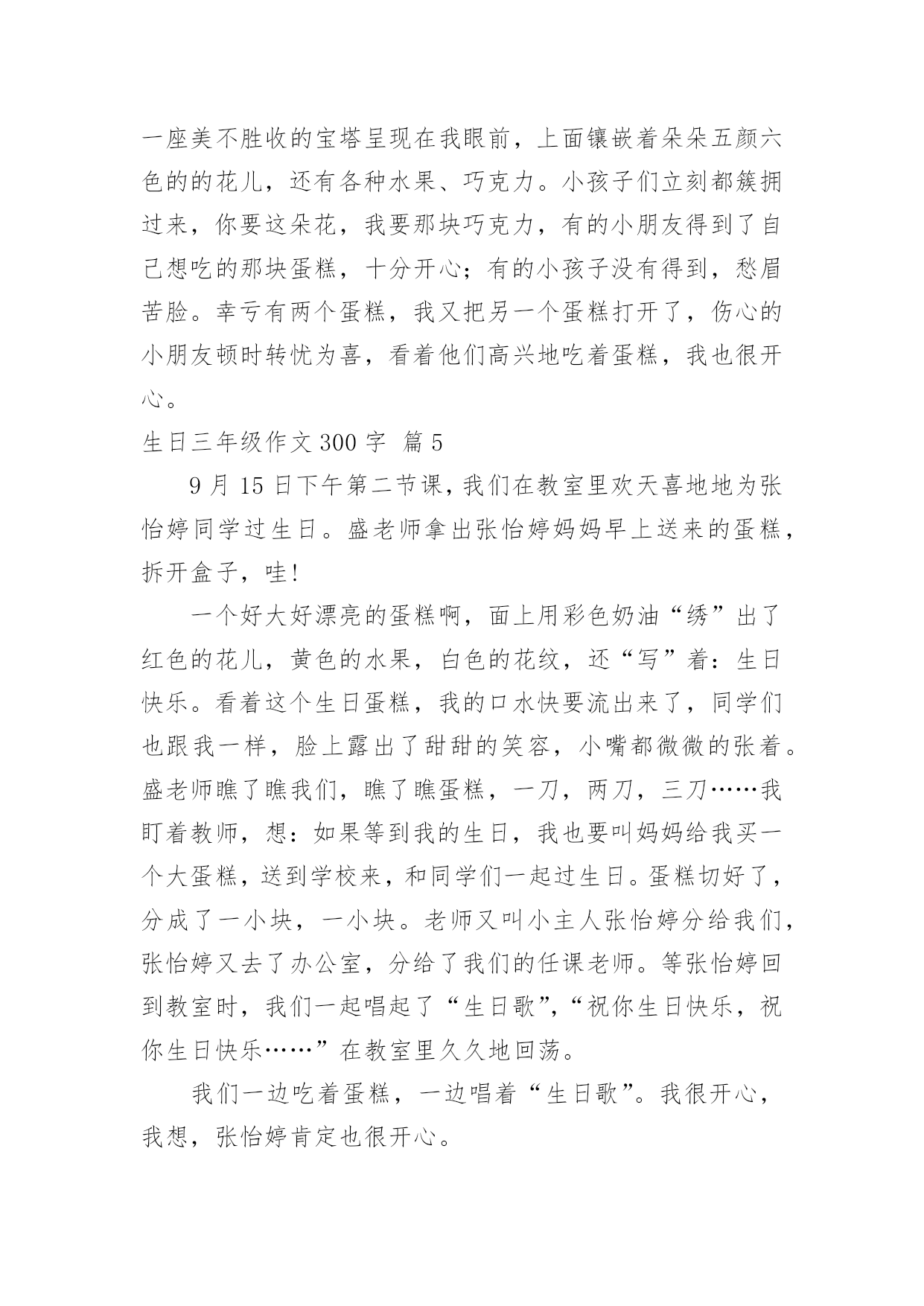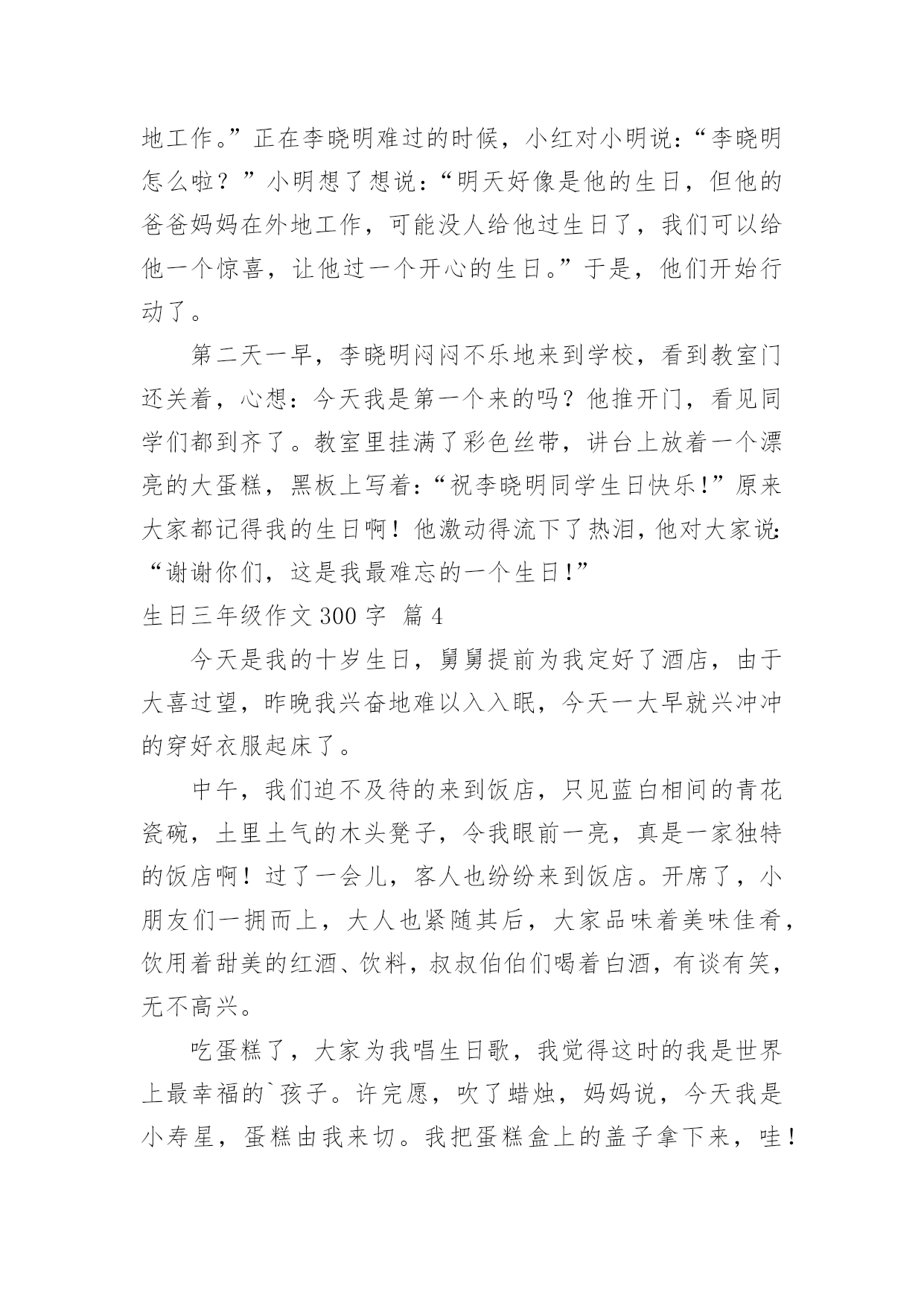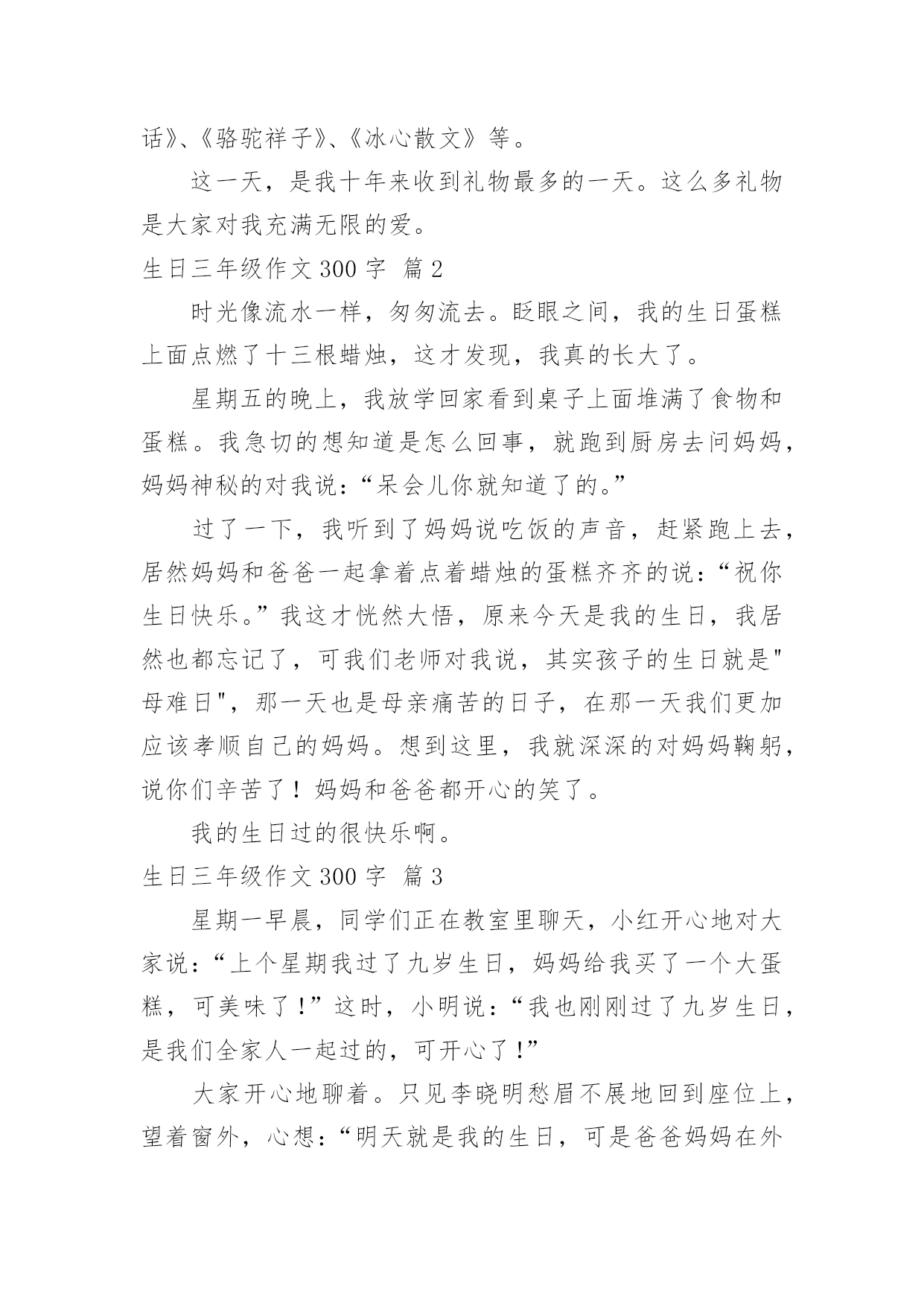 生日三年级作文300字 【精品】生日三年级作文300字八篇在平凡的学习、工作、生活中,许多人都有过写作文的经历,对作文都不陌生吧,作文是一种言语活动,具有高度的综合性和创造性。那么你知道一篇好的作文该怎么写吗?下面是小编收集整理的生日三年级作文300字8篇,仅供参考,大家一起来看看吧。生日三年级作文300字篇1五月一日是我的庆祝十周岁生日的日子,这一天早晨起来我十分开心,心情很激动,心里惦记着今天亲友们会送些什么礼物来给我呢!我正想得出神的时候,妈妈来的最早,她拎着一盒大蛋糕进了门,亲昵地说:“女儿,祝你生日快乐!”我立刻回过神来。三年没见的妈妈变得有些陌生,但我想起幼儿时妈妈第一次与我一块过生日,爱的暖流马上传遍我的全身,这时候心里酸酸的,我紧紧地抱住妈妈,泪流满面一句话都没说,妈妈也紧紧地抱着我。过了一会儿,我俩含泪笑了,好象都在告诉对方“我爱你。”过了好长时间,我盼望的姑姑们终于来了。她们各自带来了不同的礼物,有一份礼物是包装精美的一个盒子,里面是一面多功能的镜子,它不仅能照东西,还能插照片,我喜欢极了。还有一个用彩纸包成的长方体,里面有各种各样的橡皮和便利贴。我最喜欢的是十本崭新的书,有《安徒生童话》、《骆驼祥子》、《冰心散文》等。这一天,是我十年来收到礼物最多的一天。这么多礼物是大家对我充满无限的爱。生日三年级作文300字篇2时光像流水一样,匆匆流去。眨眼之间,我的生日蛋糕上面点燃了十三根蜡烛,这才发现,我真的长大了。星期五的晚上,我放学回家看到桌子上面堆满了食物和蛋糕。我急切的想知道是怎么回事,就跑到厨房去问妈妈,妈妈神秘的对我说:“呆会儿你就知道了的。”过了一下,我听到了妈妈说吃饭的声音,赶紧跑上去,居然妈妈和爸爸一起拿着点着蜡烛的蛋糕齐齐的说:“祝你生日快乐。”我这才恍然大悟,原来今天是我的生日,我居然也都忘记了,可我们老师对我说,其实孩子的生日就是"母难日",那一天也是母亲痛苦的日子,在那一天我们更加应该孝顺自己的妈妈。想到这里,我就深深的对妈妈鞠躬,说你们辛苦了!妈妈和爸爸都开心的笑了。我的生日过的很快乐啊。生日三年级作文300字篇3星期一早晨,同学们正在教室里聊天,小红开心地对大家说:“上个星期我过了九岁生日,妈妈给我买了一个大蛋糕,可美味了!”这时,小明说:“我也刚刚过了九岁生日,是我们全家人一起过的,可开心了!”大家开心地聊着。只见李晓明愁眉不展地回到座位上,望着窗外,心想:“明天就是我的生日,可是爸爸妈妈在外地工作。”正在李晓明难过的时候,小红对小明说:“李晓明怎么啦?”小明想了想说:“明天好像是他的生日,但他的爸爸妈妈在外地工作,可能没人给他过生日了,我们可以给他一个惊喜,让他过一个开心的生日。”于是,他们开始行动了。第二天一早,李晓明闷闷不乐地来到学校,看到教室门还关着,心想:今天我是第一个来的吗?他推开门,看见同学们都到齐了。教室里挂满了彩色丝带,讲台上放着一个漂亮的大蛋糕,黑板上写着:“祝李晓明同学生日快乐!”原来大家都记得我的生日啊!他激动得流下了热泪,他对大家说:“谢谢你们,这是我最难忘的一个生日!”生日三年级作文300字篇4今天是我的十岁生日,舅舅提前为我定好了酒店,由于大喜过望,昨晚我兴奋地难以入入眠,今天一大早就兴冲冲的穿好衣服起床了。中午,我们迫不及待的来到饭店,只见蓝白相间的青花瓷碗,土里土气的木头凳子,令我眼前一亮,真是一家独特的饭店啊!过了一会儿,客人也纷纷来到饭店。开席了,小朋友们一拥而上,大人也紧随其后,大家品味着美味佳肴,饮用着甜美的红酒、饮料,叔叔伯伯们喝着白酒,有谈有笑,无不高兴。吃蛋糕了,大家为我唱生日歌,我觉得这时的我是世界上最幸福的`孩子。许完愿,吹了蜡烛,妈妈说,今天我是小寿星,蛋糕由我来切。我把蛋糕盒上的盖子拿下来,哇!一座美不胜收的宝塔呈现在我眼前,上面镶嵌着朵朵五颜六色的的花儿,还有各种水果、巧克力。小孩子们立刻都簇拥过来,你要这朵花,我要那块巧克力,有的小朋友得到了自己想吃的那块蛋糕,十分开心;有的小孩子没有得到,愁眉苦脸。幸亏有两个蛋糕,我又把另一个蛋糕打开了,伤心的小朋友顿时转忧为喜,看着他们高兴地吃着蛋糕,我也很开心。生日三年级作文300字篇59月15日下午第二节课,我们在教室里欢天喜地地为张怡婷同学过生日。盛老师拿出张怡婷妈妈早上送来的蛋糕,拆开盒子,哇!一个好大好漂亮的蛋糕啊,面上用彩色奶油“绣”出了红色的花儿,黄色的水果,白色的花纹,还“写”着:生日快乐。看着这个生日蛋糕,我的口水快要流出来了,同学们也跟我一样,脸上露出了甜甜的笑容,小嘴都微微的张着。盛老师瞧了瞧我们,瞧了瞧蛋糕,一刀,两刀,三刀……我盯着教师,想:如果等到我的生日,我也要叫妈妈给我买一个大蛋糕,送到学校来,和同学们一起过生日。蛋糕切好了,分成了一小块,一小块。老师又