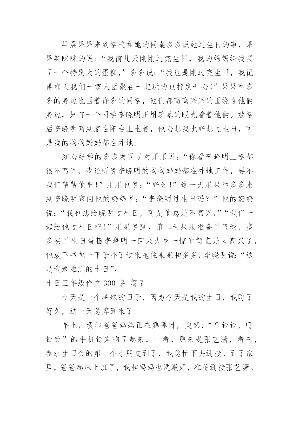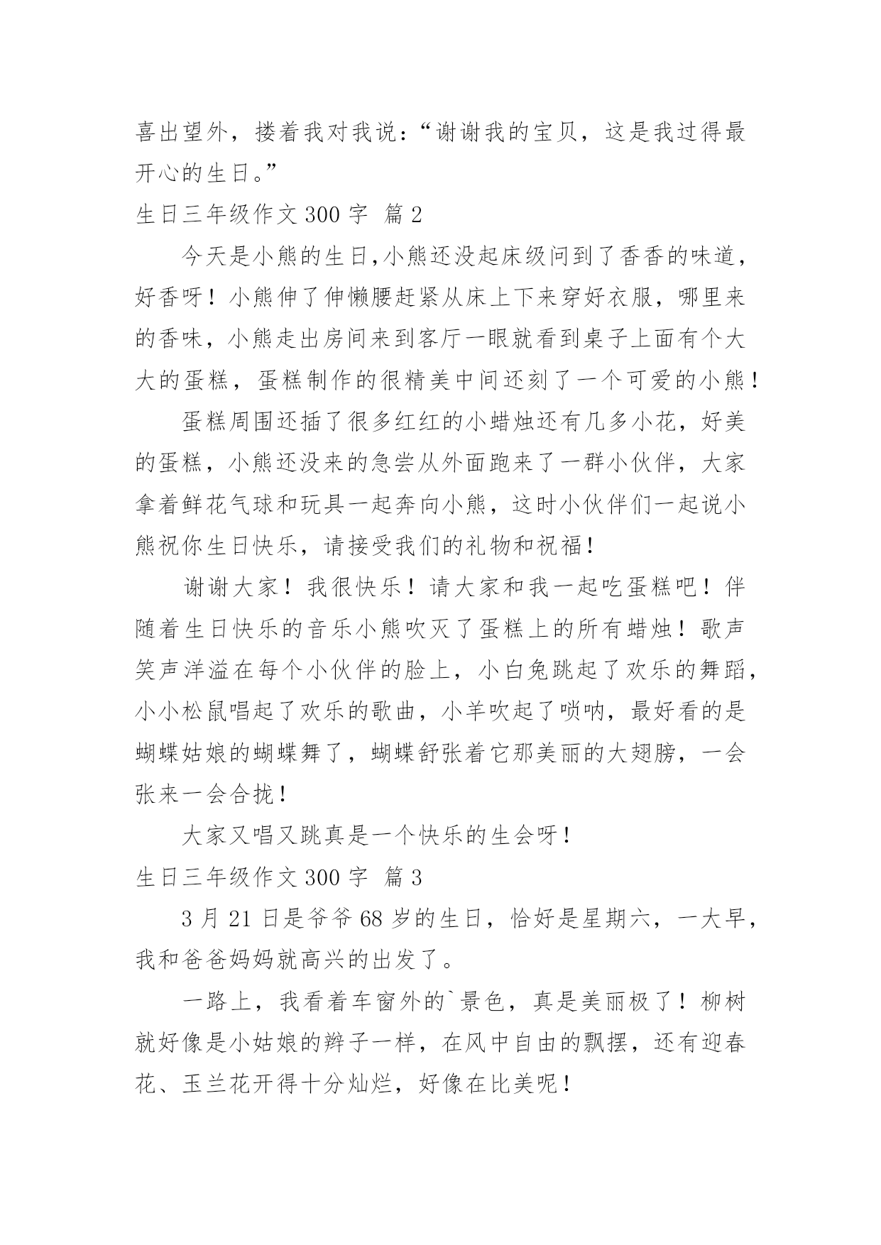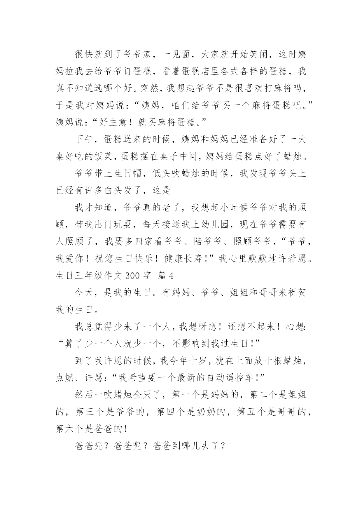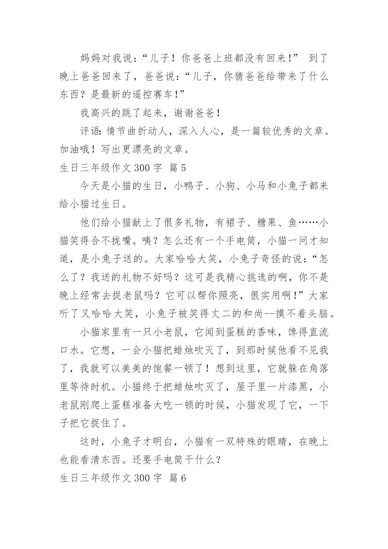 生日三年级作文300字 【精品】生日三年级作文300字合集九篇在日常生活或是工作学习中,大家或多或少都会接触过作文吧,作文是通过文字来表达一个主题意义的记叙方法。一篇什么样的作文才能称之为优秀作文呢?下面是小编收集整理的生日三年级作文300字9篇,仅供参考,大家一起来看看吧。生日三年级作文300字篇1正月初三的晚上,妈妈已经睡着了,我和爸爸还在我的小房间里讨论着明天妈妈过生日的礼物是什么。爸爸说:“还是明天中午给你妈妈买个生日蛋糕吧!”我说:“明天中午家里不是要来客人吗?”爸爸说:也对。”我和爸爸想了很多的法子,可是这些办法都不成立。时间太晚了,爸爸和我实在困得不行了,爸爸就说:“明天早晨再想吧!”我说:“好吧。”正月初四的早晨,都快九点了我和老爸还没有起床初中,我被外面的鞭炮声吵醒了,我一看表已经九点了,我赶紧穿好衣服来到爸爸的房间把爸爸叫醒。今天妈妈值班,已经去上班了。我灵机一动对爸爸说:“爸爸,妈妈现在应该还没有吃饭,我们可以给妈妈买个小蛋糕就当给妈妈过生日了。”爸爸说:“对呀。”于是我和爸爸到名仕来蛋糕店买了个非常漂亮的蛋糕。我和爸爸来到妈妈的单位,我把蛋糕递给了妈妈,妈妈喜出望外,搂着我对我说:“谢谢我的宝贝,这是我过得最开心的生日。”生日三年级作文300字篇2今天是小熊的生日,小熊还没起床级问到了香香的味道,好香呀!小熊伸了伸懒腰赶紧从床上下来穿好衣服,哪里来的香味,小熊走出房间来到客厅一眼就看到桌子上面有个大大的蛋糕,蛋糕制作的很精美中间还刻了一个可爱的小熊!蛋糕周围还插了很多红红的小蜡烛还有几多小花,好美的蛋糕,小熊还没来的急尝从外面跑来了一群小伙伴,大家拿着鲜花气球和玩具一起奔向小熊,这时小伙伴们一起说小熊祝你生日快乐,请接受我们的礼物和祝福!谢谢大家!我很快乐!请大家和我一起吃蛋糕吧!伴随着生日快乐的音乐小熊吹灭了蛋糕上的所有蜡烛!歌声笑声洋溢在每个小伙伴的脸上,小白兔跳起了欢乐的舞蹈,小小松鼠唱起了欢乐的歌曲,小羊吹起了唢呐,最好看的是蝴蝶姑娘的蝴蝶舞了,蝴蝶舒张着它那美丽的大翅膀,一会张来一会合拢!大家又唱又跳真是一个快乐的生会呀!生日三年级作文300字篇33月21日是爷爷68岁的生日,恰好是星期六,一大早,我和爸爸妈妈就高兴的出发了。一路上,我看着车窗外的`景色,真是美丽极了!柳树就好像是小姑娘的辫子一样,在风中自由的飘摆,还有迎春花、玉兰花开得十分灿烂,好像在比美呢!很快就到了爷爷家,一见面,大家就开始笑闹,这时姨妈拉我去给爷爷订蛋糕,看着蛋糕店里各式各样的蛋糕,我真不知道选哪个好。突然,我想起爷爷不是很喜欢打麻将吗,于是我对姨妈说:“姨妈,咱们给爷爷买一个麻将蛋糕吧。”姨妈说:“好主意!就买麻将蛋糕。”下午,蛋糕送来的时候,姨妈和妈妈已经准备好了一大桌好吃的饭菜,蛋糕摆在桌子中间,姨妈给蛋糕点好了蜡烛。爷爷带上生日帽,低头吹蜡烛的时候,我发现爷爷头上已经有许多白头发了,这是我才知道,爷爷真的老了,我想起小时候爷爷对我的照顾,带我出门玩耍,每天接送我上幼儿园,现在爷爷需要有人照顾了,我要多回家看爷爷、陪爷爷、照顾爷爷,“爷爷,我爱你!祝您生日快乐!健康长寿!”我心里默默地许着愿。生日三年级作文300字篇4今天,是我的生日。有妈妈、爷爷、姐姐和哥哥来祝贺我的生日。我总觉得少来了一个人,我想呀想!还想不起来!心想:“算了少一个人就少一个,不影响到我过生日!”到了我许愿的时候,我今年十岁,就在上面放十根蜡烛,点燃、许愿:“我希望要一个最新的自动遥控车!”然后一吹蜡烛全灭了,第一个是妈妈的,第二个是姐姐的,第三个是爷爷的,第四个是奶奶的,第五个是哥哥的,第六个是爸爸的!爸爸呢?爸爸呢?爸爸到哪儿去了?妈妈对我说:“儿子!你爸爸上班都没有回来!”到了晚上爸爸回来了,爸爸说:“儿子,你猜爸爸给带来了什么东西?是最新的遥控赛车!”我高兴的跳了起来,谢谢爸爸!评语:情节曲折动人,深入人心,是一篇较优秀的文章。加油哦!写出更漂亮的文章。生日三年级作文300字篇5今天是小猫的生日,小鸭子、小狗、小马和小兔子都来给小猫过生日。他们给小猫献上了很多礼物,有裙子、糖果、鱼……小猫笑得合不拢嘴。咦?怎么还有一个手电筒,小猫一问才知道,是小兔子送的。大家哈哈大笑,小兔子奇怪的说:“怎么了?我送的礼物不好吗?这可是我精心挑选的啊,你不是晚上经常去捉老鼠吗?它可以帮你照亮,很实用啊!”大家听了又哈哈大笑,小兔子被笑得丈二的和尚--摸不着头脑。小猫家里有一只小老鼠,它闻到蛋糕的香味,馋得直流口水。它想,一会小猫把蜡烛吹灭了,到那时候他看不见我了,我就可以美美的饱餐一顿了!想到这里,它就躲在角落里等待时机。小猫终于把蜡烛吹灭了,屋子里一片漆黑,小老鼠刚爬上蛋糕准备大吃一顿的时候,小猫发现了它,一下子把它捉住了。这时,小兔子才明白,小猫