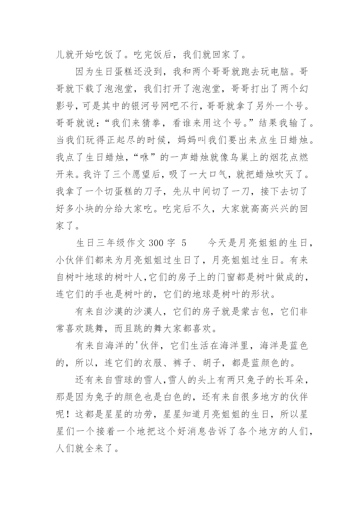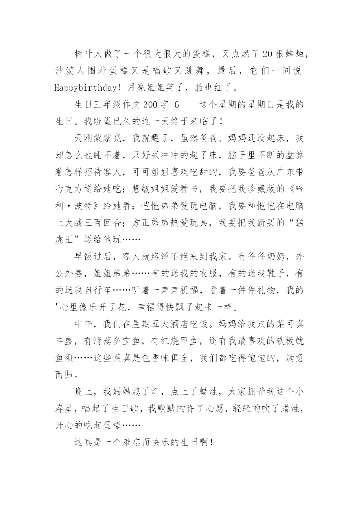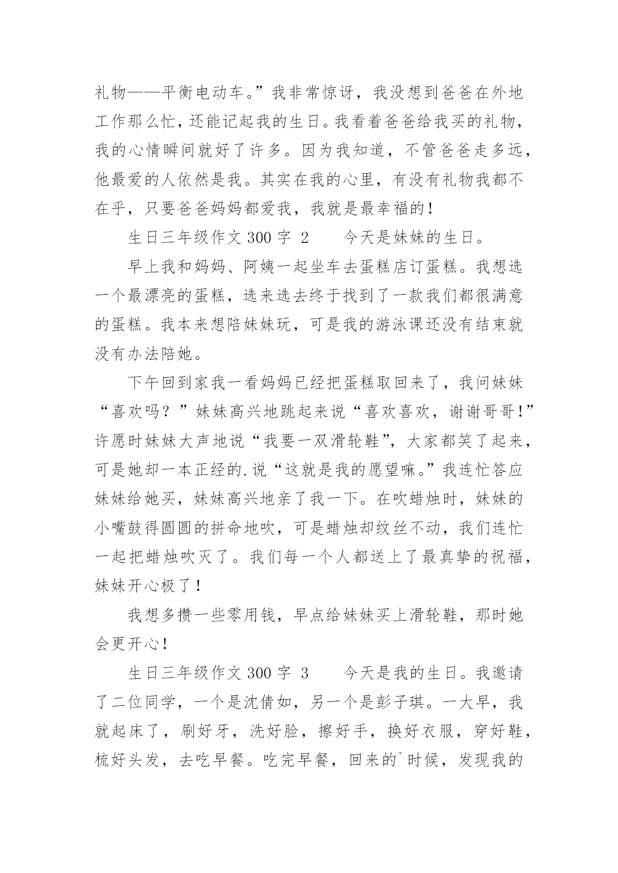 生日三年级作文300字 热门生日三年级作文300字合集27篇无论在学习、工作或是生活中,大家或多或少都会接触过作文吧,作文是经过人的思想考虑和语言组织,通过文字来表达一个主题意义的记叙方法。如何写一篇有思想、有文采的作文呢?以下是小编为大家收集的生日三年级作文300字,仅供参考,欢迎大家阅读。生日三年级作文300字1今天是我的生日,本应该是我最开心的一天,可是我非常难过,是因为我特别地念一个人,那就是我亲爱的爸爸。以往我每次过生日,所有的事情都是爸爸替我安排的,比如说:带我去吃我最爱的披萨,陪我玩最喜欢的“小勇士大冒险”,还带我去看电影。可是今天,我的生日爸爸却不在家,他因为工作忙回不来。所以我的心情有些失落。这天早上,我很早就醒了,可是,我躺在床上翻来覆去就是不想起床。这时,妈妈推开门进来了,说:“我的小公主,祝你生日快乐!你怎么还不起床呢?妈妈已经给你做好了长寿面,你赶快起来吃吧,一会儿凉了就不好吃了。”我慢慢腾腾地起床,穿好衣服,坐在椅子上吃着妈妈给我做的生日早餐。我正吃着,突然妈妈的手机响了起来,妈妈接了电话就下了楼,不一会儿妈妈就抱着一个长长的'纸箱子上来了。我问妈妈,这是什么呀?妈妈说:“这是爸爸给你买的生日礼物——平衡电动车。”我非常惊讶,我没想到爸爸在外地工作那么忙,还能记起我的生日。我看着爸爸给我买的礼物,我的心情瞬间就好了许多。因为我知道,不管爸爸走多远,他最爱的人依然是我。其实在我的心里,有没有礼物我都不在乎,只要爸爸妈妈都爱我,我就是最幸福的!生日三年级作文300字2今天是妹妹的生日。早上我和妈妈、阿姨一起坐车去蛋糕店订蛋糕。我想选一个最漂亮的蛋糕,选来选去终于找到了一款我们都很满意的蛋糕。我本来想陪妹妹玩,可是我的游泳课还没有结束就没有办法陪她。下午回到家我一看妈妈已经把蛋糕取回来了,我问妹妹“喜欢吗?”妹妹高兴地跳起来说“喜欢喜欢,谢谢哥哥!”许愿时妹妹大声地说“我要一双滑轮鞋”,大家都笑了起来,可是她却一本正经的.说“这就是我的愿望嘛。”我连忙答应妹妹给她买,妹妹高兴地亲了我一下。在吹蜡烛时,妹妹的小嘴鼓得圆圆的拼命地吹,可是蜡烛却纹丝不动,我们连忙一起把蜡烛吹灭了。我们每一个人都送上了最真挚的祝福,妹妹开心极了!我想多攒一些零用钱,早点给妹妹买上滑轮鞋,那时她会更开心!生日三年级作文300字3今天是我的生日。我邀请了二位同学,一个是沈倩如,另一个是彭子琪。一大早,我就起床了,刷好牙,洗好脸,擦好手,换好衣服,穿好鞋,梳好头发,去吃早餐。吃完早餐,回来的`时候,发现我的同学已经在大门口等我了。妈妈打开两扇门,我们就跑进了我房间。沈倩茹送书,彭子琪送本子。我开心地接过礼物并说了“谢谢”。我说:“我们玩买东西怎么样?”她们说:“好!”我们先拍出一些玩具和文具,轮流当买卖人。一下子就到中午了。我们吃完饭,沈倩茹去读书了,我们睡觉。睡完觉,我们继续玩。没想到,彭子琪的妈妈来了,她对我说:“我们要去乡下,不能去吃你的生日蛋糕了。”我说:“知道了,阿姨。”过了一会儿,沈倩茹回来了。我、同学、妈妈手上拿着一个蛋糕盒,里面是蛋糕,妈妈开车去牛排馆。我们吃完牛排和蛋糕,玩了一下电脑,接着玩起了滑滑梯。在里面,碰到同学汪雨强。我和沈倩茹跟他展开了战斗。最终,我们赢了。回家后,我想:过生日真好。生日三年级作文300字4今天,是我的生日,我起床时就发现奶奶煮了面线。因为那是我们闽南的风俗习惯。奶奶看见我就叫我先吃一碗面线。我开始期待晚上大家为我庆生。晚上我在大厅看电视时,哥哥突然跑时客厅来找我,我们玩了一会儿。我在想:“咦!奇怪怎么连一句生日快乐都不说?”忽然姑姑走进客厅说:“妈妈叫我们到隔壁的亲戚家。”我到的.时候发现大家都到了。不一会儿表姐拿了一个书包给我,她说:“拿去,这是给你的生日礼物。”过了一会儿就开始吃饭了。吃完饭后,我们就回家了。因为生日蛋糕还没到,我和两个哥哥就跑去玩电脑。哥哥就下载了泡泡堂,我们打开了泡泡堂,哥哥打出了两个幻影号,可是其中的银河号网吧不行,哥哥就拿了另外一个号。哥哥就说:“我们来猜拳,看谁来用这个号。”结果我输了。当我们玩得正起尽的时候,妈妈叫我们要出来点生日蜡烛。我点了生日蜡烛,“咻”的一声蜡烛就像鸟巢上的烟花点燃开来。我许了三个愿望后,吸了一大口气,就把蜡烛吹灭了。我拿了一个切蛋糕的刀子,先从中间切了一刀,接下去切了好多小块的分给大家吃。吃完后不久,大家就高高兴兴的回家了。生日三年级作文300字5今天是月亮姐姐的生日,小伙伴们都来为月亮姐姐过生日了,月亮姐姐过生日。有来自树叶地球的树叶人,它们的房子上的门窗都是树叶做成的,连它们的手也是树叶的,它们的地球是树叶的形状。有来自沙漠的沙漠人,它们的房子就是蒙古包,它们非常喜欢跳舞,而且跳的舞大家都喜欢。有来自海洋的'伙伴,它们生活在海洋