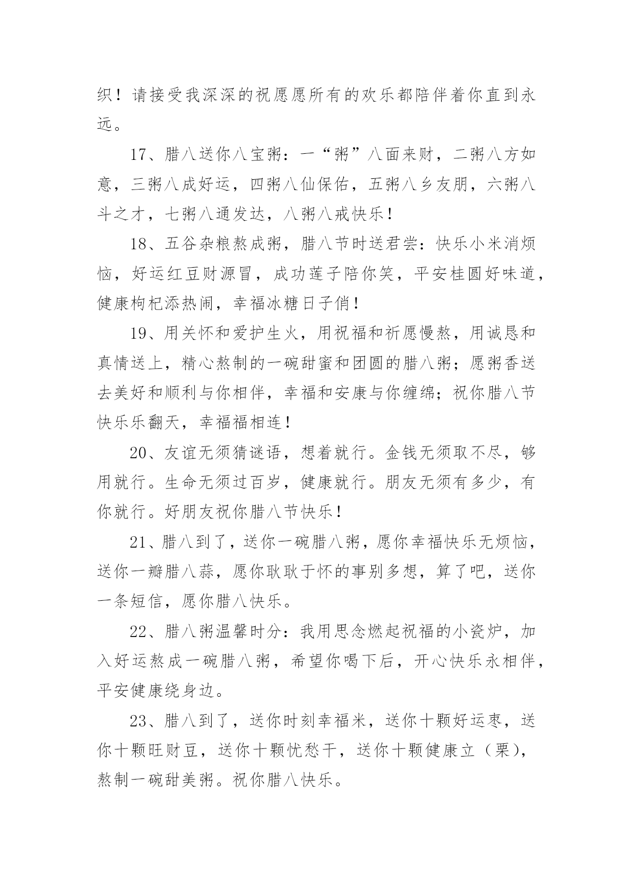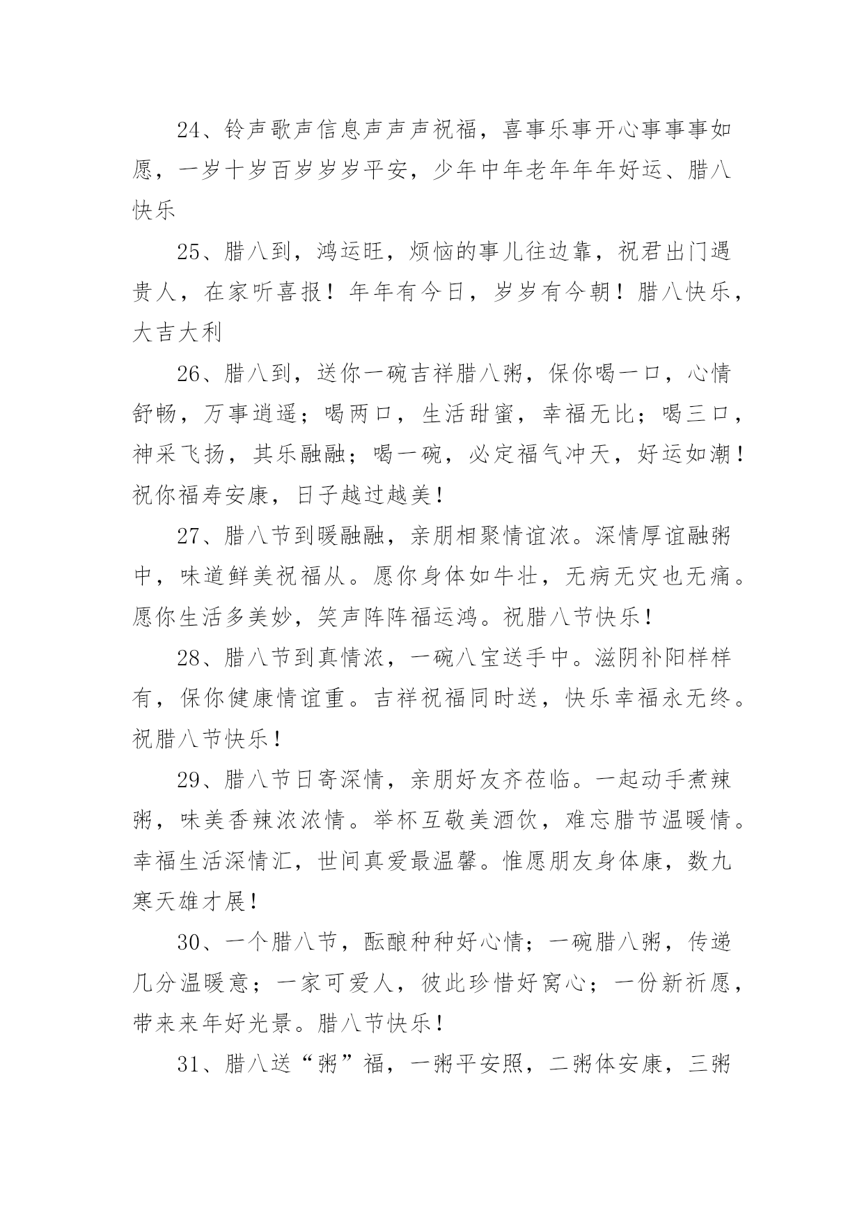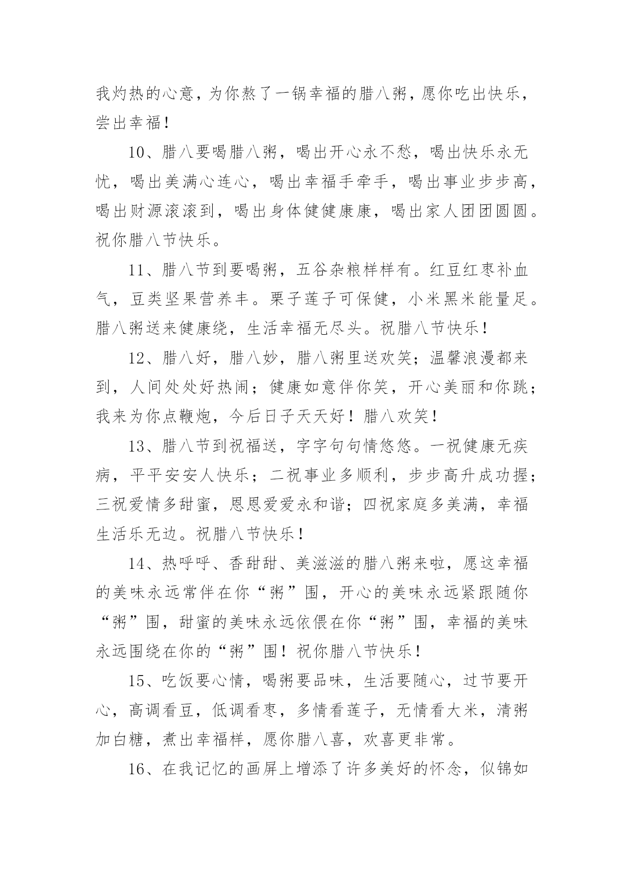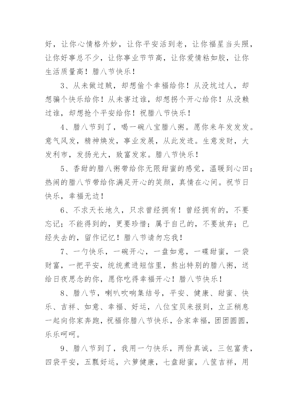 腊八祝福语句简短 腊八祝福语句简短一、腊八节喝腊八粥的习俗来源腊八粥,又称“七宝五味粥”、“佛粥”、“大家饭”等,是一种由多样食材熬制而成的粥。腊八粥的最早文字记载在宋代。南宋吴自牧《梦梁录》载:“此月八日,寺院谓之腊八。大刹等寺,俱设五味粥,名曰腊八粥。”我国喝腊八粥的历史,已有一千年以上了。每逢腊八这天,不论是朝廷官府、寺院还是黎民百姓家都要做腊八粥。到了清朝,喝腊八粥的风俗更是盛行。二、腊八祝福语句简短(精选380句)在平平淡淡的学习、工作、生活中,大家对祝福语都再熟悉不过了吧,祝福语的类型多样,可以是感动的,兴奋的,幽默的。那什么样的祝福语才是好的祝福语呢?以下是小编帮大家整理的腊八祝福语句简短(精选380句),仅供参考,大家一起来看看吧。腊八节短句说说(1-100句)1、一碗“幸福”,双手捧上,三请品尝,四味吉祥,五谷芬芳,六味飘香,七仙问候,八仙祝福,腊八节,愿你身体棒棒,八面风,吹不到,幸福快乐,乐逍遥。2、腊八节,来口粥,八宝奇效在后头:让你身体倍加好,让你心情格外妙,让你平安活到老,让你福星当头照,让你好事总不少,让你事业节节高,让你爱情粘如胶,让你生活质量高!腊八节快乐!3、从未做过贼,却想偷个幸福给你!从没坑过人,却想骗个快乐给你!从未害过谁,却想拐个开心给你!从没赖过谁,却想抢个平安给你!祝腊八节快乐!4、腊八节到了,喝一碗八宝腊八粥。愿你来年发发发。意气风发,精神焕发,事业发展,从此发迹。生意发财,大发利市,发扬光大,致富发家。腊八节快乐!5、香甜的腊八粥带给你无限甜蜜的感觉,温暖到心田;热闹的腊八节带给你满足开心的笑颜,真情在心间。祝节日快乐,幸福无边!6、不求天长地久,只求曾经拥有!曾经拥有的,不要忘记;不能得到的,更要珍惜;属于自己的,不要放弃;已经失去的,留作记忆!腊八节请勿忘我!7、一勺快乐,一碗开心,一盘如意,一碟甜蜜,一袋财富,一把平安,统统煮进短信里,熬出特别的腊八粥,送给日夜思念的你,愿你吃得幸福开心!腊八节快乐!8、腊八节,喇叭吹响集结号,平安、健康、甜蜜、快乐、吉祥、如意、幸福、好运,八位宝贝来报到,立正稍息一起向你家奔跑,祝福你腊八节快乐,合家幸福,团团圆圆,乐乐呵呵。9、腊八节到了,我用一勺快乐,两份真诚,三包富贵,四袋平安,五瓢好运,六箩健康,七盘甜蜜,八筐吉祥,用我灼热的心意,为你熬了一锅幸福的腊八粥,愿你吃出快乐,尝出幸福!10、腊八要喝腊八粥,喝出开心永不愁,喝出快乐永无忧,喝出美满心连心,喝出幸福手牵手,喝出事业步步高,喝出财源滚滚到,喝出身体健健康康,喝出家人团团圆圆。祝你腊八节快乐。11、腊八节到要喝粥,五谷杂粮样样有。红豆红枣补血气,豆类坚果营养丰。栗子莲子可保健,小米黑米能量足。腊八粥送来健康绕,生活幸福无尽头。祝腊八节快乐!12、腊八好,腊八妙,腊八粥里送欢笑;温馨浪漫都来到,人间处处好热闹;健康如意伴你笑,开心美丽和你跳;我来为你点鞭炮,今后日子天天好!腊八欢笑!13、腊八节到祝福送,字字句句情悠悠。一祝健康无疾病,平平安安人快乐;二祝事业多顺利,步步高升成功握;三祝爱情多甜蜜,恩恩爱爱永和谐;四祝家庭多美满,幸福生活乐无边。祝腊八节快乐!14、热呼呼、香甜甜、美滋滋的腊八粥来啦,愿这幸福的美味永远常伴在你“粥”围,开心的美味永远紧跟随你“粥”围,甜蜜的美味永远依偎在你“粥”围,幸福的美味永远围绕在你的“粥”围!祝你腊八节快乐!15、吃饭要心情,喝粥要品味,生活要随心,过节要开心,高调看豆,低调看枣,多情看莲子,无情看大米,清粥加白糖,煮出幸福样,愿你腊八喜,欢喜更非常。16、在我记忆的画屏上增添了许多美好的怀念,似锦如织!请接受我深深的祝愿愿所有的欢乐都陪伴着你直到永远。17、腊八送你八宝粥:一“粥”八面来财,二粥八方如意,三粥八成好运,四粥八仙保佑,五粥八乡友朋,六粥八斗之才,七粥八通发达,八粥八戒快乐!18、五谷杂粮熬成粥,腊八节时送君尝:快乐小米消烦恼,好运红豆财源冒,成功莲子陪你笑,平安桂圆好味道,健康枸杞添热闹,幸福冰糖日子俏!19、用关怀和爱护生火,用祝福和祈愿慢熬,用诚恳和真情送上,精心熬制的一碗甜蜜和团圆的腊八粥;愿粥香送去美好和顺利与你相伴,幸福和安康与你缠绵;祝你腊八节快乐乐翻天,幸福福相连!20、友谊无须猜谜语,想着就行。金钱无须取不尽,够用就行。生命无须过百岁,健康就行。朋友无须有多少,有你就行。好朋友祝你腊八节快乐!21、腊八到了,送你一碗腊八粥,愿你幸福快乐无烦恼,送你一瓣腊八蒜,愿你耿耿于怀的事别多想,算了吧,送你一条短信,愿你腊八快乐。22、腊八粥温馨时分:我用思念燃起祝福的小瓷炉,加入好运熬成一碗腊八粥,希望你喝下后,开心快乐永相伴,平安健康绕身边。23、腊八到了,送你时刻幸福米,送你十颗好运枣,送你十颗旺财豆,送你