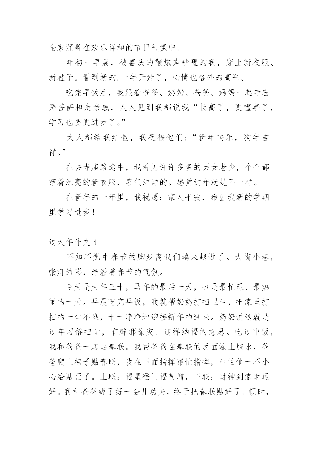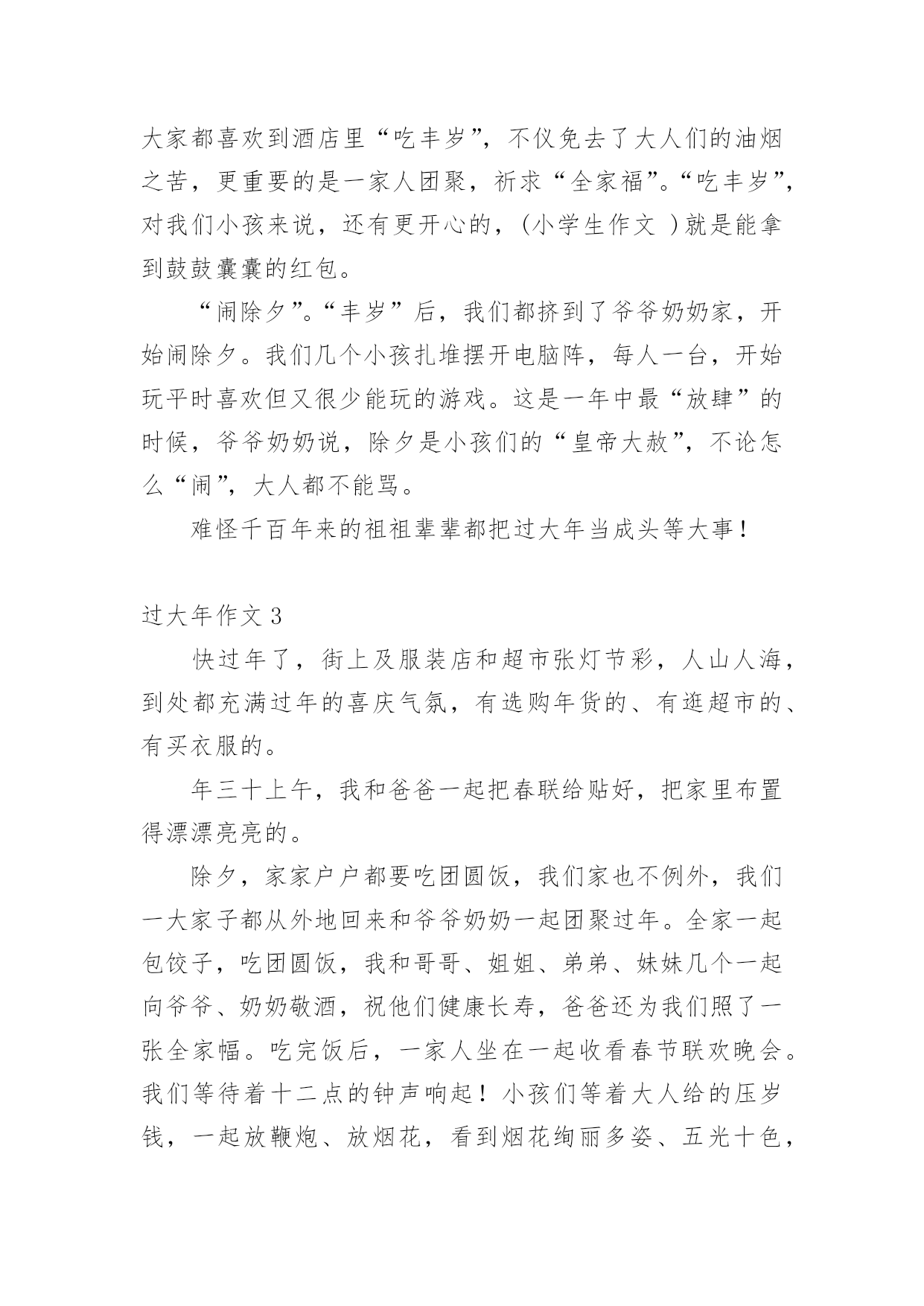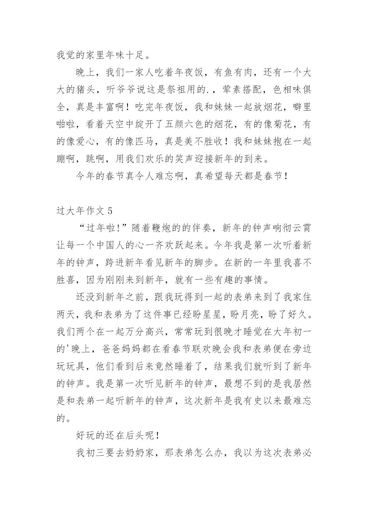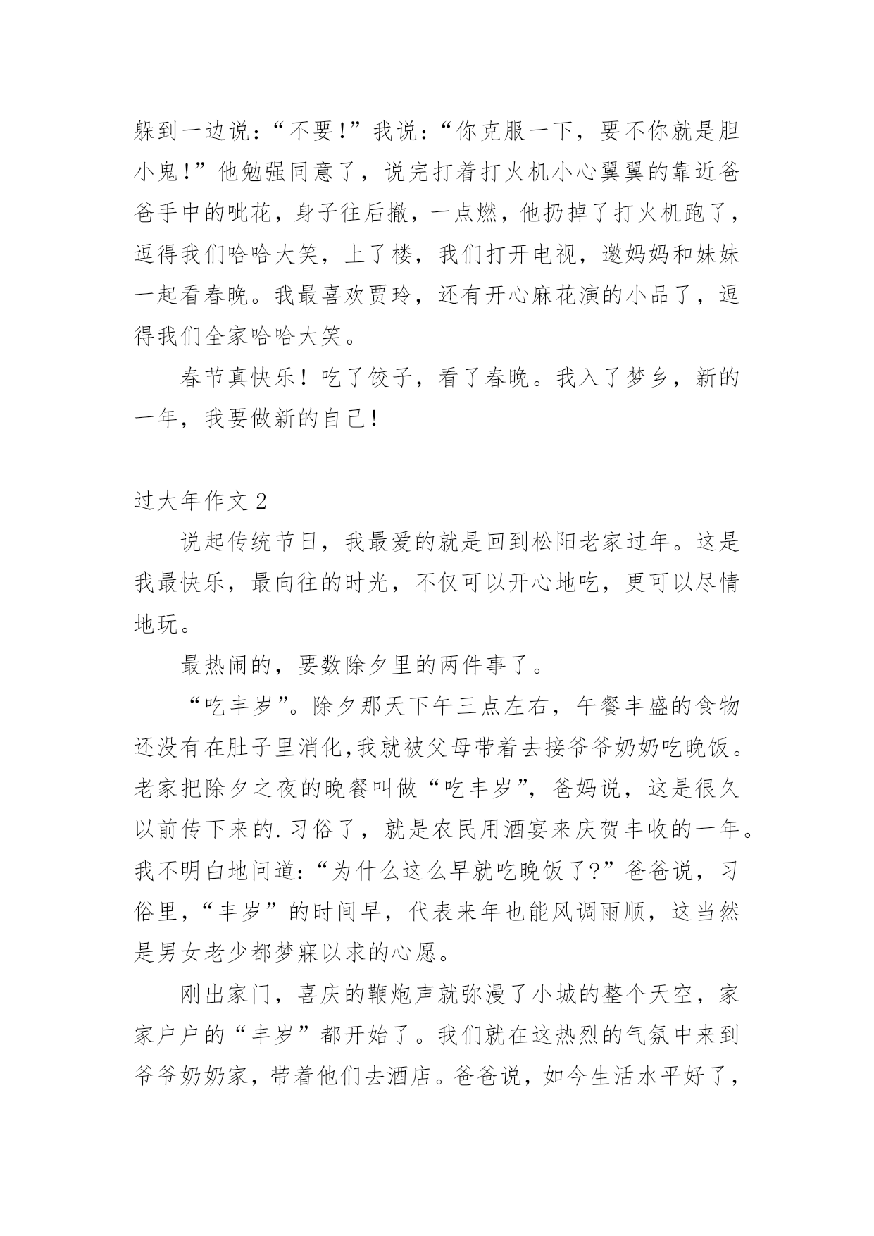 过大年作文 过大年作文10篇在学习、工作或生活中,大家都不可避免地要接触到作文吧,作文是经过人的思想考虑和语言组织,通过文字来表达一个主题意义的记叙方法。那么,怎么去写作文呢?以下是小编收集整理的过大年作文,仅供参考,希望能够帮助到大家。过大年作文1“爆竹声中一岁除,春风送暖入屠苏。”伴随着炮竹声,我们期盼已久的新年终于要来了。现在大街上挂满了彩灯,三号路上,大树上有的像天上的星星闪烁;有的是一条条小鱼活灵活现,发出耀眼的光;有的像气球五颜六色;有的是一个个管子挂在树上,远远望去像彩虹。还有灯柱上挂着两个大红灯笼,可美了!超市里人山人海,走都走不动。还放着新年的歌曲,天花板上挂着福字、灯笼,物品应有尽有,琳琅满目。各个物品架前挤满了人,水果区更是人多,挤不动。有的.人抓几把桂圆,拿一串香蕉,真是热闹非凡!家里有了更大变化,每个房间都贴上小猪,窗花,福字。我们买的物品堆满了一地,都准备迎新呢!我和表弟、爸爸拿着呲花、摔炮儿来到楼下。我对表弟说:“你来点呲花!”我边说边把呲花和打火机给表弟,表弟躲到一边说:“不要!”我说:“你克服一下,要不你就是胆小鬼!”他勉强同意了,说完打着打火机小心翼翼的靠近爸爸手中的呲花,身子往后撤,一点燃,他扔掉了打火机跑了,逗得我们哈哈大笑,上了楼,我们打开电视,邀妈妈和妹妹一起看春晚。我最喜欢贾玲,还有开心麻花演的小品了,逗得我们全家哈哈大笑。春节真快乐!吃了饺子,看了春晚。我入了梦乡,新的一年,我要做新的自己!过大年作文2说起传统节日,我最爱的就是回到松阳老家过年。这是我最快乐,最向往的时光,不仅可以开心地吃,更可以尽情地玩。最热闹的,要数除夕里的两件事了。“吃丰岁”。除夕那天下午三点左右,午餐丰盛的食物还没有在肚子里消化,我就被父母带着去接爷爷奶奶吃晚饭。老家把除夕之夜的晚餐叫做“吃丰岁”,爸妈说,这是很久以前传下来的.习俗了,就是农民用酒宴来庆贺丰收的一年。我不明白地问道:“为什么这么早就吃晚饭了?”爸爸说,习俗里,“丰岁”的时间早,代表来年也能风调雨顺,这当然是男女老少都梦寐以求的心愿。刚出家门,喜庆的鞭炮声就弥漫了小城的整个天空,家家户户的“丰岁”都开始了。我们就在这热烈的气氛中来到爷爷奶奶家,带着他们去酒店。爸爸说,如今生活水平好了,大家都喜欢到酒店里“吃丰岁”,不仪免去了大人们的油烟之苦,更重要的是一家人团聚,祈求“全家福”。“吃丰岁”,对我们小孩来说,还有更开心的,(小学生作文)就是能拿到鼓鼓囊囊的红包。“闹除夕”。“丰岁”后,我们都挤到了爷爷奶奶家,开始闹除夕。我们几个小孩扎堆摆开电脑阵,每人一台,开始玩平时喜欢但又很少能玩的游戏。这是一年中最“放肆”的时候,爷爷奶奶说,除夕是小孩们的“皇帝大赦”,不论怎么“闹”,大人都不能骂。难怪千百年来的祖祖辈辈都把过大年当成头等大事!过大年作文3快过年了,街上及服装店和超市张灯节彩,人山人海,到处都充满过年的喜庆气氛,有选购年货的、有逛超市的、有买衣服的。年三十上午,我和爸爸一起把春联给贴好,把家里布置得漂漂亮亮的。除夕,家家户户都要吃团圆饭,我们家也不例外,我们一大家子都从外地回来和爷爷奶奶一起团聚过年。全家一起包饺子,吃团圆饭,我和哥哥、姐姐、弟弟、妹妹几个一起向爷爷、奶奶敬酒,祝他们健康长寿,爸爸还为我们照了一张全家幅。吃完饭后,一家人坐在一起收看春节联欢晚会。我们等待着十二点的钟声响起!小孩们等着大人给的压岁钱,一起放鞭炮、放烟花,看到烟花绚丽多姿、五光十色,全家沉醉在欢乐祥和的节日气氛中。年初一早晨,被喜庆的鞭炮声吵醒的我,穿上新衣服、新鞋子。看到新的.一年开始了,心情也格外的高兴。吃完早饭后,我跟着爷爷、奶奶、爸爸、妈妈一起寺庙拜菩萨和走亲戚,人人见到我都说我“长高了,更懂事了,学习也要更进步了。”大人都给我红包,我祝福他们:“新年快乐,狗年吉祥。”在去寺庙路途中,我看见许许多多的男女老少,个个都穿着漂亮的新衣服,喜气洋洋的。感觉过年就是不一样。在新年的一年里,我祝愿:家人平安,希望我新的学期里学习进步!过大年作文4不知不觉中春节的脚步离我们越来越近了。大街小巷,张灯结彩,洋溢着春节的气氛。今天是大年三十,马年的最后一天,也是最忙碌、最热闹的一天。早晨吃完早饭,我就帮奶奶打扫卫生,把家里打扫的一尘不染,干干净净地迎接新年的到来。奶奶说这就是过年习俗扫尘,有辟邪除灾、迎祥纳福的意思。吃过中饭,我和爸爸一起贴春联。我帮爸爸在春联的反面涂上胶水,爸爸爬上梯子贴春联,我在下面指挥帮忙指挥,生怕他一不小心给贴歪了。上联:福星登门福气增,下联:财神到家财运好。我和爸爸费了好一会儿功夫,终于把春联贴好了。顿时,我觉的家里年味十足。晚上,我们一家人吃着年夜饭,有鱼有肉,还有一个大大的猪头,听爷爷说这是祭祖用的.,荤素搭配,色相味俱全,真是丰富啊!